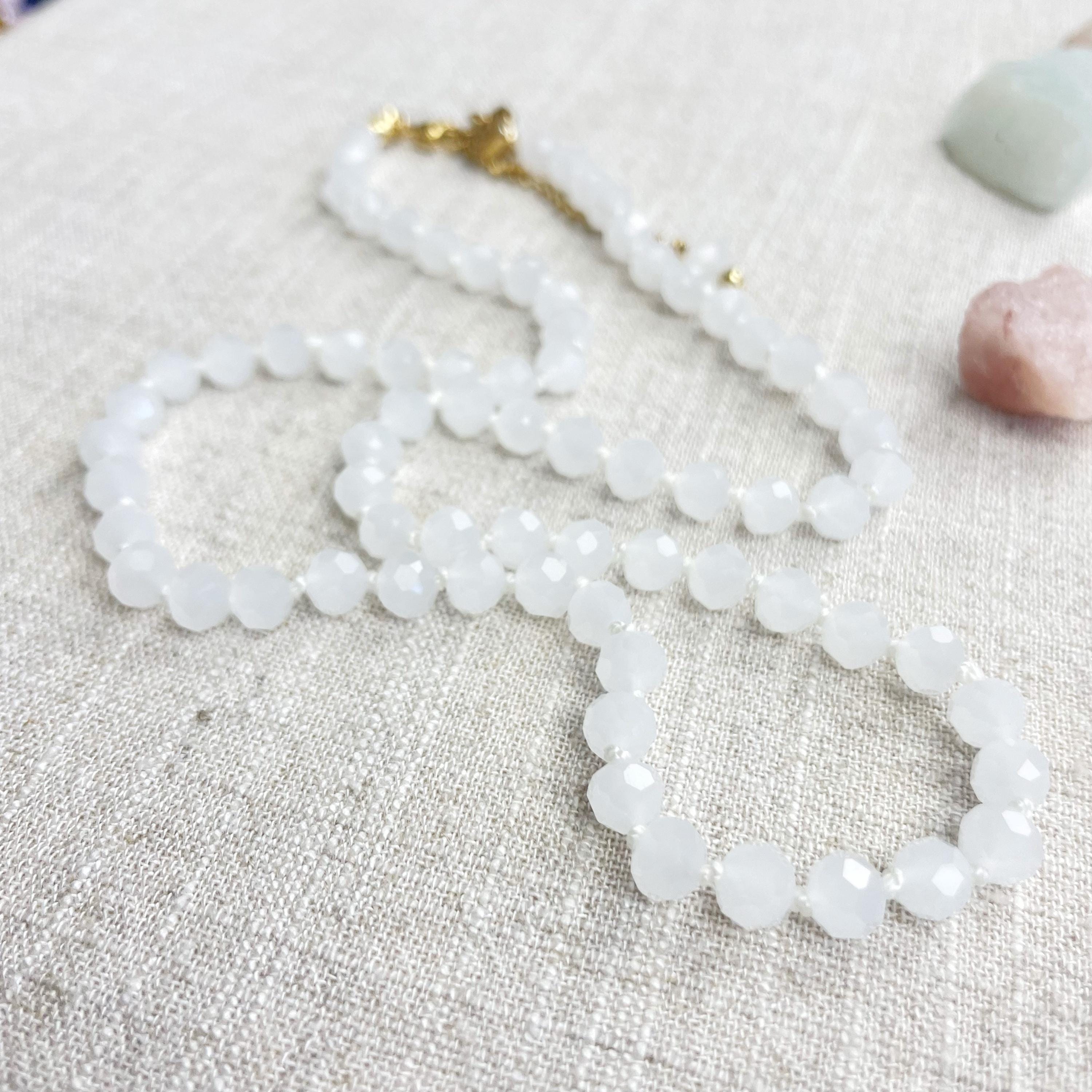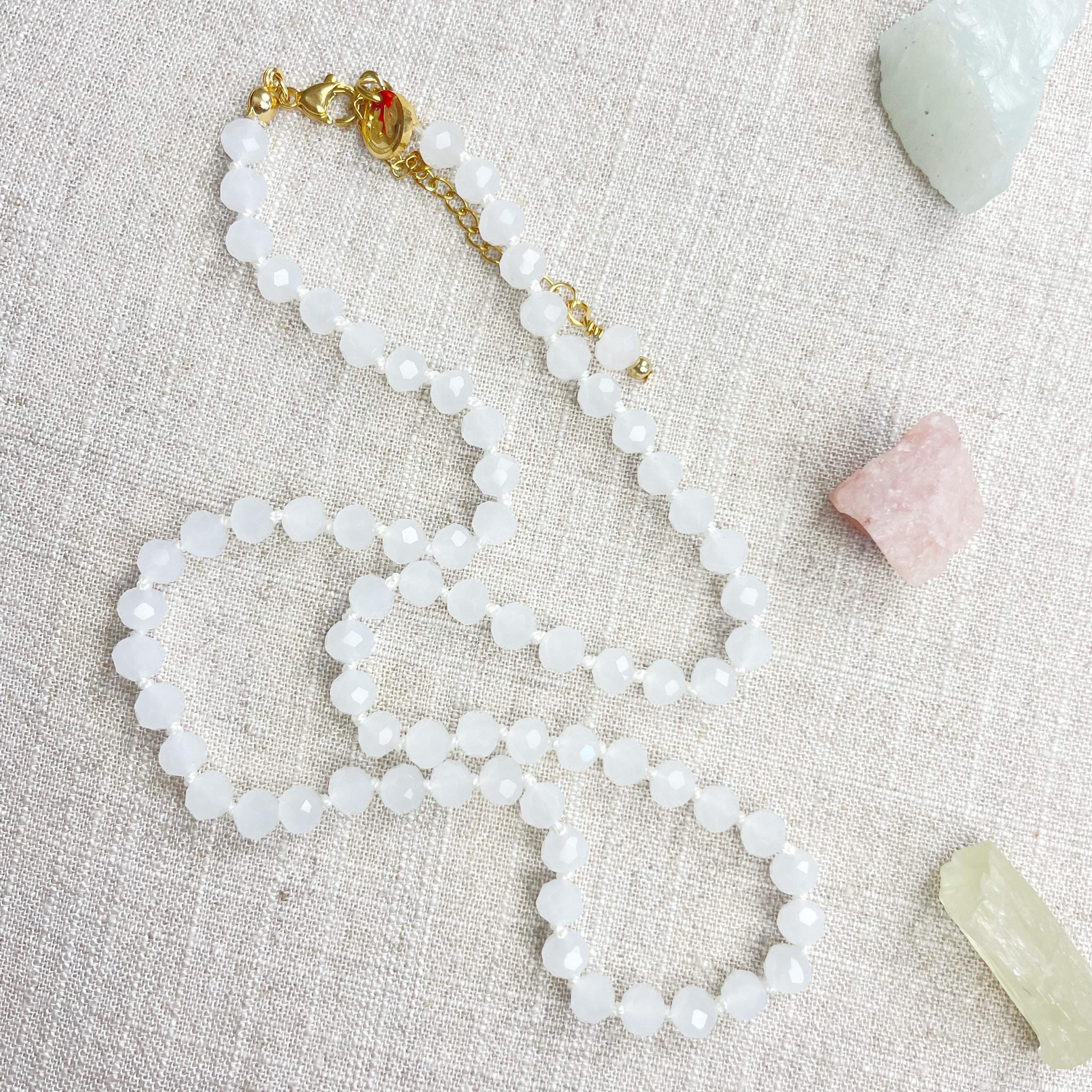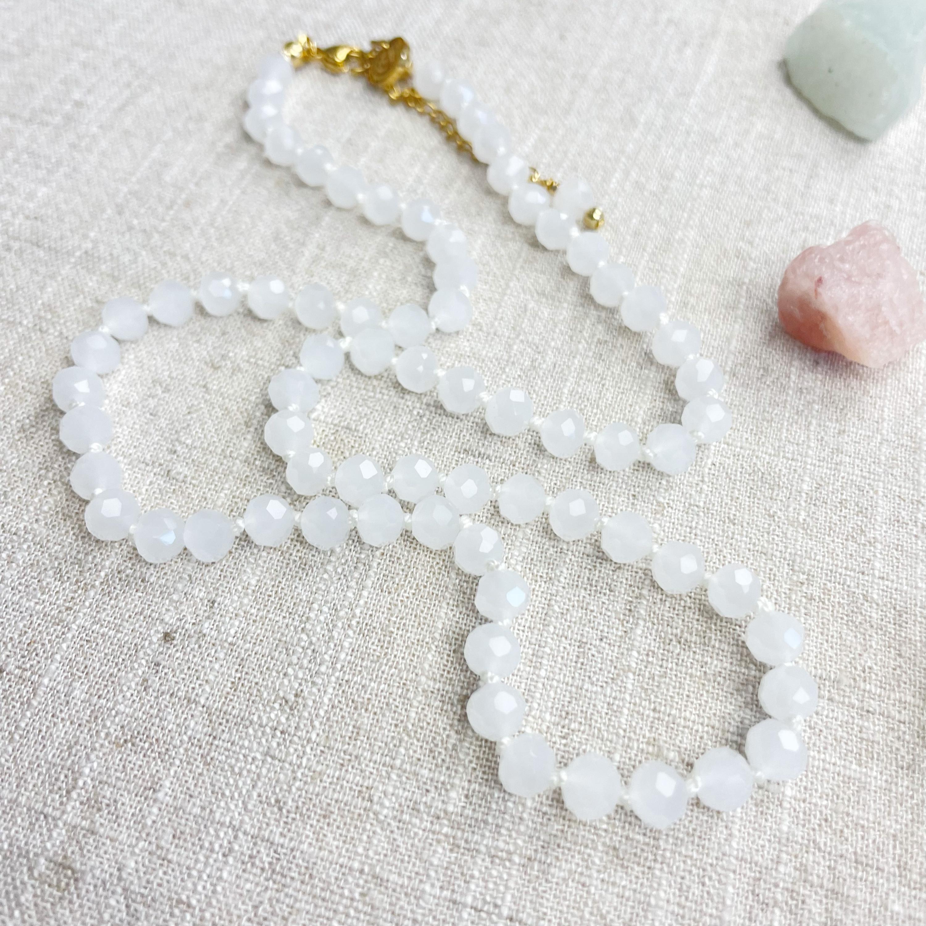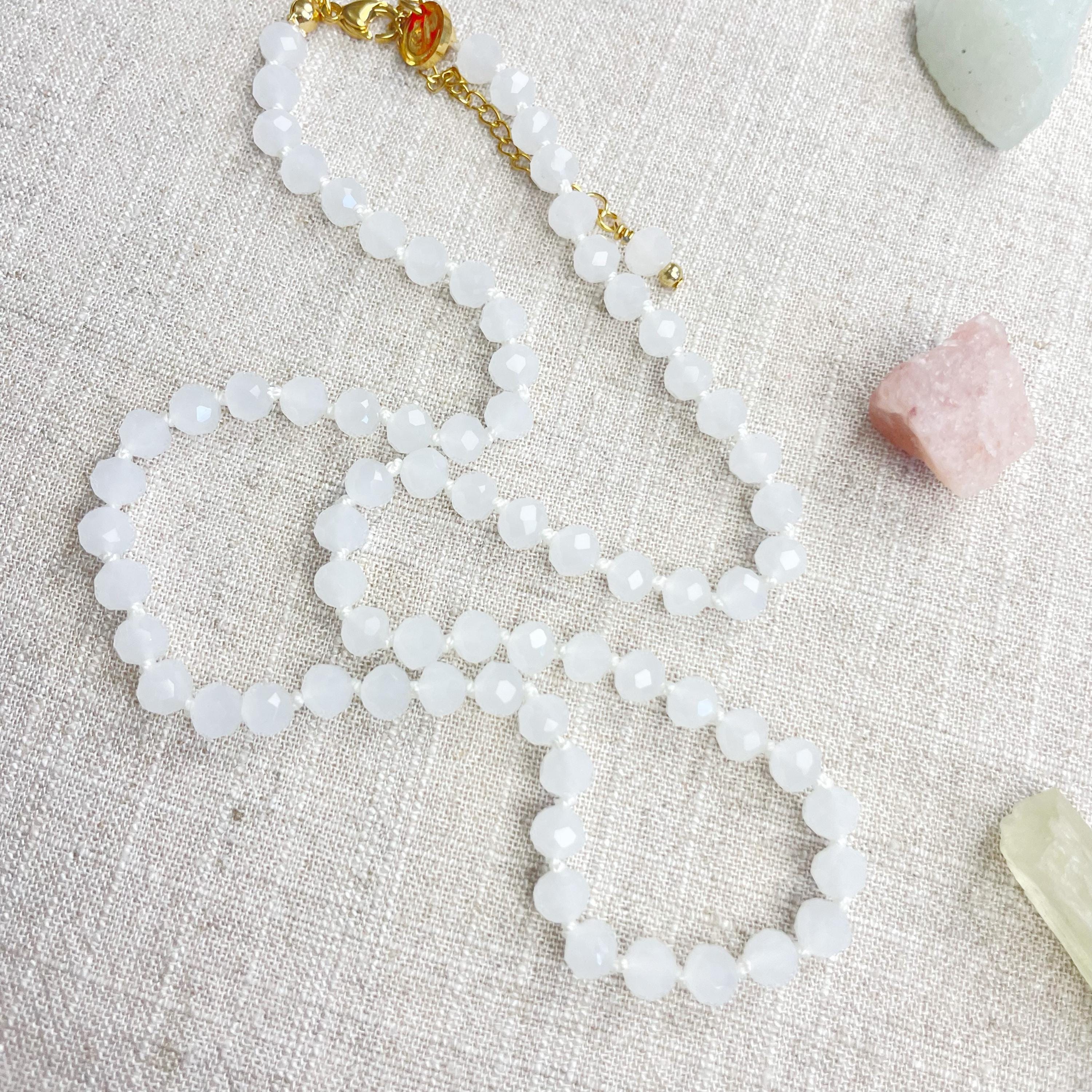 This necklace is made with glass crystal beads which are an opaque white color. The beads are 6mm faceted rondelle beads. Each bead is hand knotted with 100% nylon cord. The hand knotting in between each beads takes time to do but looks gorgeous making the necklace also very easy to wear. The necklace is finished off with a gold plated stainless steel chain, clasp and logo charm.