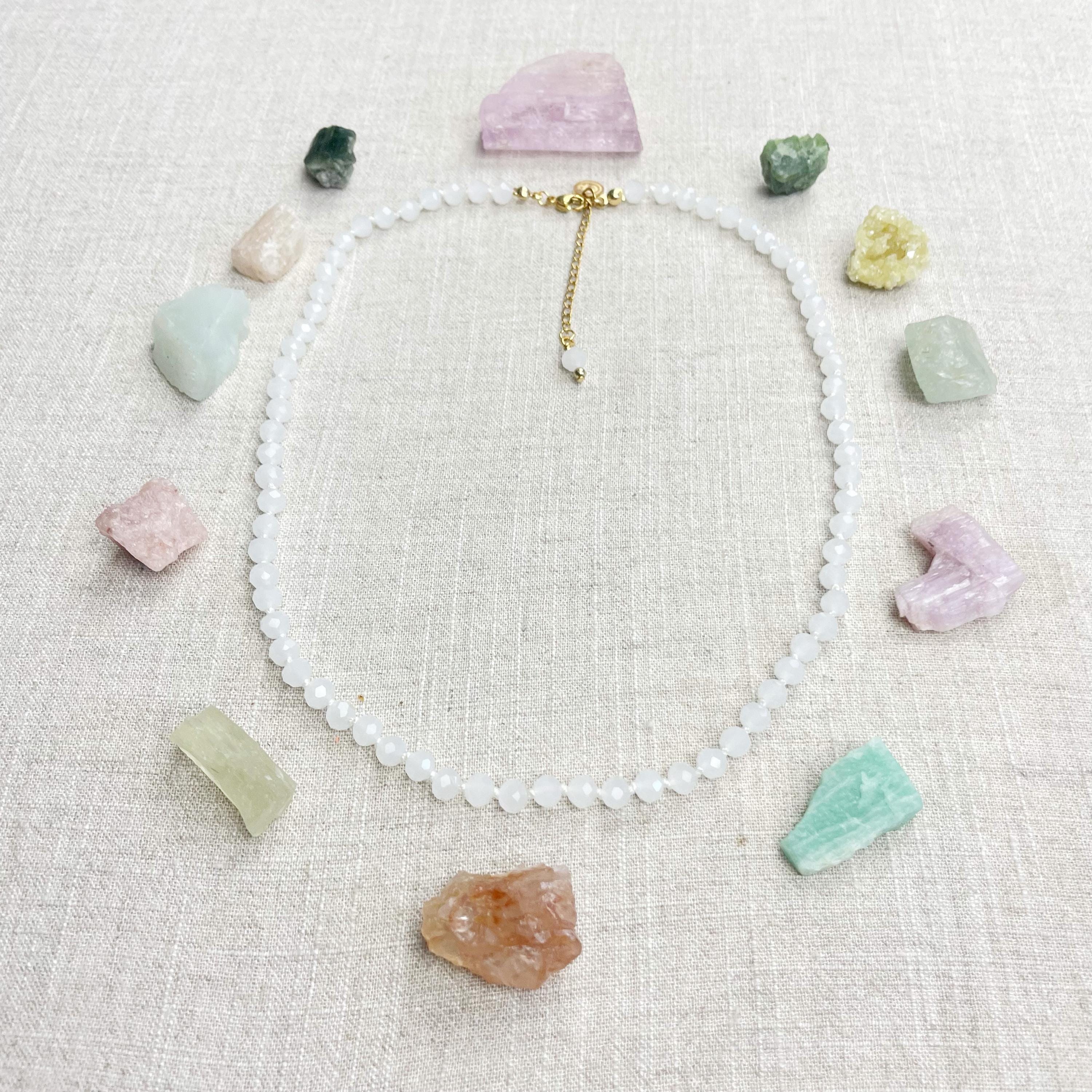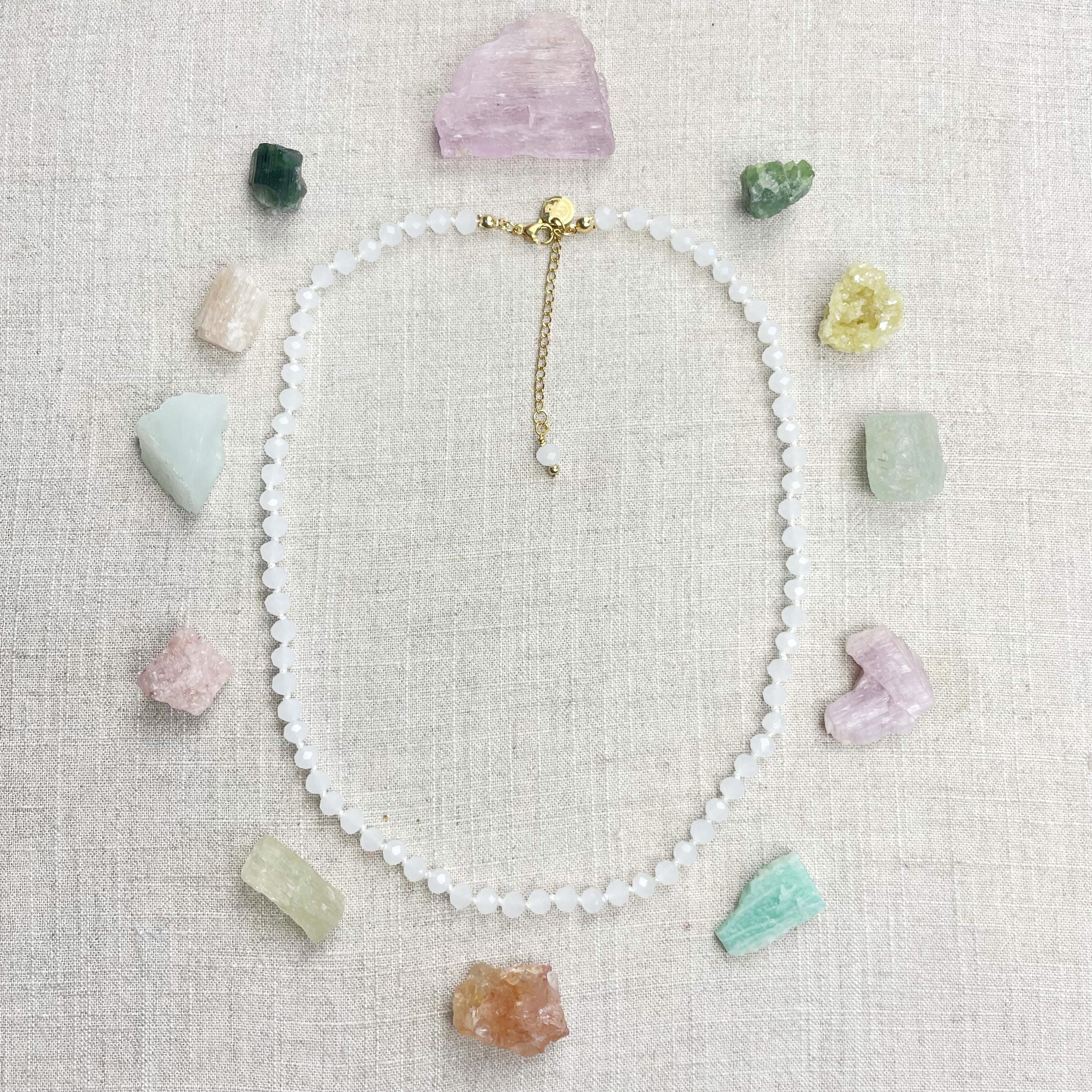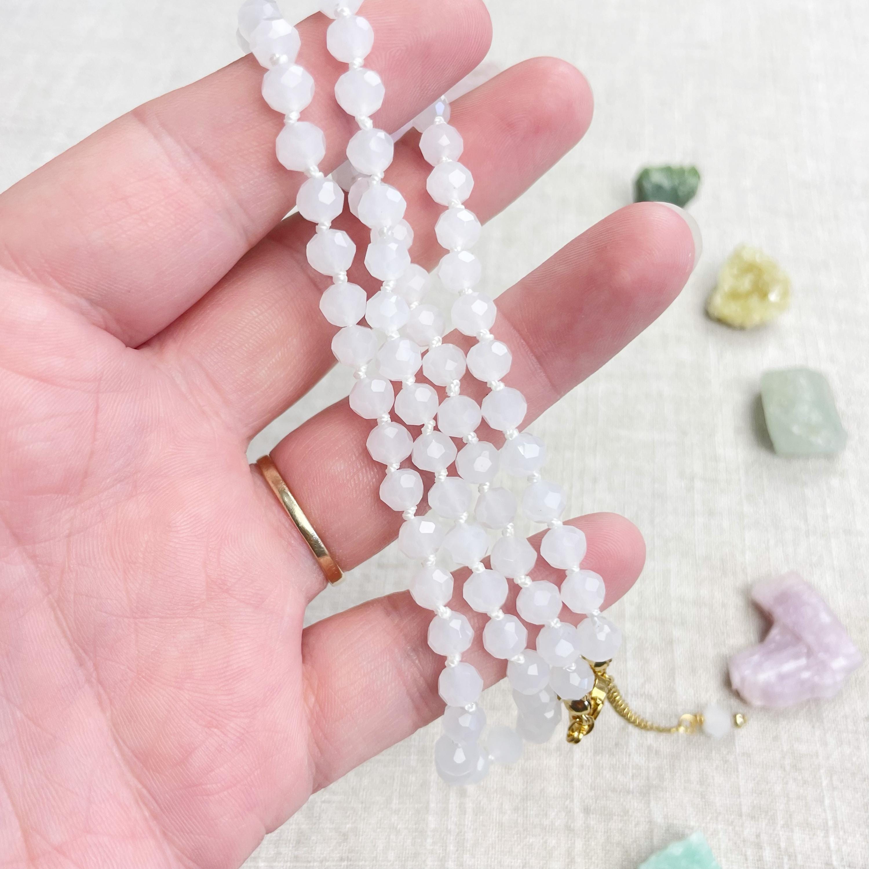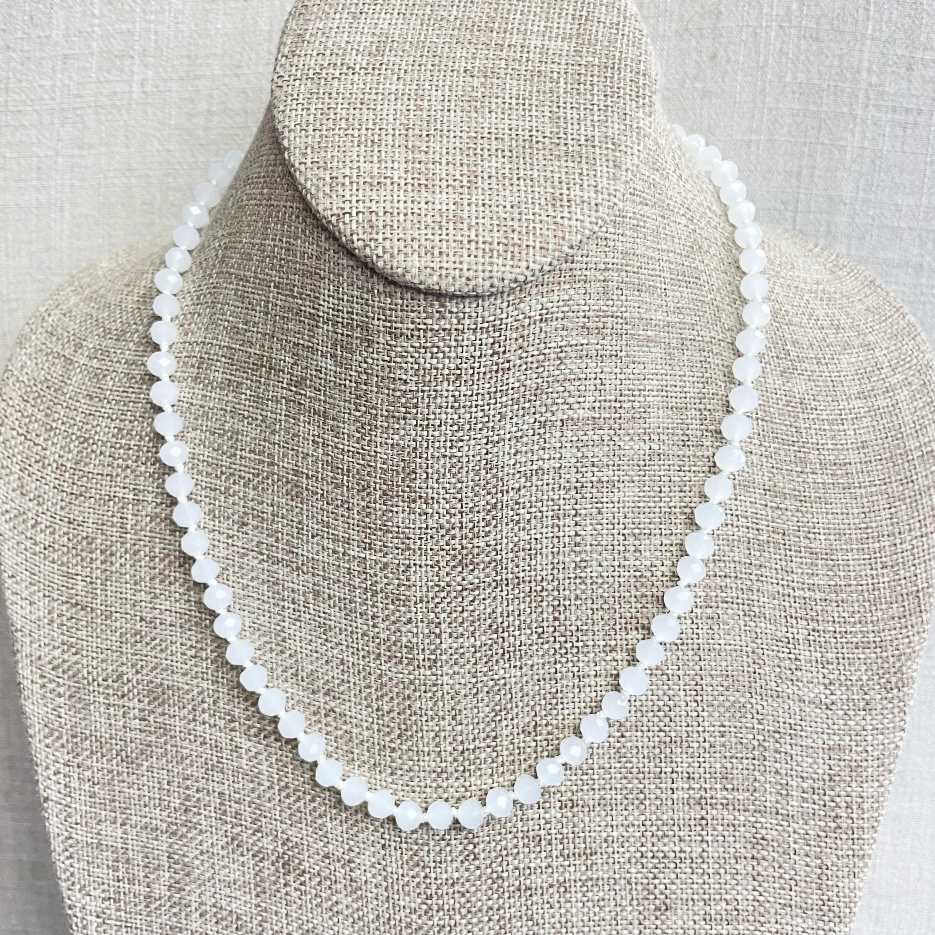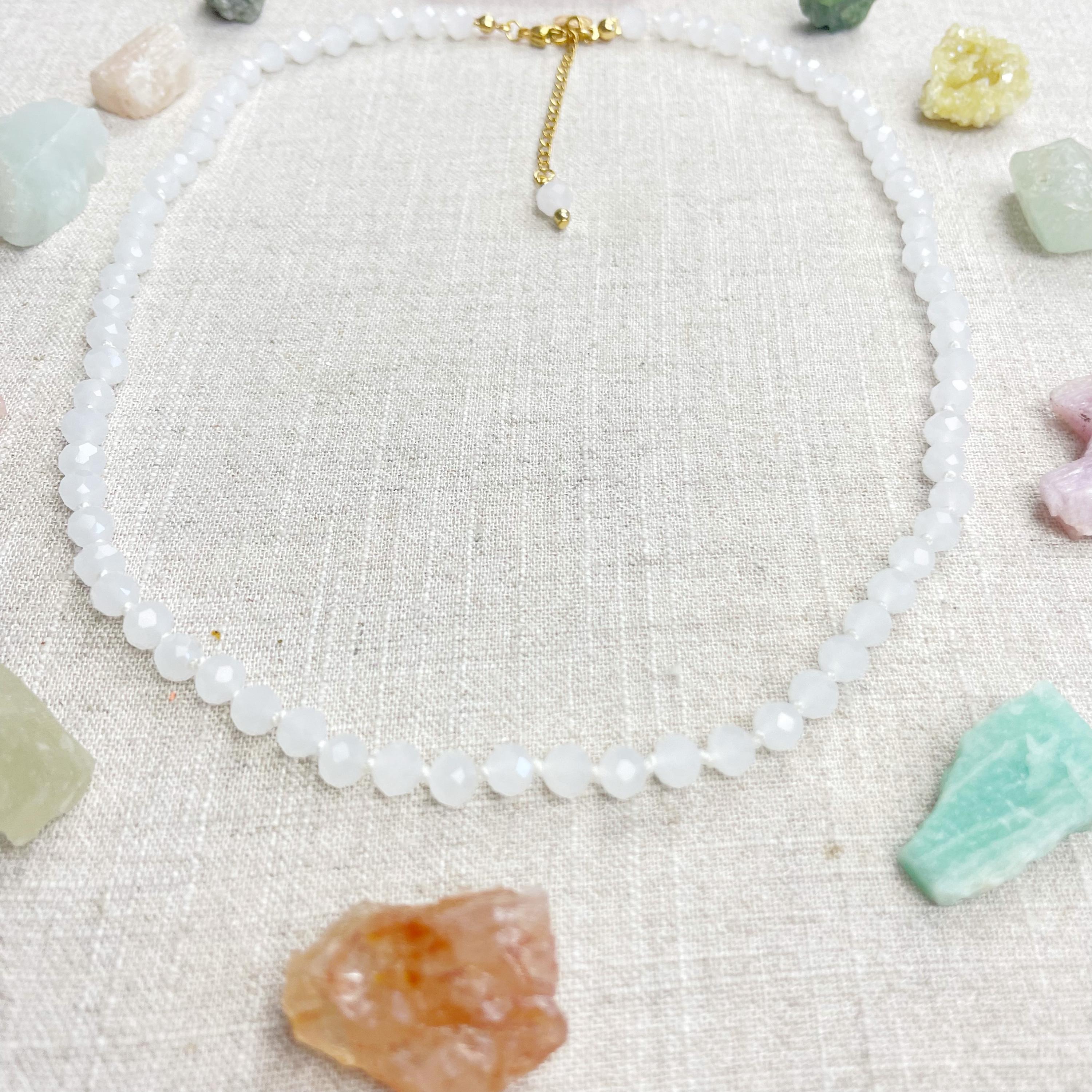 This necklace is made with glass crystal beads which are an opaque white color. The beads are 6mm faceted rondelle beads. Each bead is hand knotted with 100% nylon cord. The hand knotting in between each beads takes time to do but looks gorgeous making the necklace also very easy to wear. The necklace is finished off with a gold plated stainless steel chain, clasp and logo charm.
