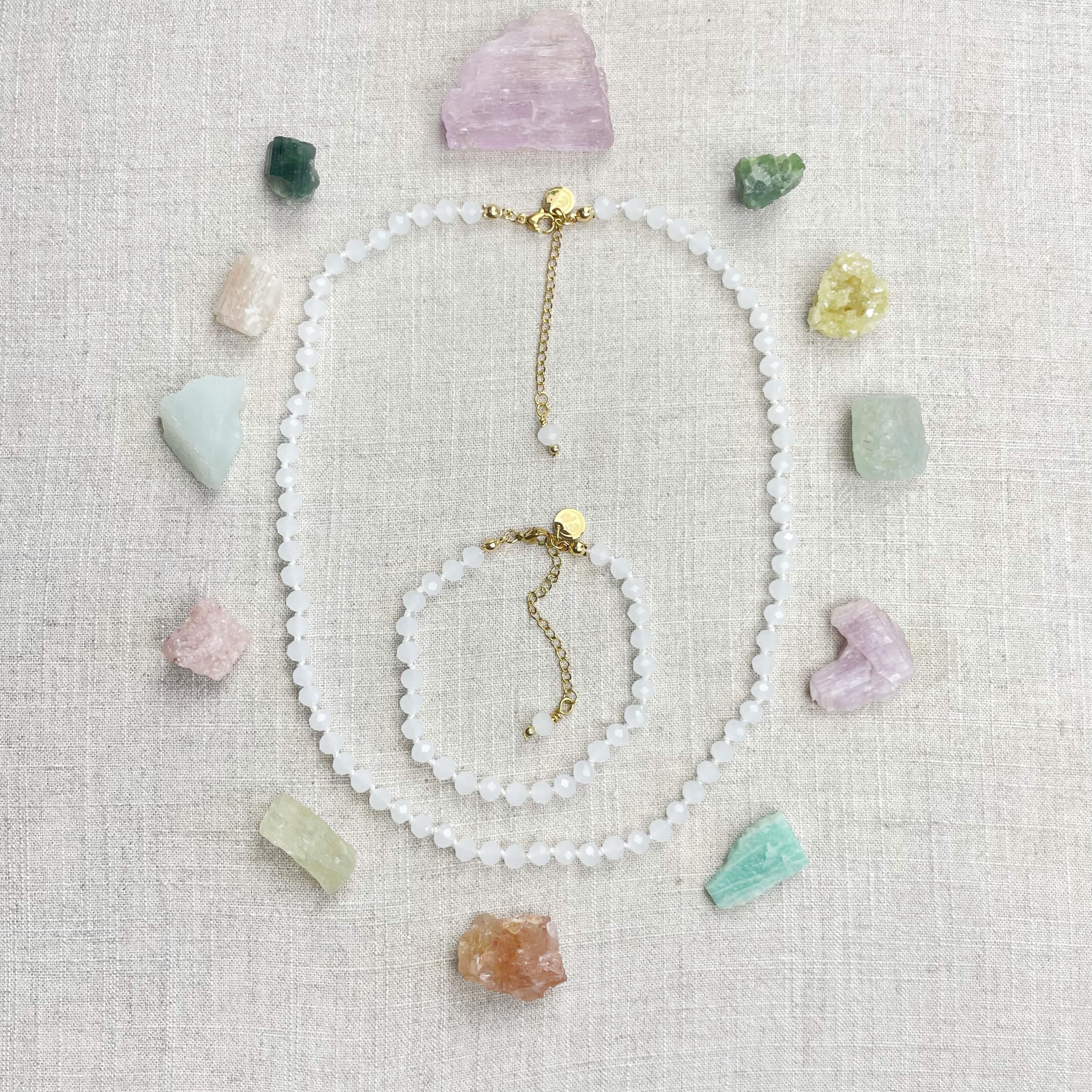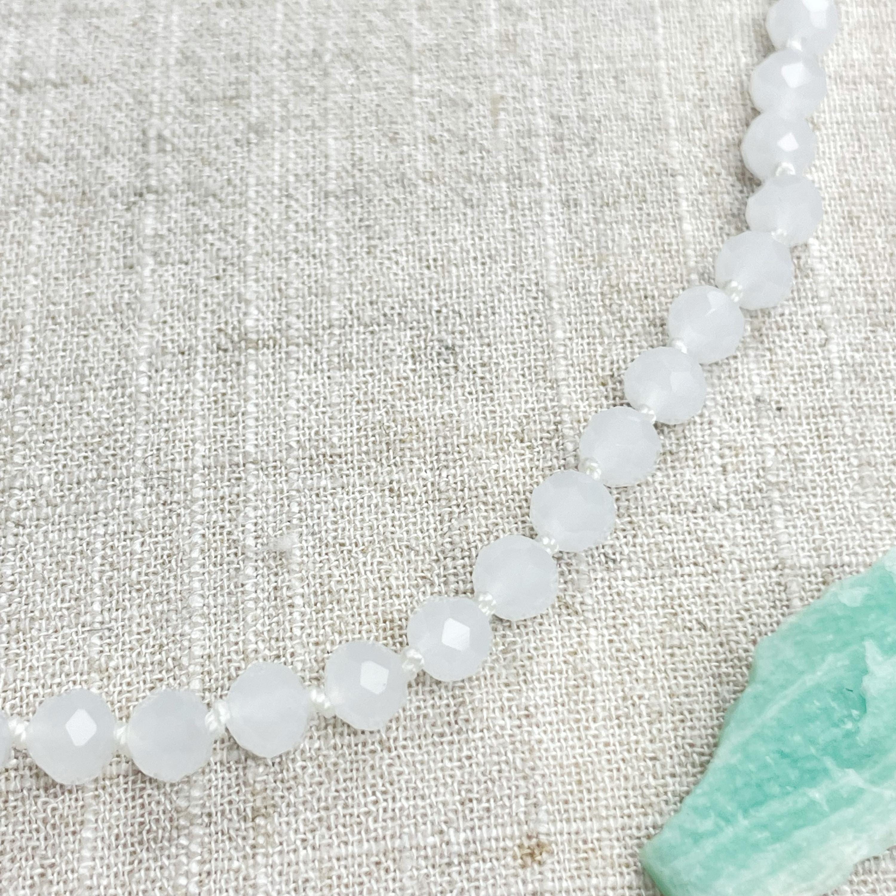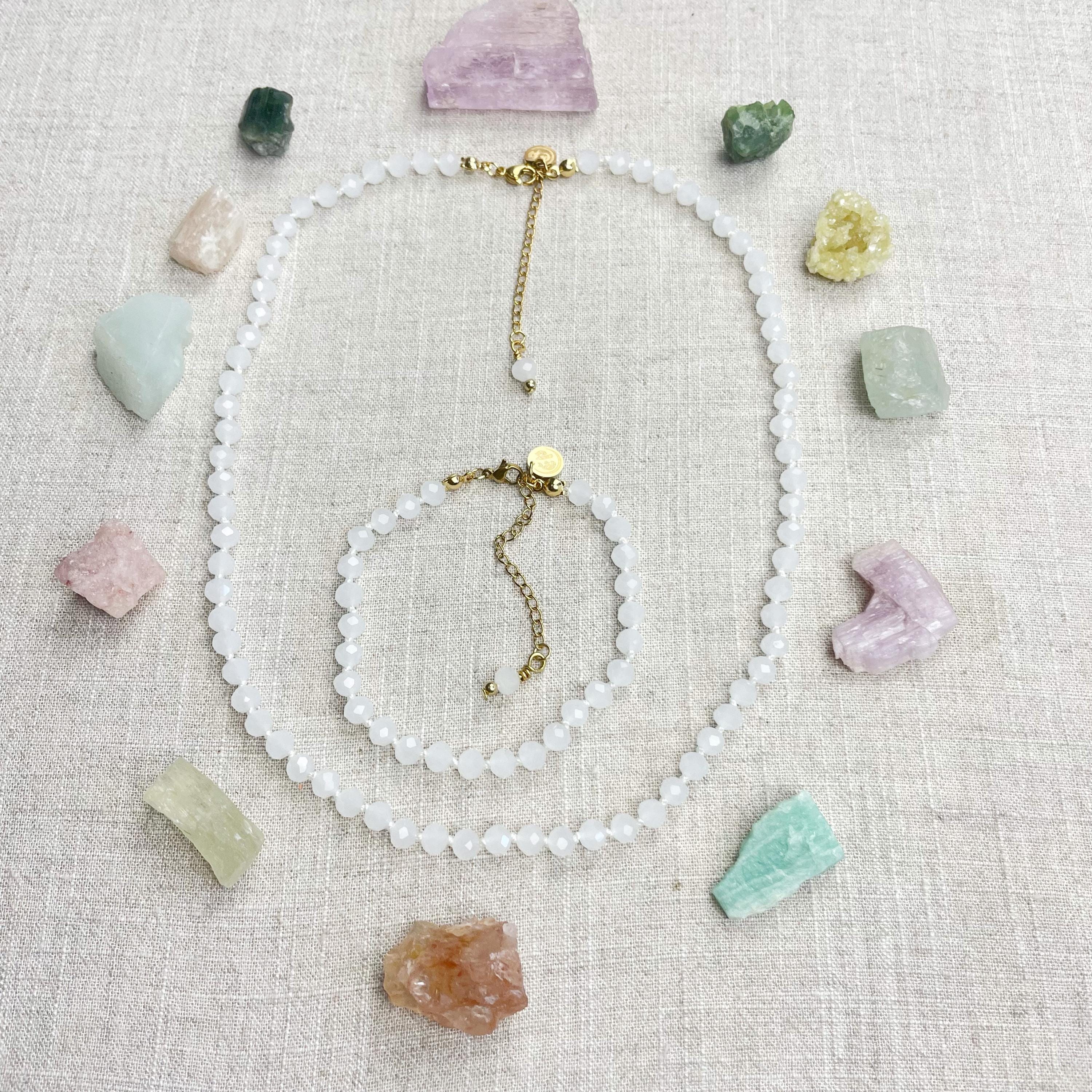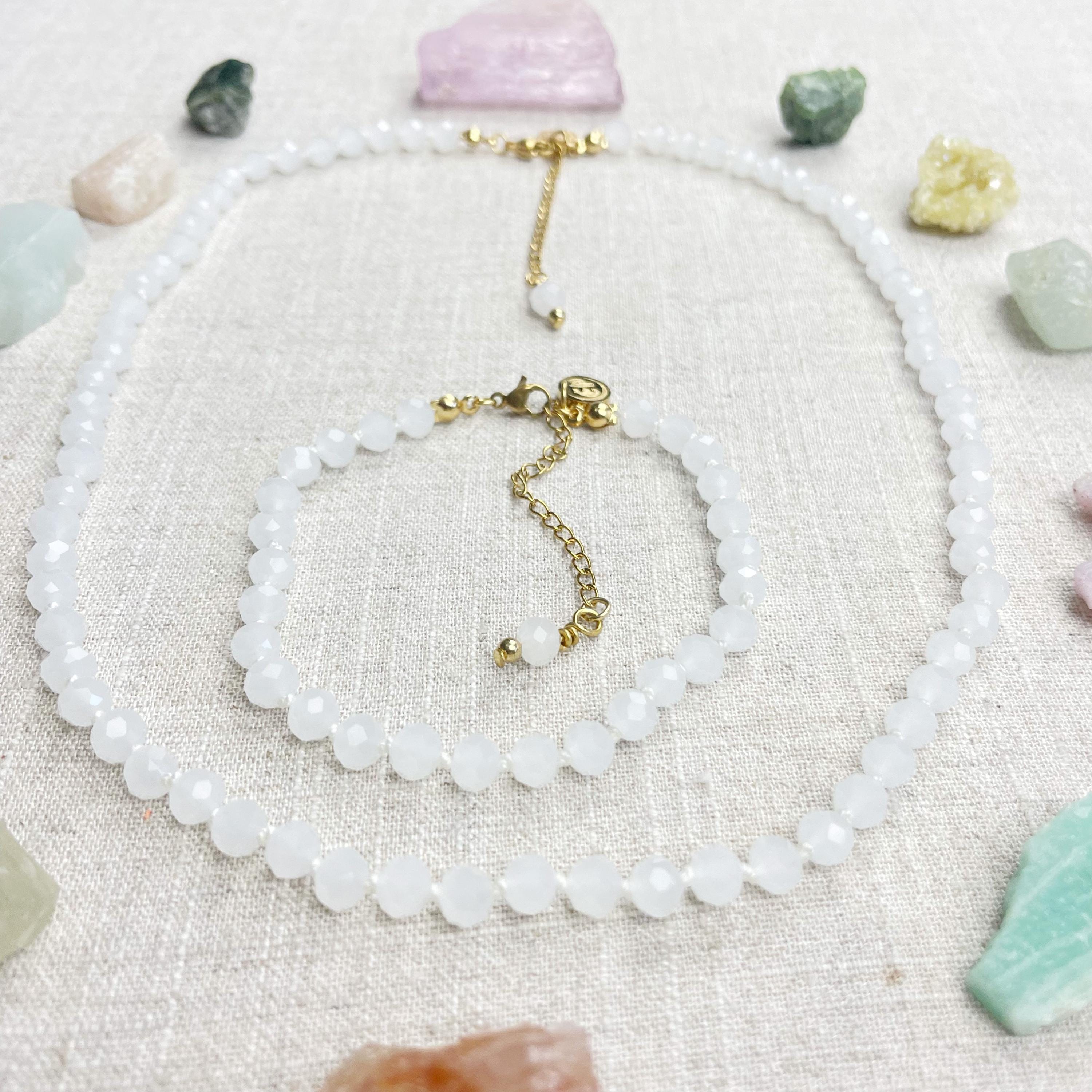 This necklace is made with glass crystal beads which are an opaque white color. The beads are 6mm faceted rondelle beads. Each bead is hand knotted with 100% nylon cord. The hand knotting in between each beads takes time to do but looks gorgeous making the necklace also very easy to wear. The necklace is finished off with a gold plated stainless steel chain, clasp and logo charm.