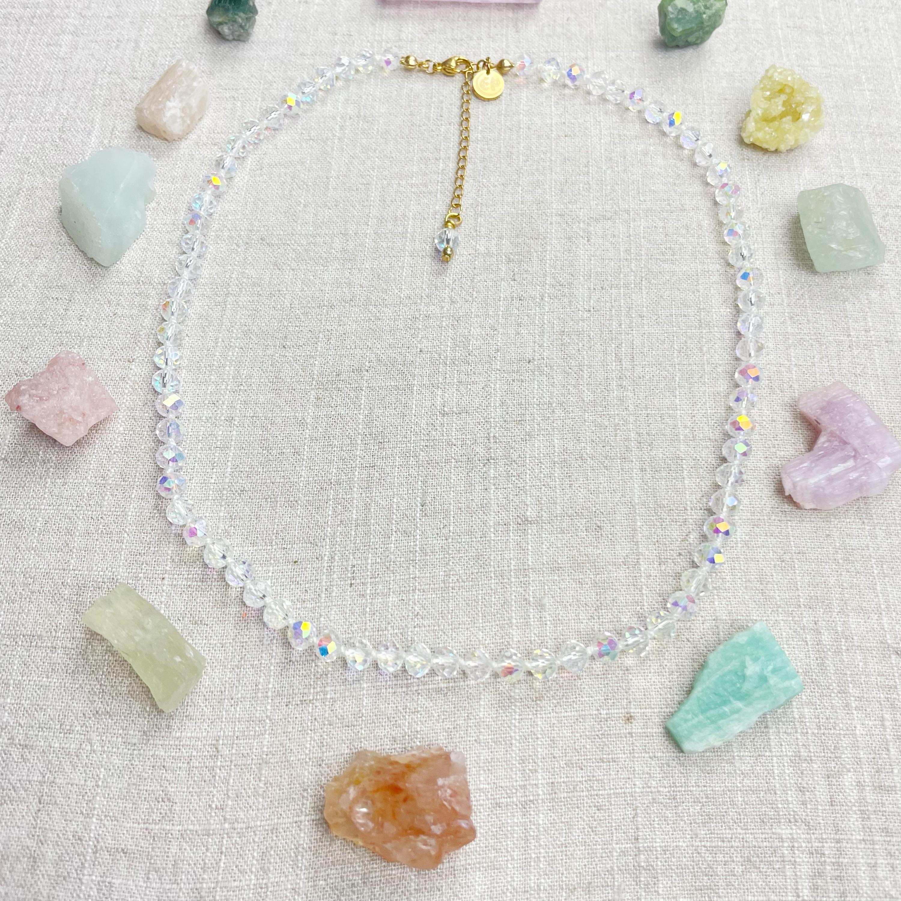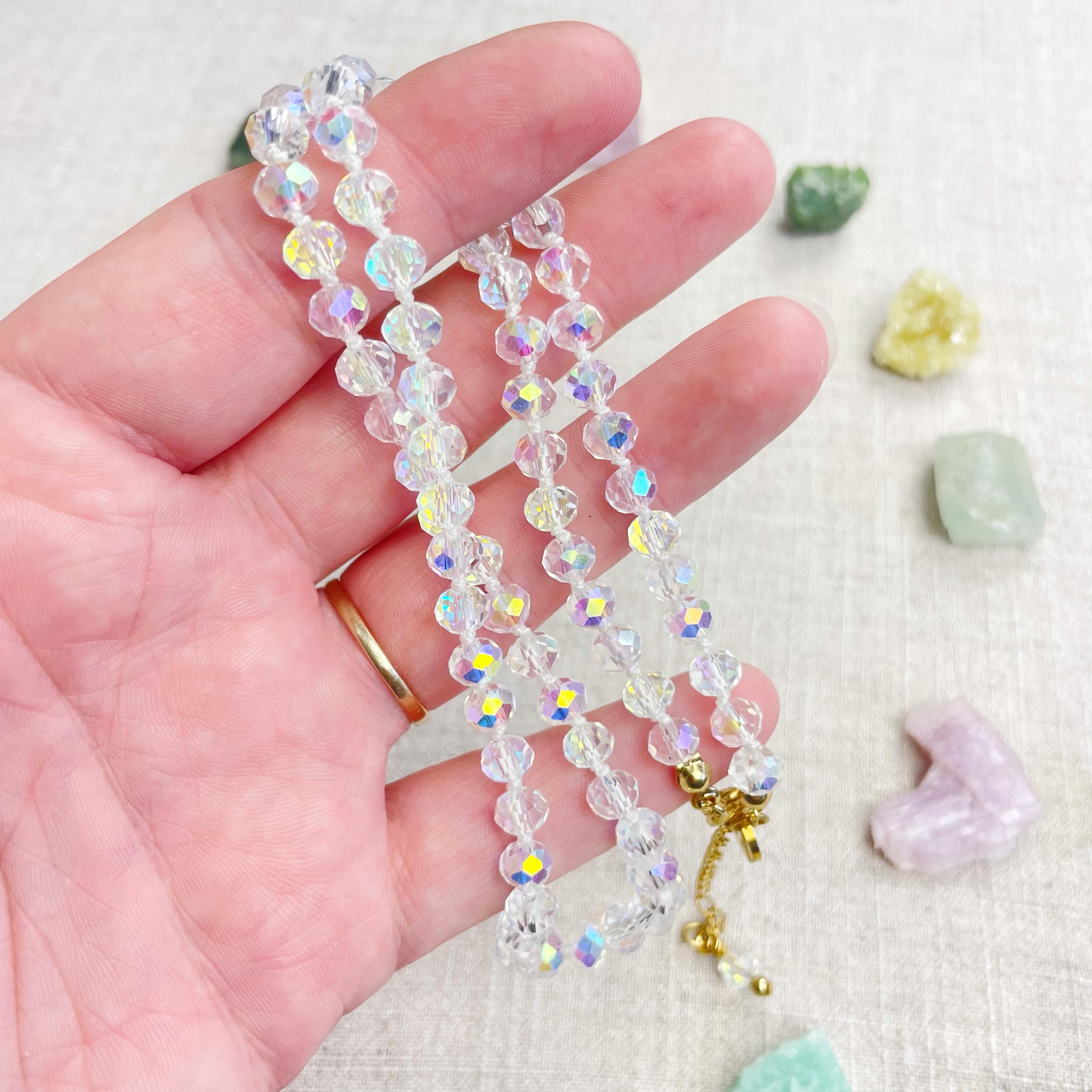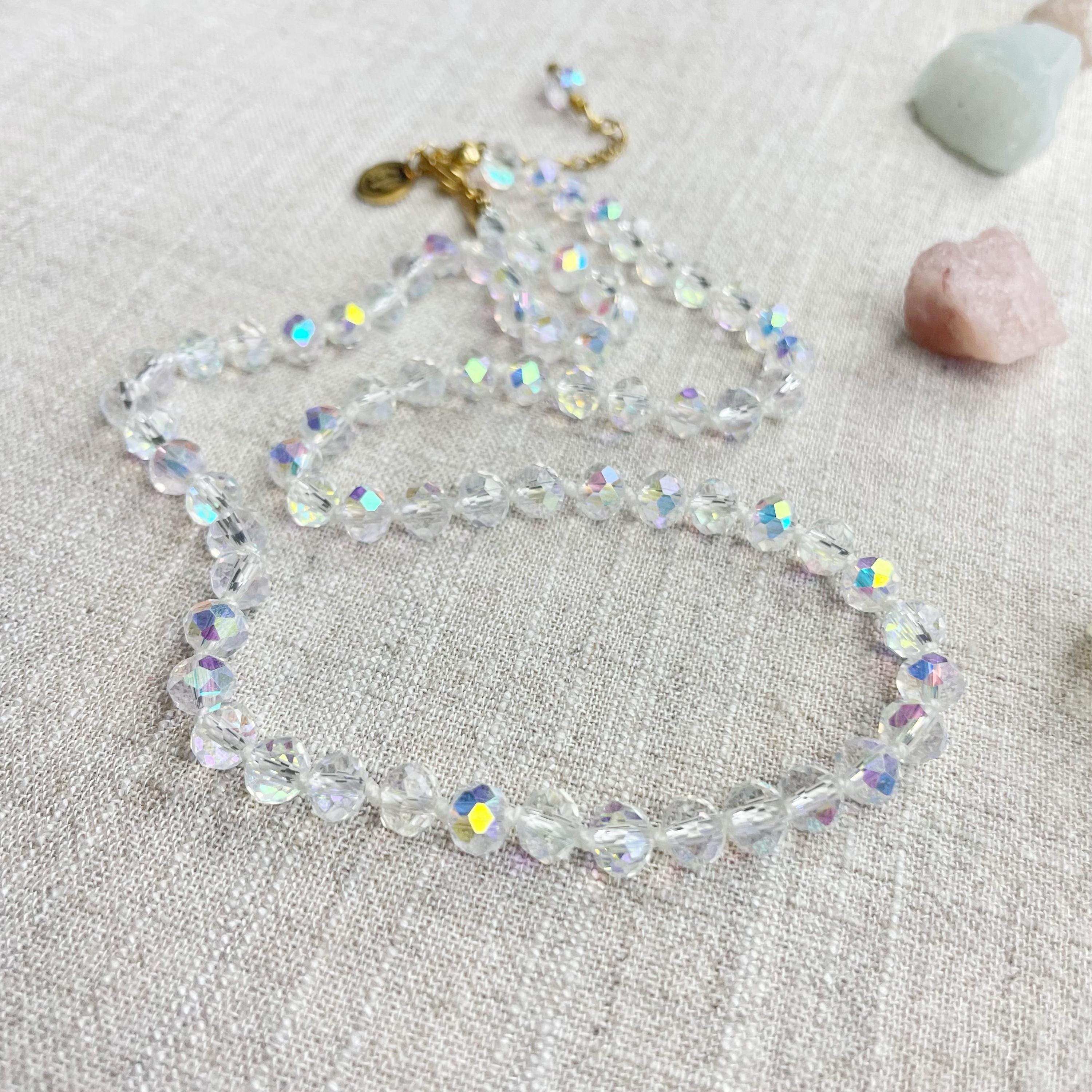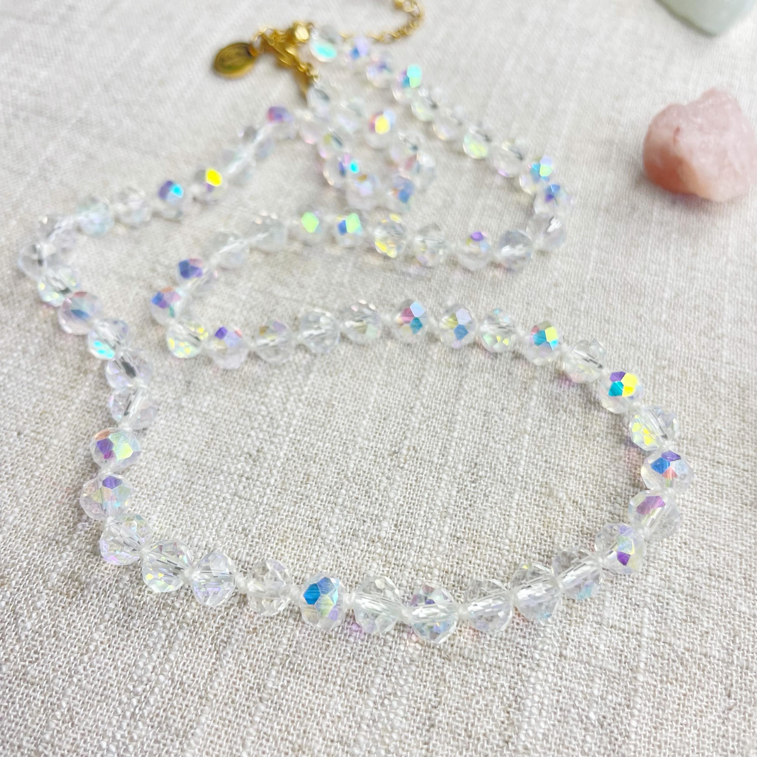 This necklace is made with glass crystal beads which are a clear color with an iridescent coating. The beads are 6mm faceted rondelle beads. Each bead is hand knotted with 100% nylon cord. The hand knotting in between each beads takes time to do but looks gorgeous making the necklace also very easy to wear. The necklace is finished off with a gold plated stainless steel chain, clasp and logo charm.