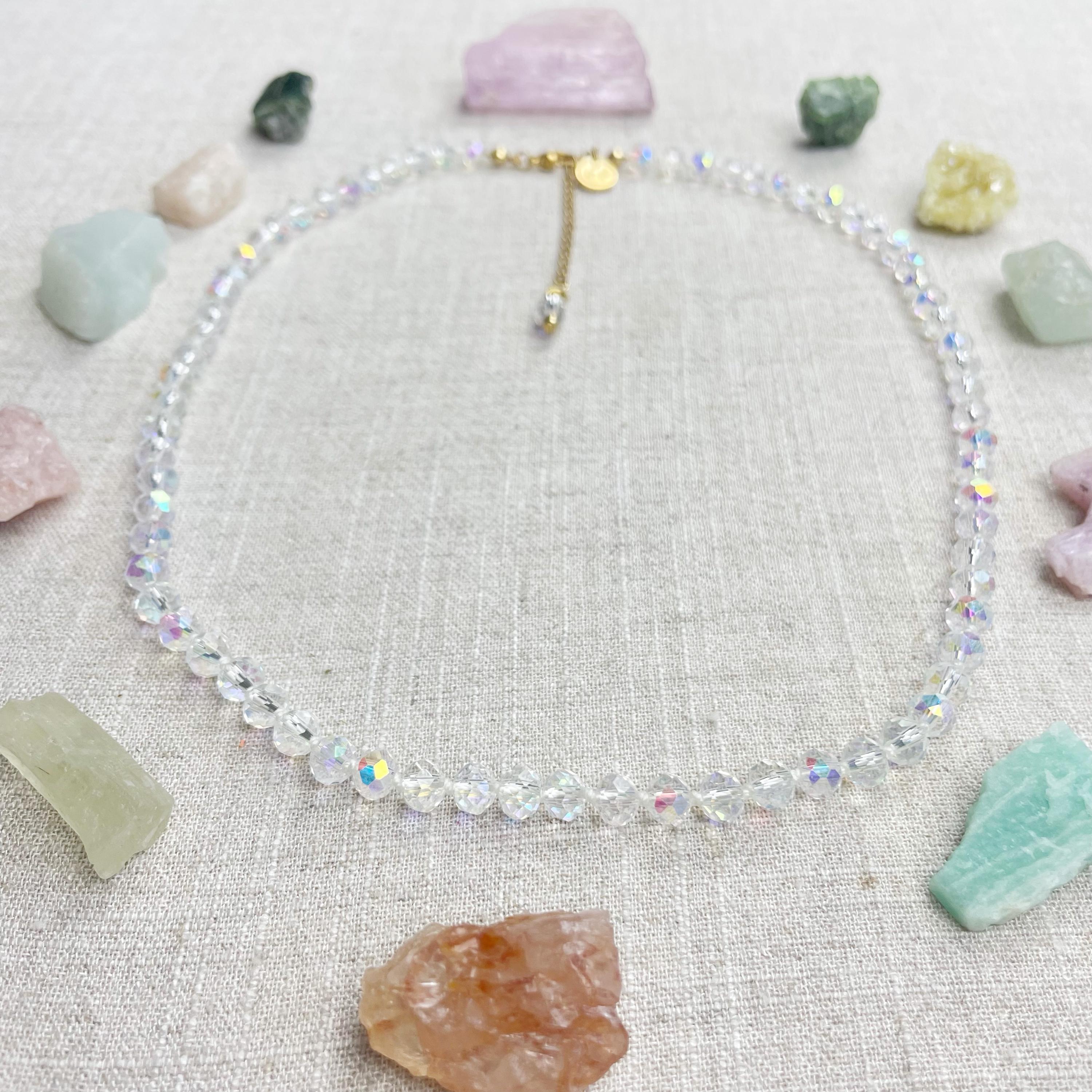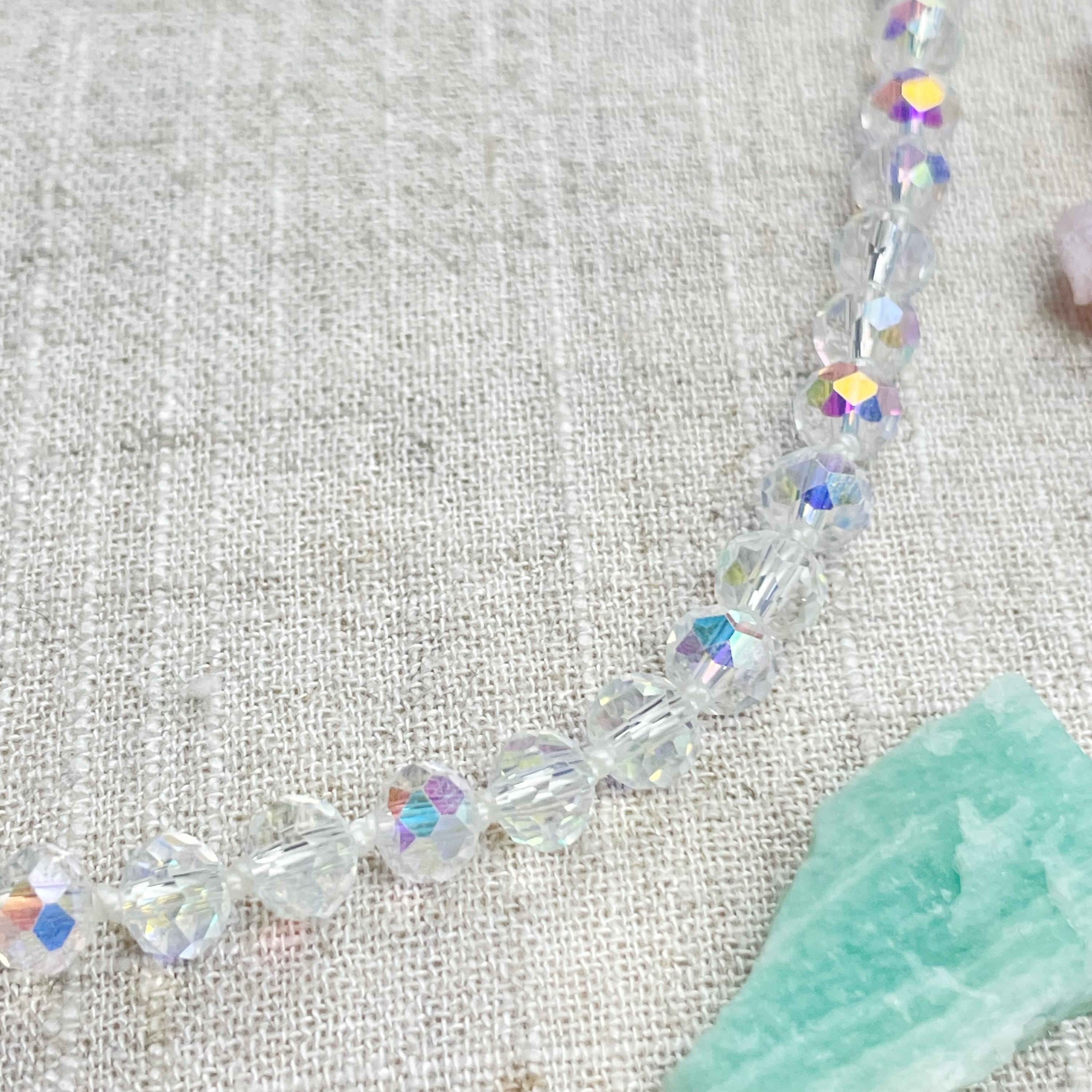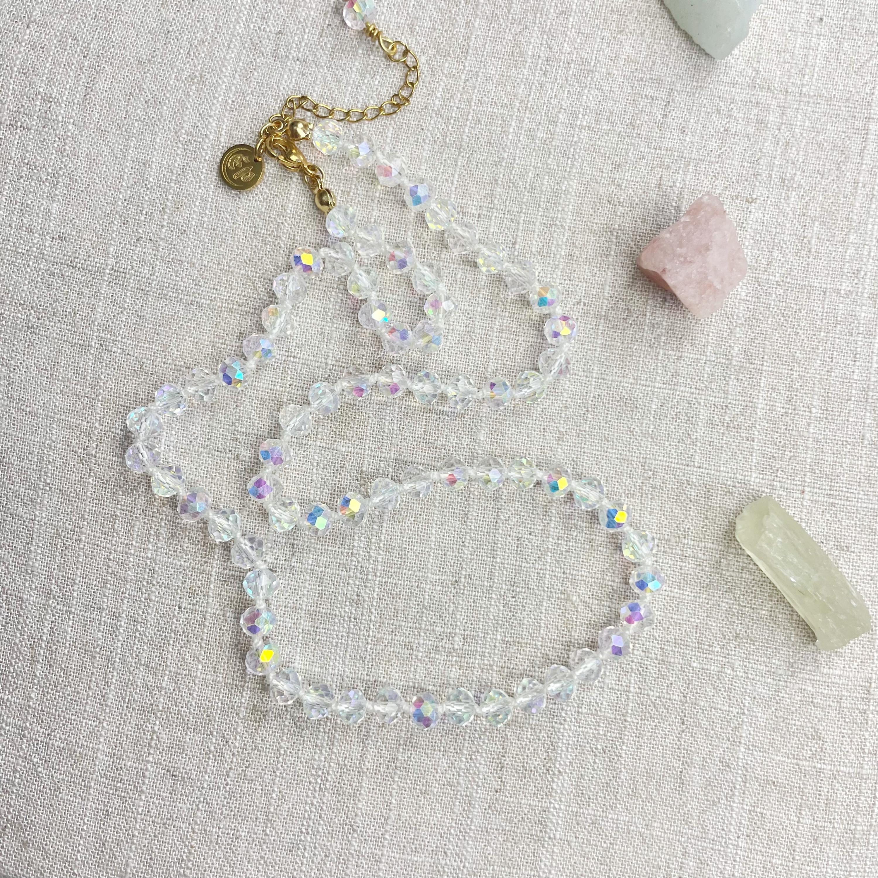 This necklace is made with glass crystal beads which are a clear color with an iridescent coating. The beads are 6mm faceted rondelle beads. Each bead is hand knotted with 100% nylon cord. The hand knotting in between each beads takes time to do but looks gorgeous making the necklace also very easy to wear. The necklace is finished off with a gold plated stainless steel chain, clasp and logo charm.