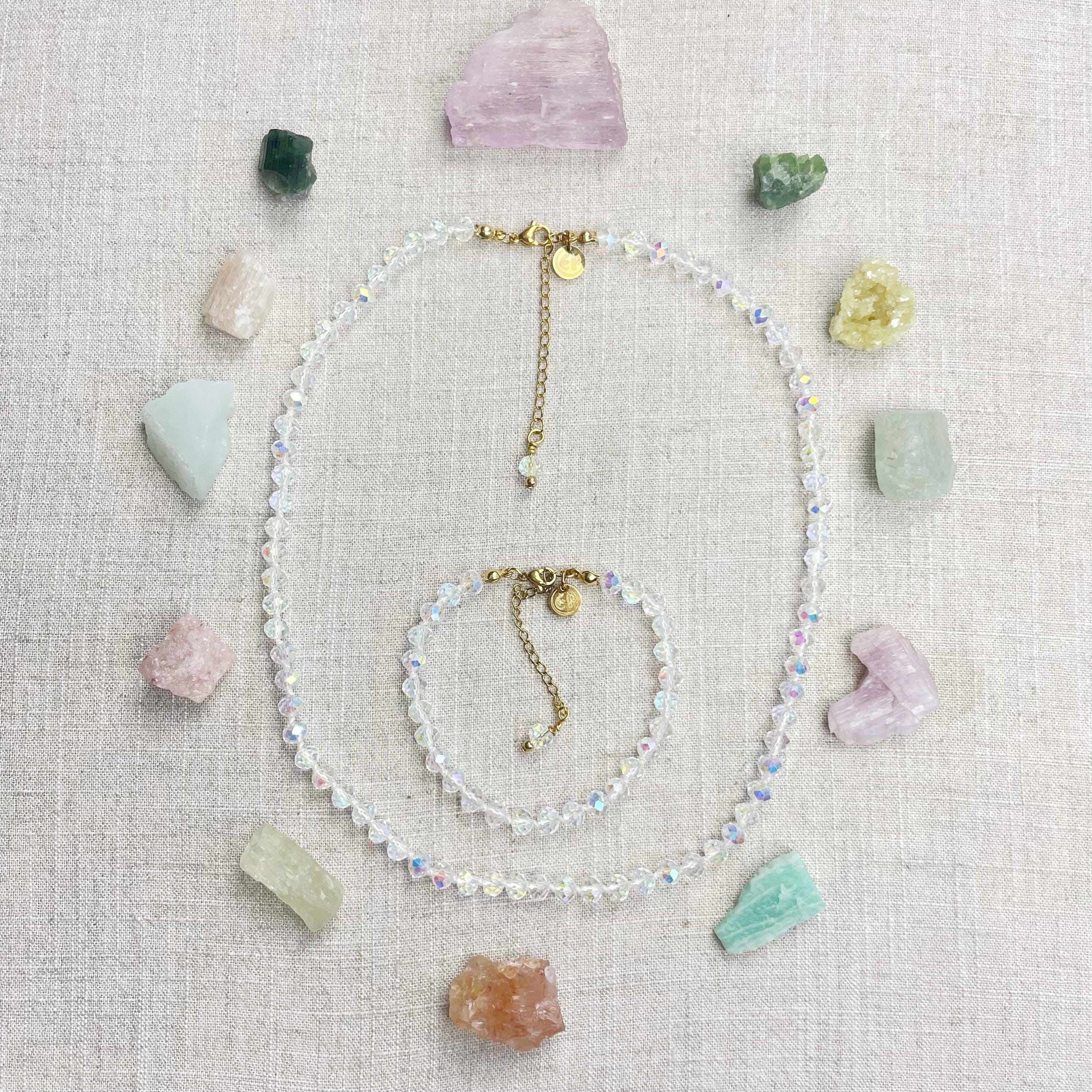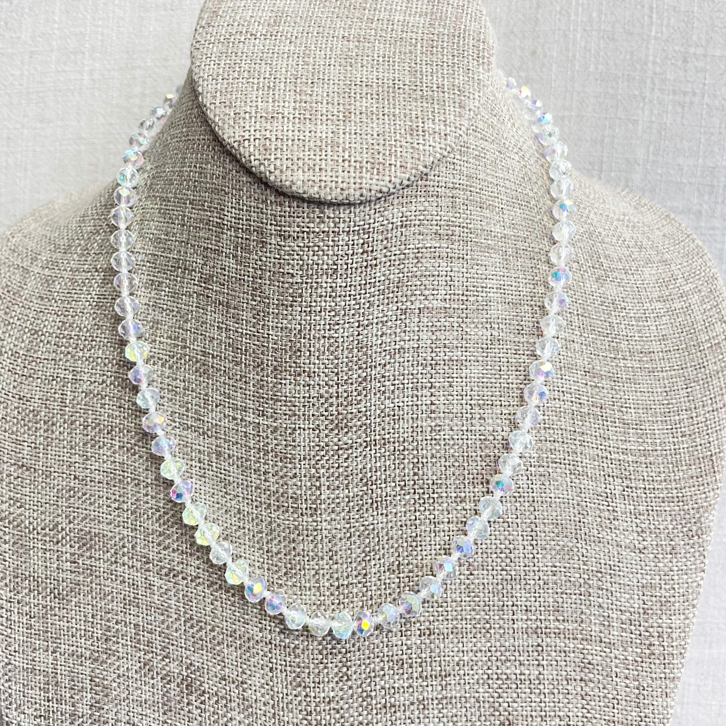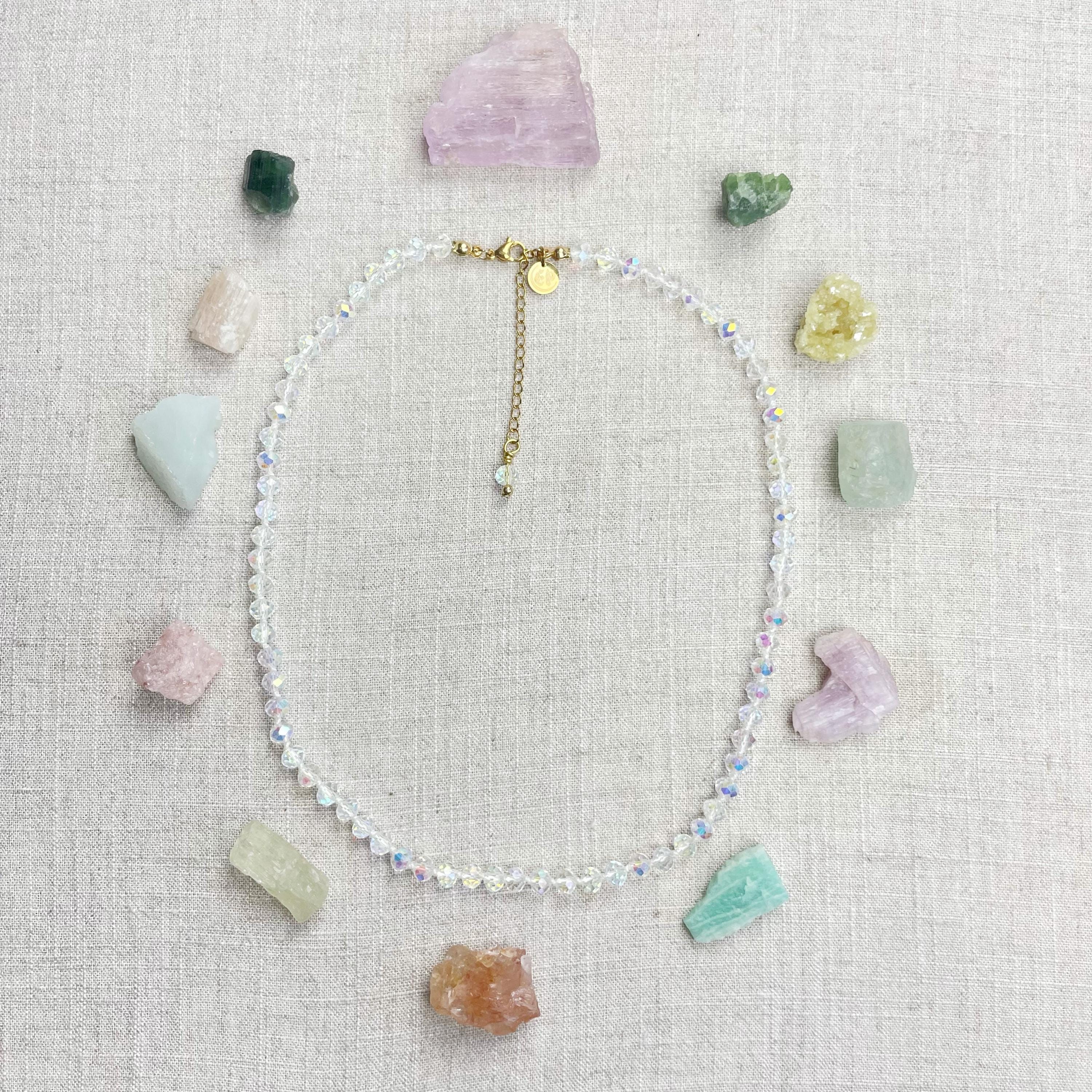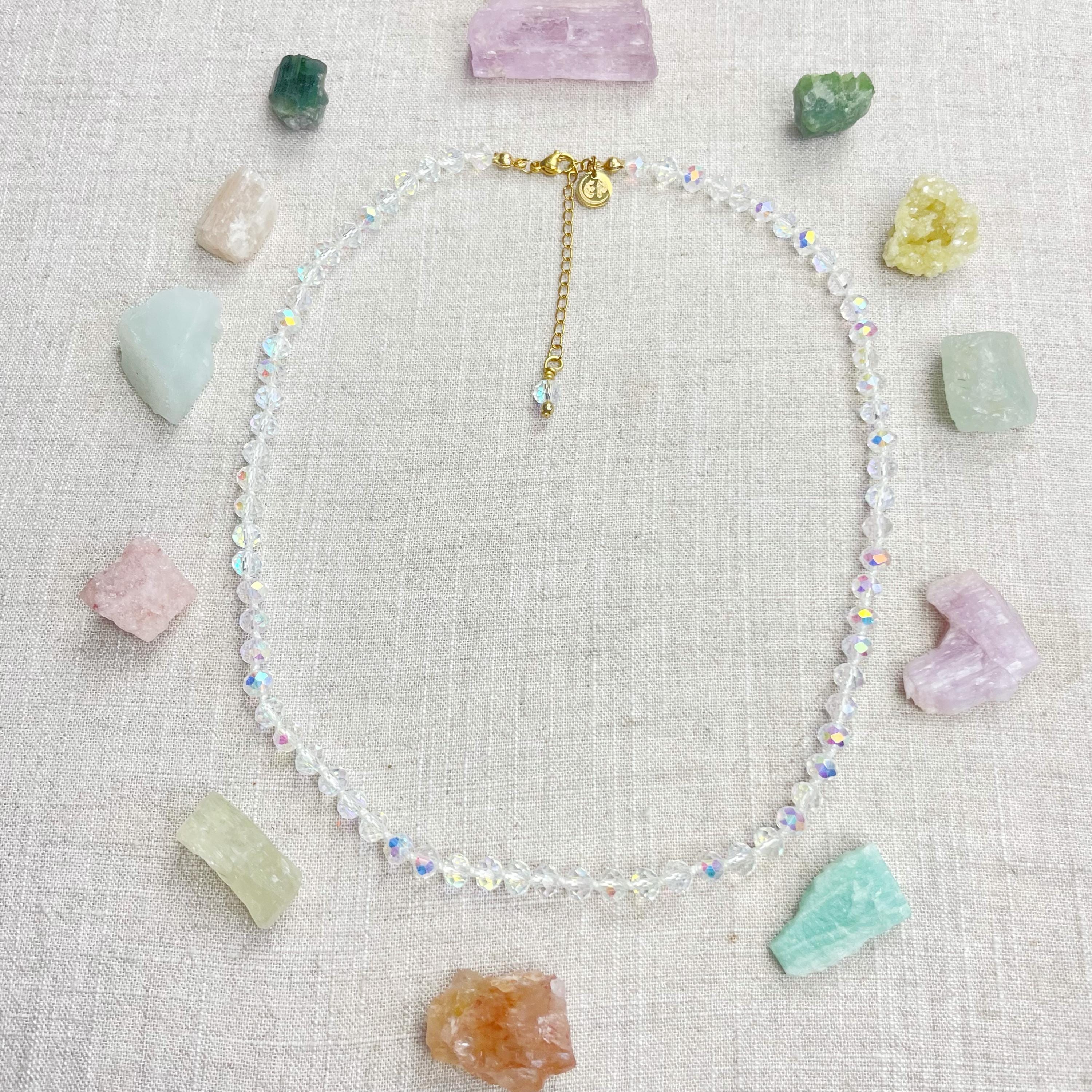 This necklace is made with glass crystal beads which are a clear color with an iridescent coating. The beads are 6mm faceted rondelle beads. Each bead is hand knotted with 100% nylon cord. The hand knotting in between each beads takes time to do but looks gorgeous making the necklace also very easy to wear. The necklace is finished off with a gold plated stainless steel chain, clasp and logo charm.