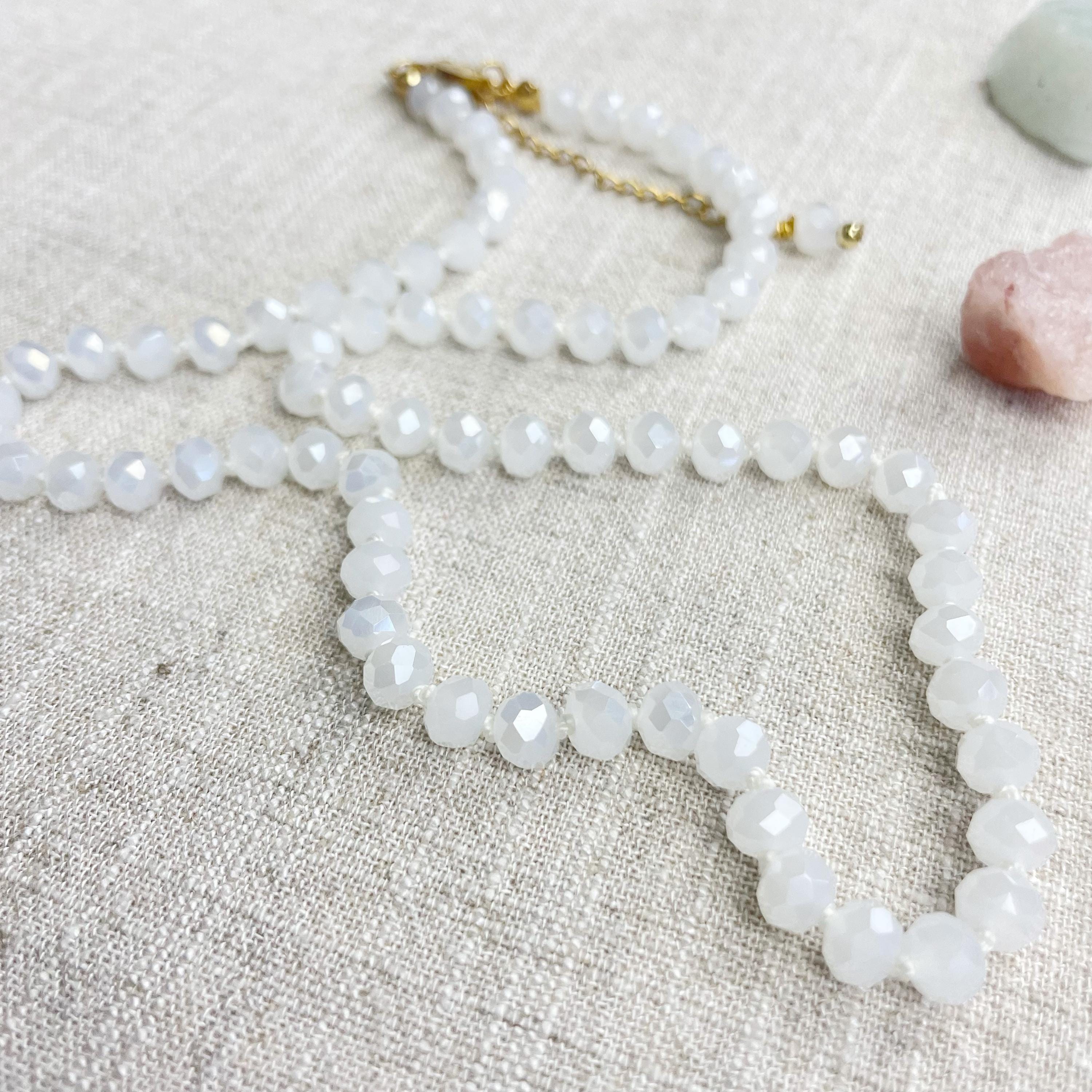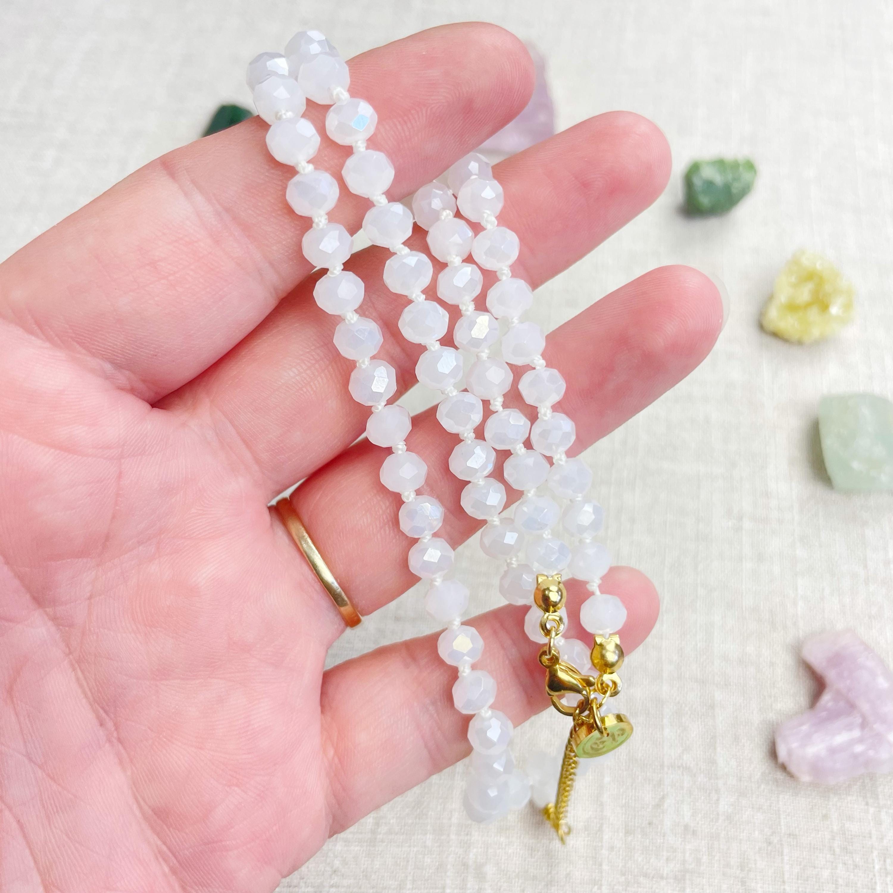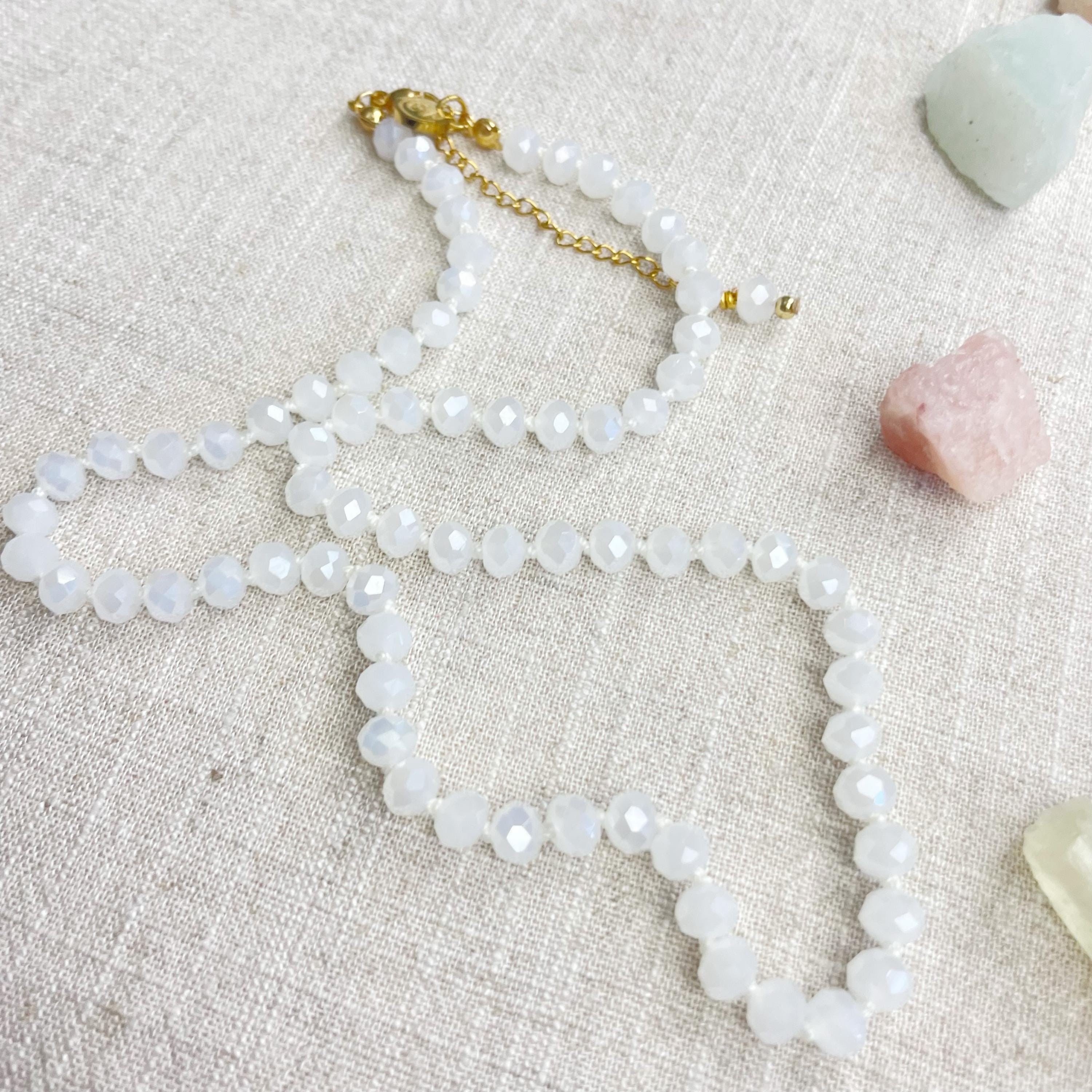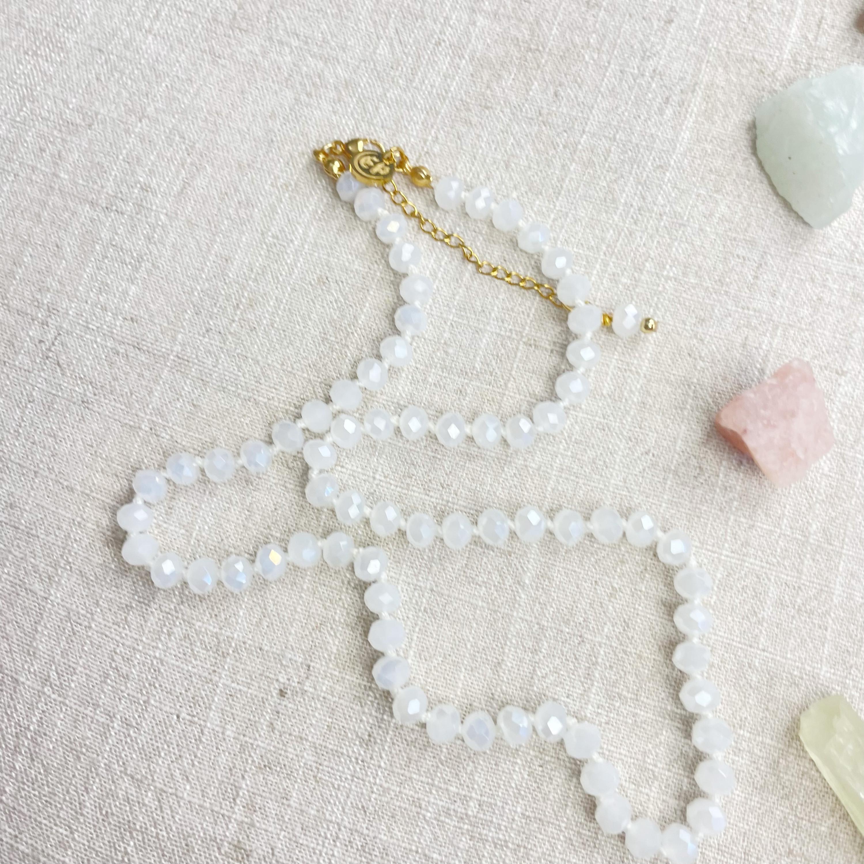 This necklace is made with glass crystal beads which are a white color with an iridescent coating. The beads are 6mm faceted rondelle beads. Each bead is hand knotted with 100% nylon cord. The hand knotting in between each beads takes time to do but looks gorgeous making the necklace also very easy to wear. The necklace is finished off with a gold plated stainless steel chain, clasp and logo charm.