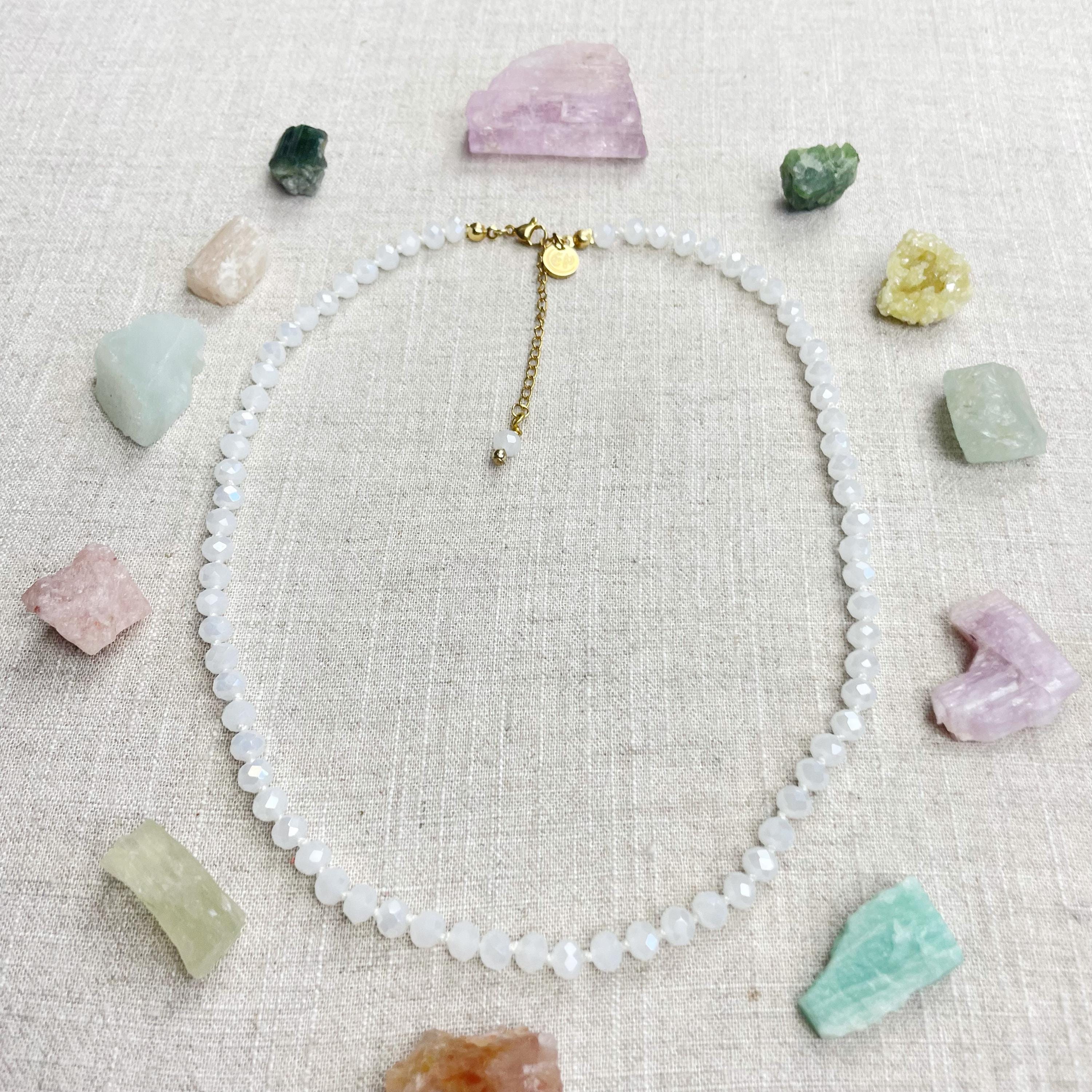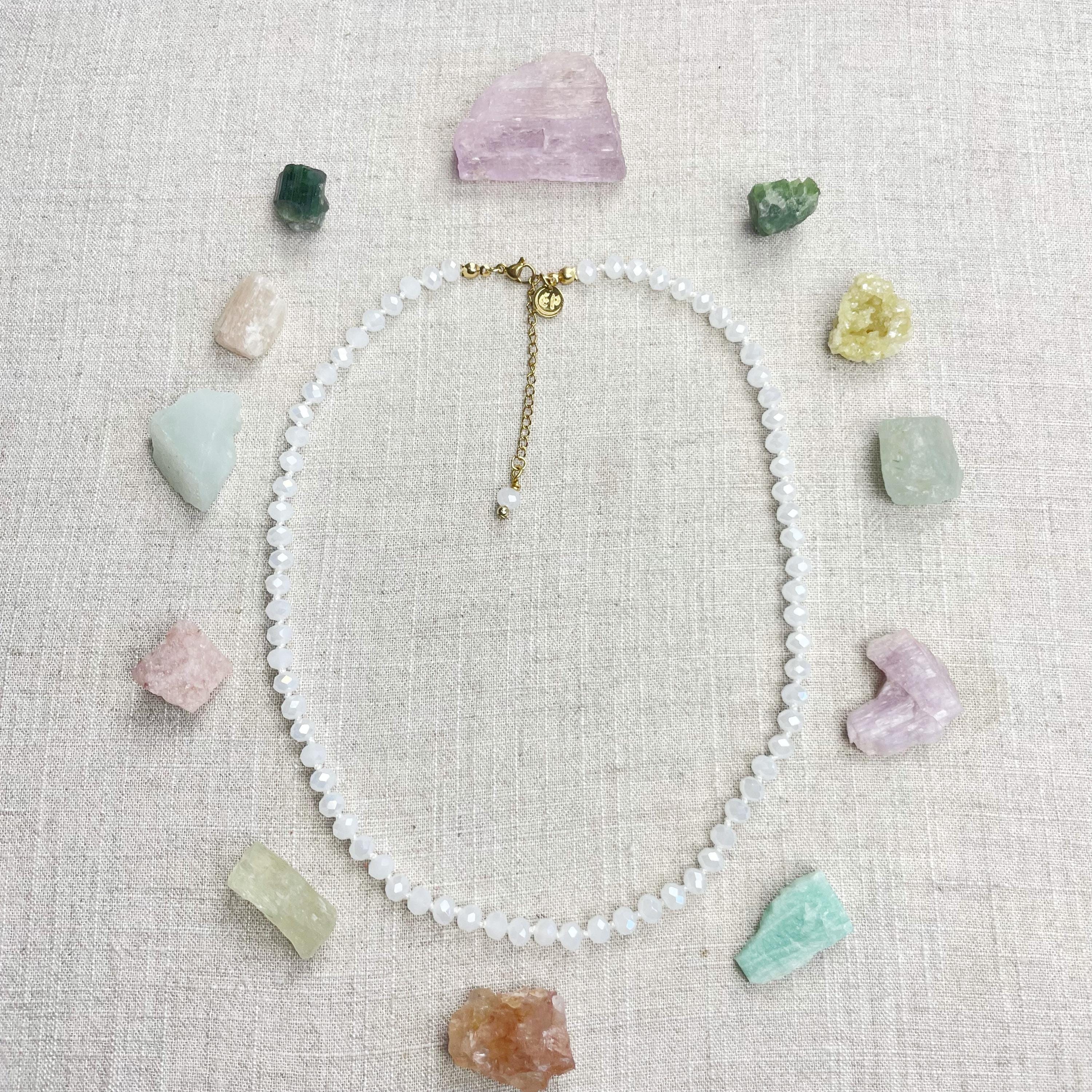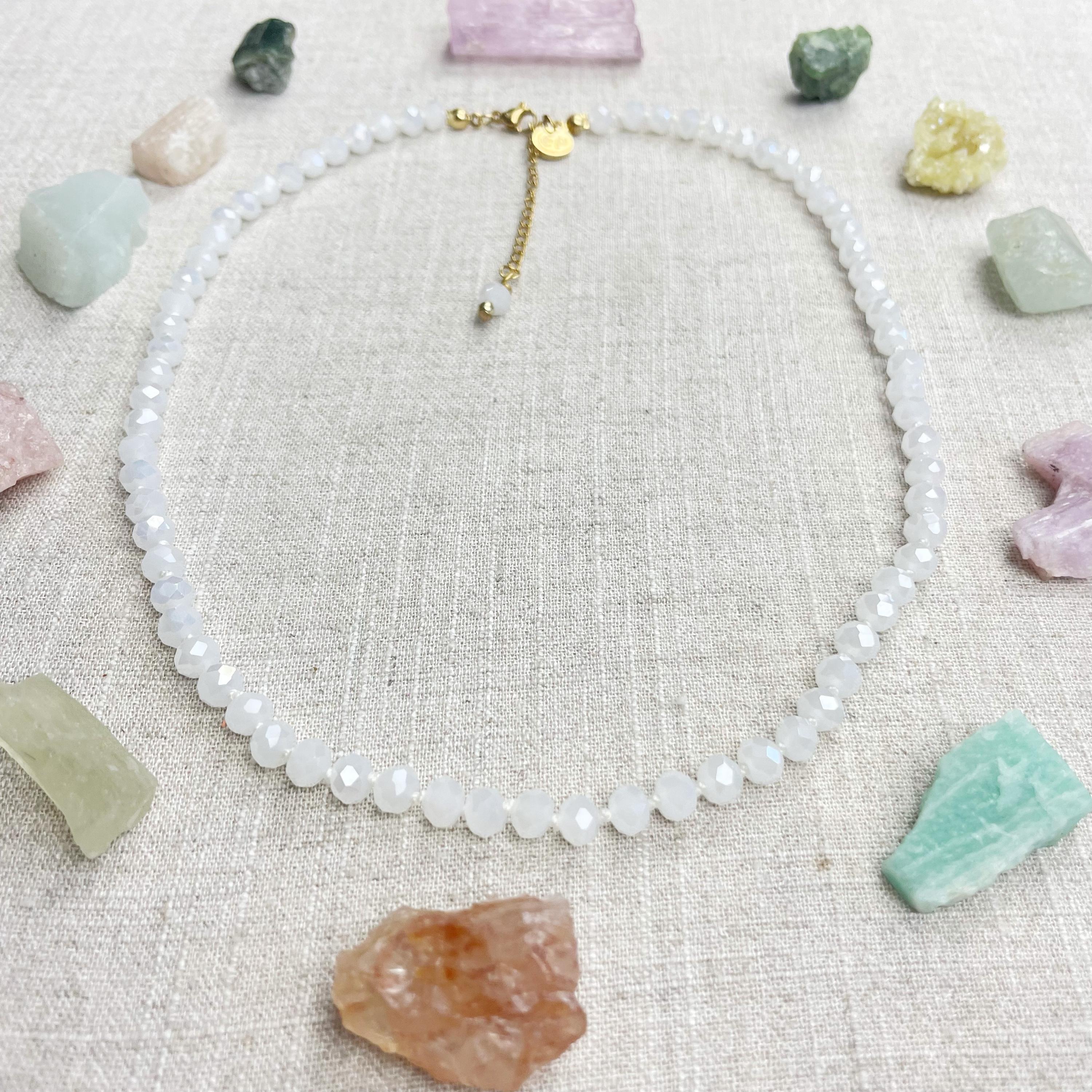 This necklace is made with glass crystal beads which are a white color with an iridescent coating. The beads are 6mm faceted rondelle beads. Each bead is hand knotted with 100% nylon cord. The hand knotting in between each beads takes time to do but looks gorgeous making the necklace also very easy to wear. The necklace is finished off with a gold plated stainless steel chain, clasp and logo charm.