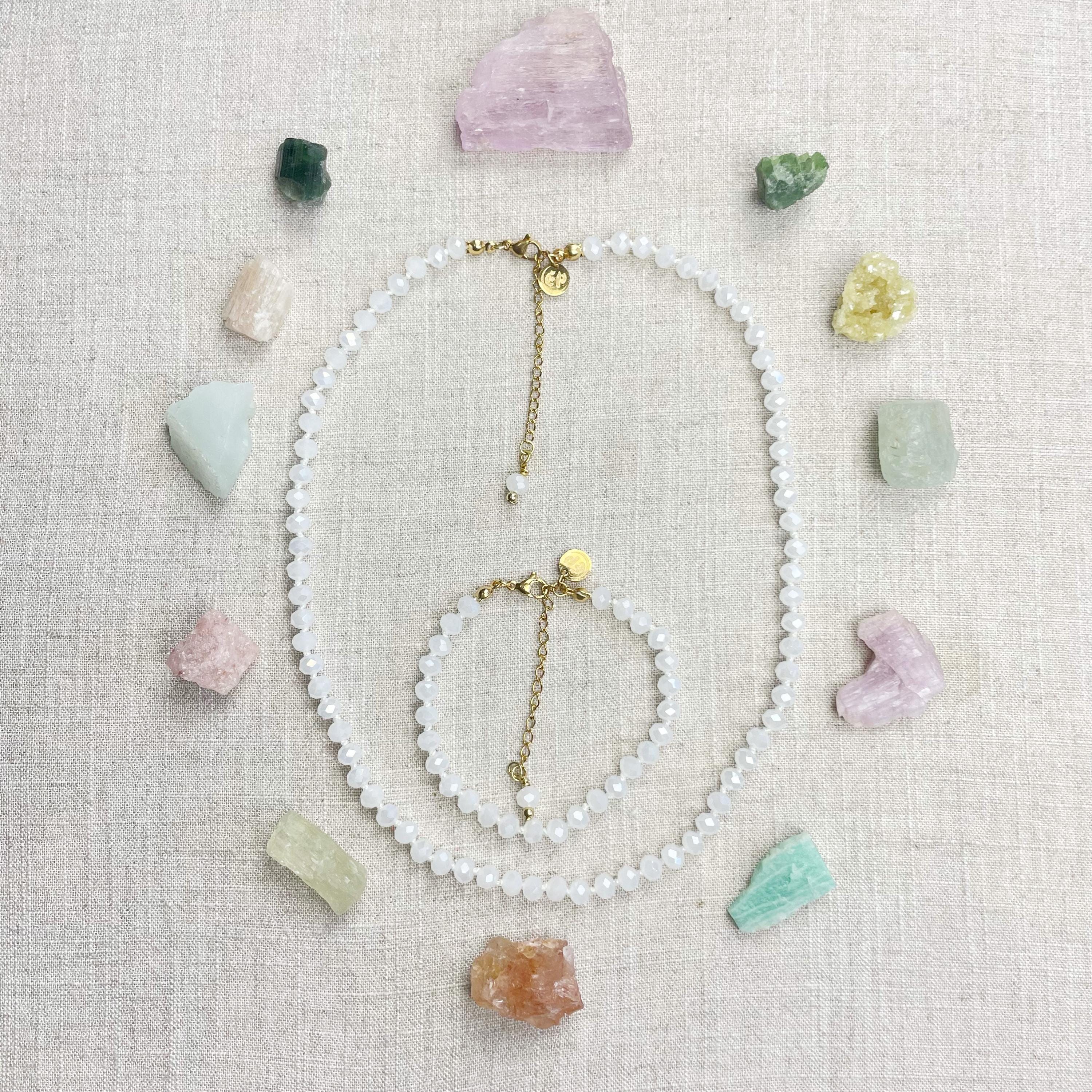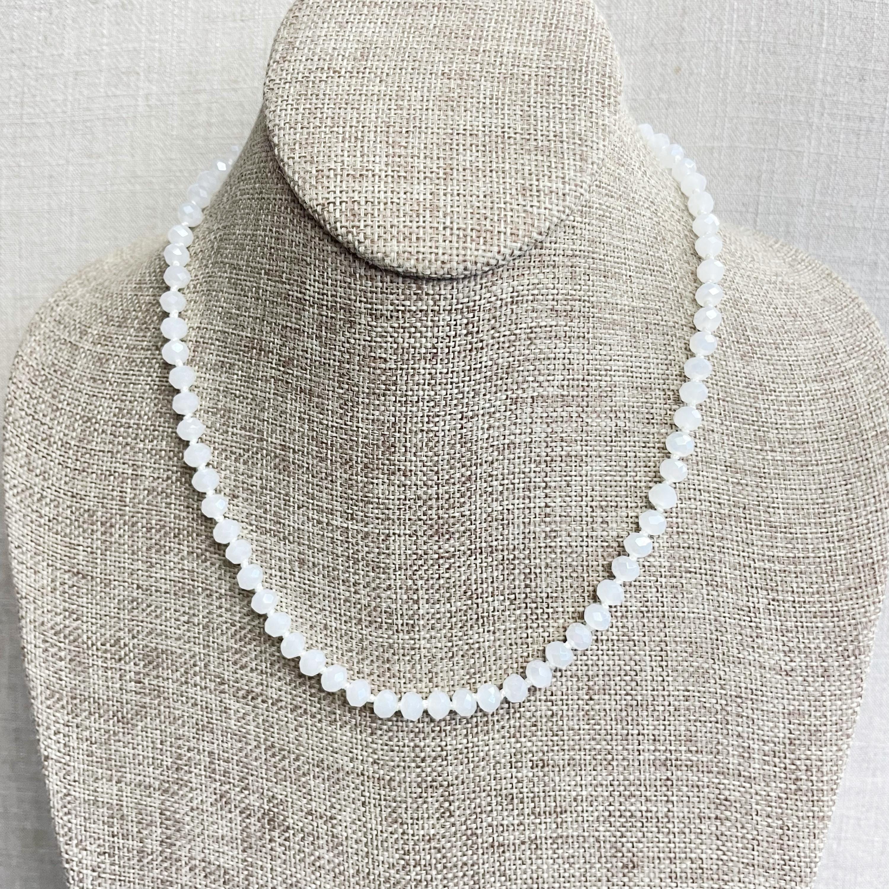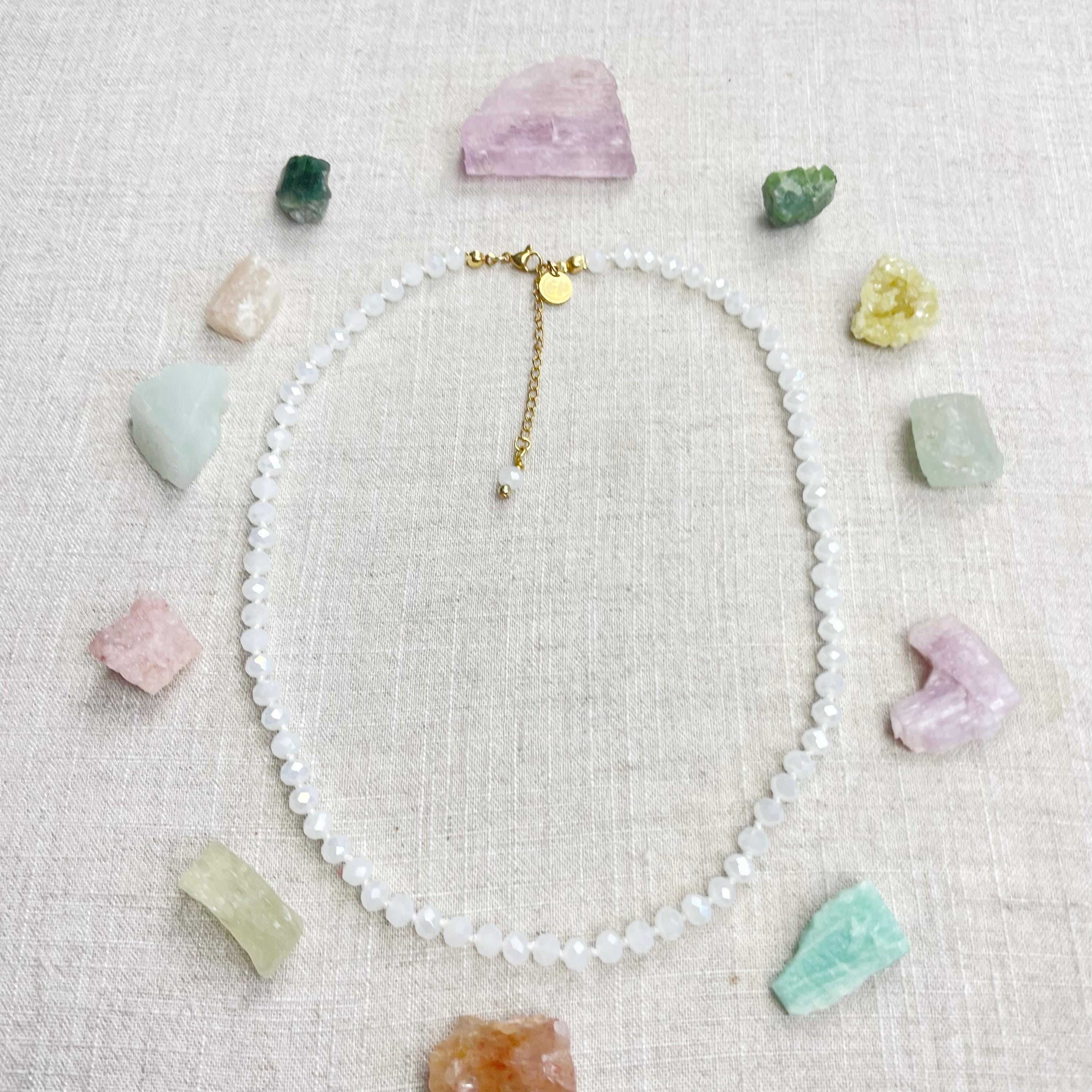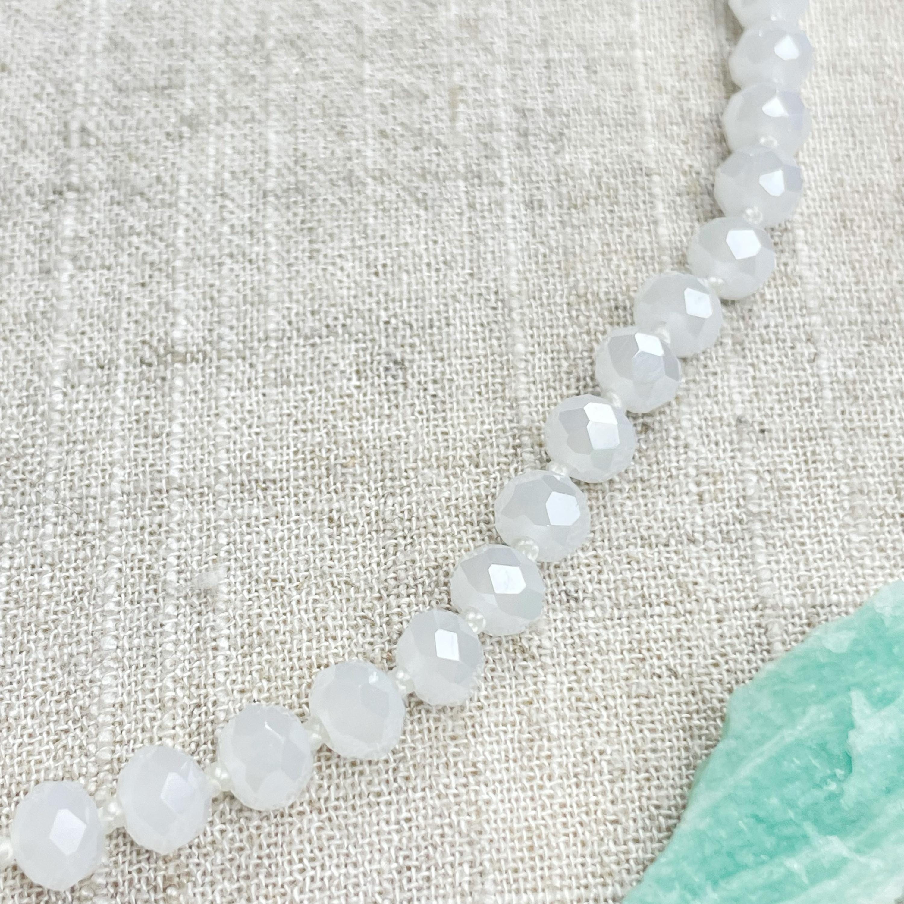 This necklace is made with glass crystal beads which are a white color with an iridescent coating. The beads are 6mm faceted rondelle beads. Each bead is hand knotted with 100% nylon cord. The hand knotting in between each beads takes time to do but looks gorgeous making the necklace also very easy to wear. The necklace is finished off with a gold plated stainless steel chain, clasp and logo charm.