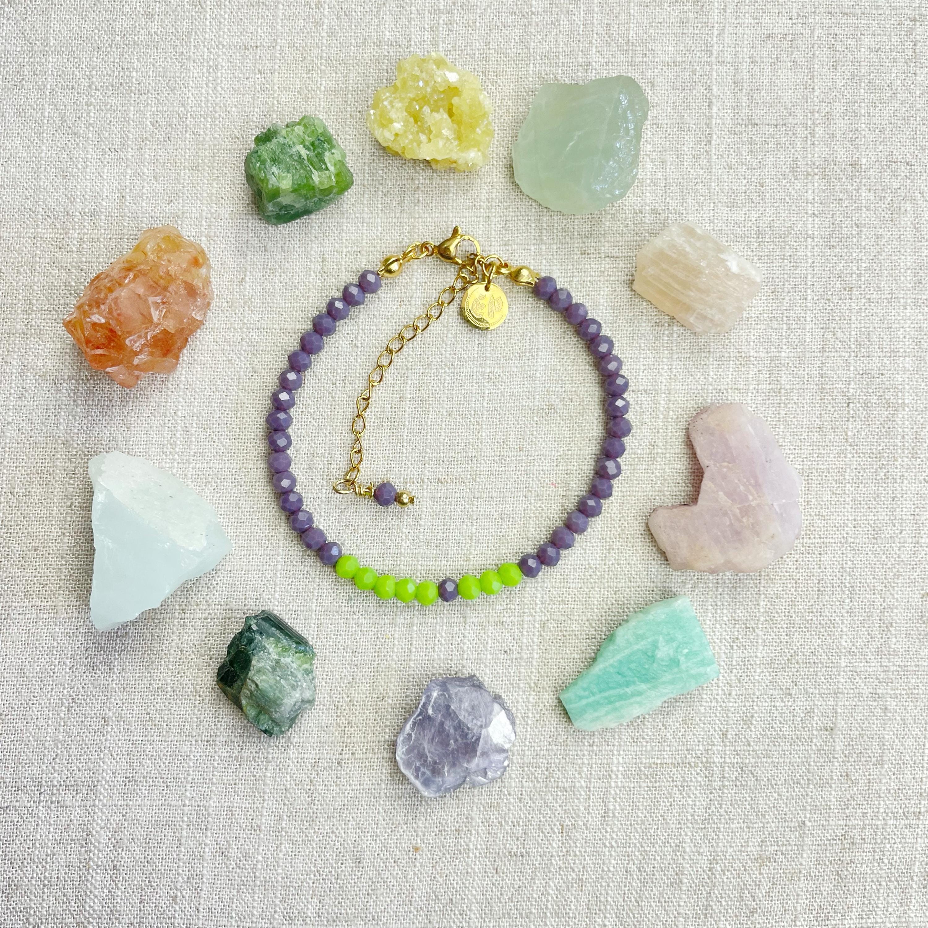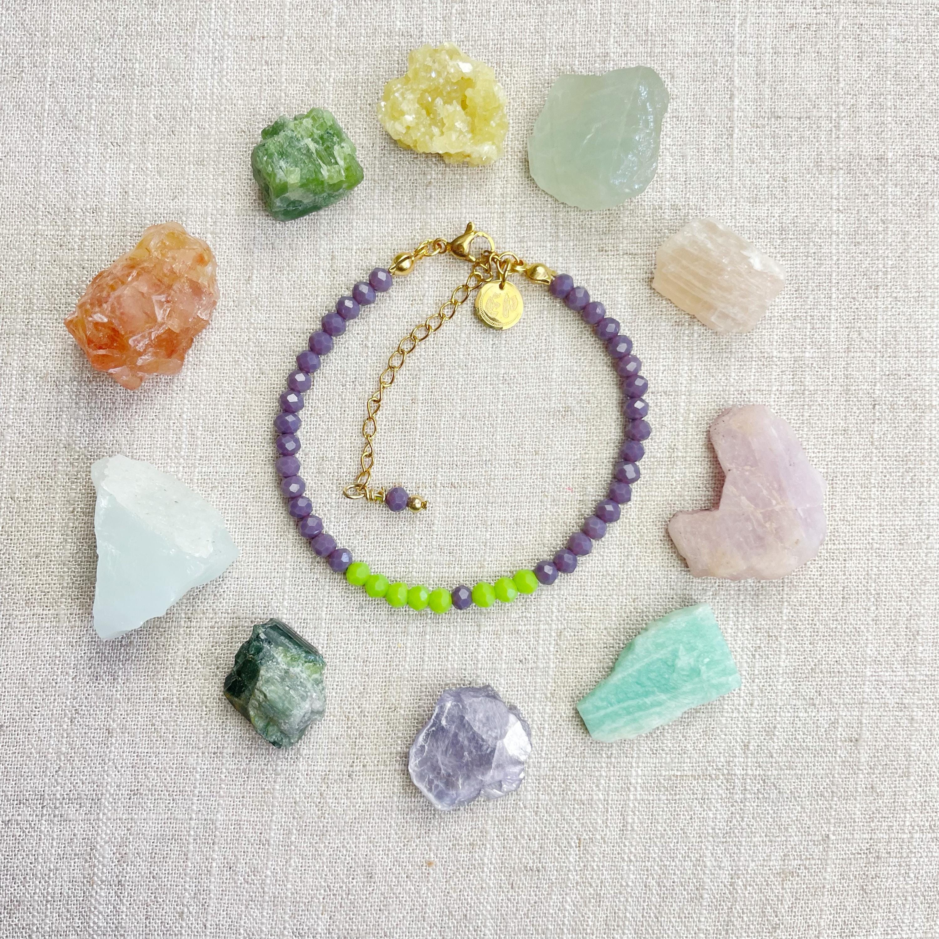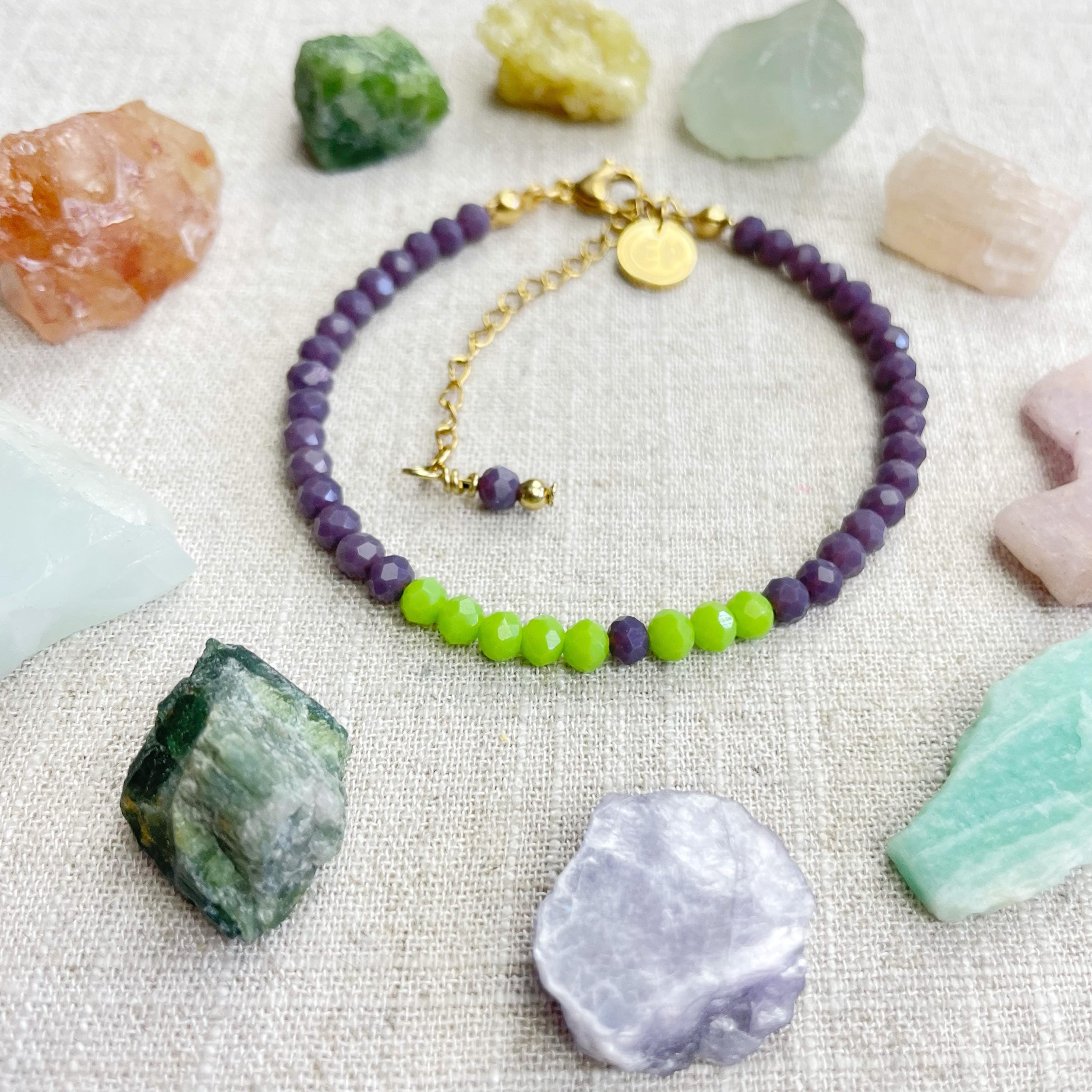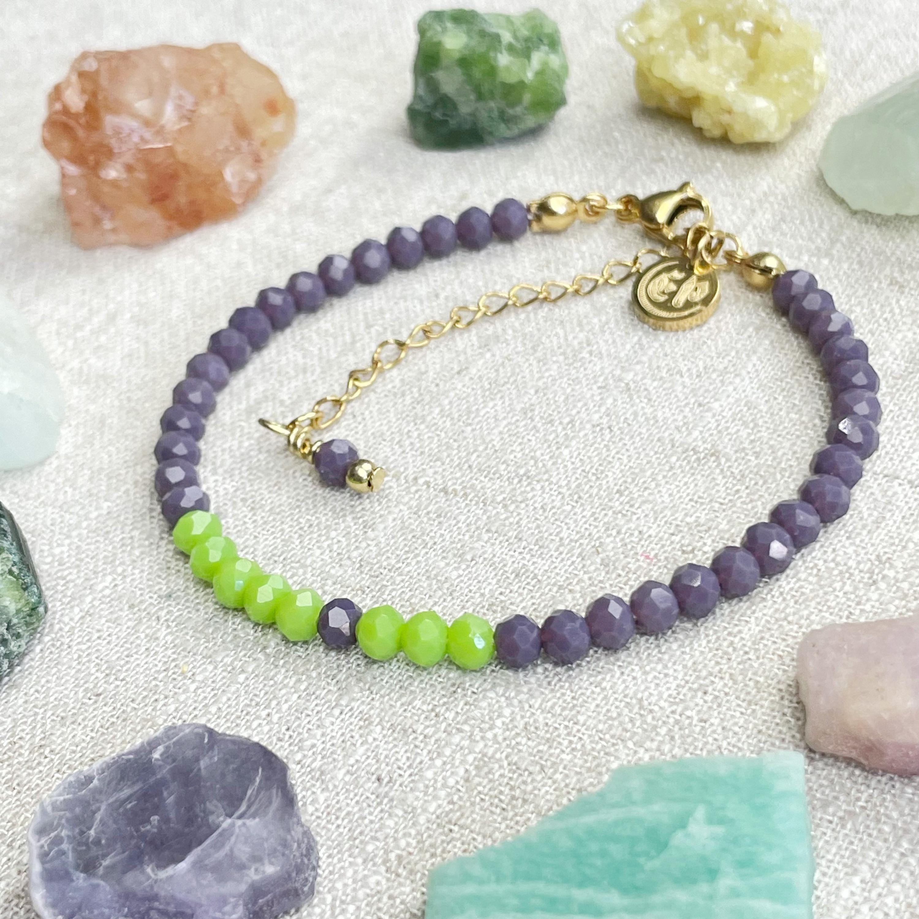 This bracelet is made with glass crystal beads which are opaque. The bracelet is made from two different colors which compliment each other. The beads are 4mm faceted rondelle beads. Each bead is strung on a 100% nylon cord. The bracelet is finished off with a gold plated stainless steel chain, clasp and logo charm.