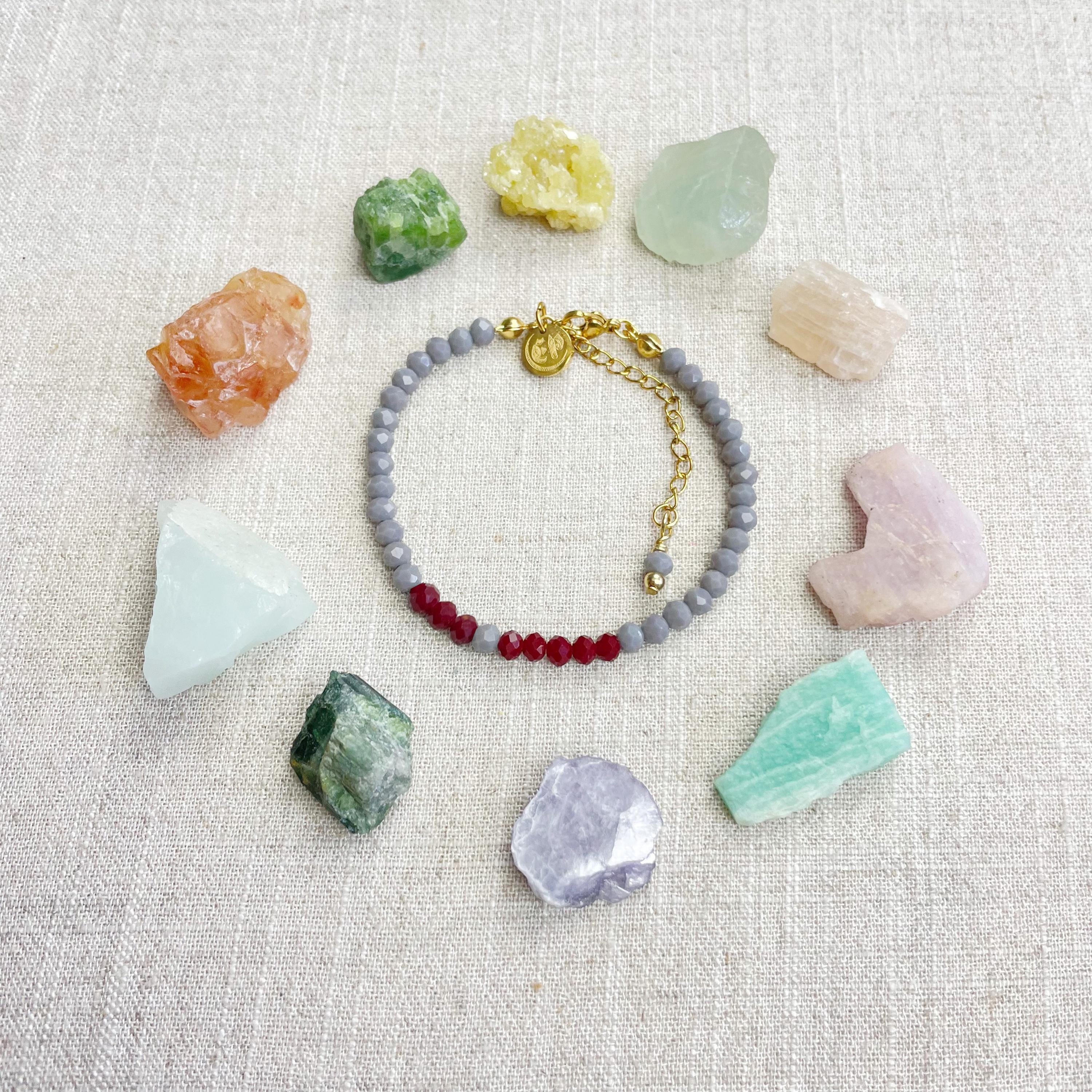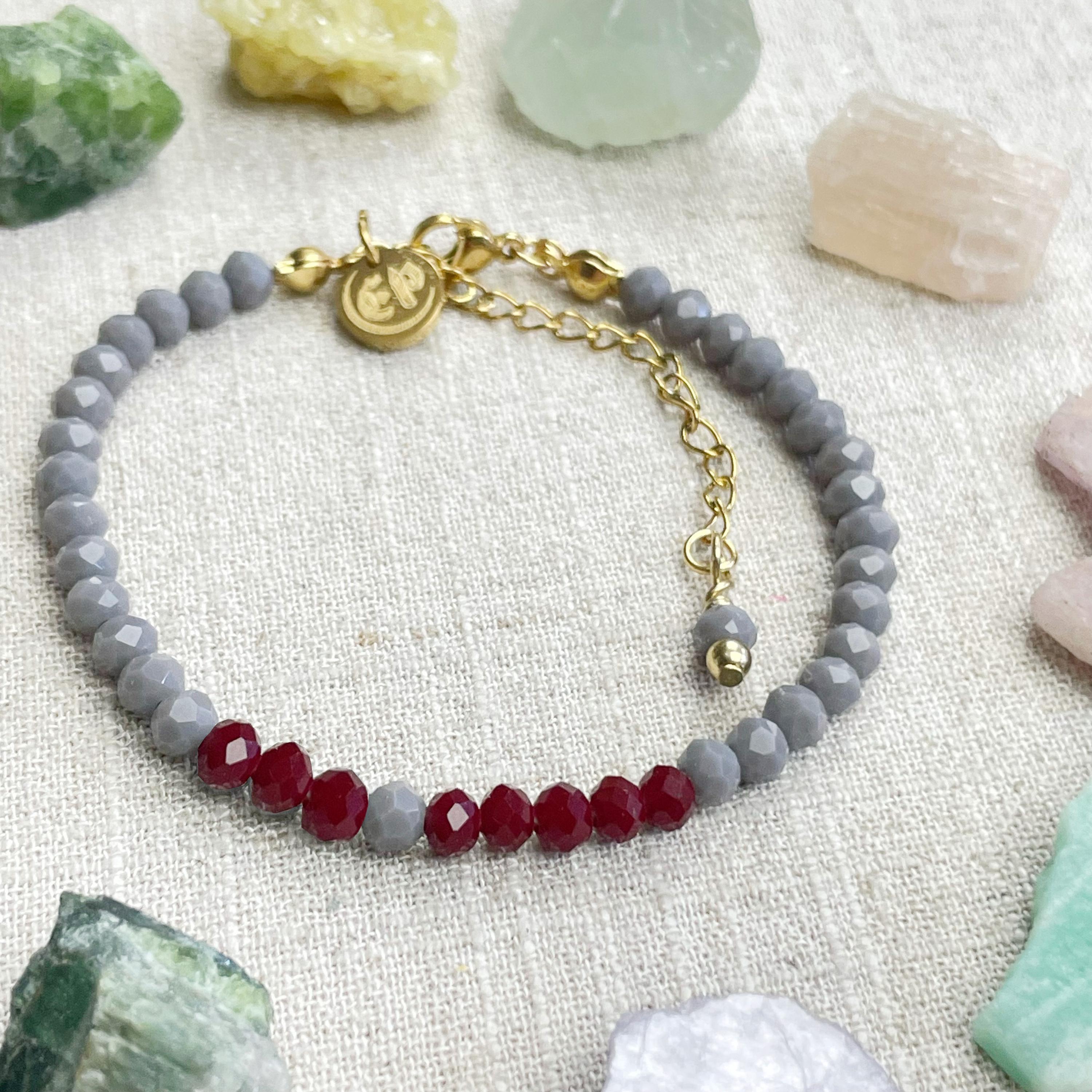 This bracelet is made with glass crystal beads which are opaque. The bracelet is made from two different colors which compliment each other. The beads are 4mm faceted rondelle beads. Each bead is strung on a 100% nylon cord. The bracelet is finished off with a gold plated stainless steel chain, clasp and logo charm.