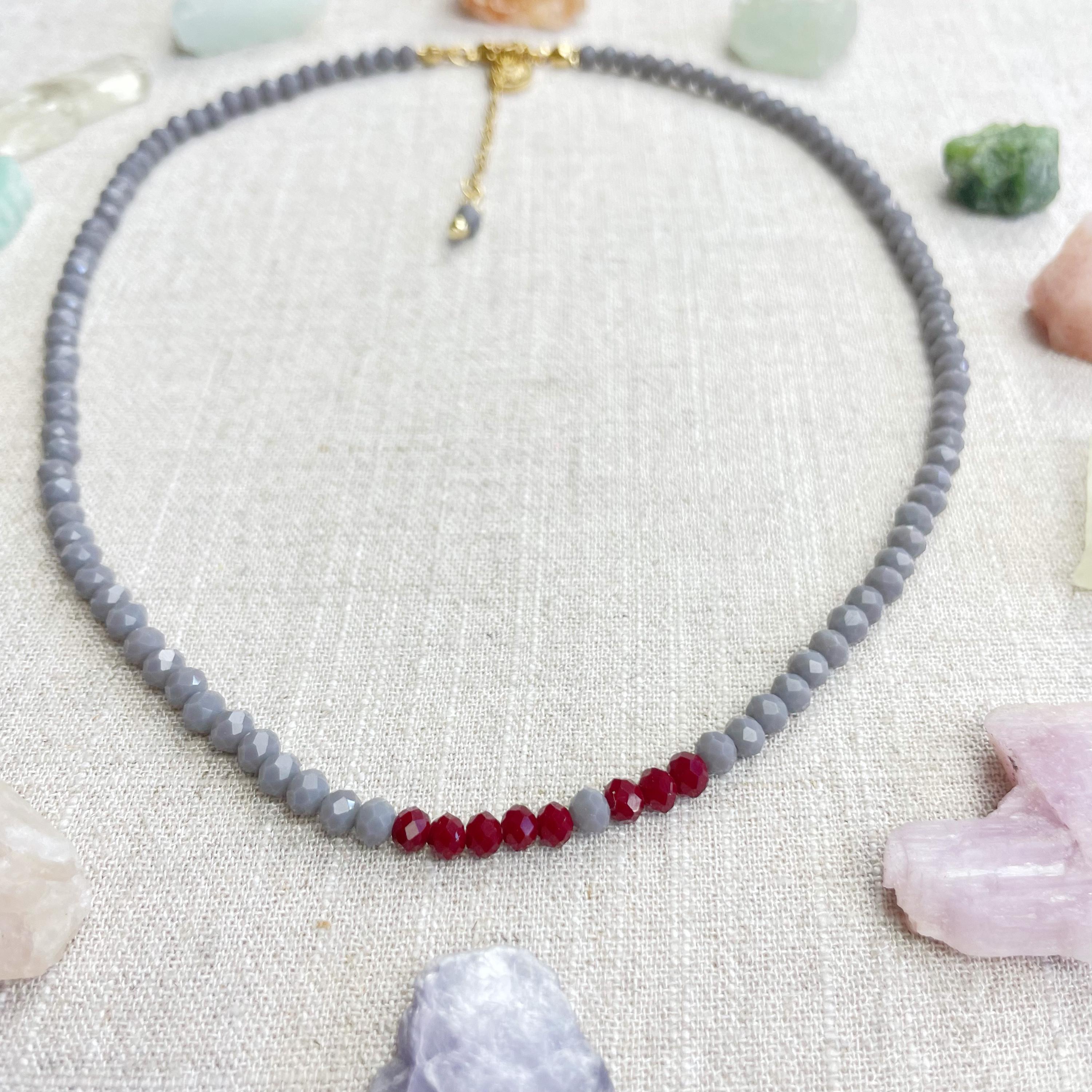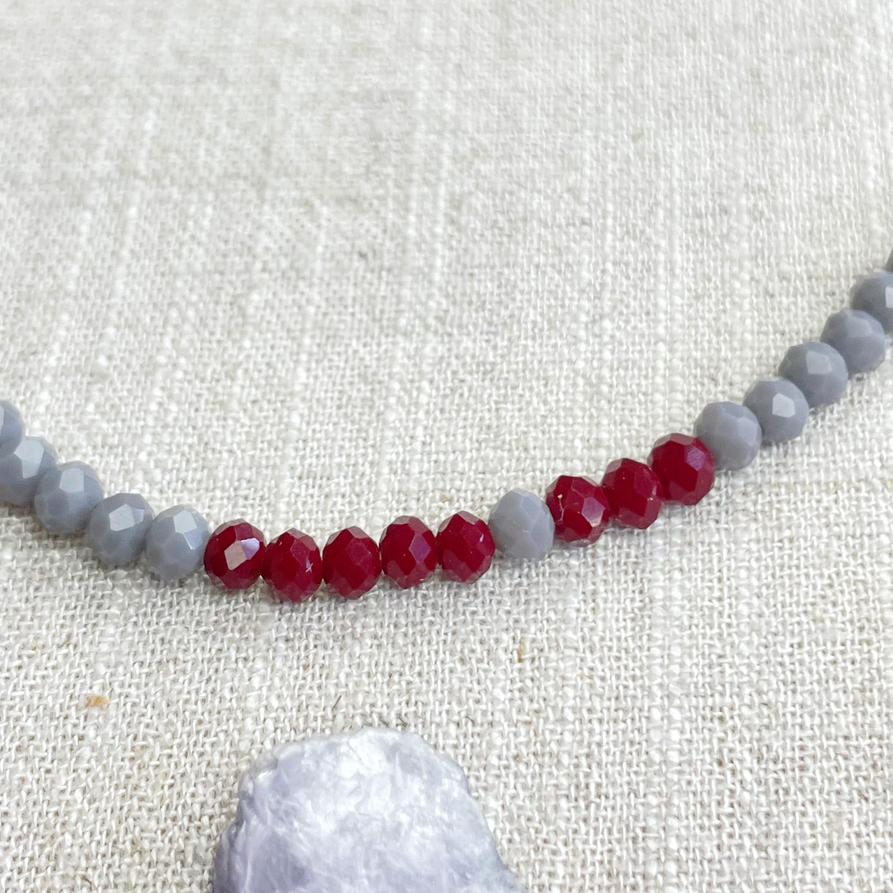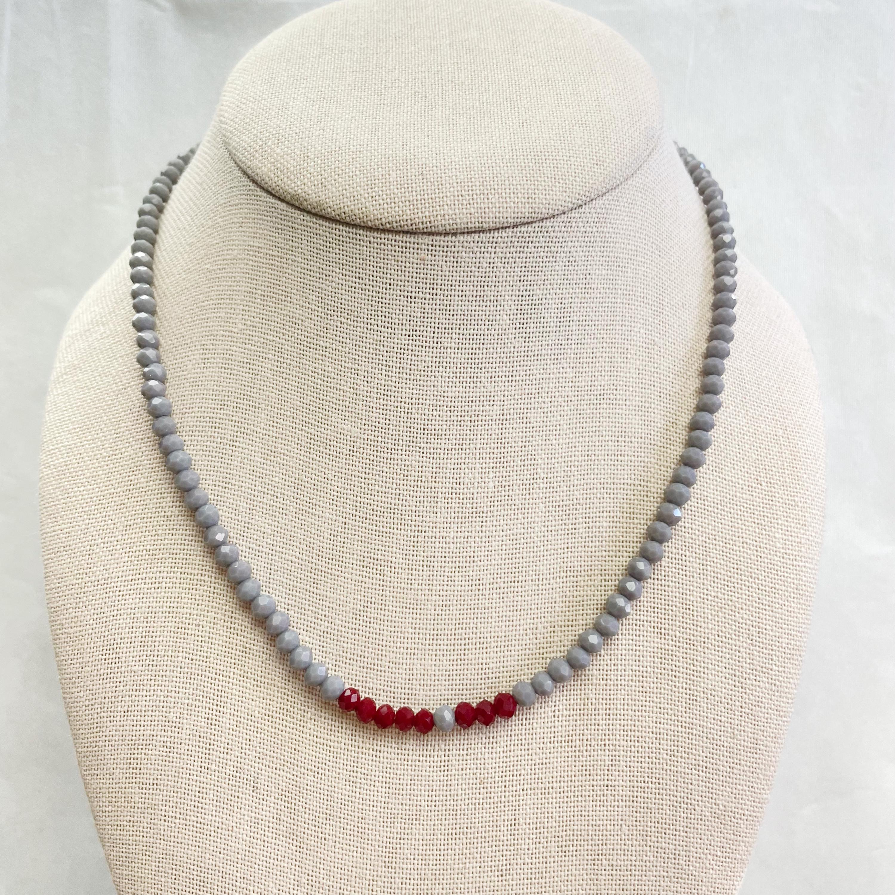 This necklace is made with glass crystal beads which are opaque. The necklace is made from two different colors which compliment each other. The beads are 4mm faceted rondelle beads. Each bead is strung on a 100% nylon cord. The necklace is finished off with a gold plated stainless steel chain, clasp and logo charm.