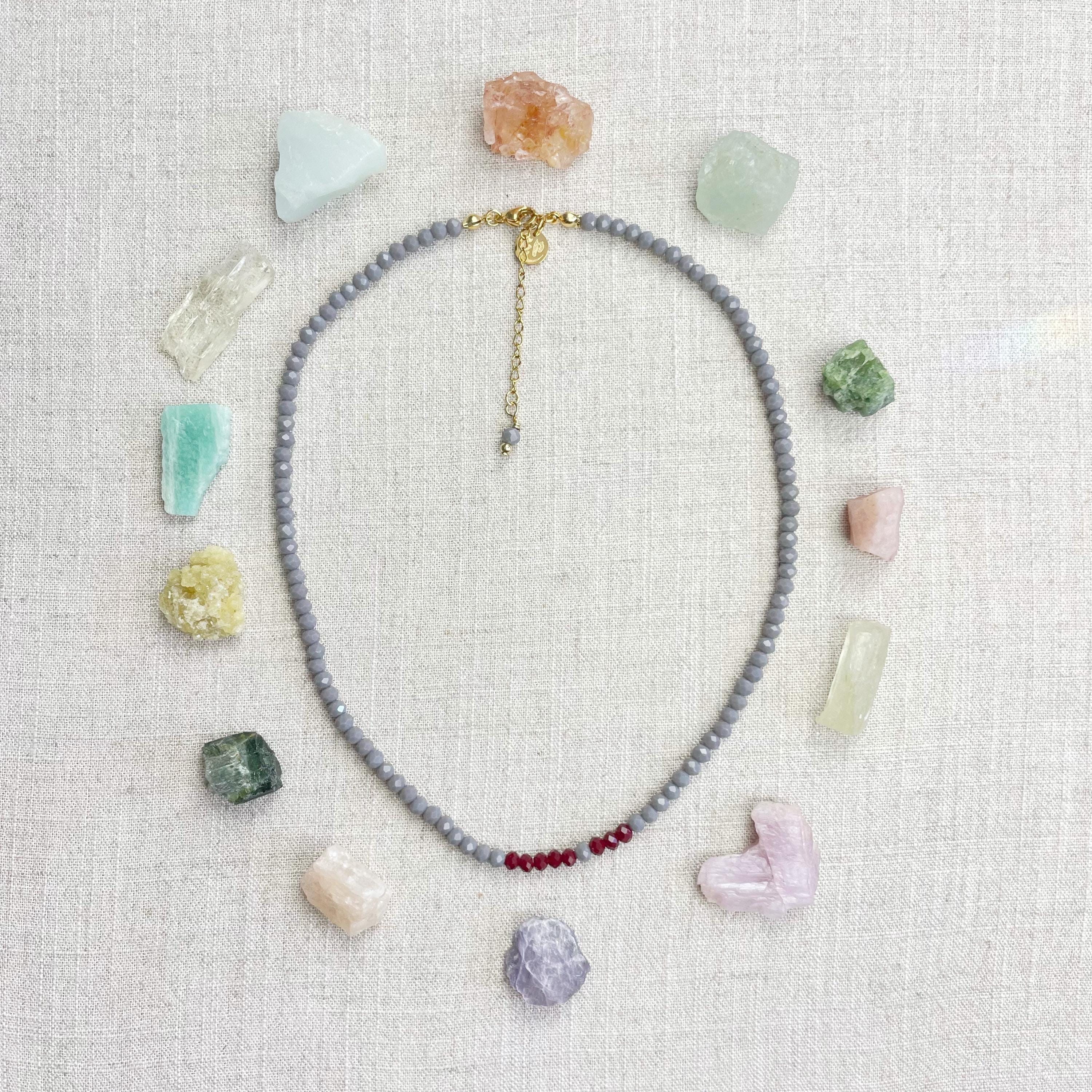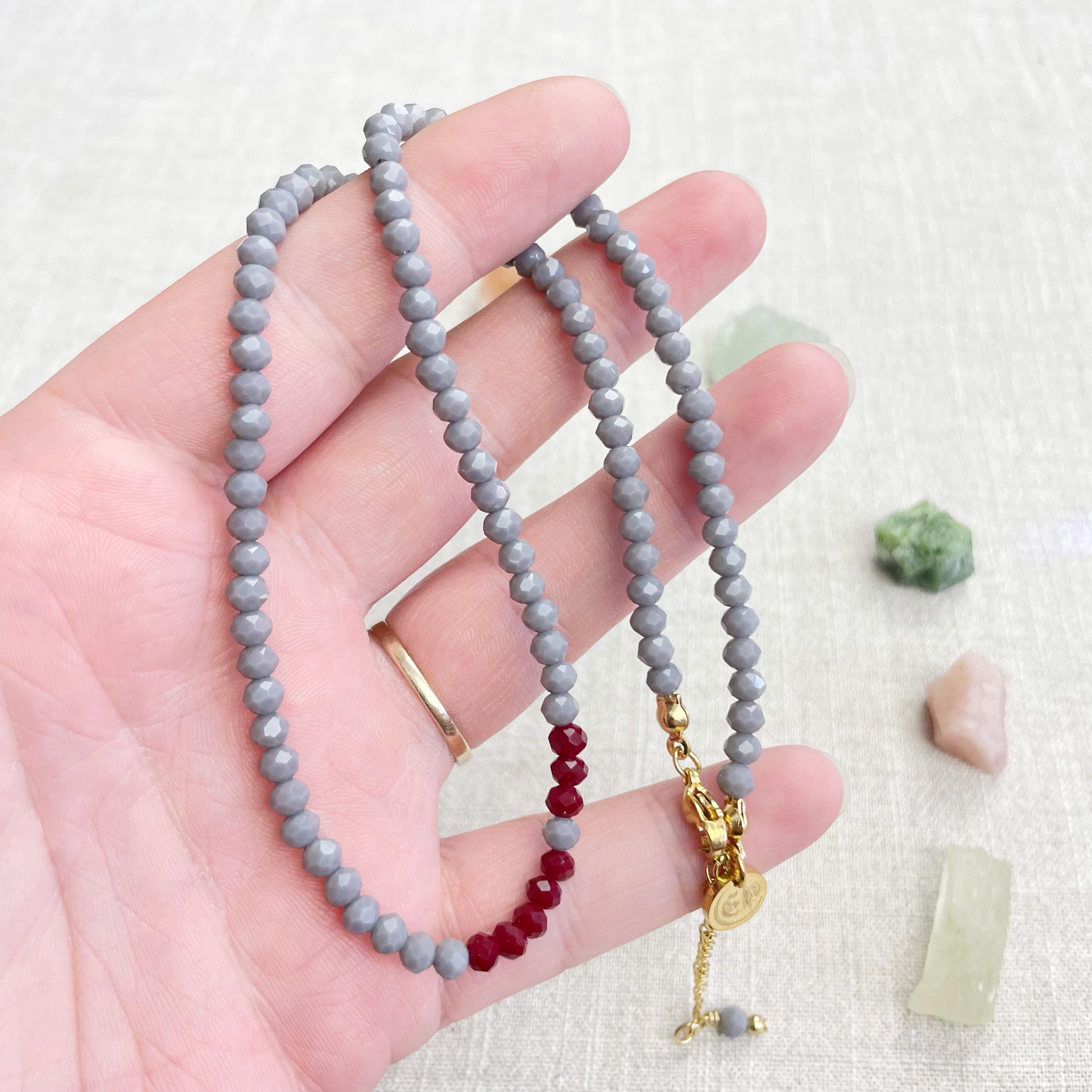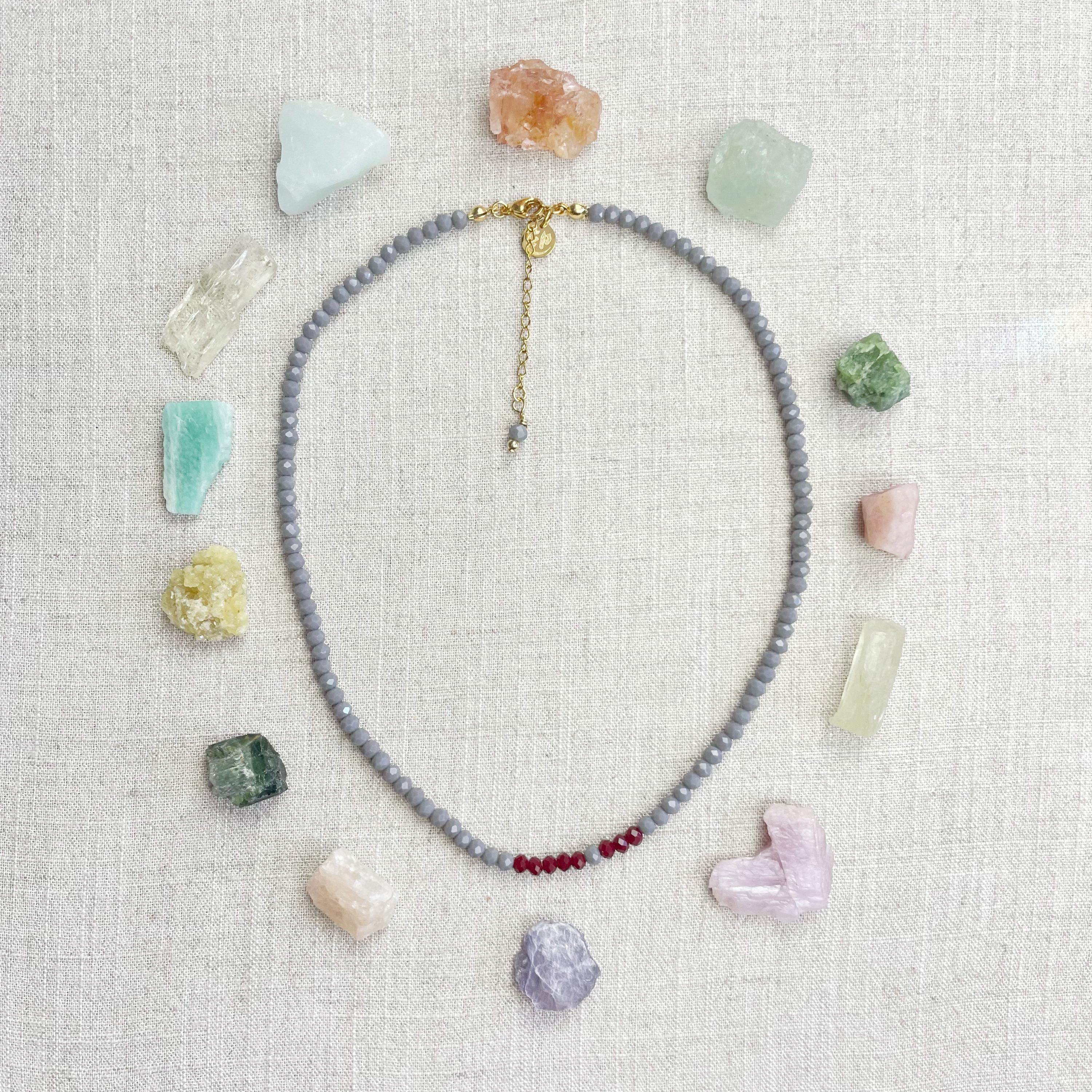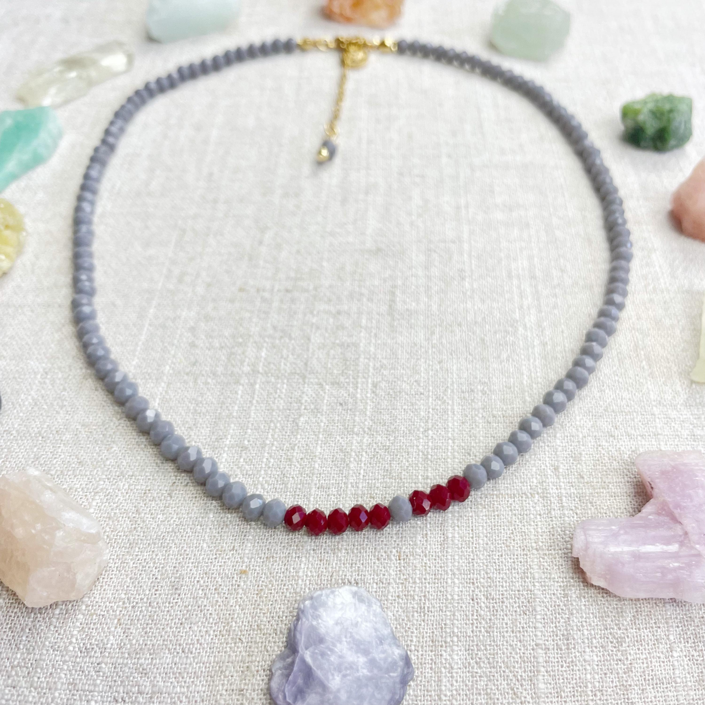 This necklace is made with glass crystal beads which are opaque. The necklace is made from two different colors which compliment each other. The beads are 4mm faceted rondelle beads. Each bead is strung on a 100% nylon cord. The necklace is finished off with a gold plated stainless steel chain, clasp and logo charm.
