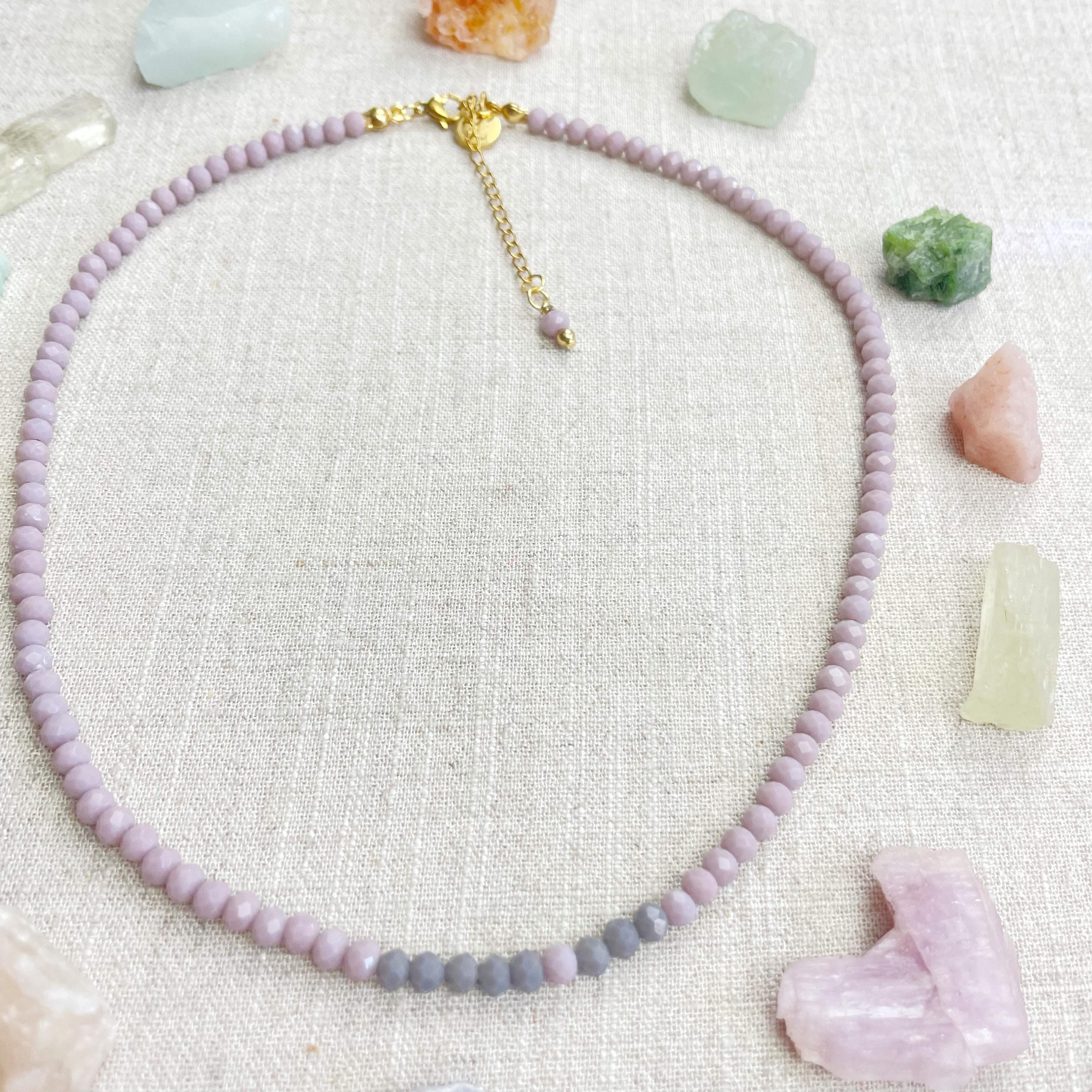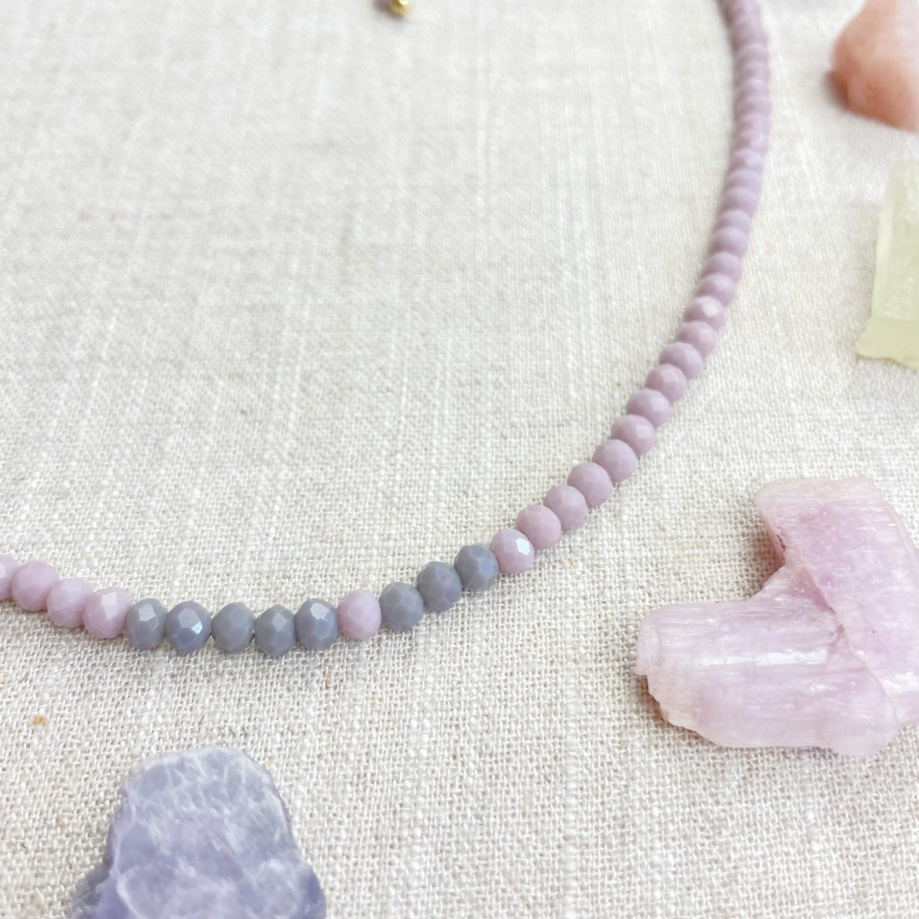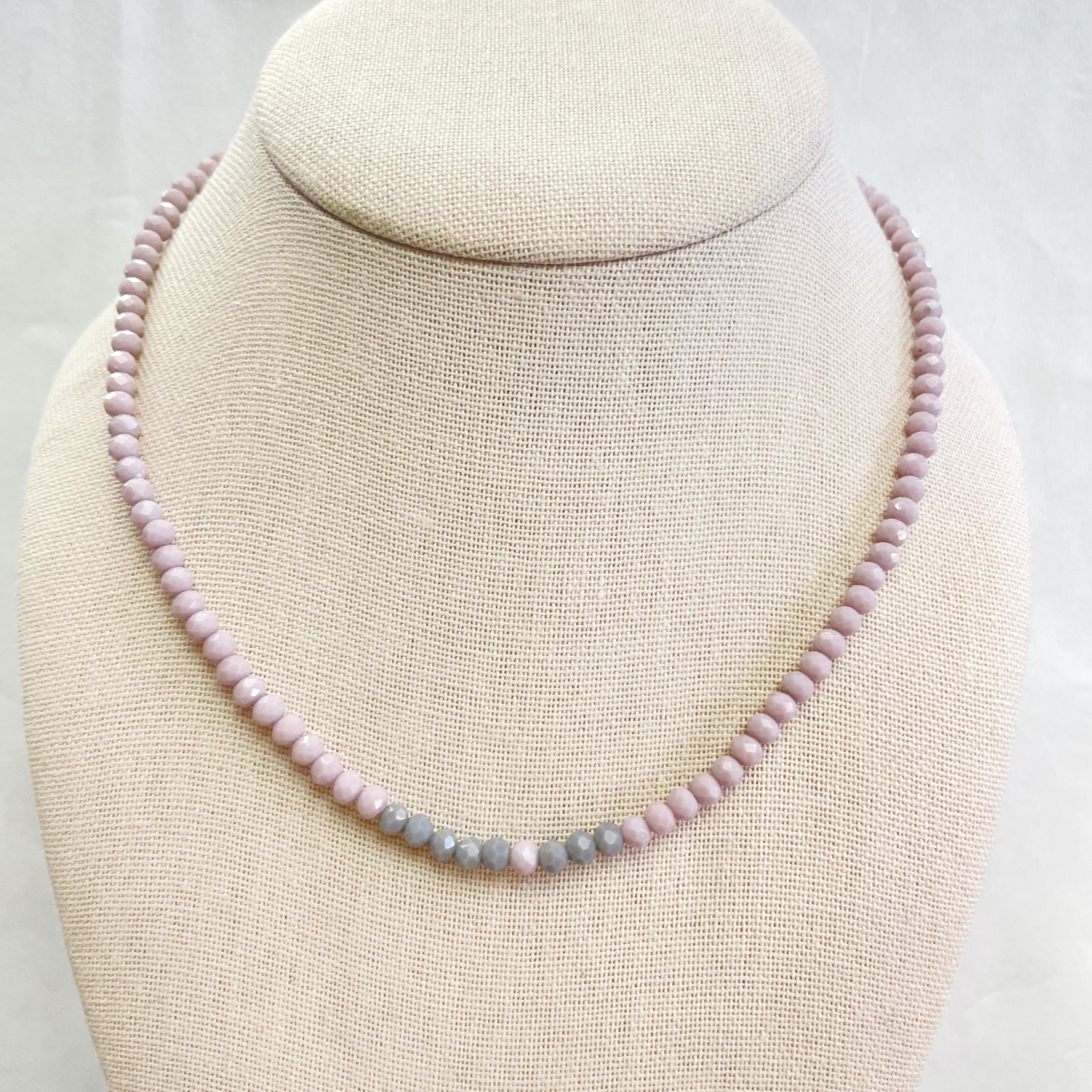 This necklace is made with glass crystal beads which are opaque. The necklace is made from two different colors which compliment each other. The beads are 4mm faceted rondelle beads. Each bead is strung on a 100% nylon cord. The necklace is finished off with a gold plated stainless steel chain, clasp and logo charm.