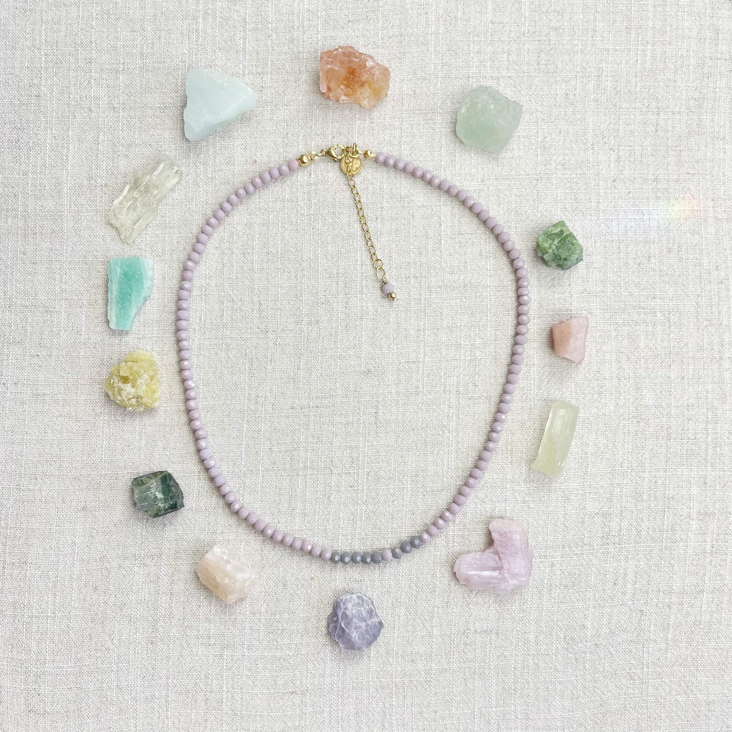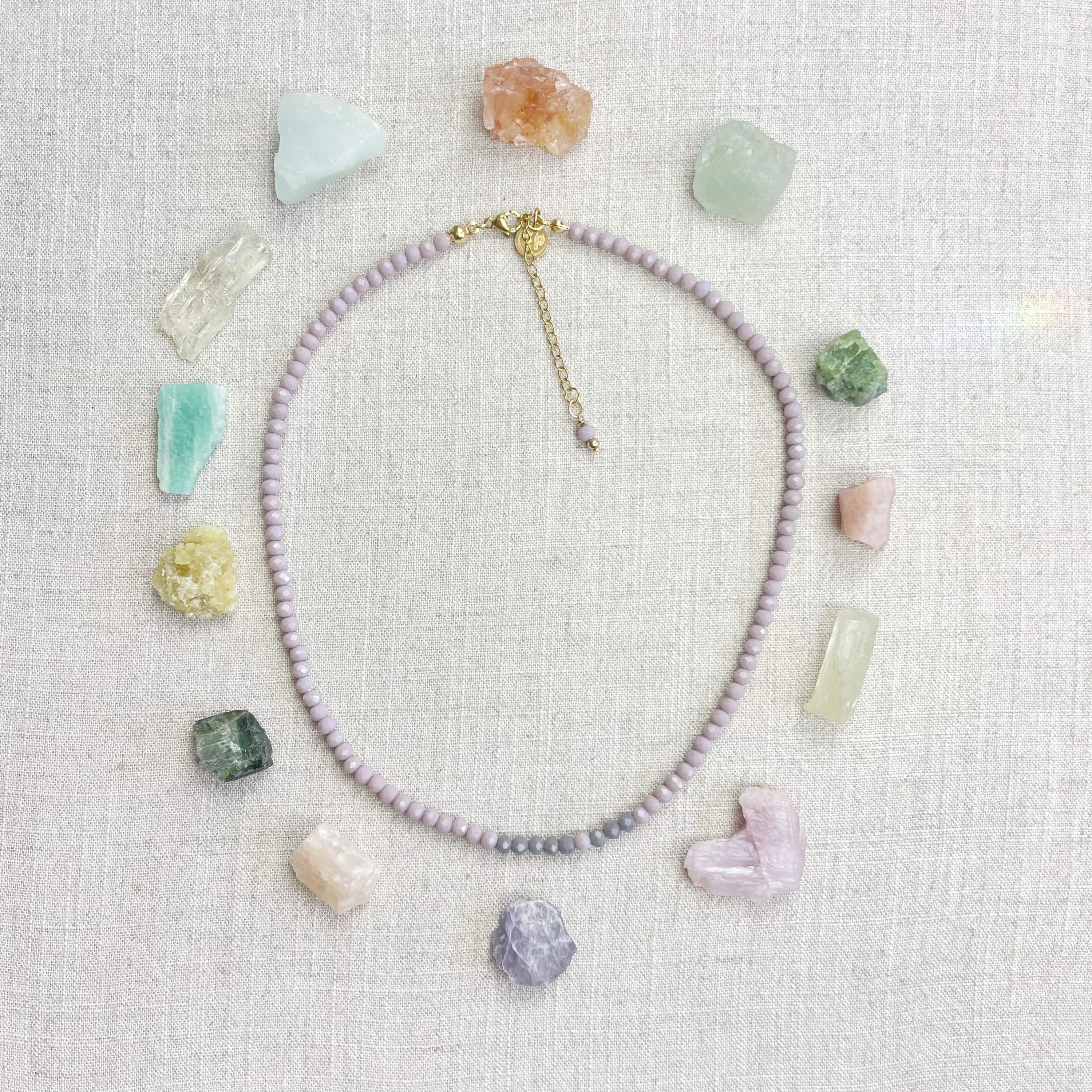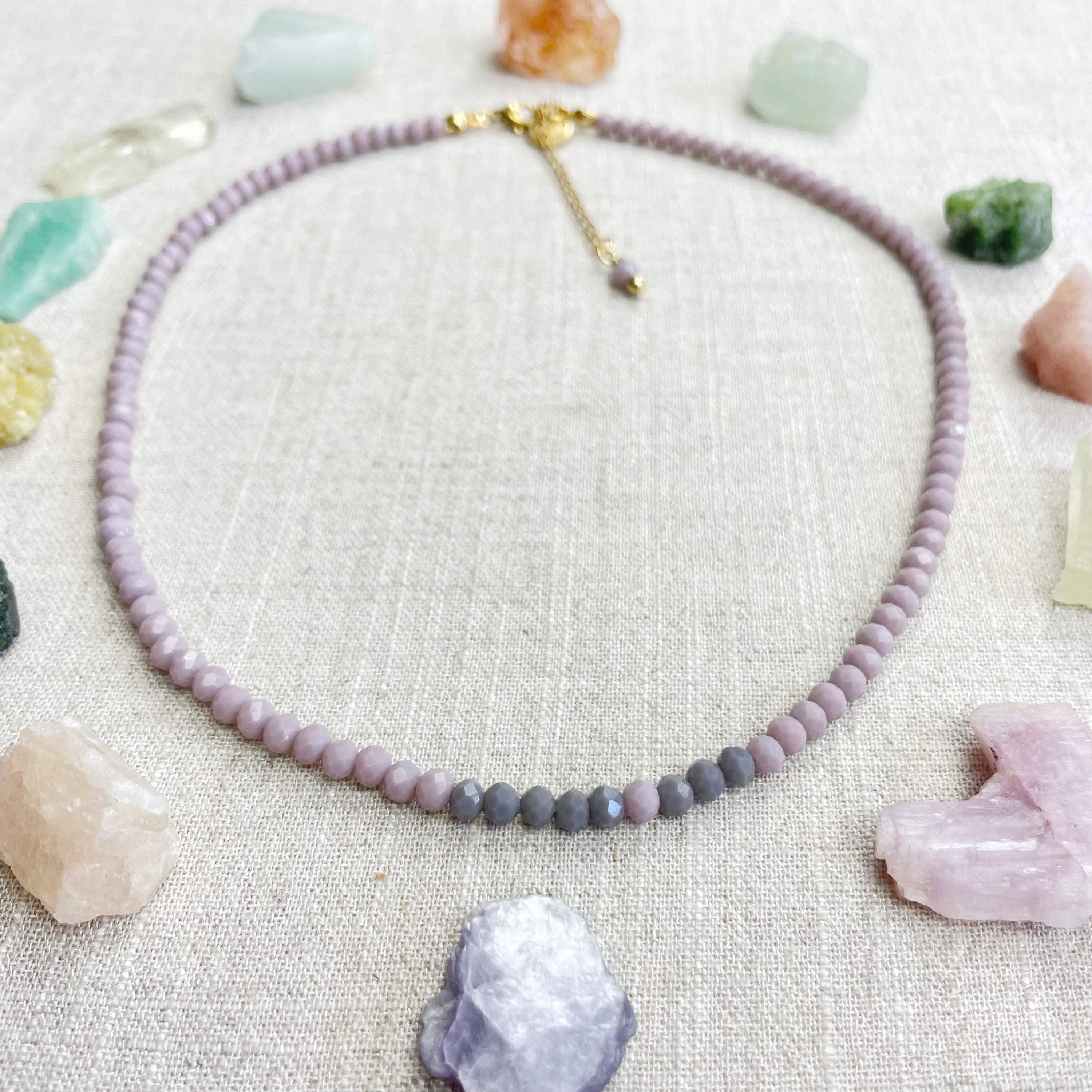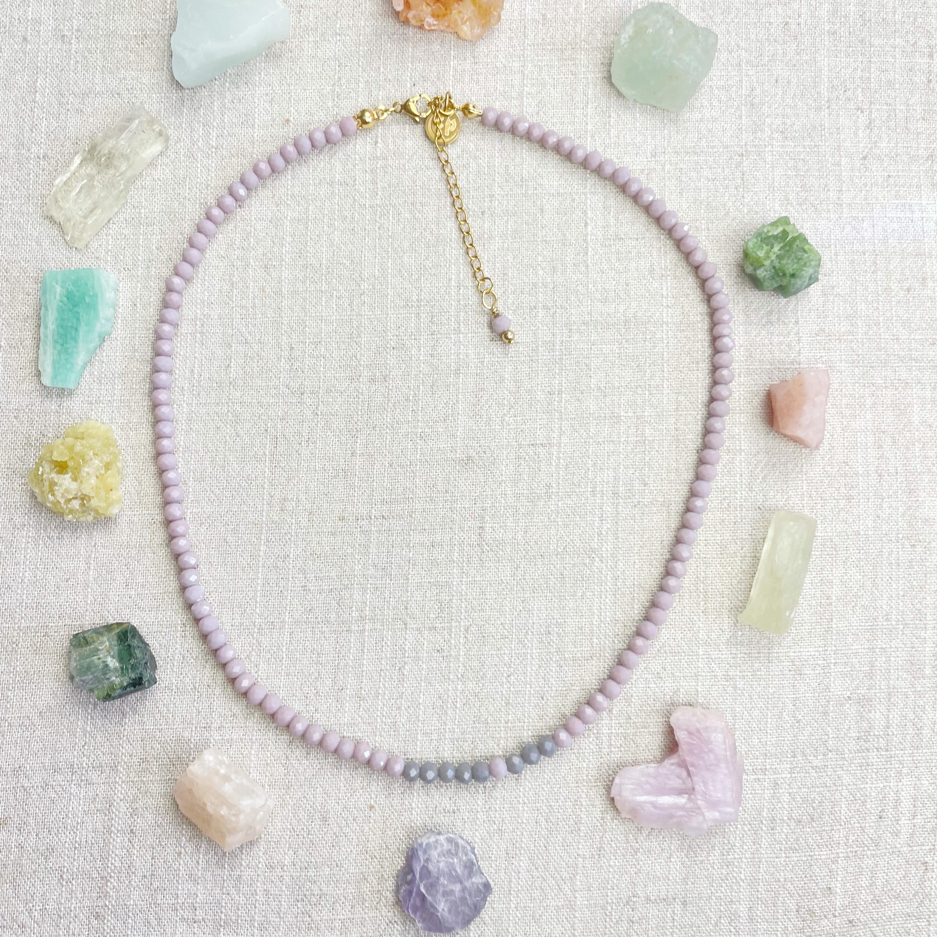 This necklace is made with glass crystal beads which are opaque. The necklace is made from two different colors which compliment each other. The beads are 4mm faceted rondelle beads. Each bead is strung on a 100% nylon cord. The necklace is finished off with a gold plated stainless steel chain, clasp and logo charm.
