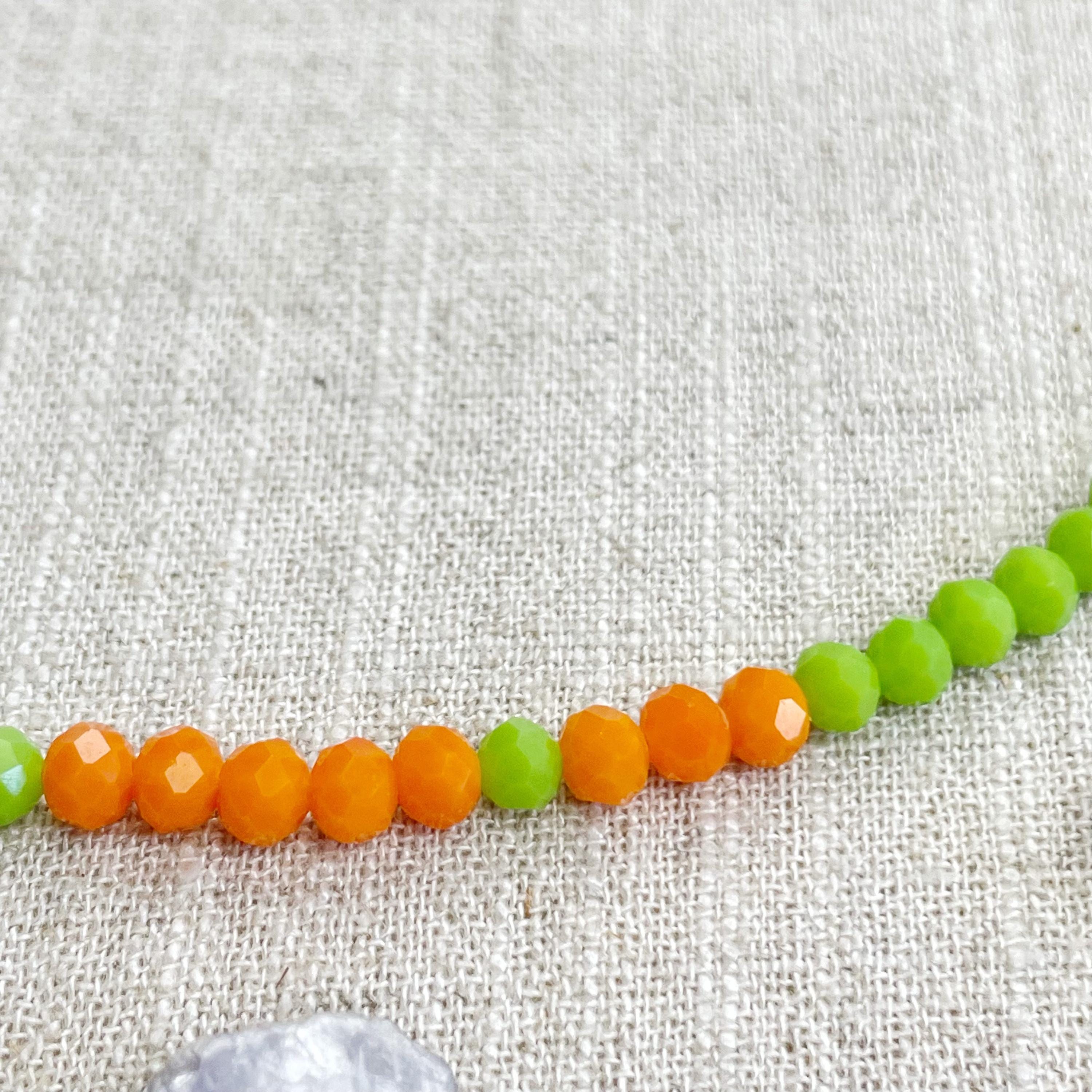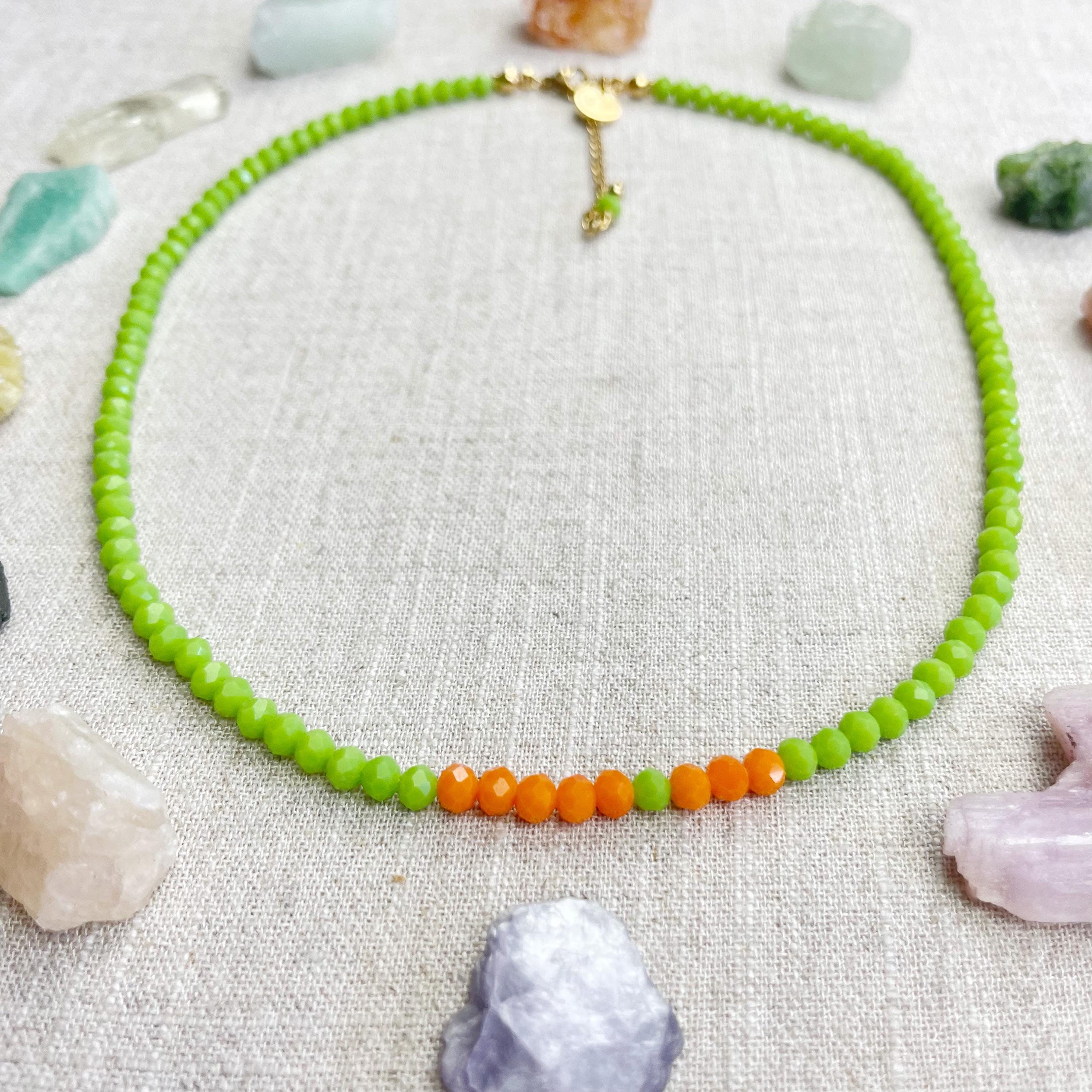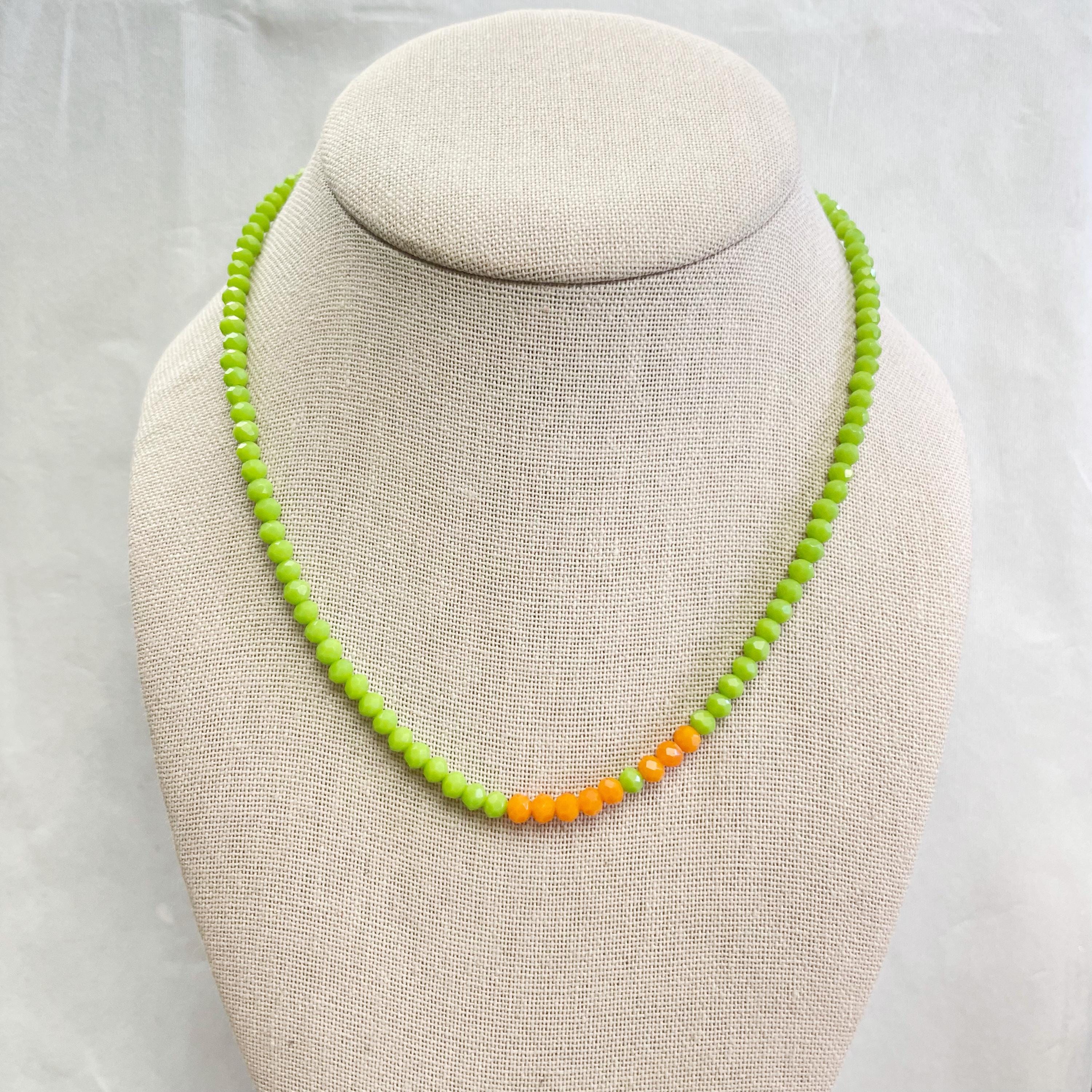 This necklace is made with glass crystal beads which are opaque. The necklace is made from two different colors which compliment each other. The beads are 4mm faceted rondelle beads. Each bead is strung on a 100% nylon cord. The necklace is finished off with a gold plated stainless steel chain, clasp and logo charm.