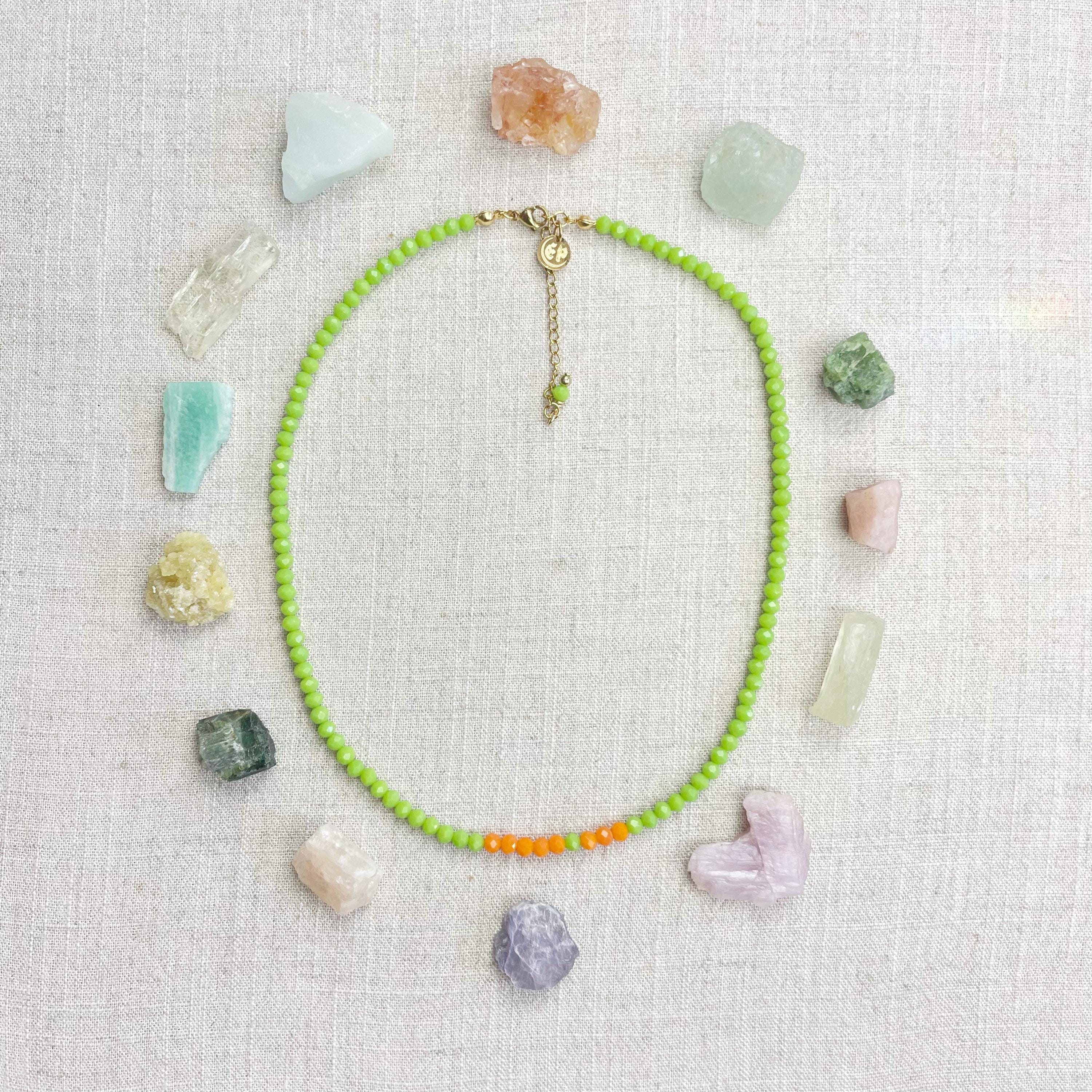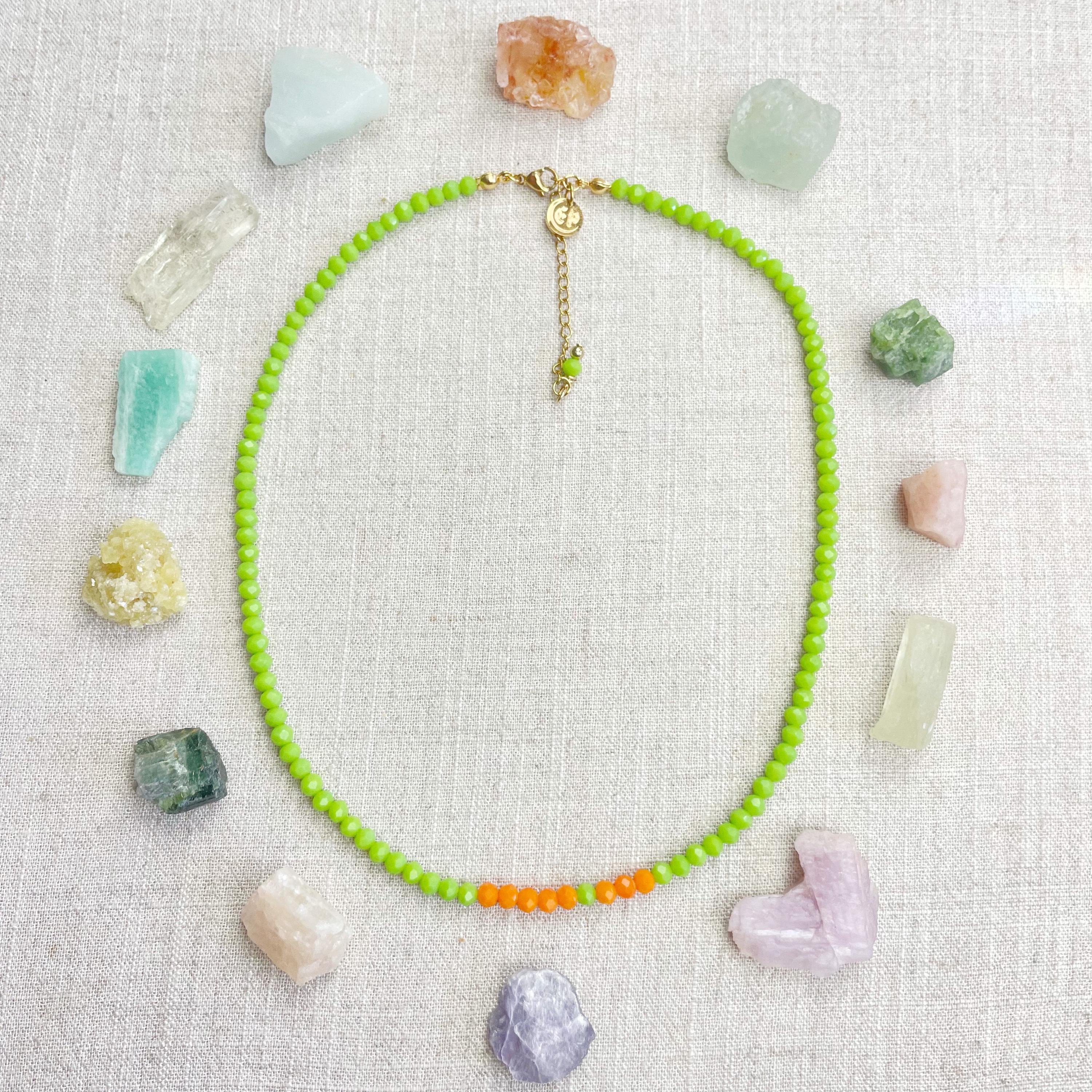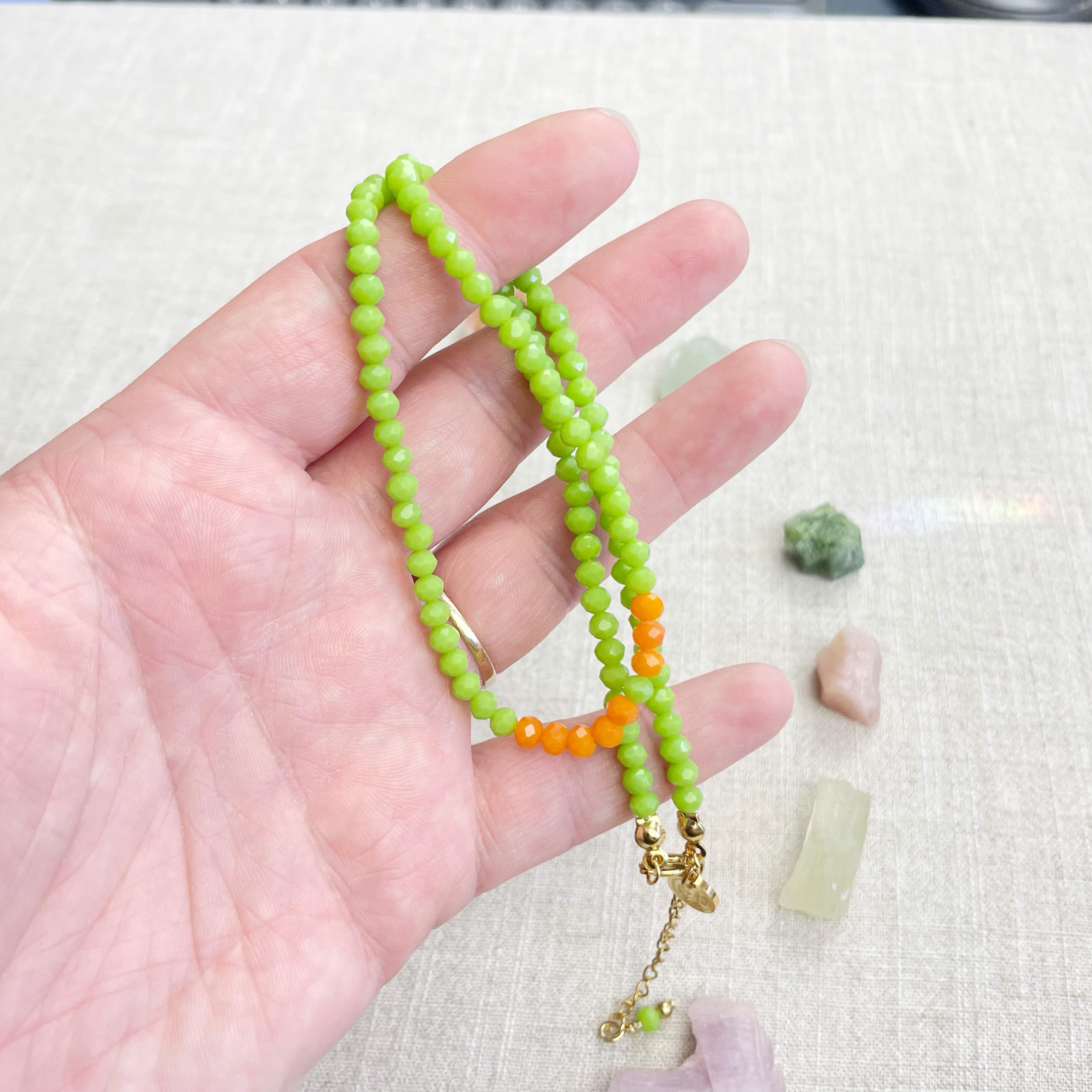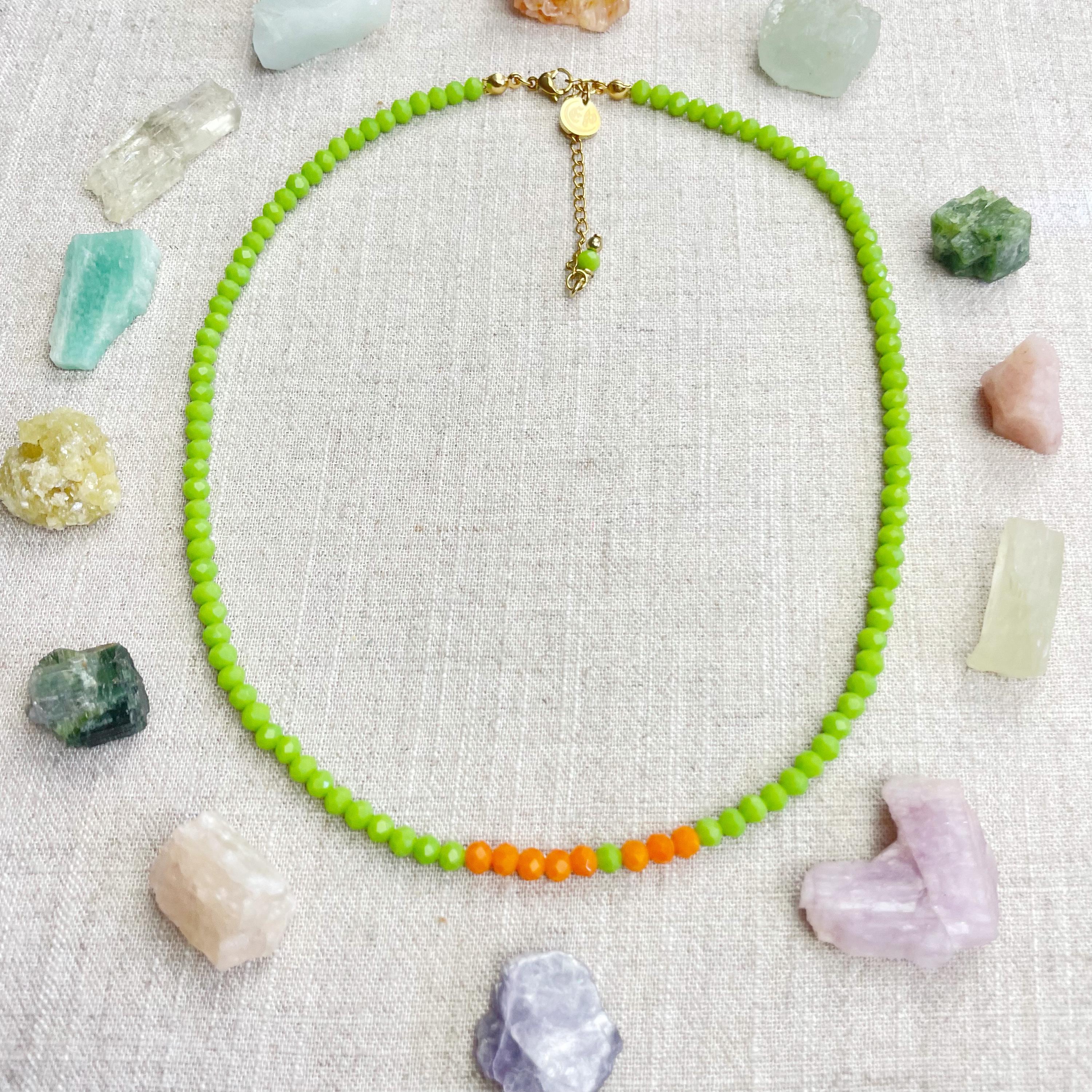 This necklace is made with glass crystal beads which are opaque. The necklace is made from two different colors which compliment each other. The beads are 4mm faceted rondelle beads. Each bead is strung on a 100% nylon cord. The necklace is finished off with a gold plated stainless steel chain, clasp and logo charm.