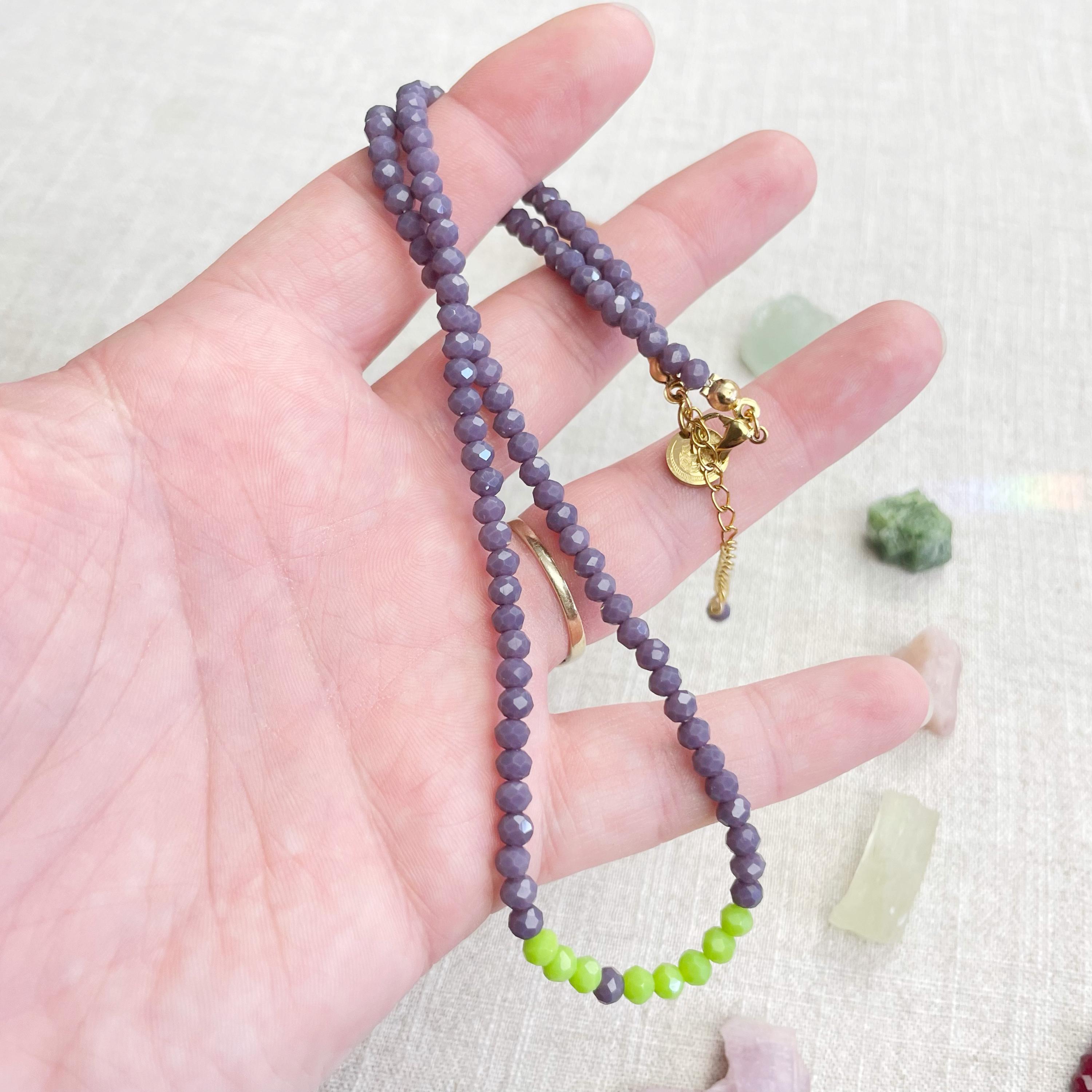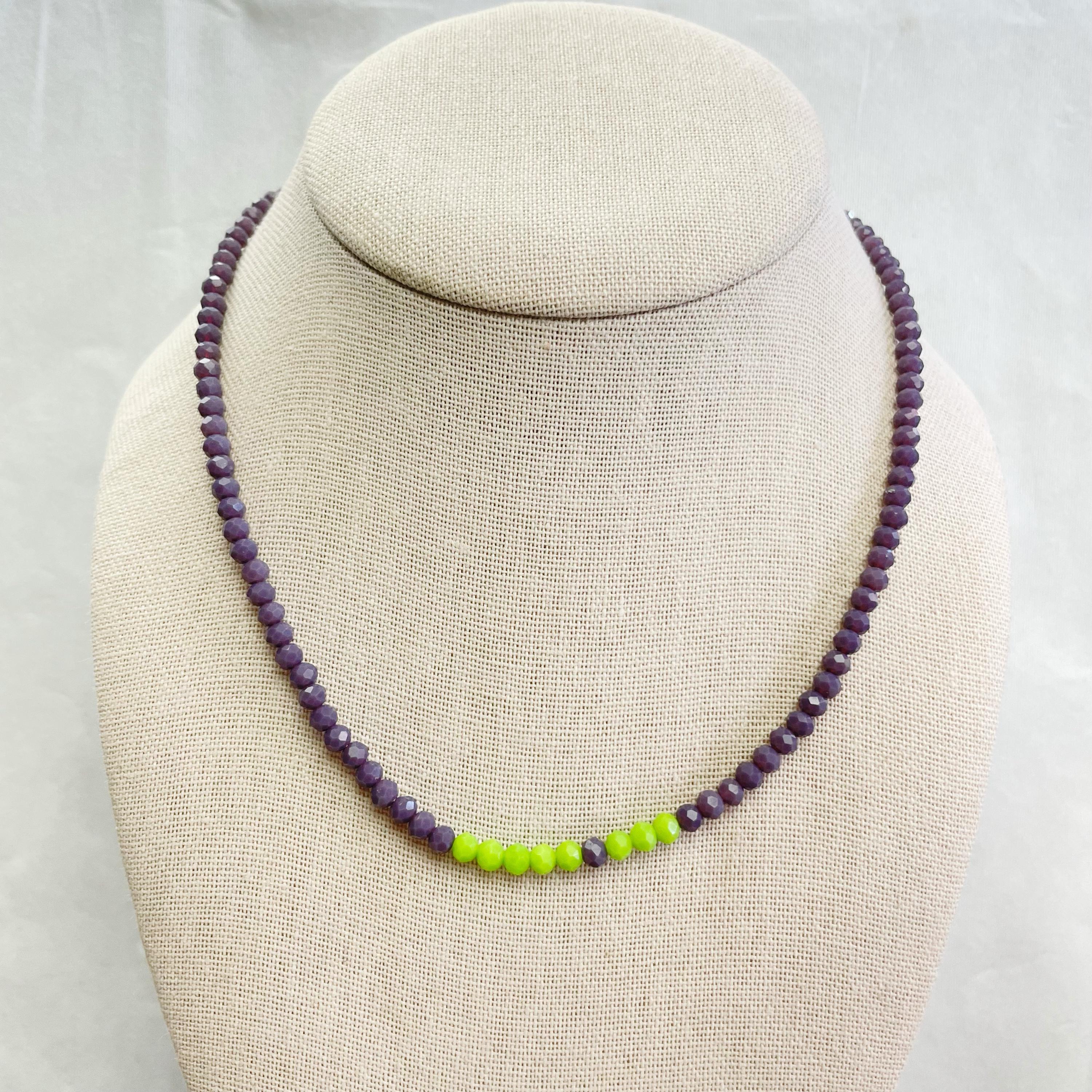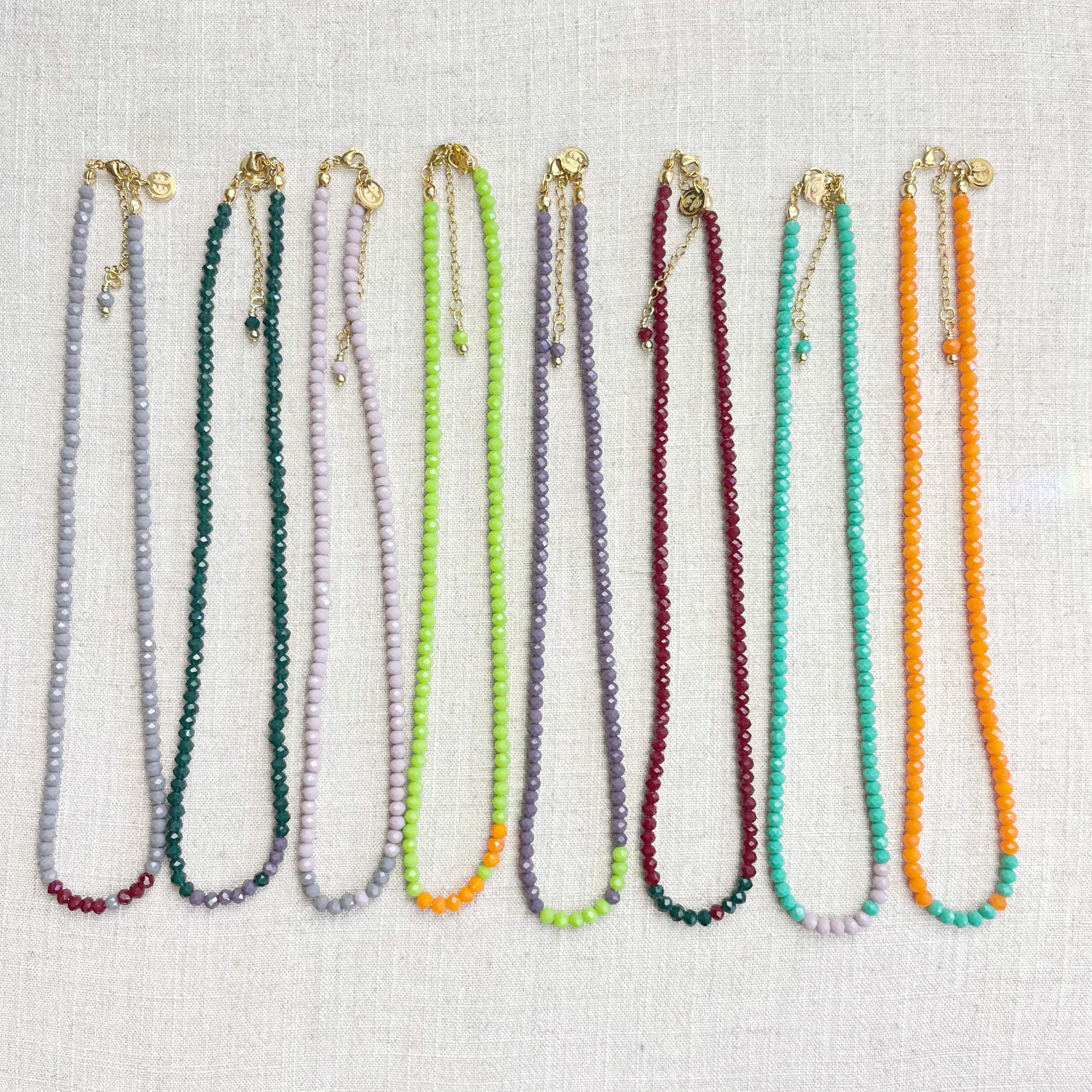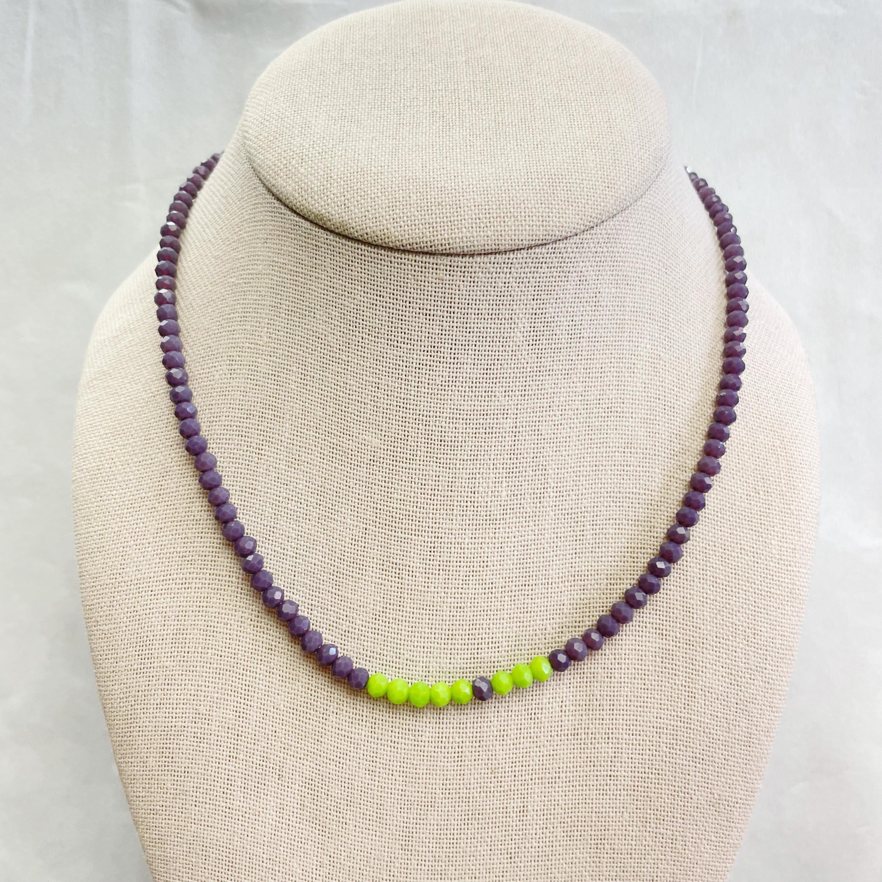 This necklace is made with glass crystal beads which are opaque. The necklace is made from two different colors which compliment each other. The beads are 4mm faceted rondelle beads. Each bead is strung on a 100% nylon cord. The necklace is finished off with a gold plated stainless steel chain, clasp and logo charm.
