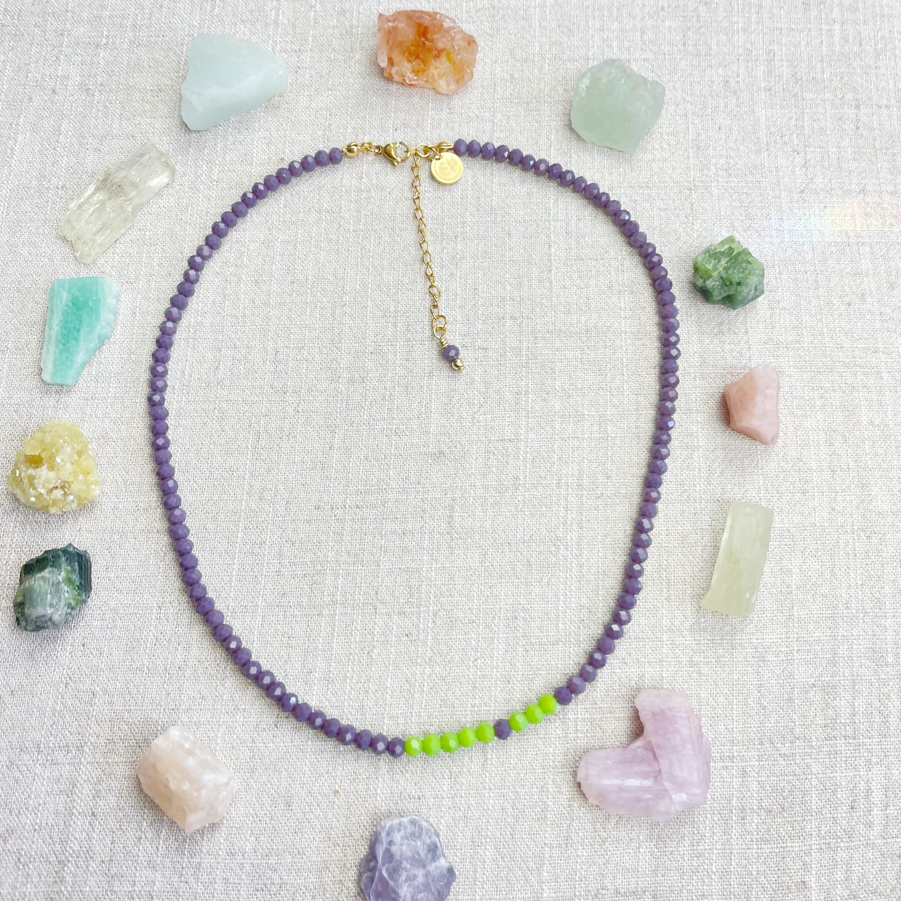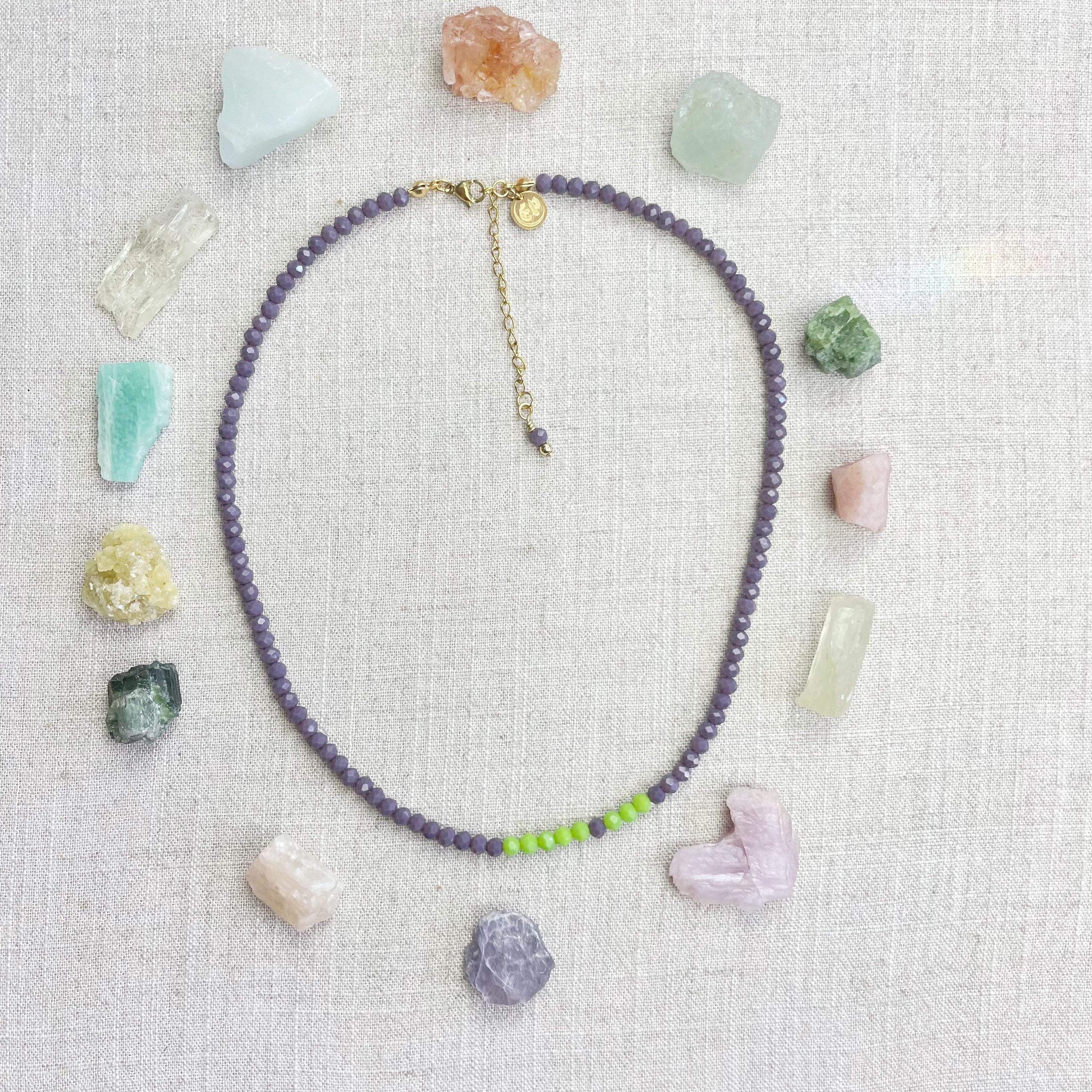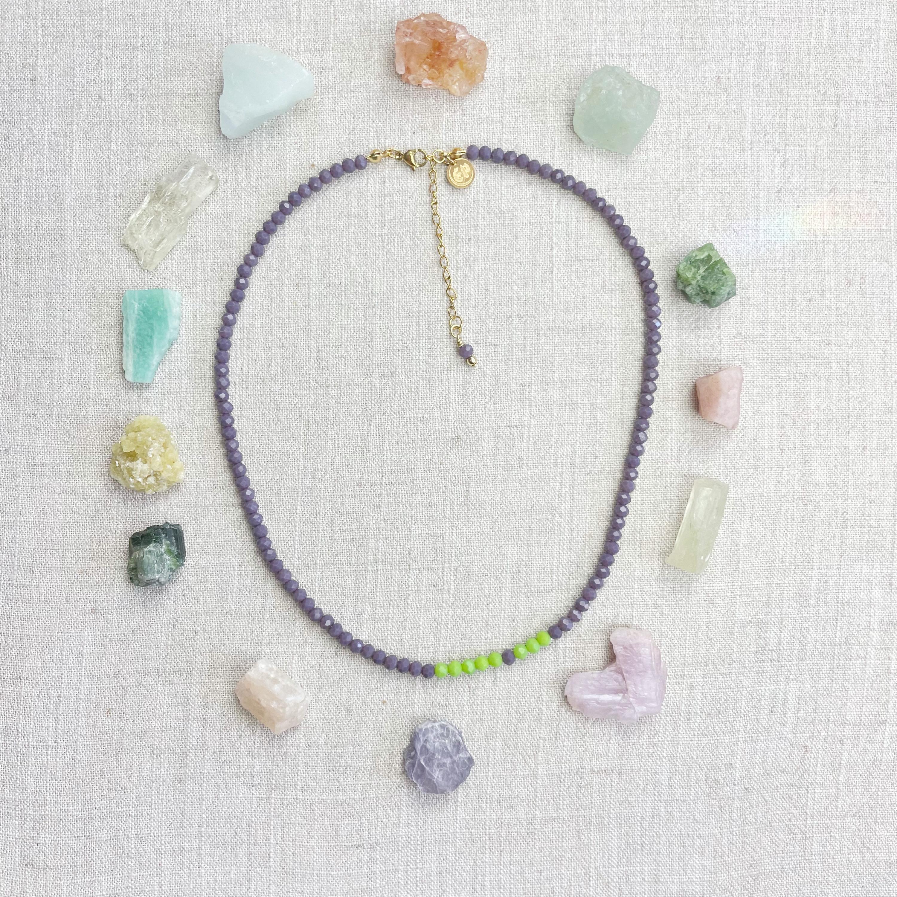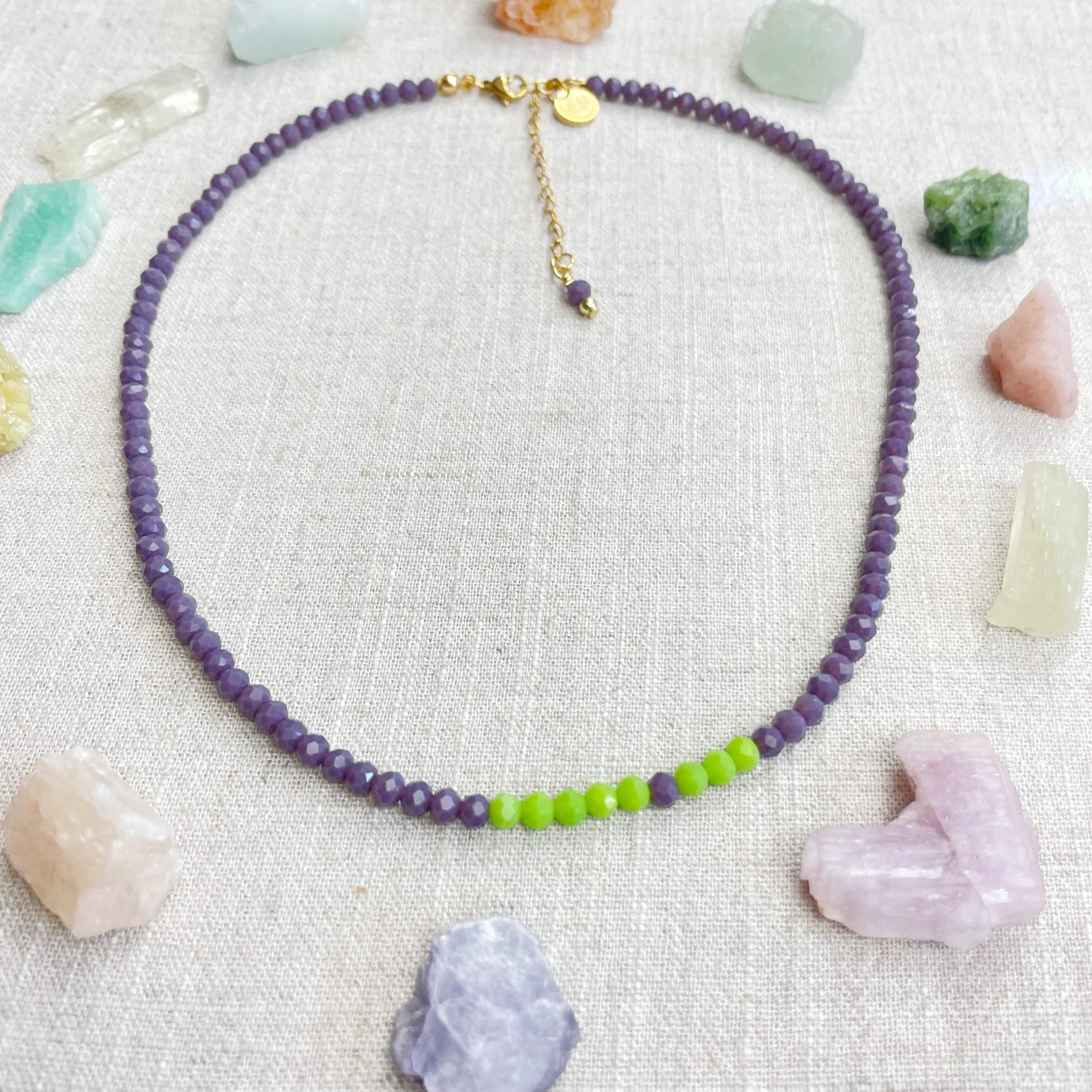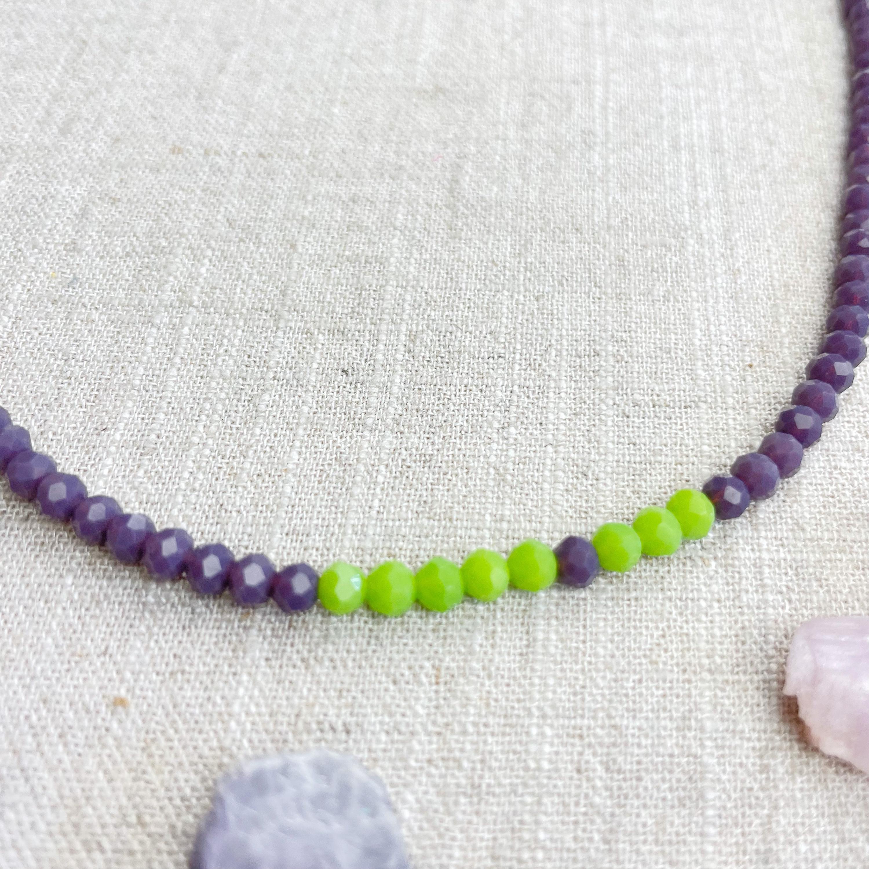 This necklace is made with glass crystal beads which are opaque. The necklace is made from two different colors which compliment each other. The beads are 4mm faceted rondelle beads. Each bead is strung on a 100% nylon cord. The necklace is finished off with a gold plated stainless steel chain, clasp and logo charm.