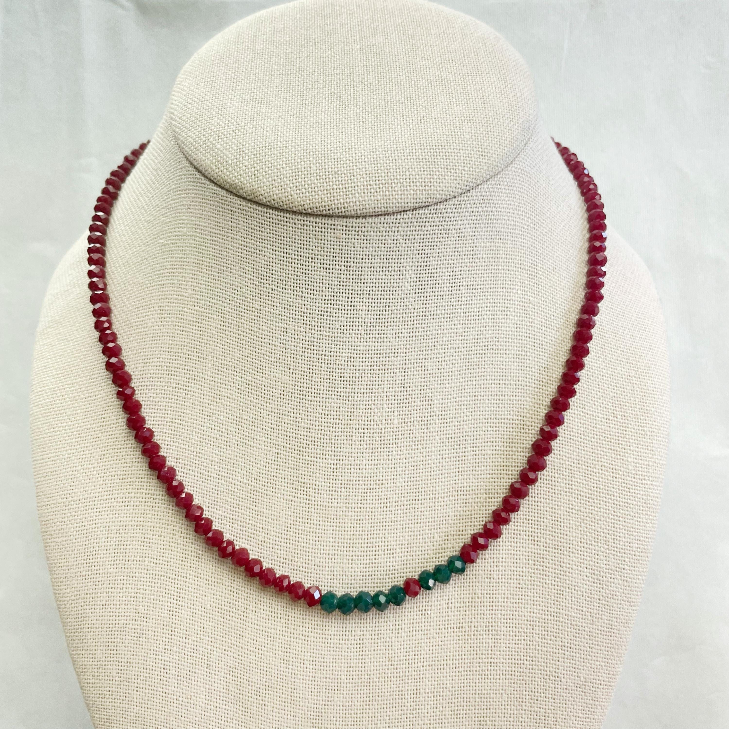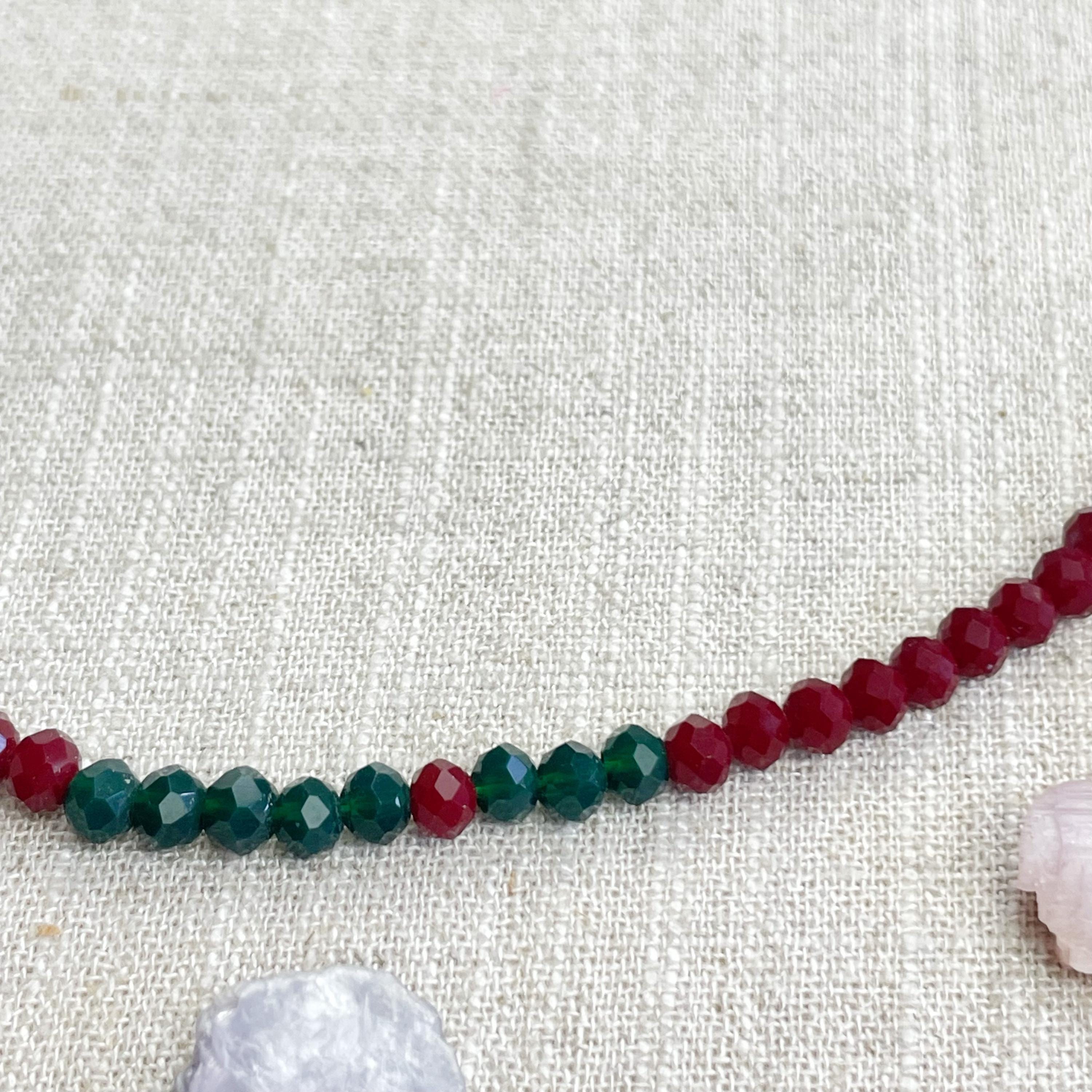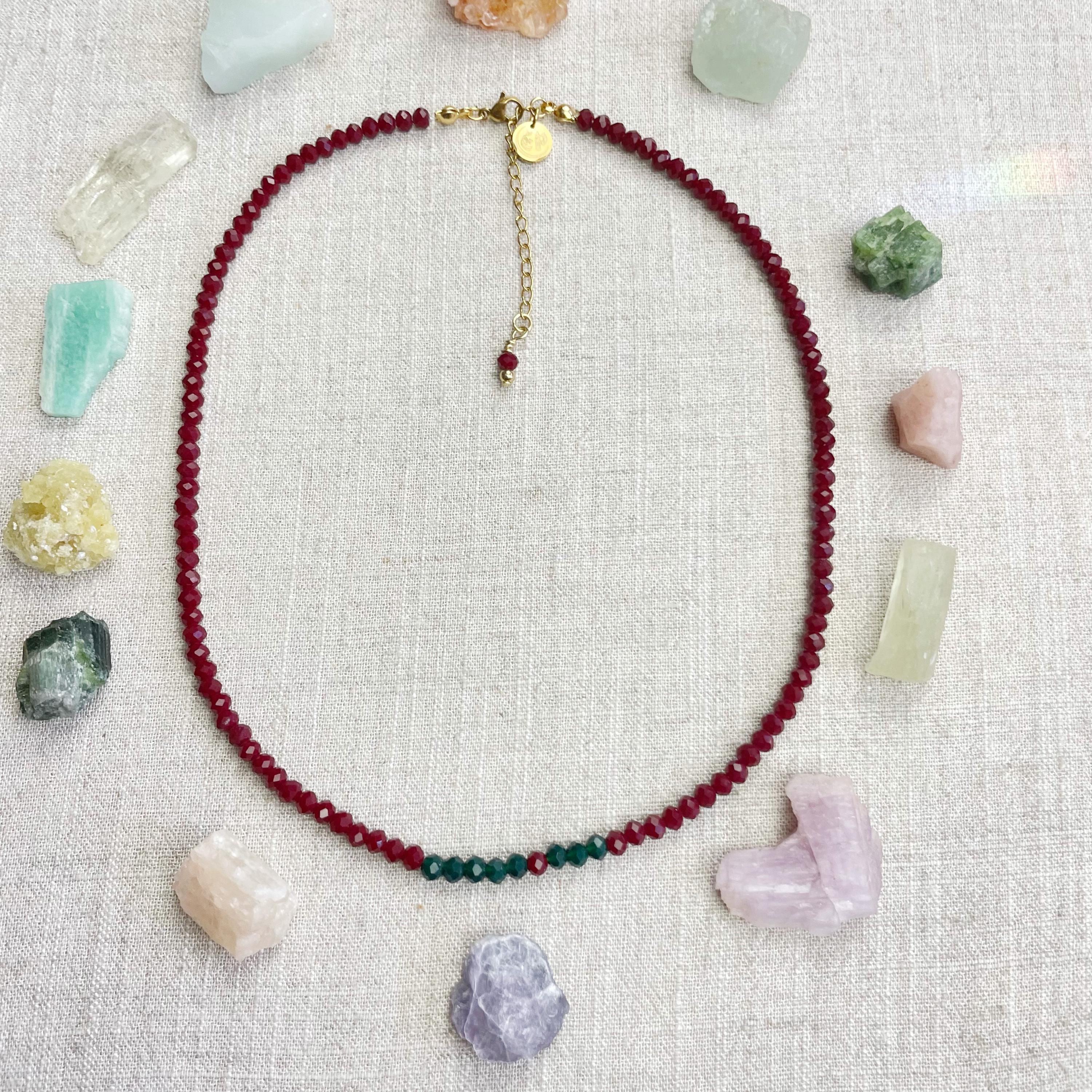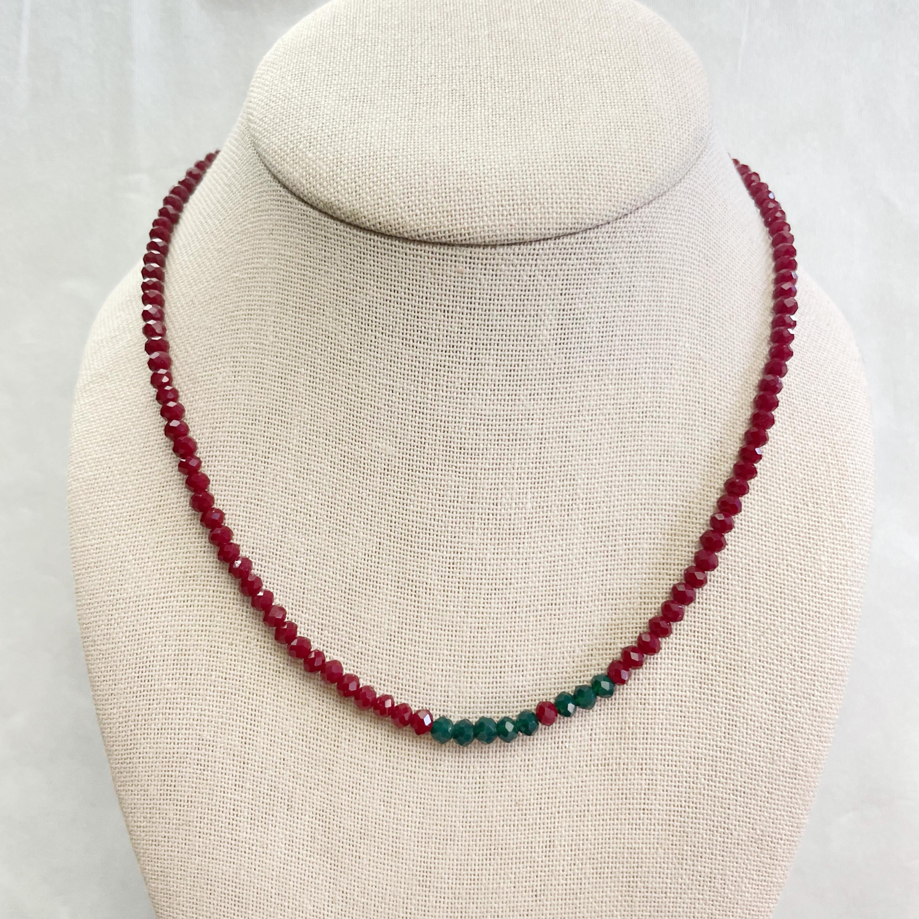 This necklace is made with glass crystal beads which are opaque. The necklace is made from two different colors which compliment each other. The beads are 4mm faceted rondelle beads. Each bead is strung on a 100% nylon cord. The necklace is finished off with a gold plated stainless steel chain, clasp and logo charm.