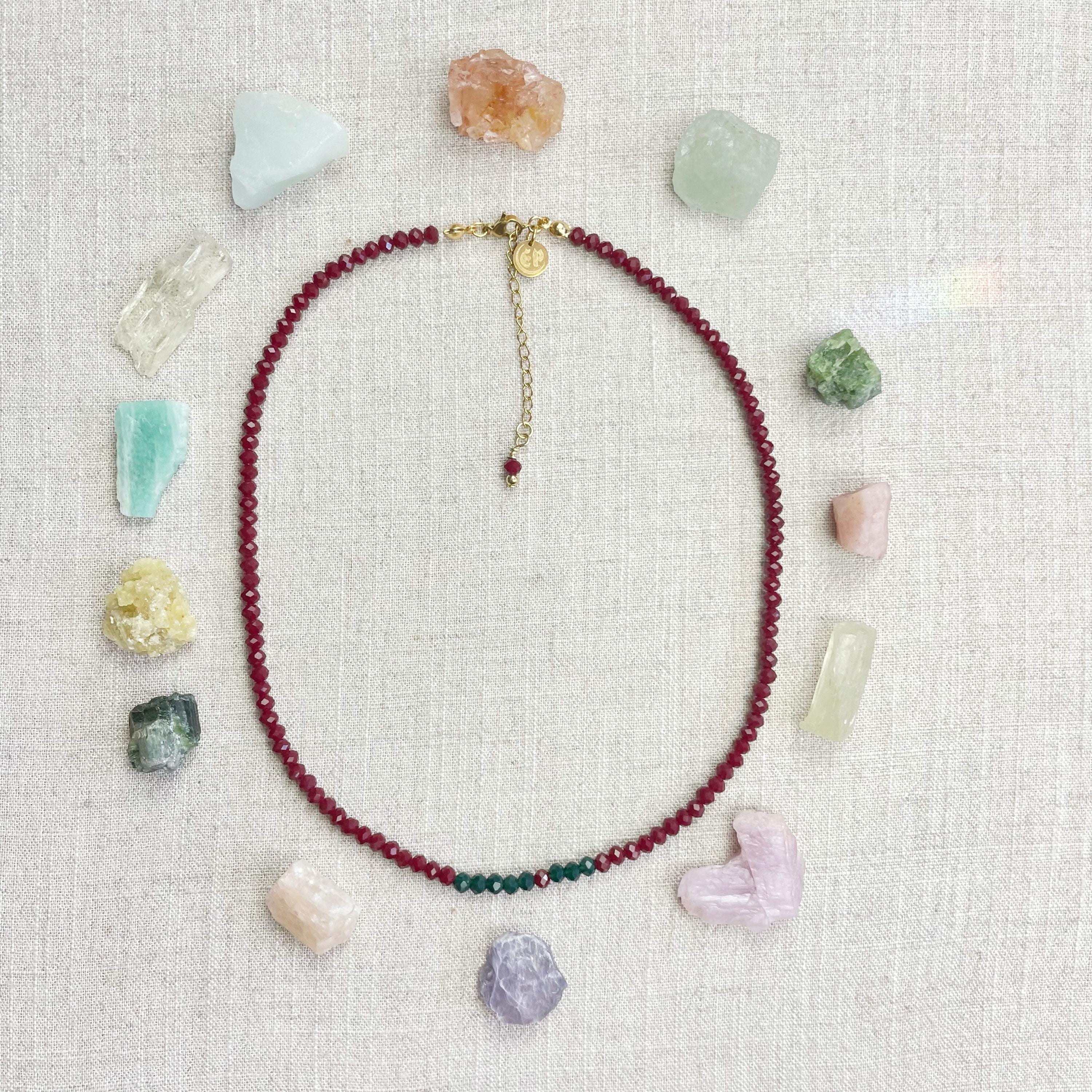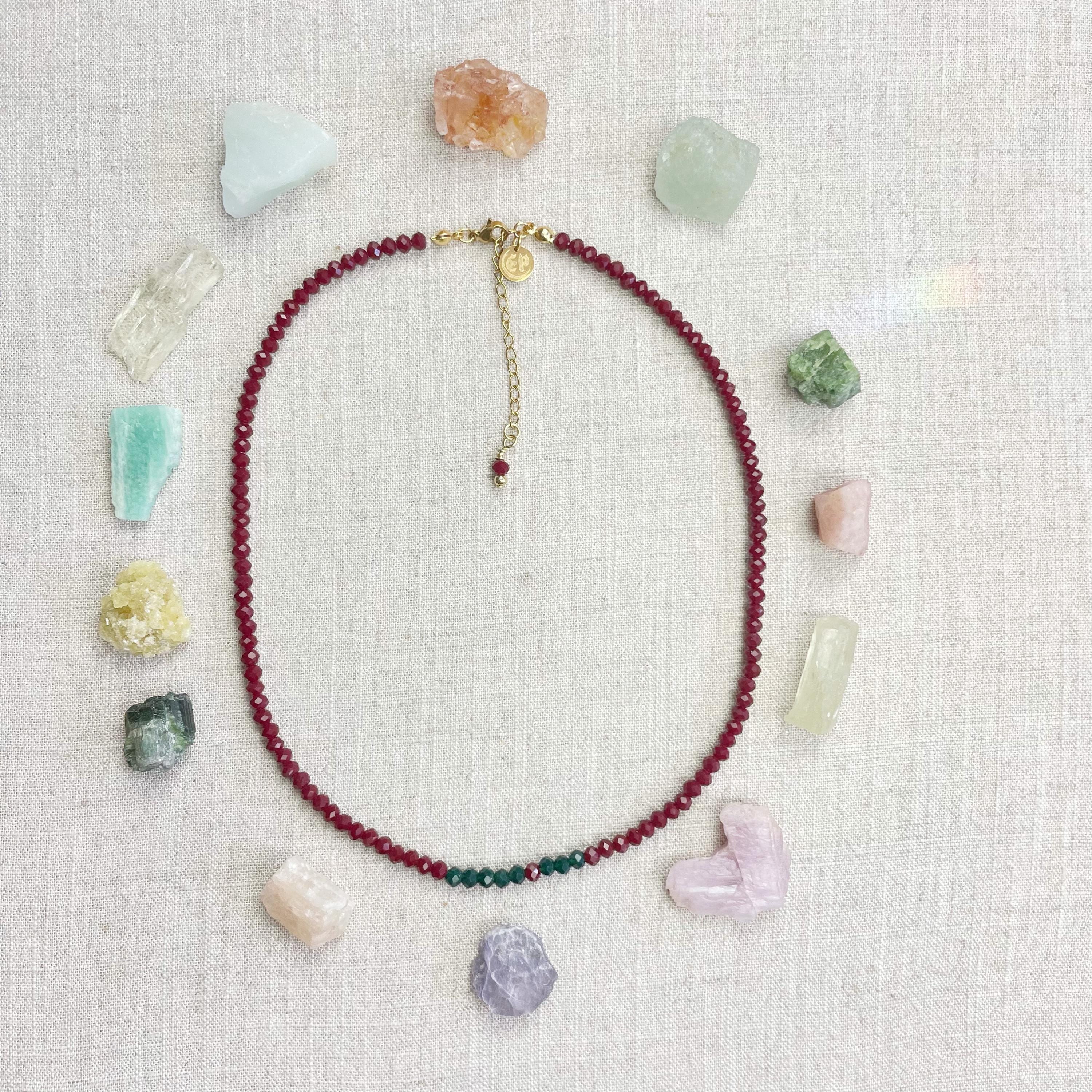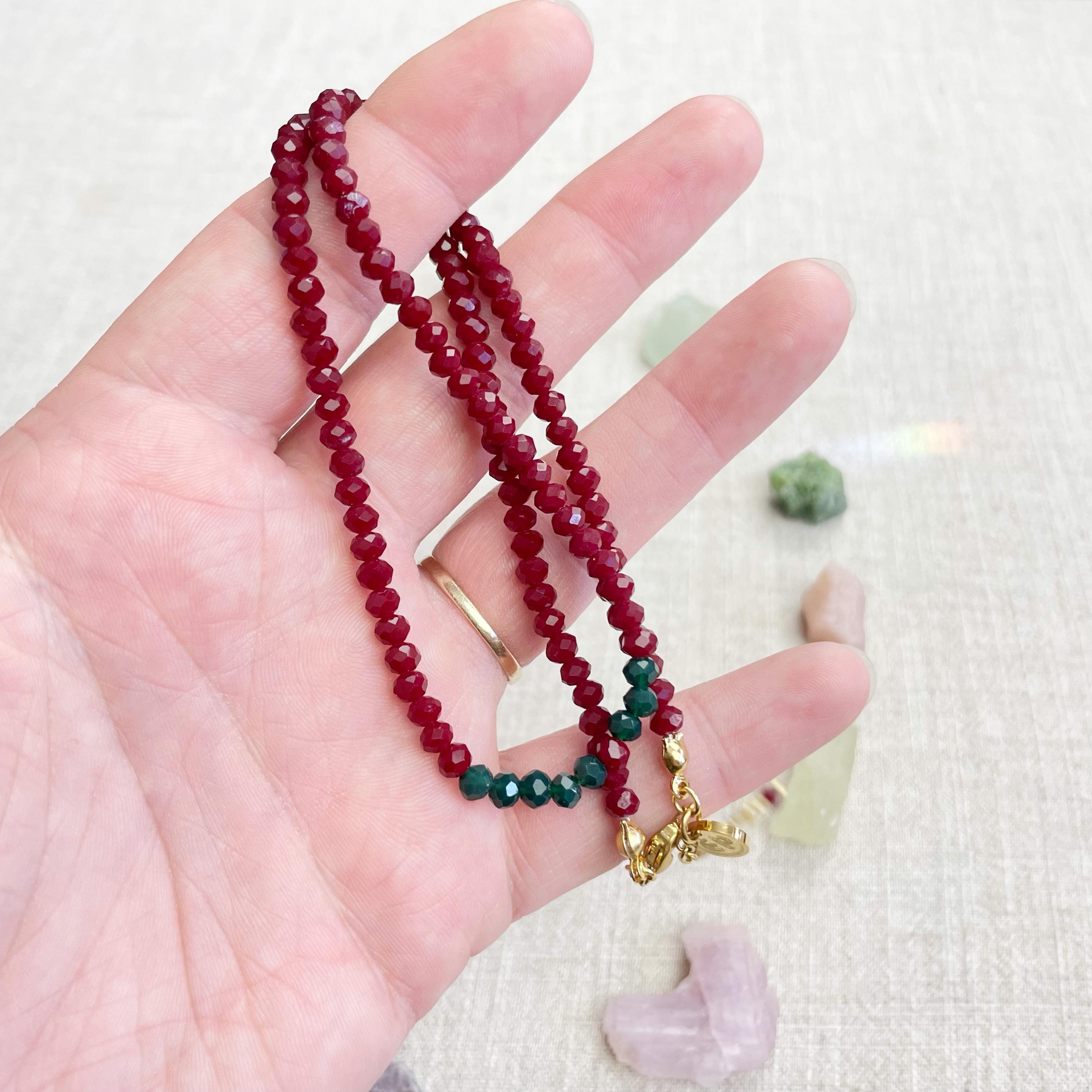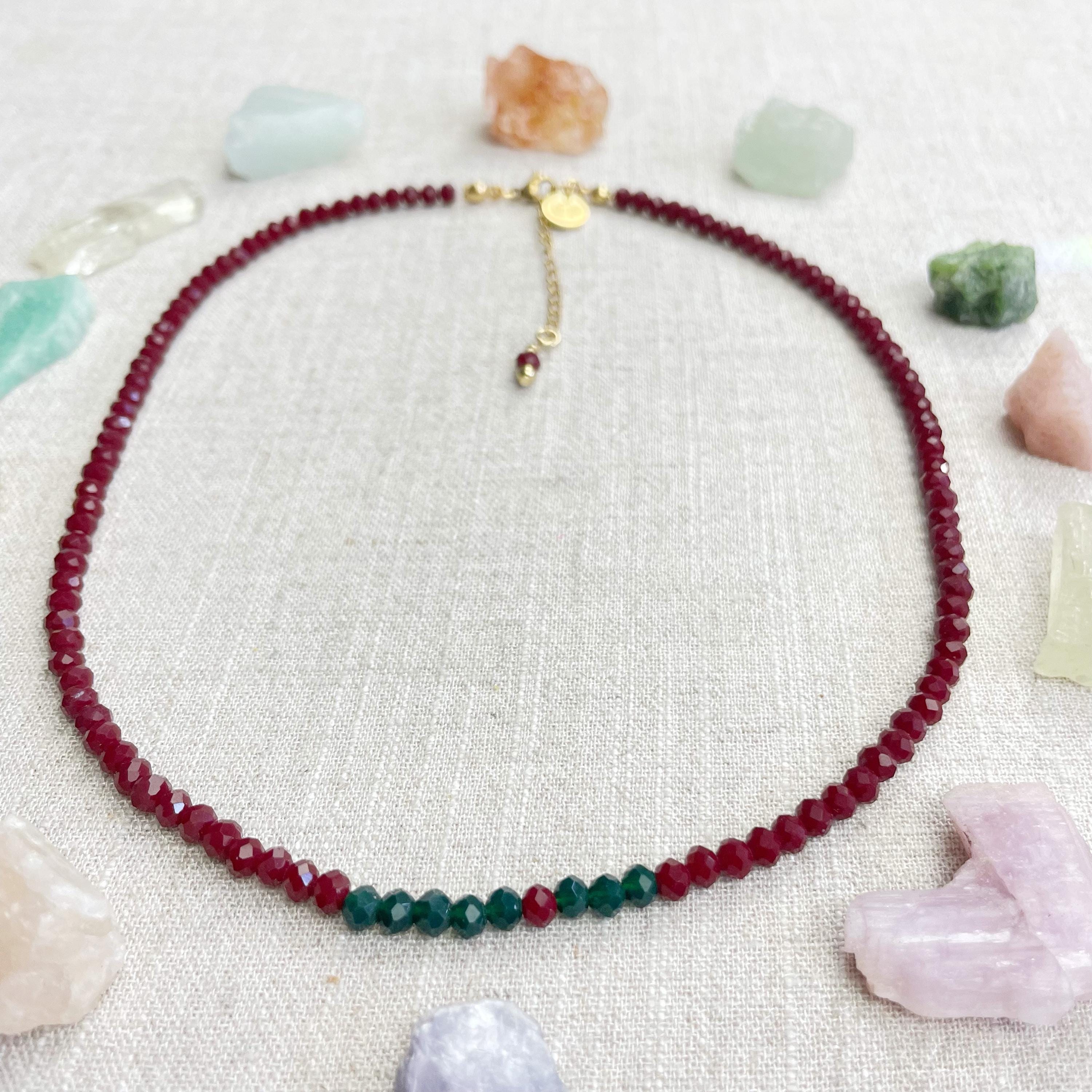 This necklace is made with glass crystal beads which are opaque. The necklace is made from two different colors which compliment each other. The beads are 4mm faceted rondelle beads. Each bead is strung on a 100% nylon cord. The necklace is finished off with a gold plated stainless steel chain, clasp and logo charm.