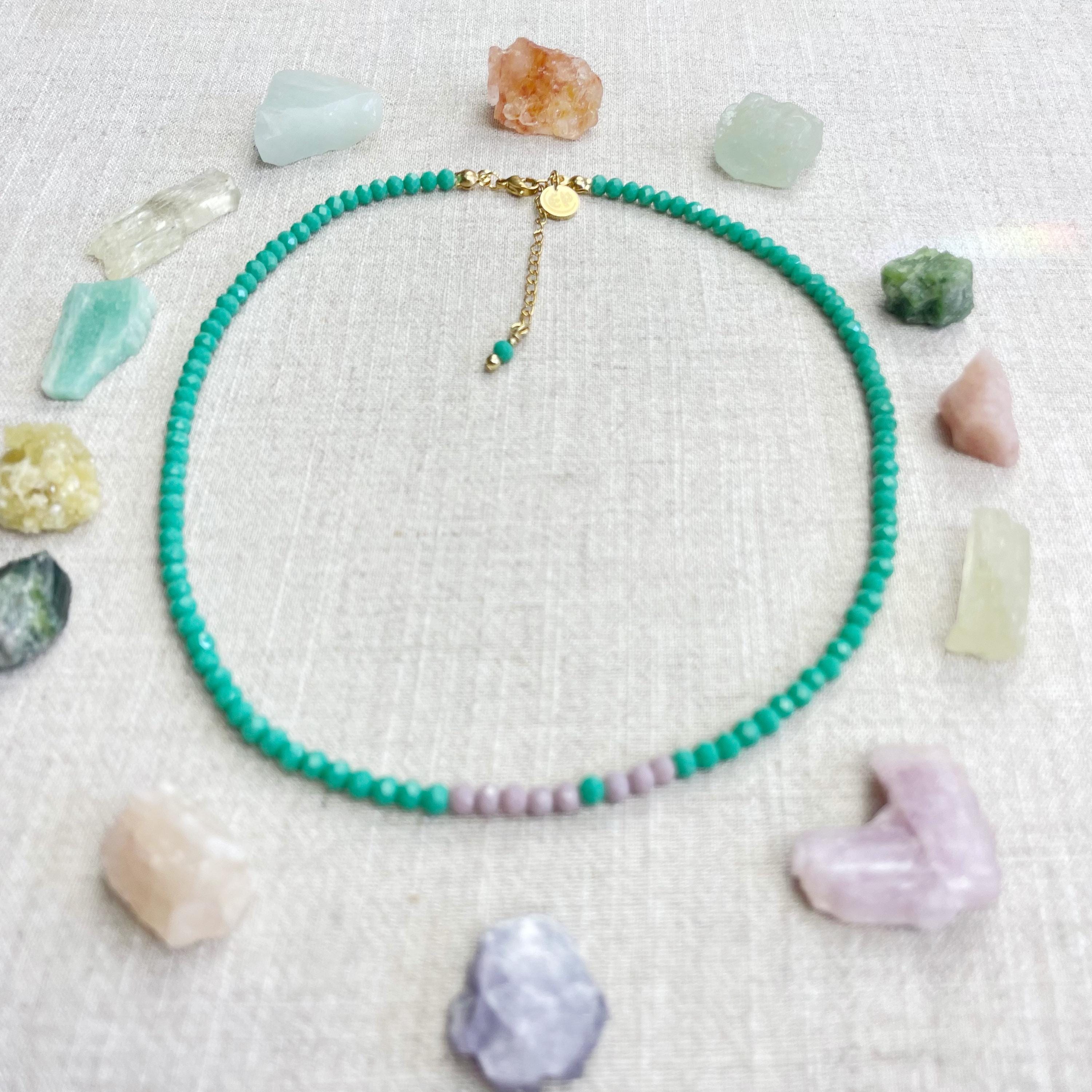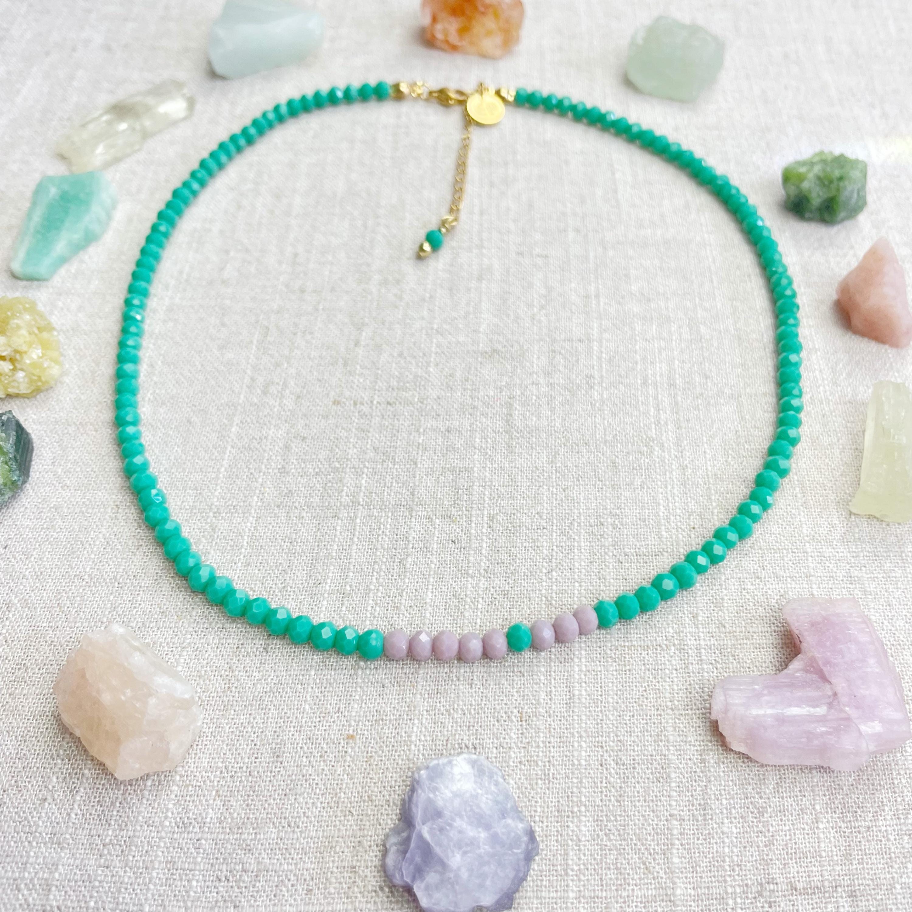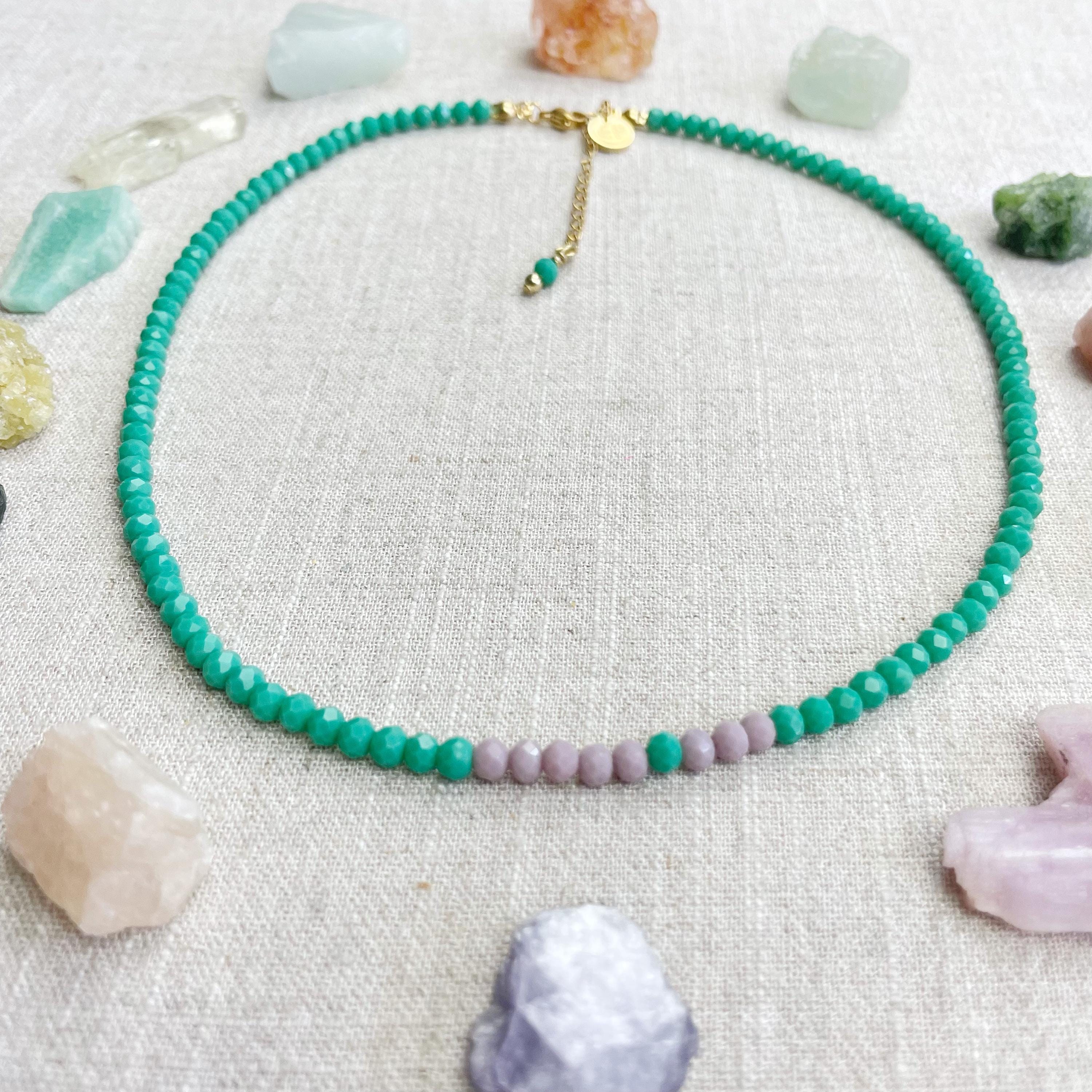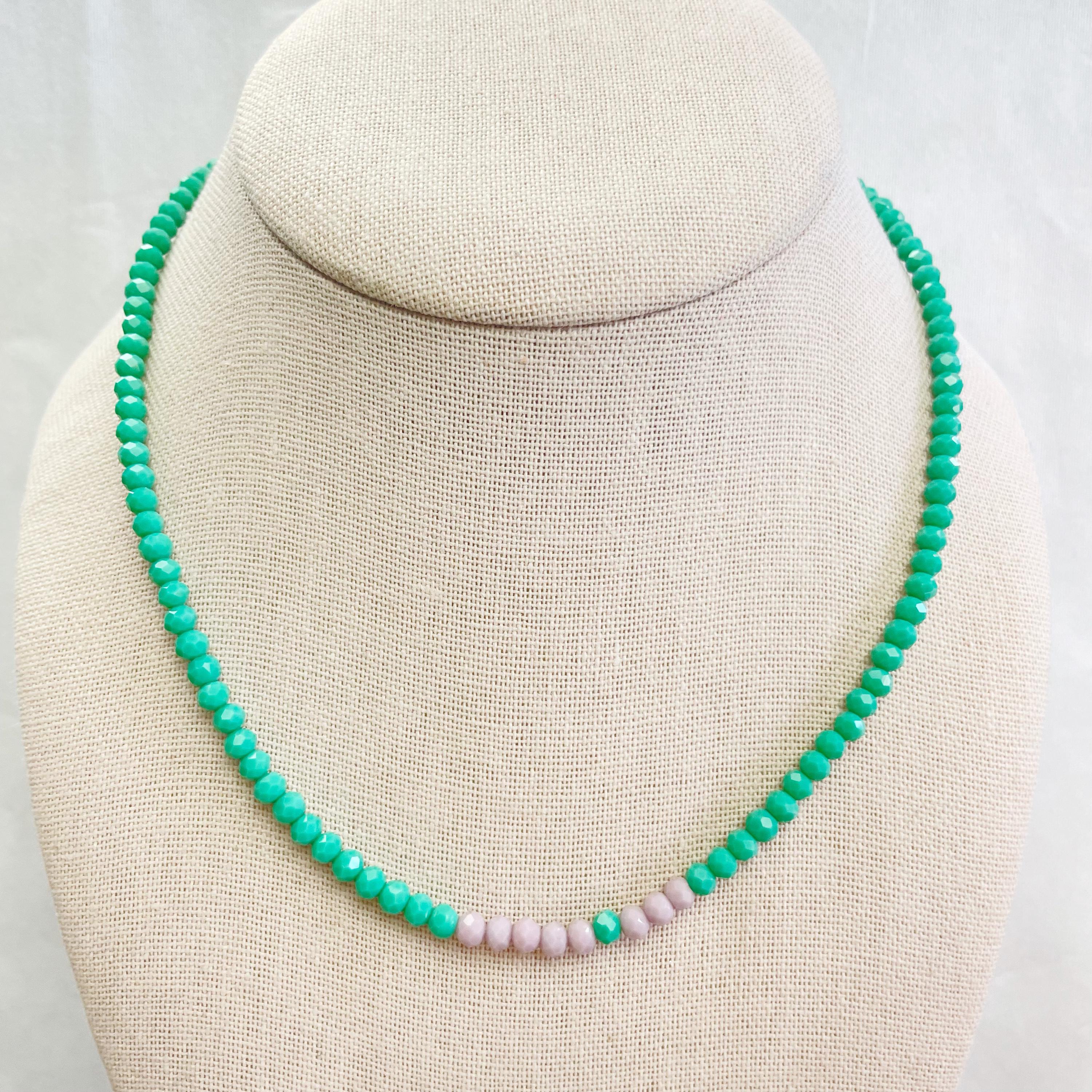 This necklace is made with glass crystal beads which are opaque. The necklace is made from two different colors which compliment each other. The beads are 4mm faceted rondelle beads. Each bead is strung on a 100% nylon cord. The necklace is finished off with a gold plated stainless steel chain, clasp and logo charm.