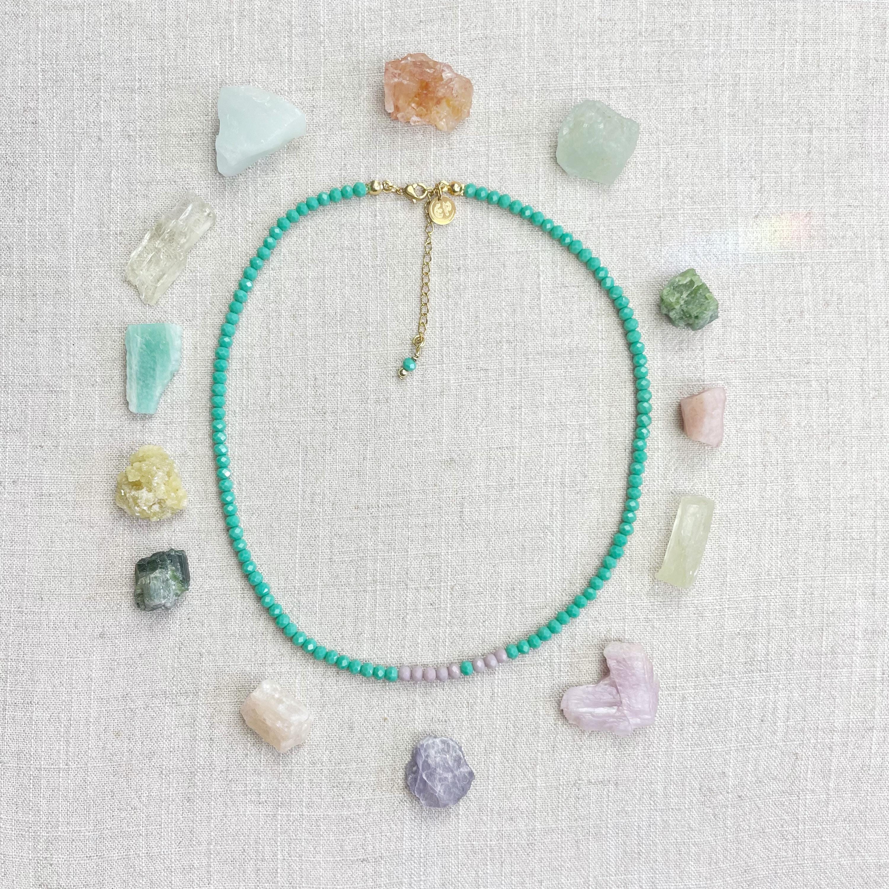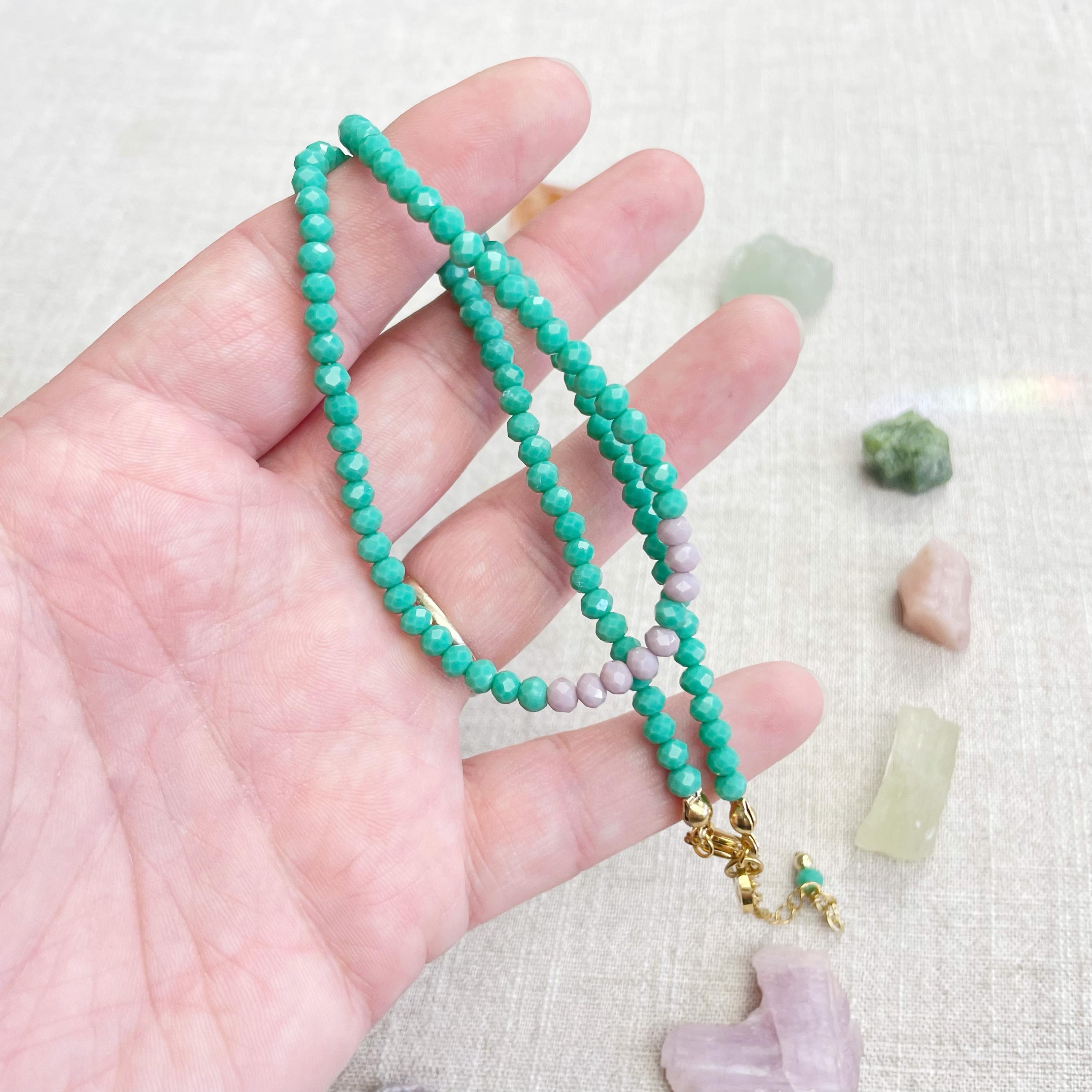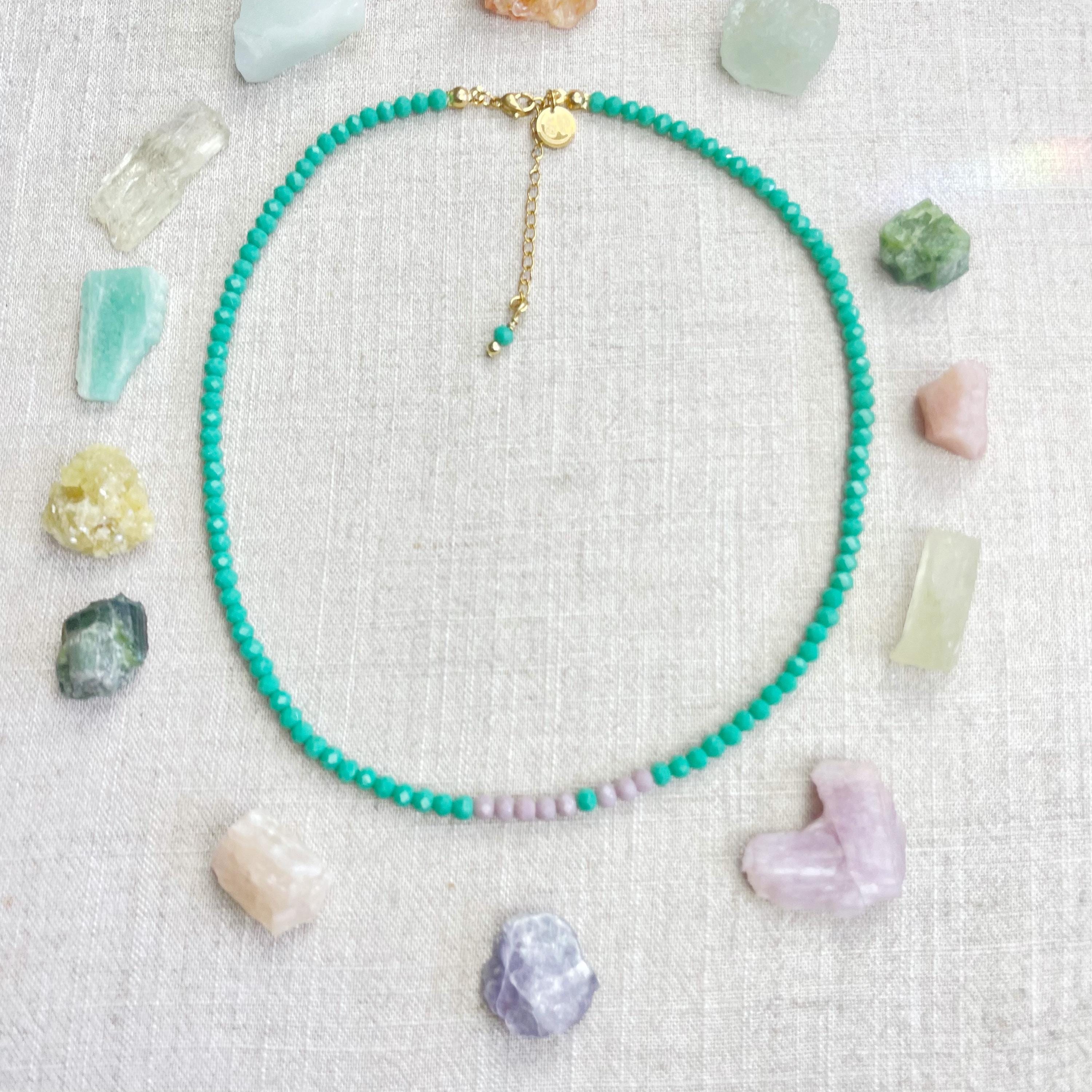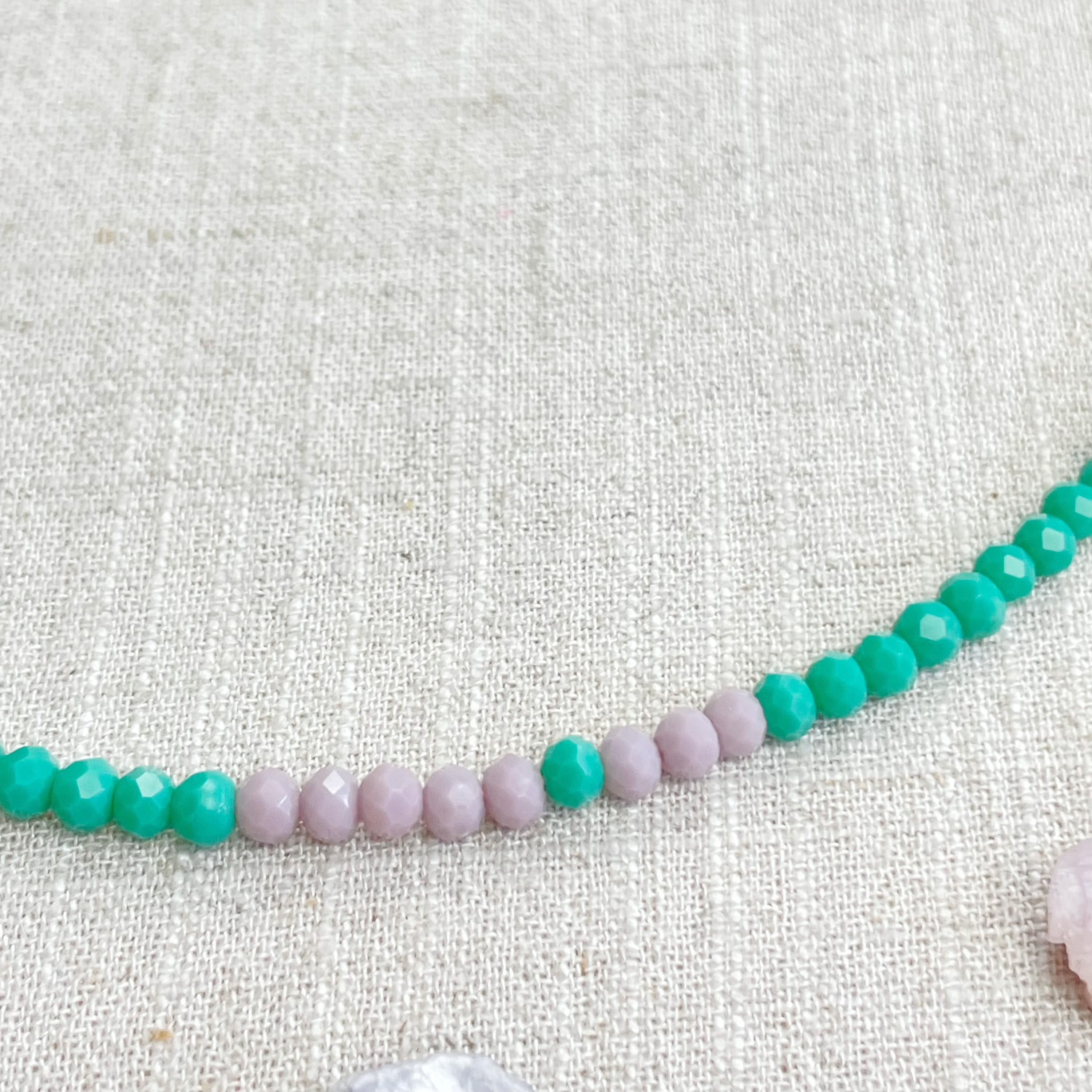 This necklace is made with glass crystal beads which are opaque. The necklace is made from two different colors which compliment each other. The beads are 4mm faceted rondelle beads. Each bead is strung on a 100% nylon cord. The necklace is finished off with a gold plated stainless steel chain, clasp and logo charm.