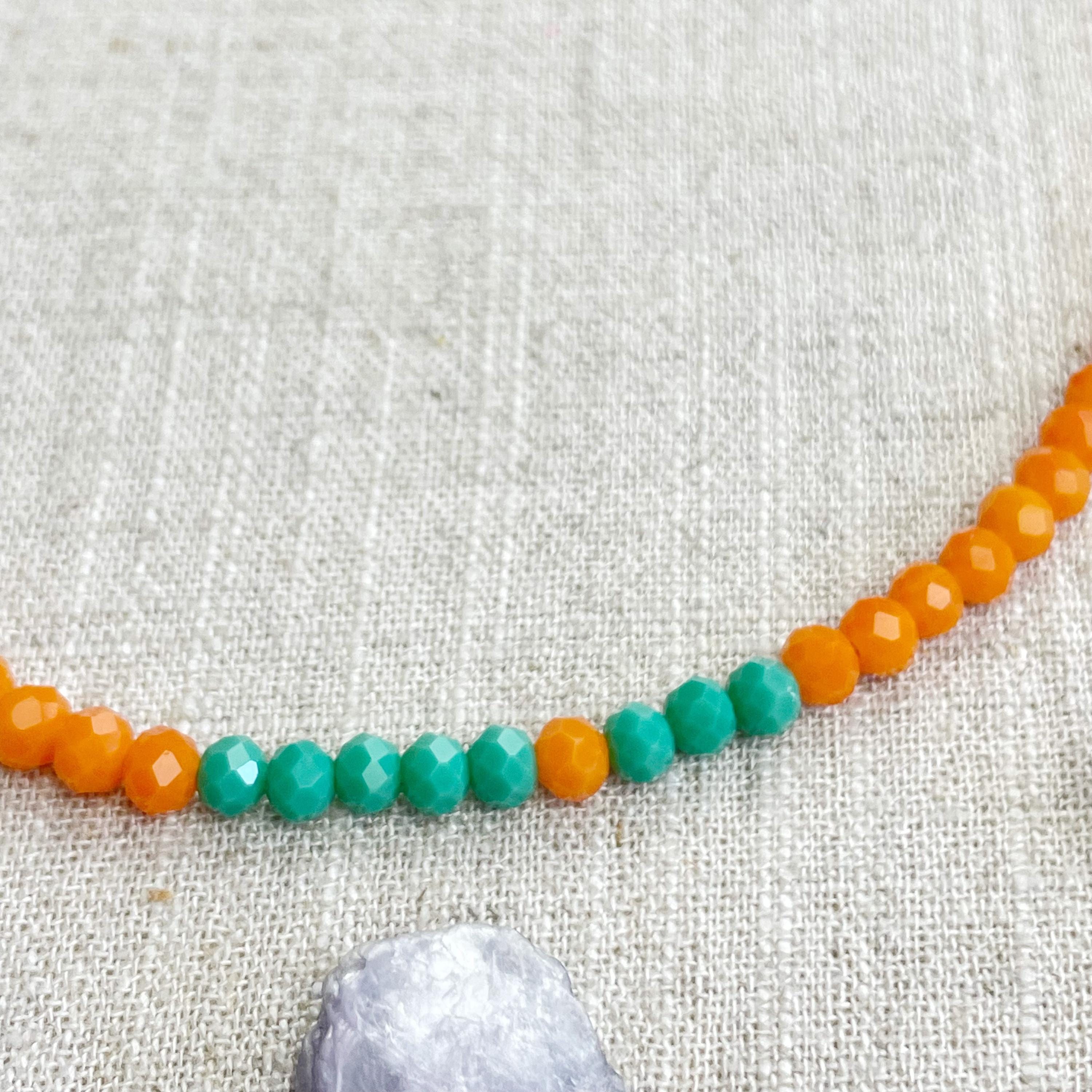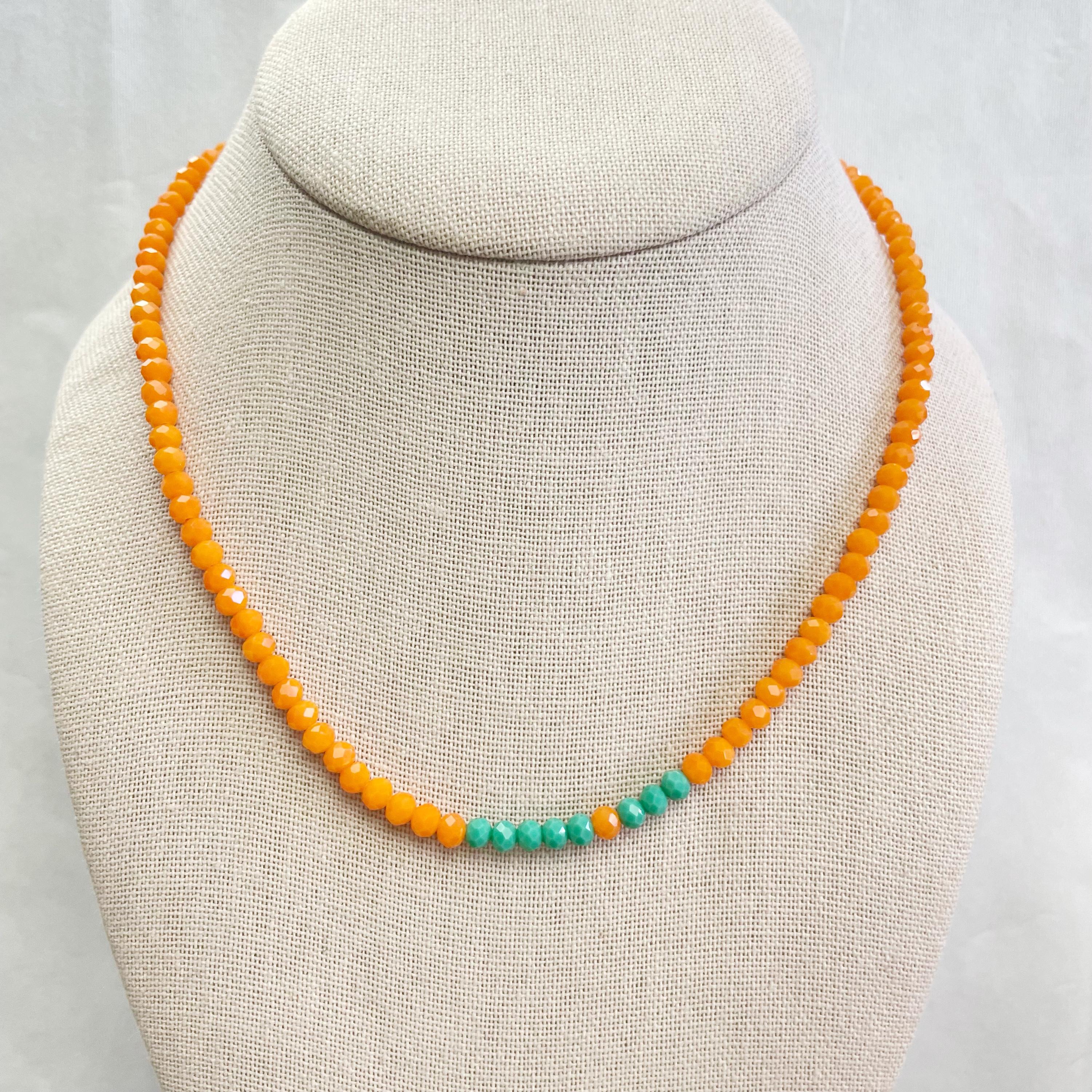 This necklace is made with glass crystal beads which are opaque. The necklace is made from two different colors which compliment each other. The beads are 4mm faceted rondelle beads. Each bead is strung on a 100% nylon cord. The necklace is finished off with a gold plated stainless steel chain, clasp and logo charm.
