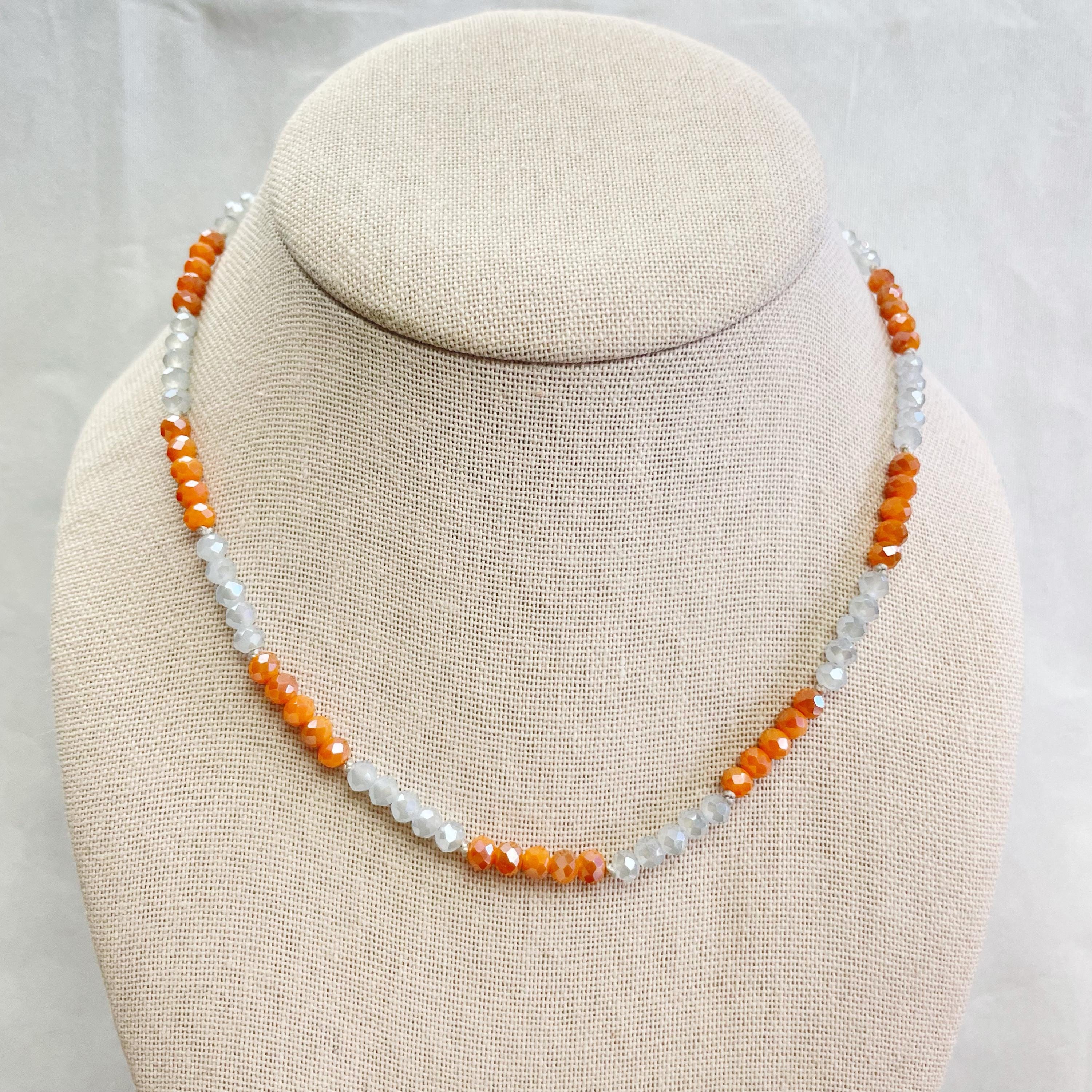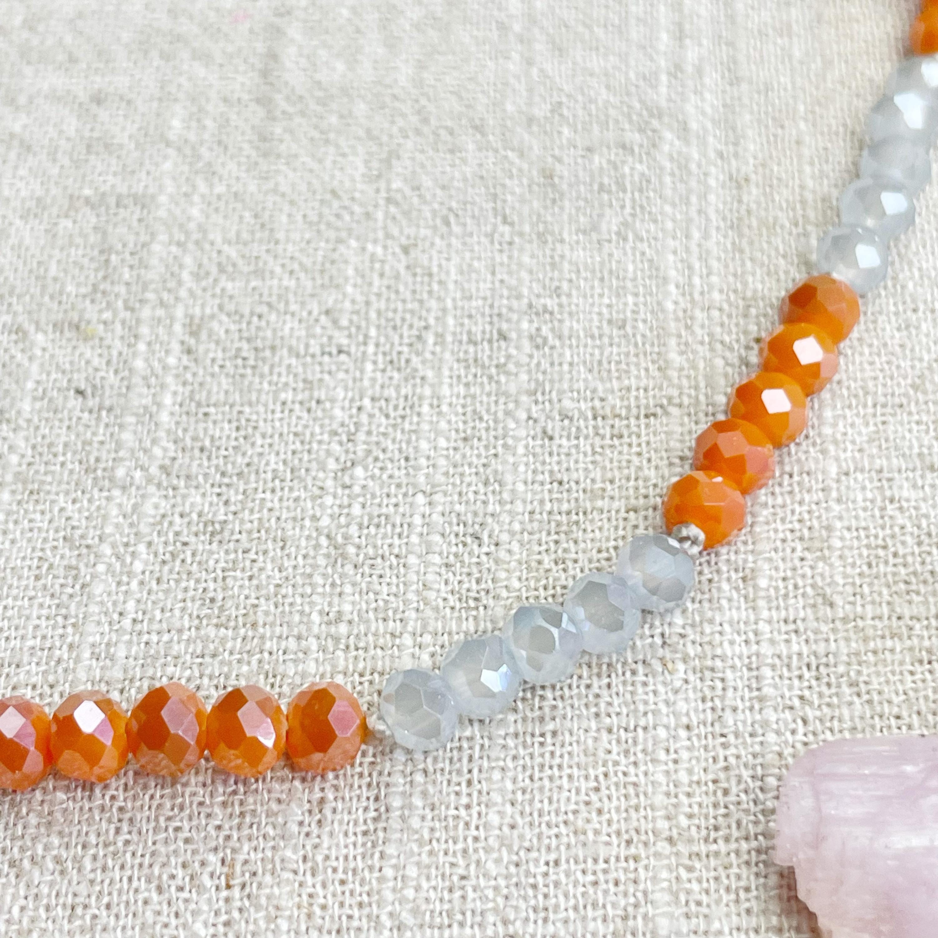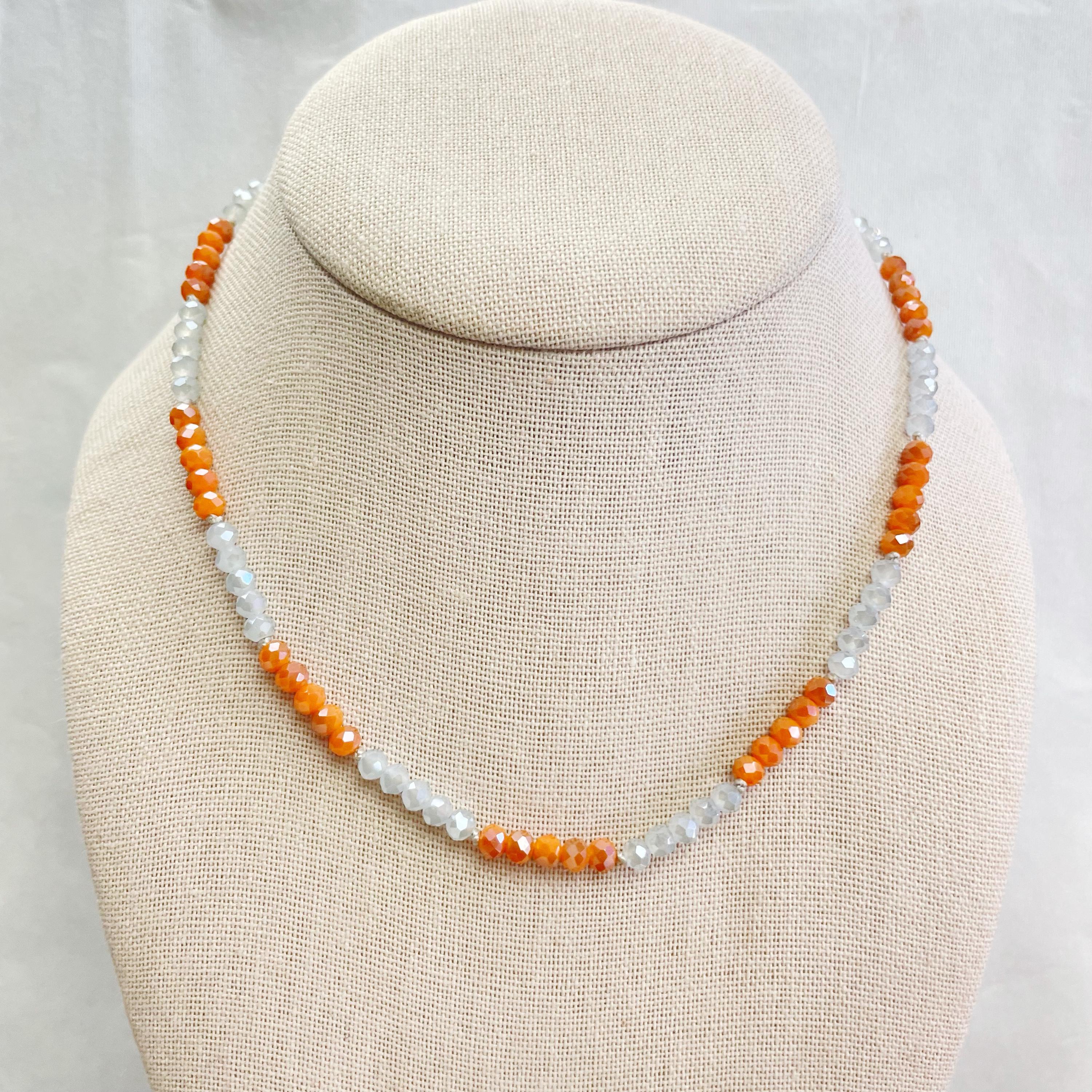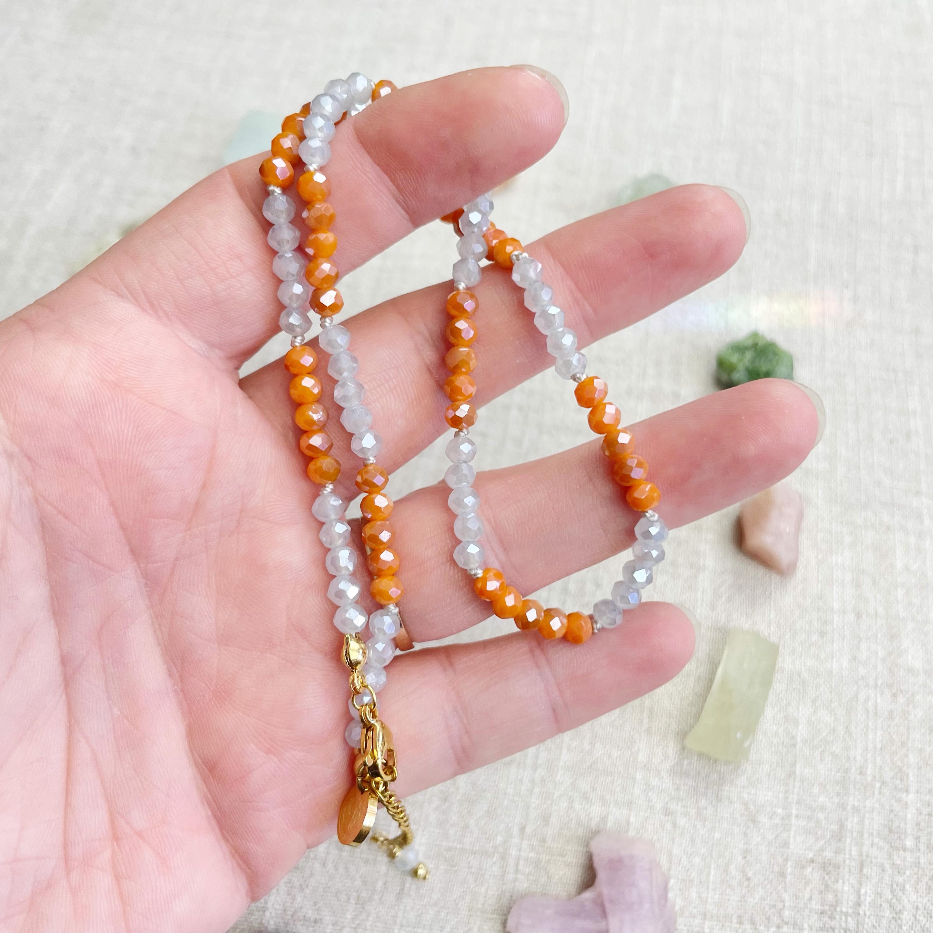 This necklace is made with glass crystal beads which have a iridescent coating. The necklace is made from two different colors which compliment each other. The beads are hand-knotted between the colors creating a color block effect. The beads are 4mm faceted rondelle beads. Each bead is strung on a 100% nylon cord. The necklace is finished off with a gold plated stainless steel chain, clasp and logo charm.