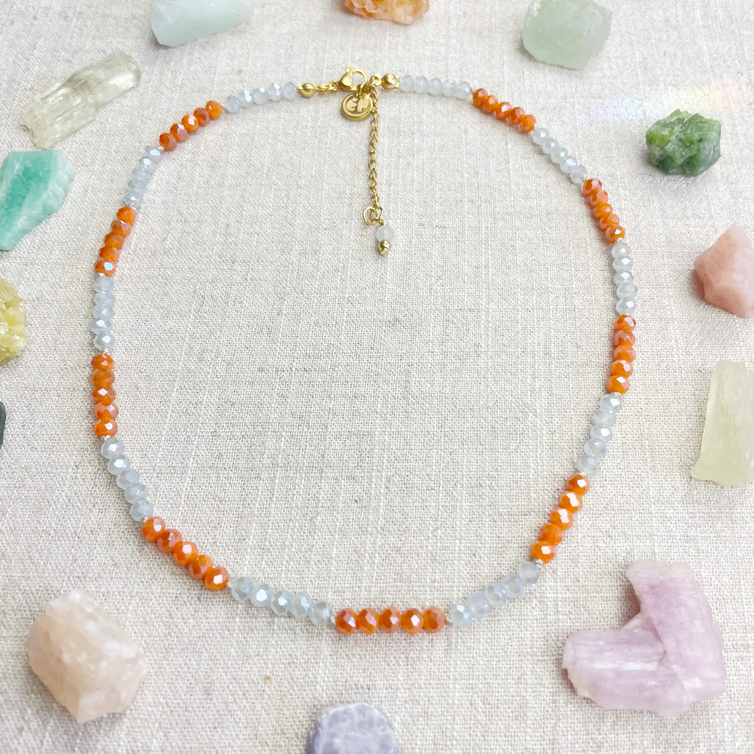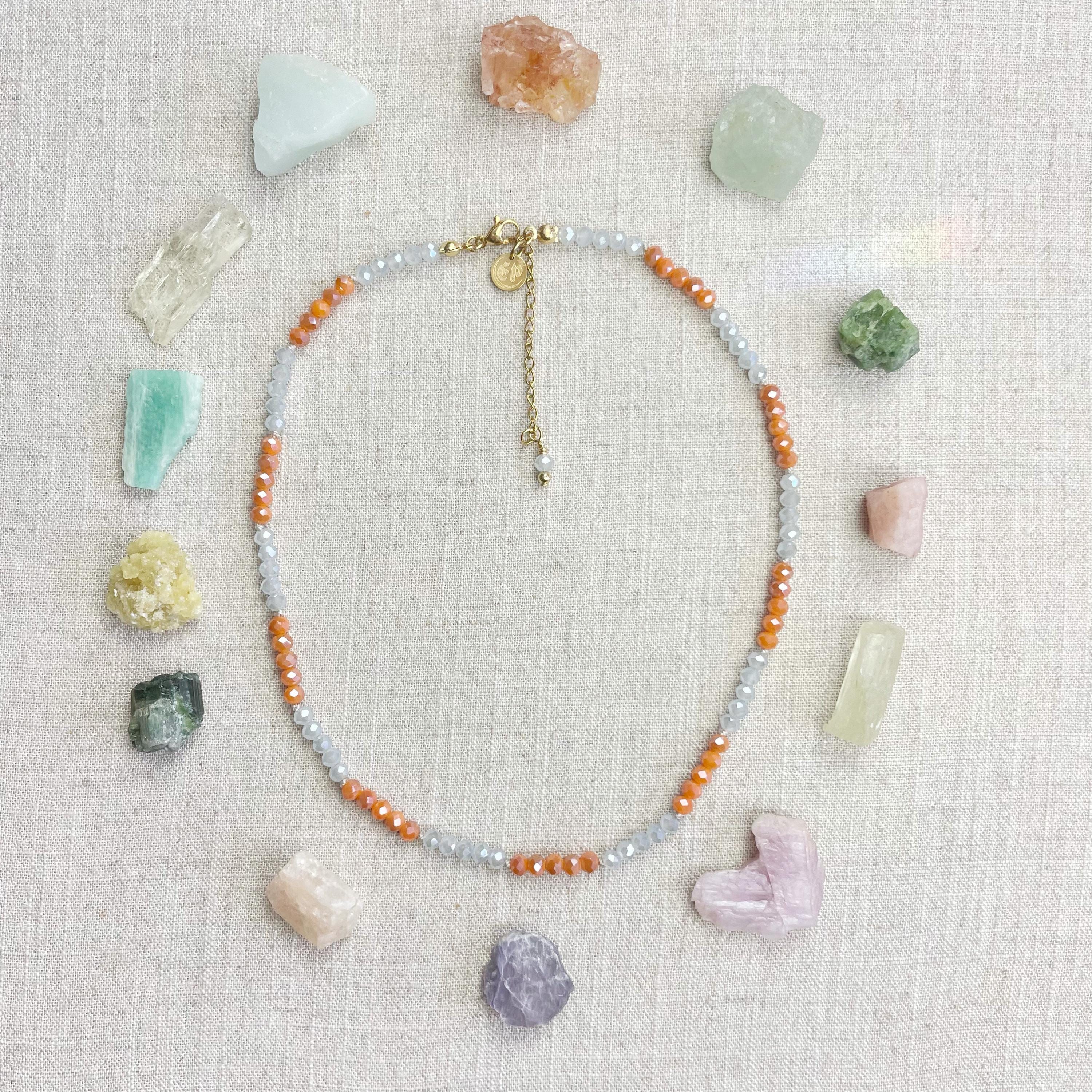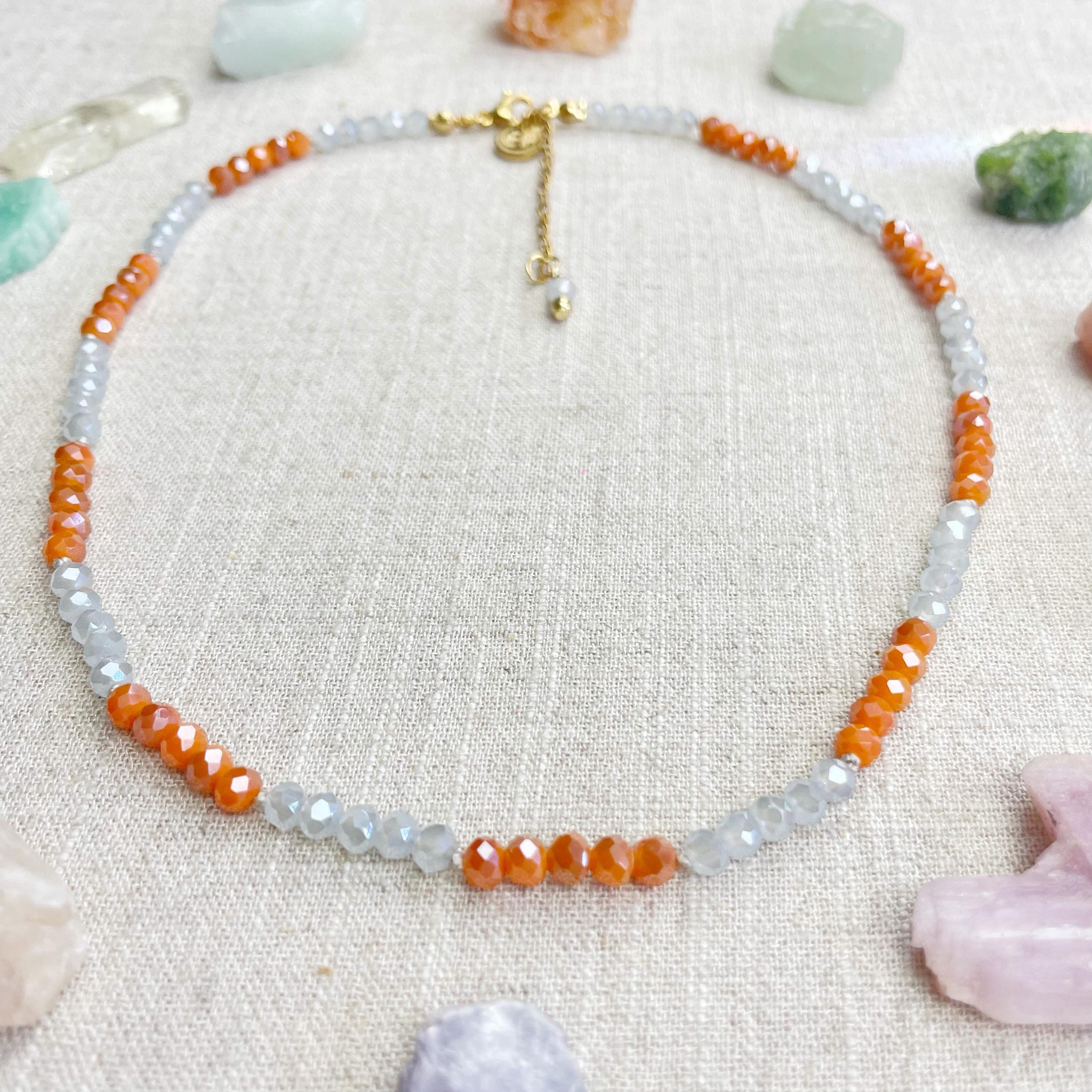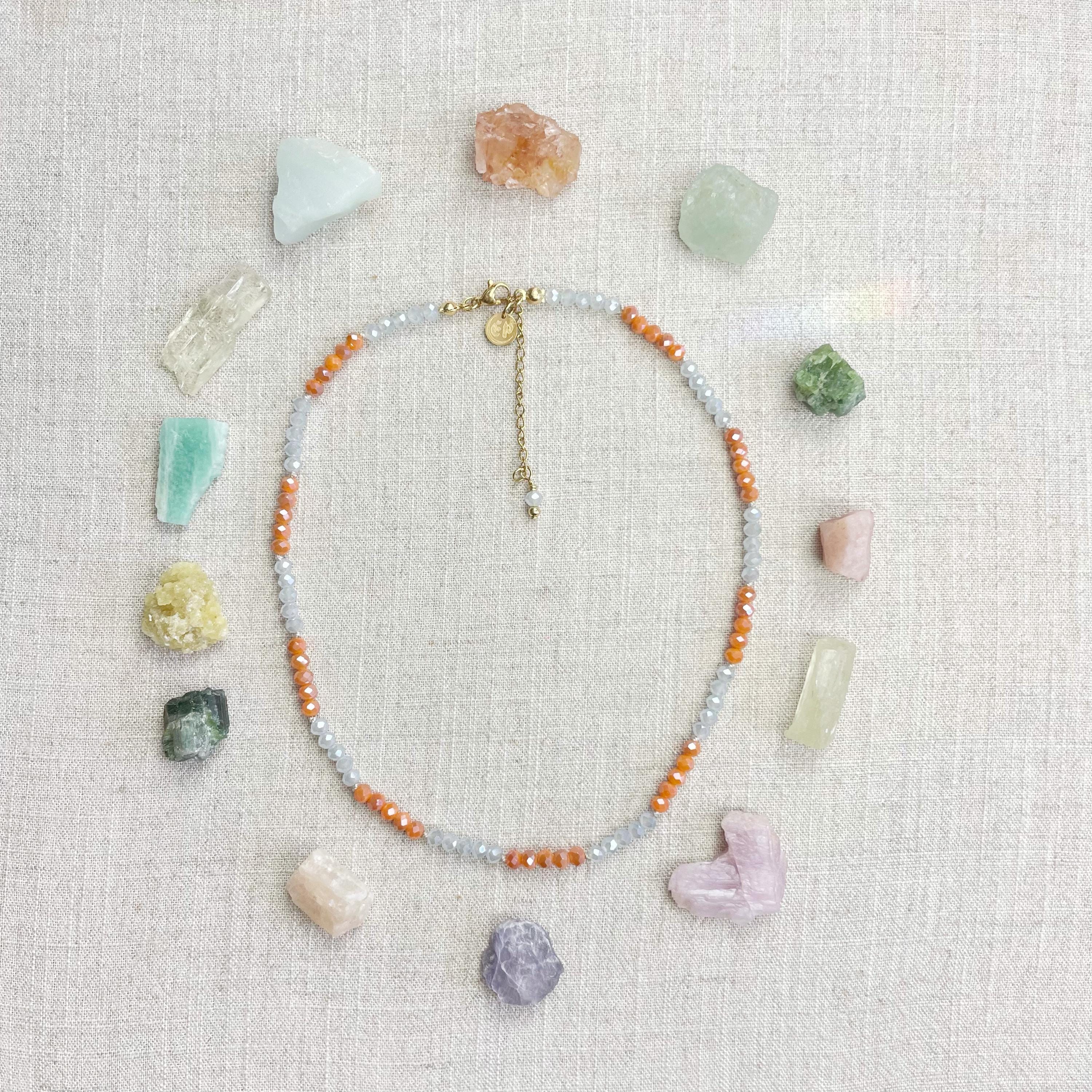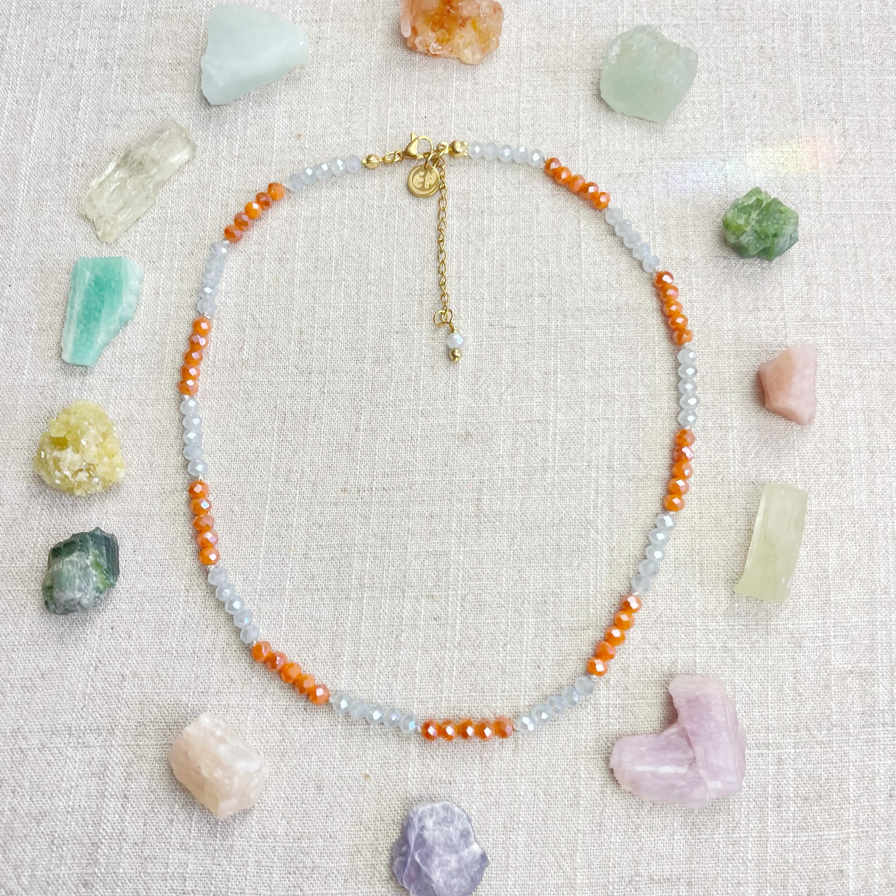 This necklace is made with glass crystal beads which have a iridescent coating. The necklace is made from two different colors which compliment each other. The beads are hand-knotted between the colors creating a color block effect. The beads are 4mm faceted rondelle beads. Each bead is strung on a 100% nylon cord. The necklace is finished off with a gold plated stainless steel chain, clasp and logo charm.