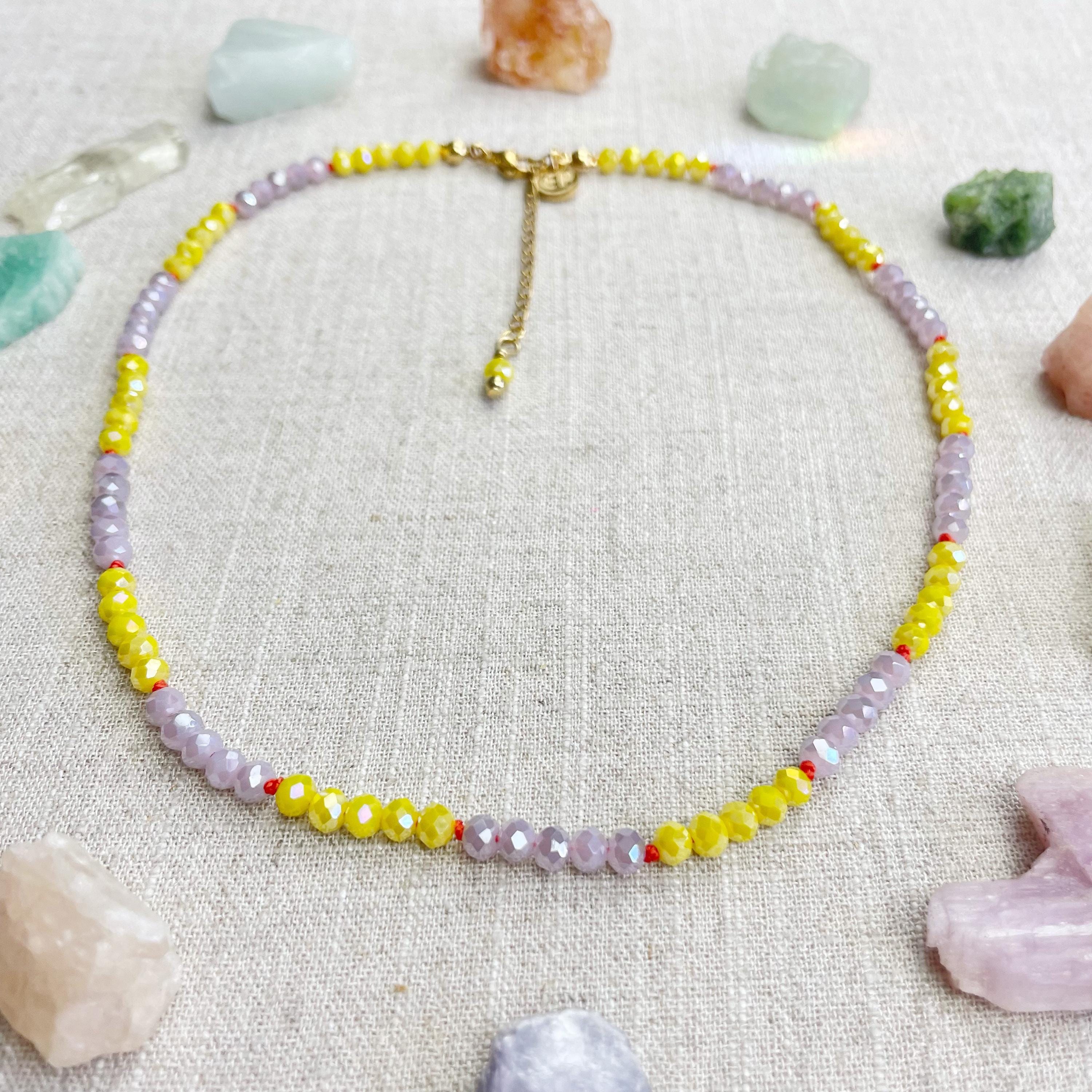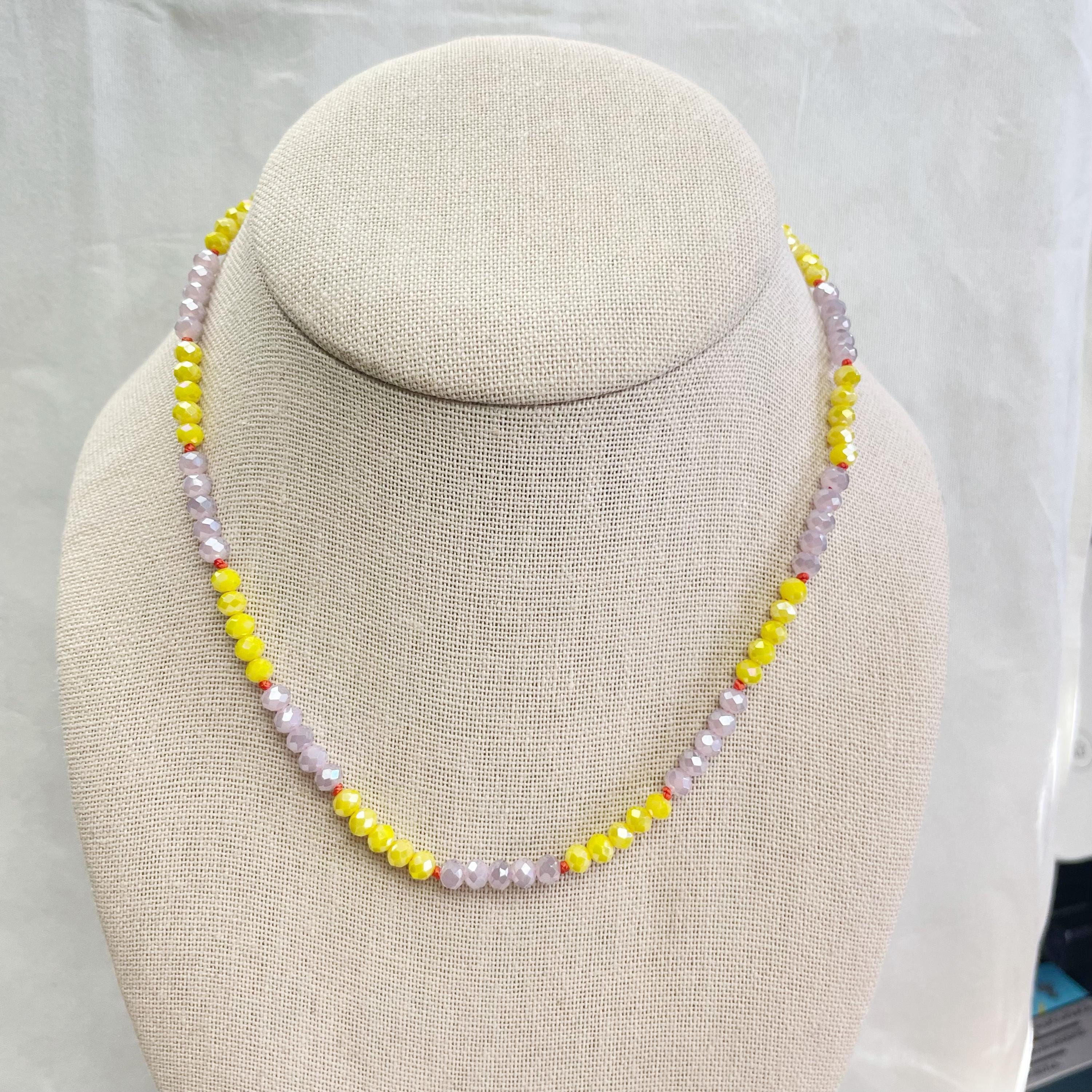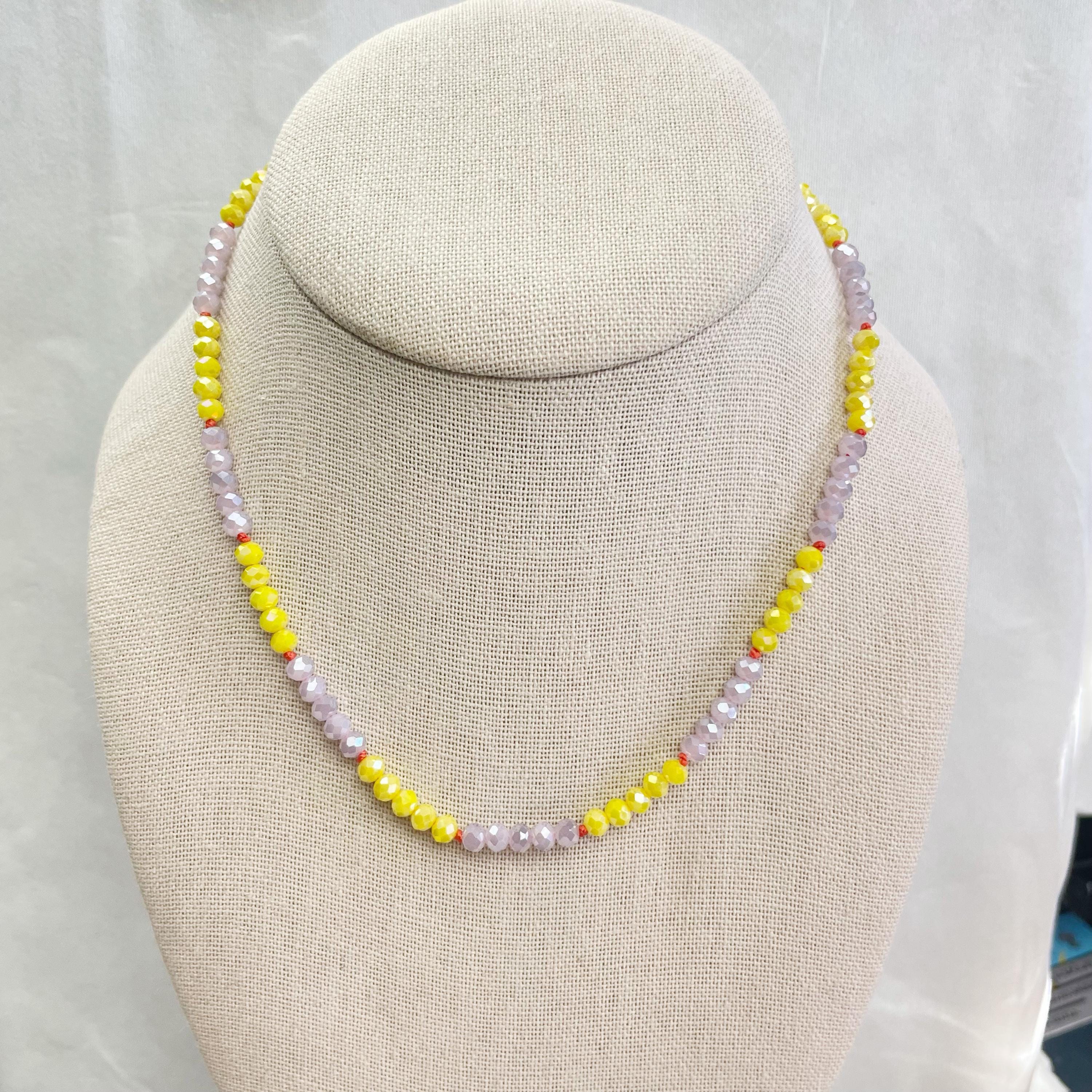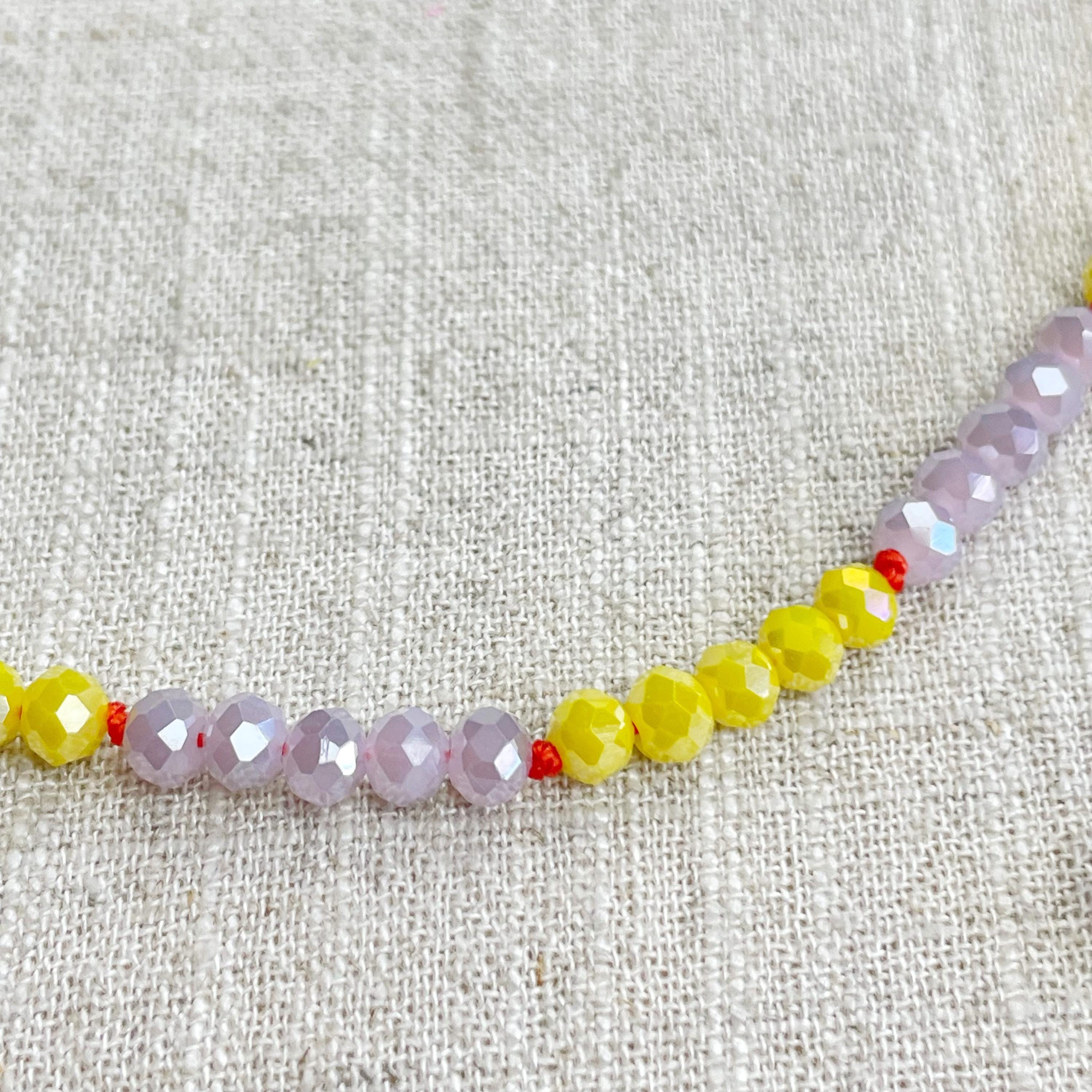 This necklace is made with glass crystal beads which have a iridescent coating. The necklace is made from two different colors which compliment each other. The beads are hand-knotted between the colors creating a color block effect. The beads are 4mm faceted rondelle beads. Each bead is strung on a 100% nylon cord. The necklace is finished off with a gold plated stainless steel chain, clasp and logo charm.