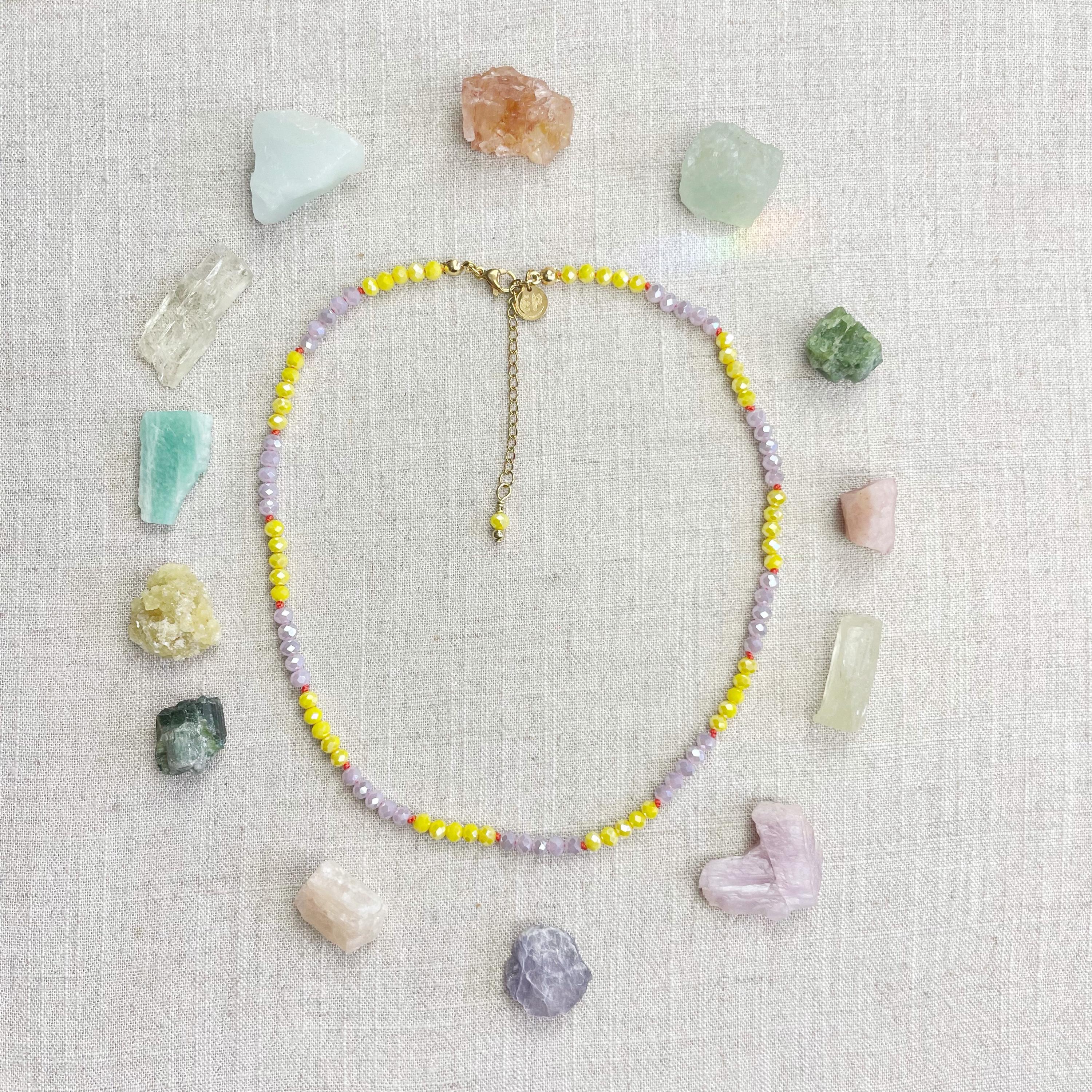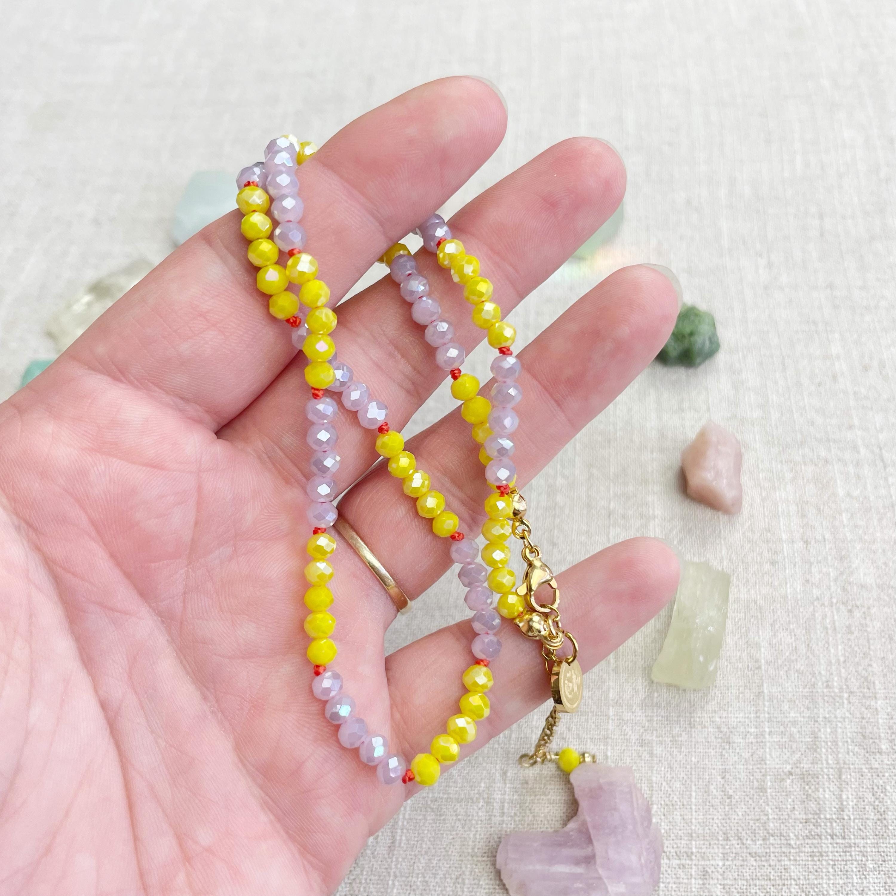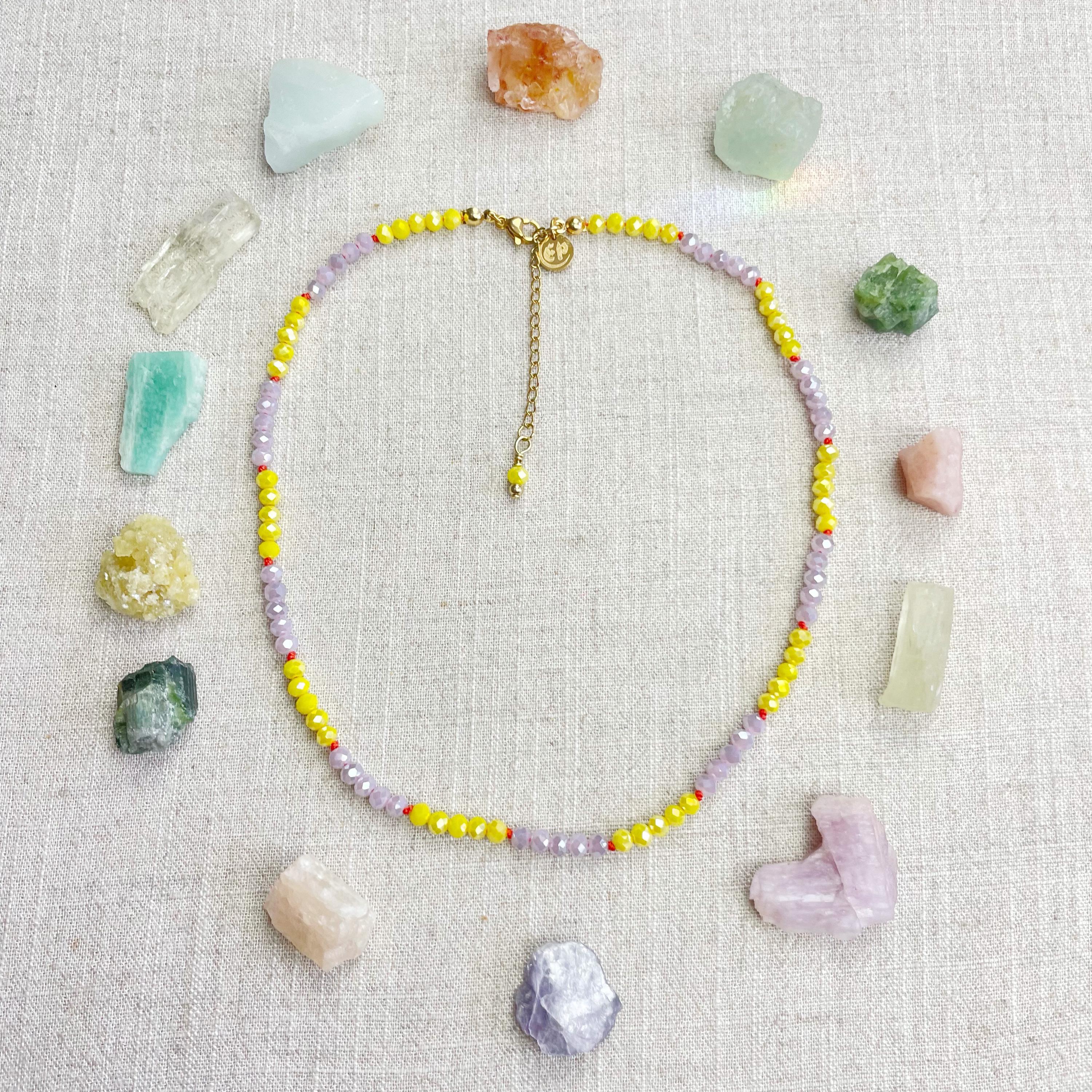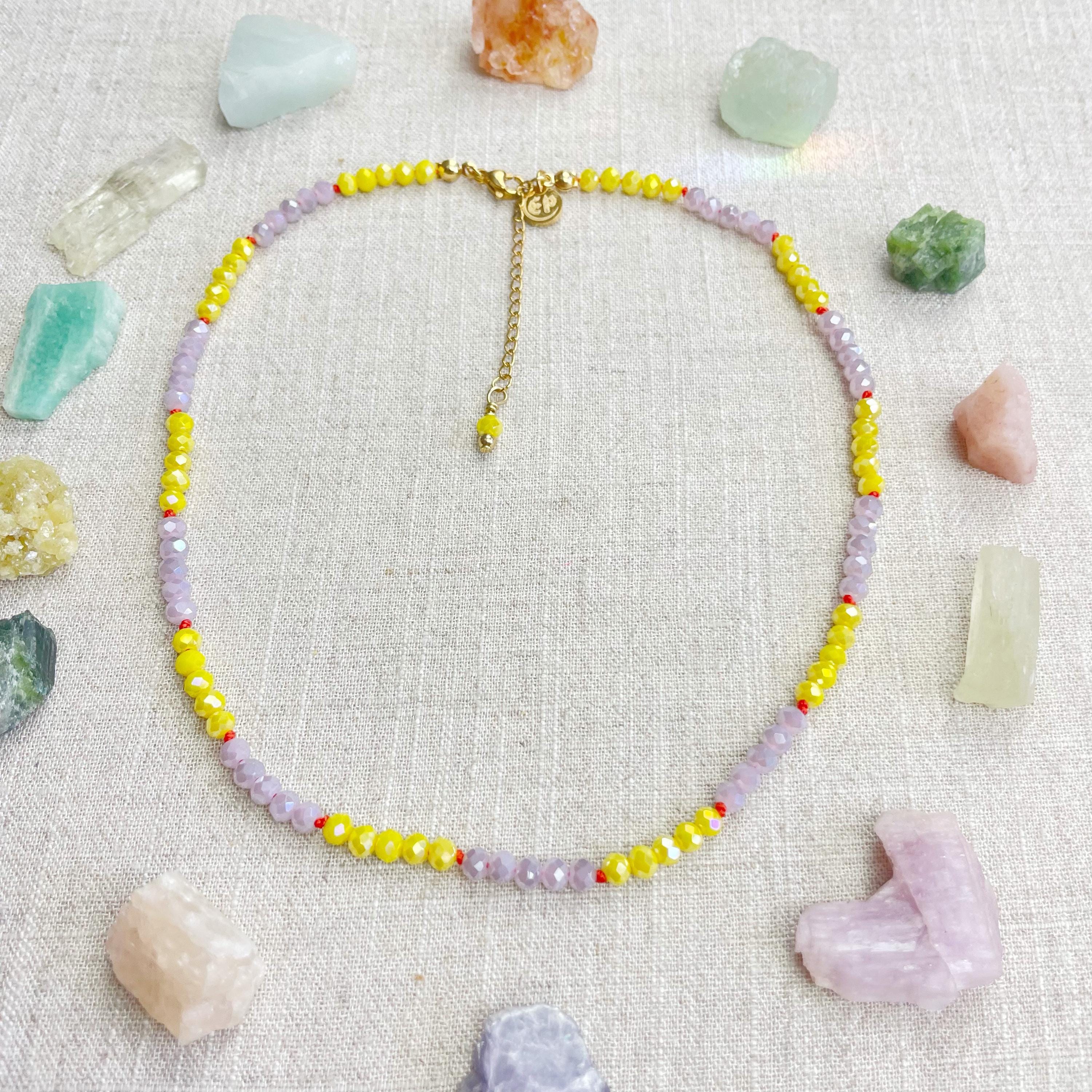 This necklace is made with glass crystal beads which have a iridescent coating. The necklace is made from two different colors which compliment each other. The beads are hand-knotted between the colors creating a color block effect. The beads are 4mm faceted rondelle beads. Each bead is strung on a 100% nylon cord. The necklace is finished off with a gold plated stainless steel chain, clasp and logo charm.