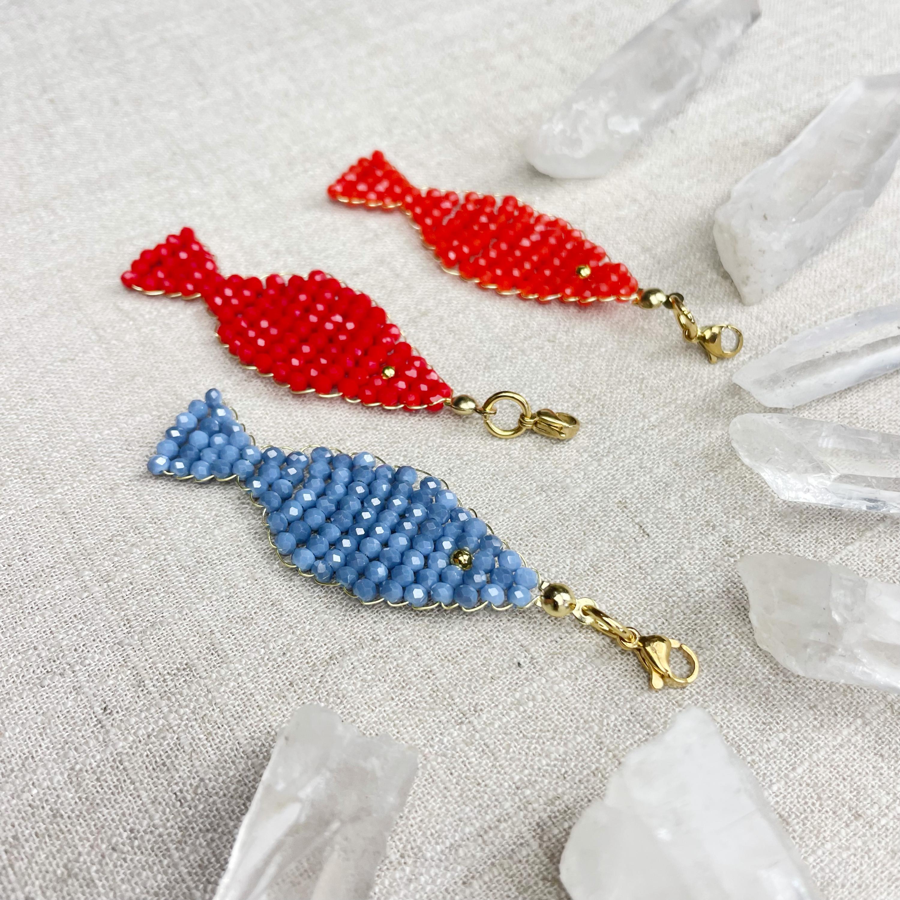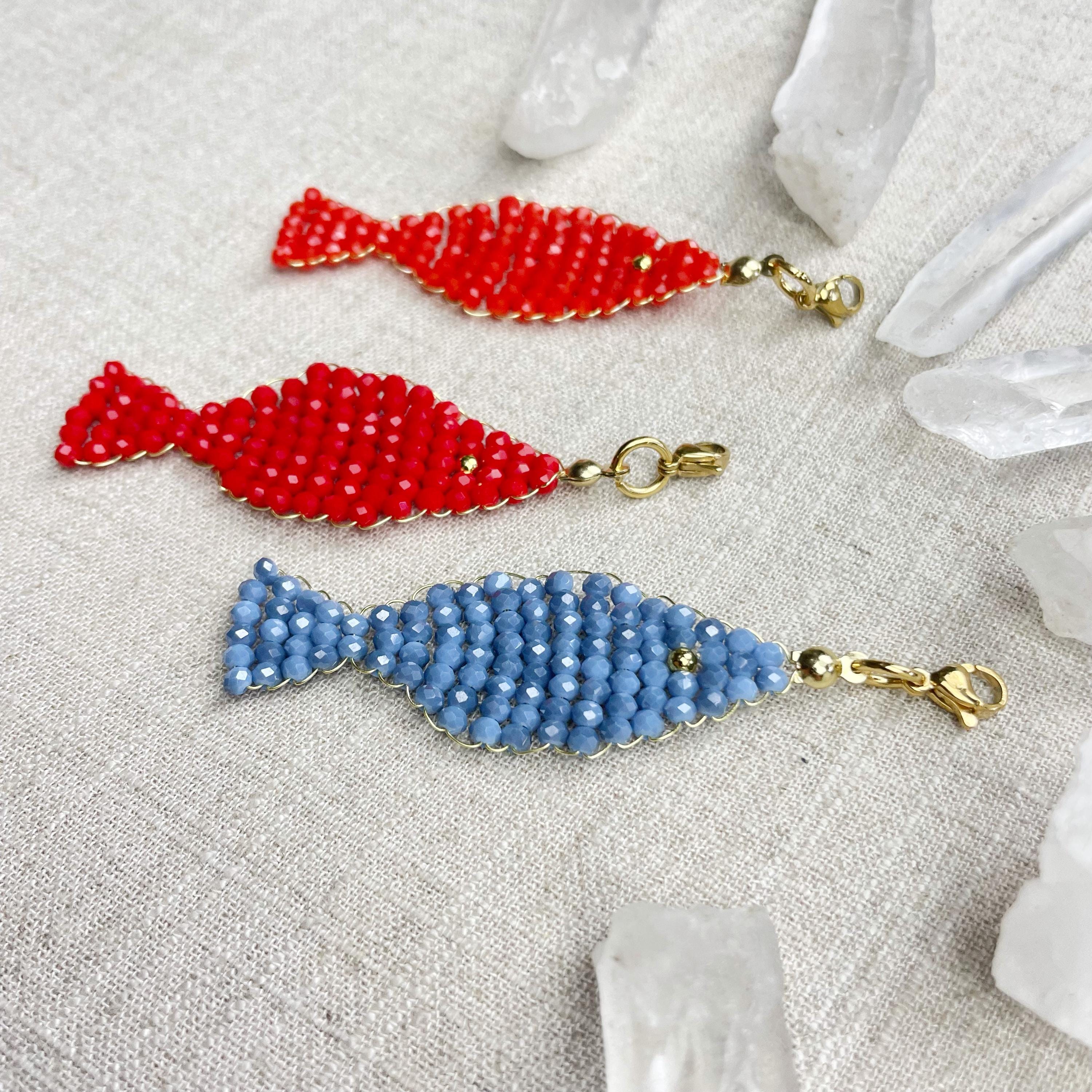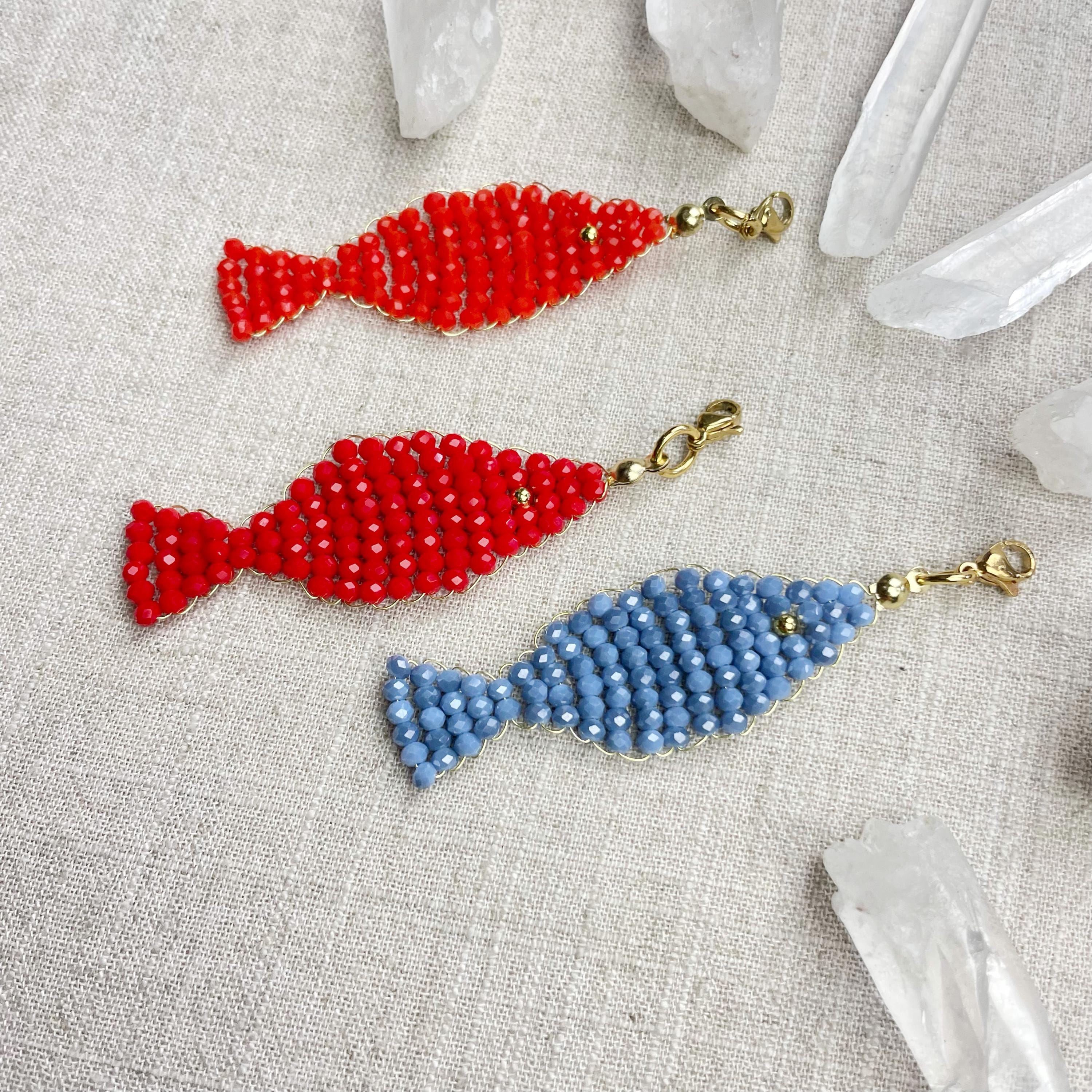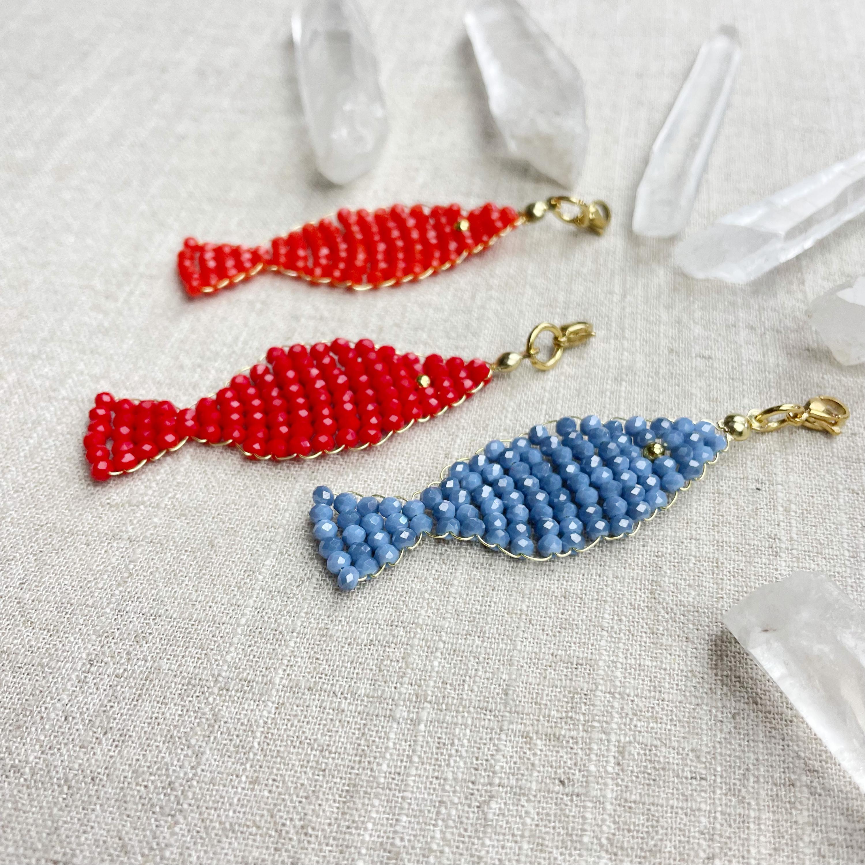 This charm is made from 3mm glass faceted rondelle beads. The beads are woven together with a gold toned wire to create the fish charm. A gold plated stainless steel bead is used as the eye.