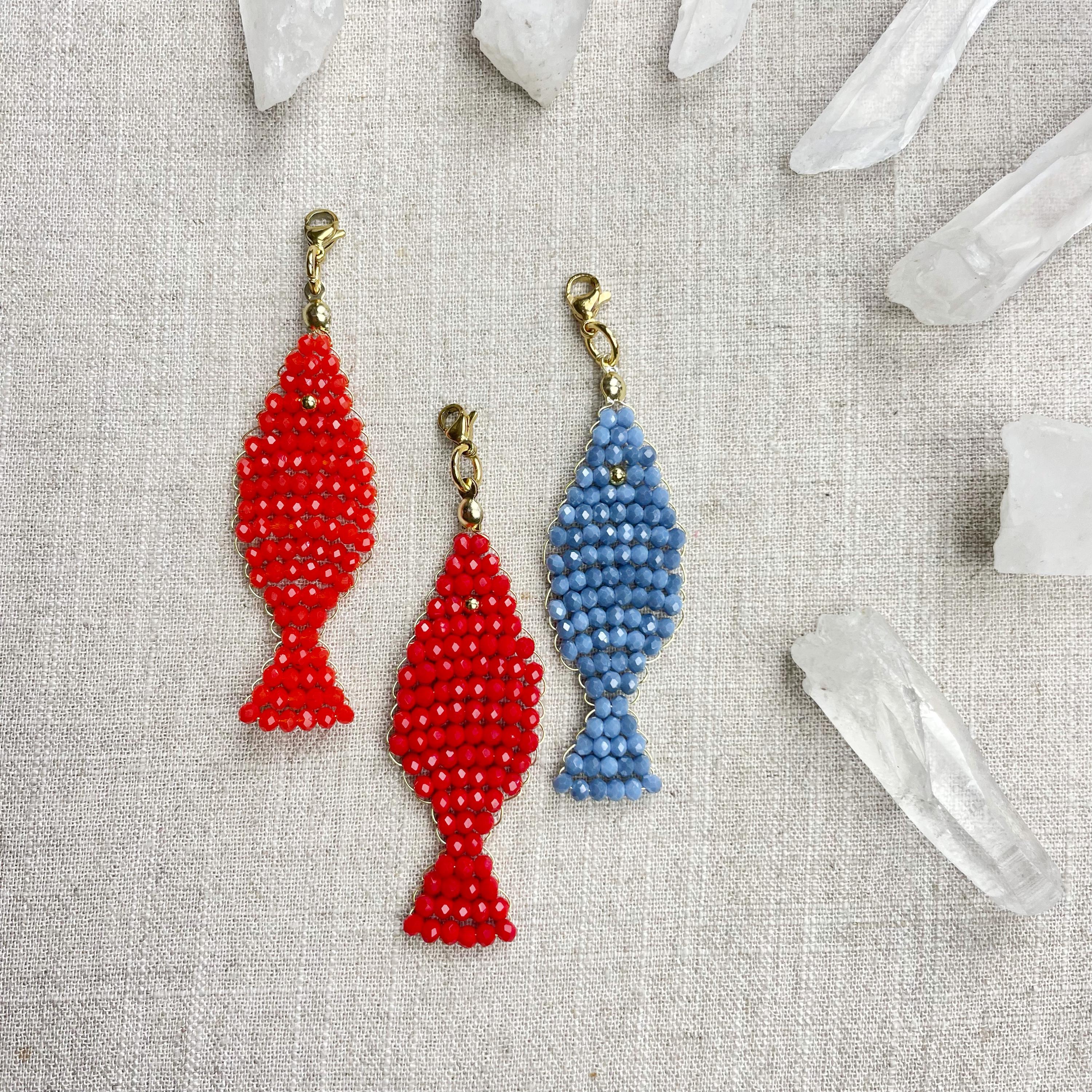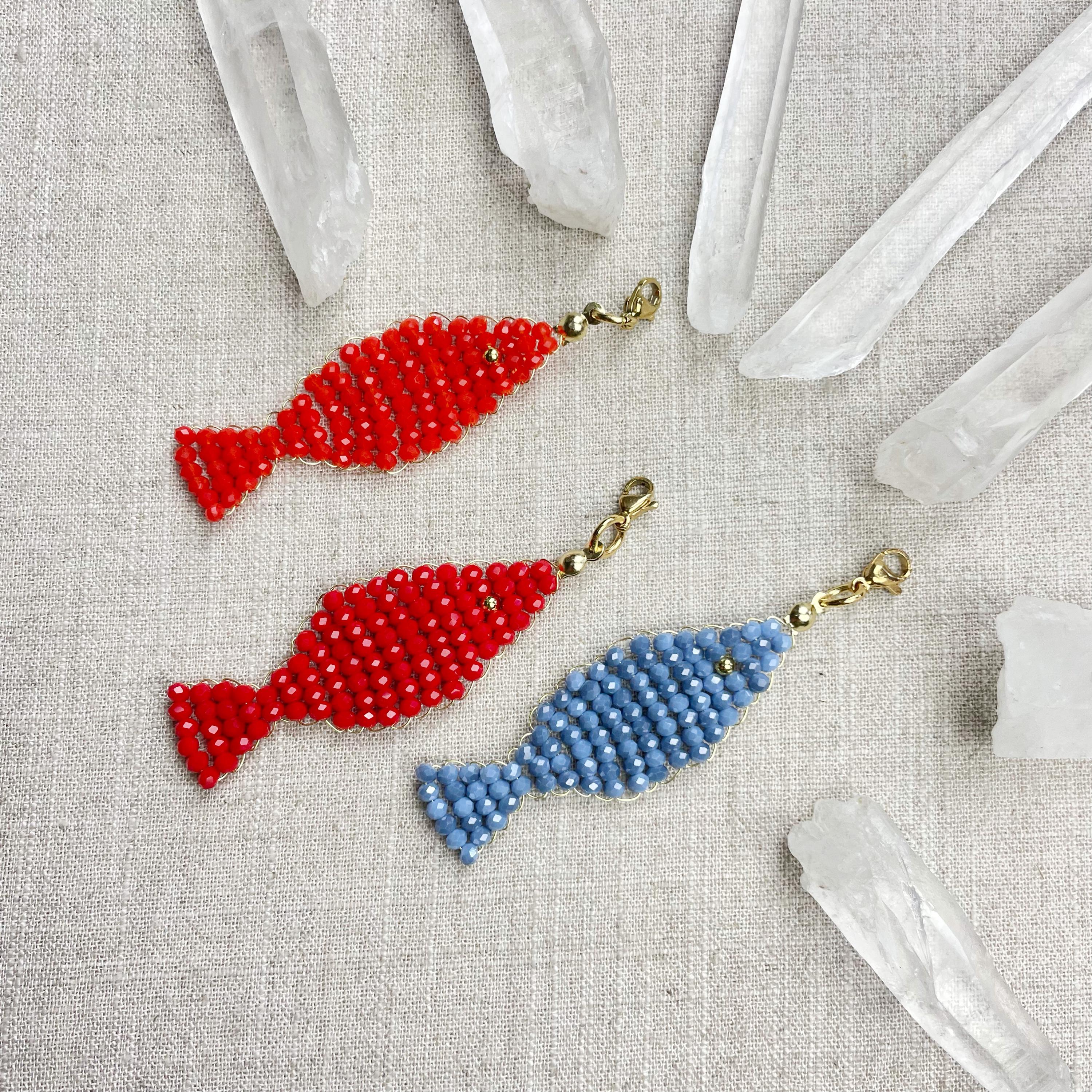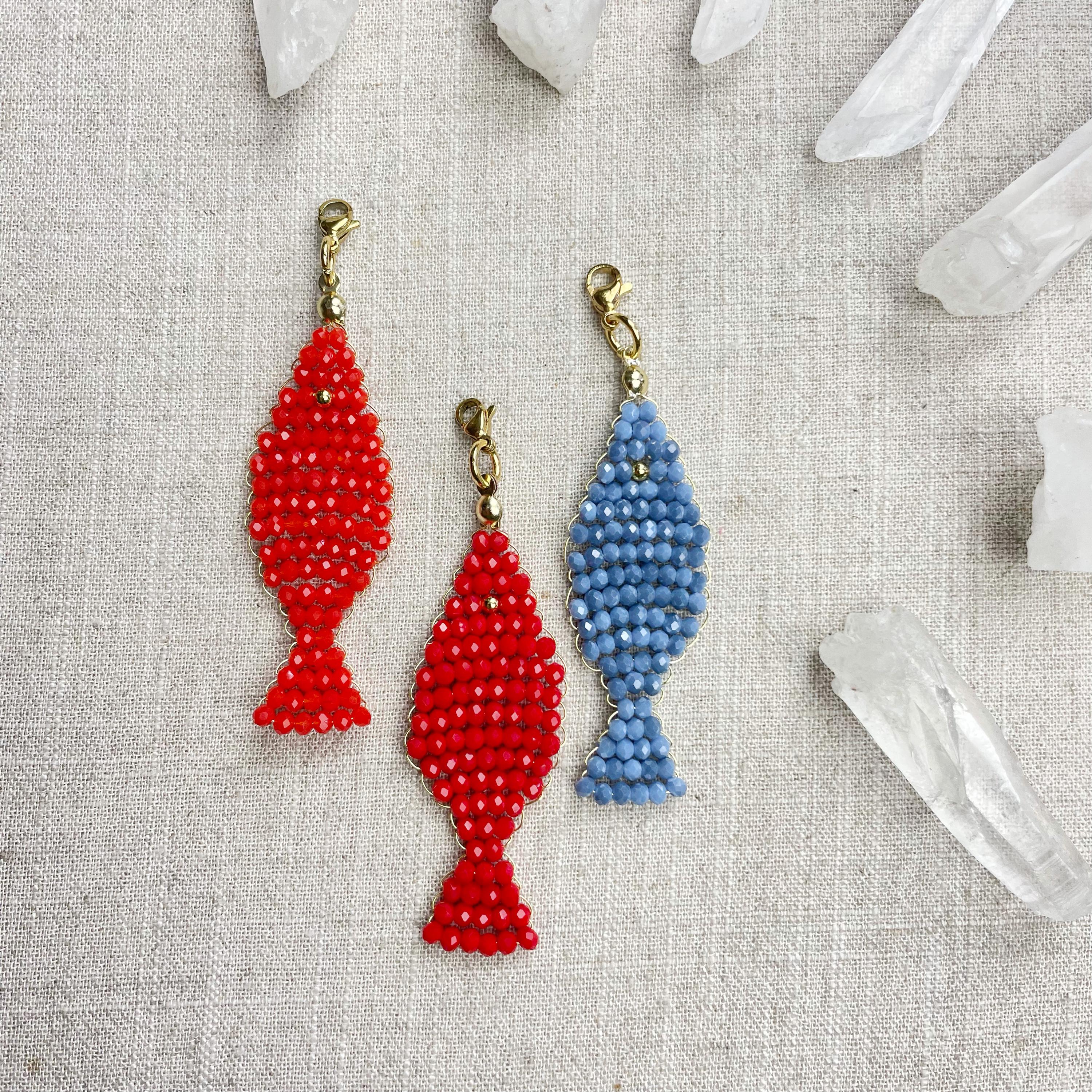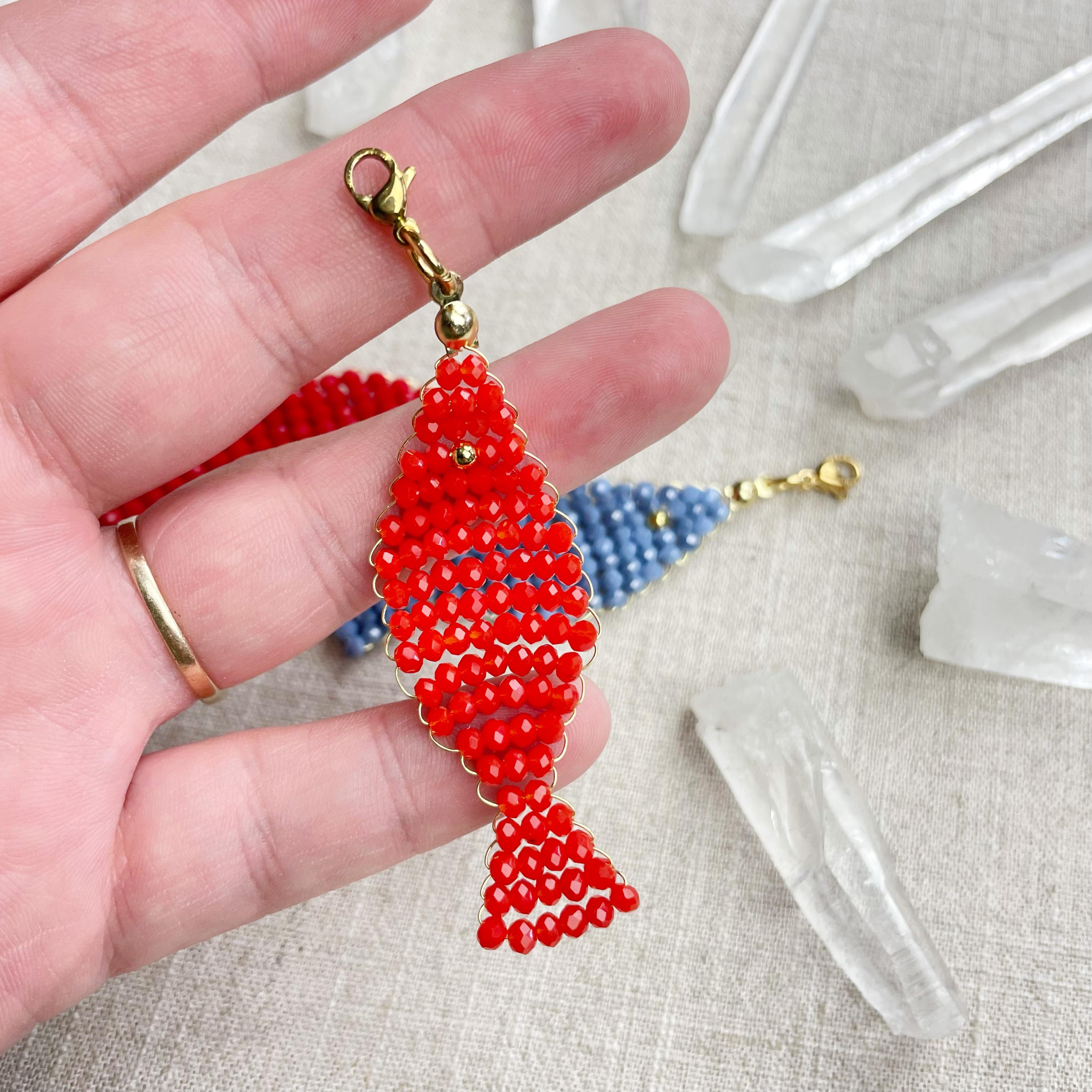 This charm is made from 3mm glass faceted rondelle beads. The beads are woven together with a gold toned wire to create the fish charm. A gold plated stainless steel bead is used as the eye.