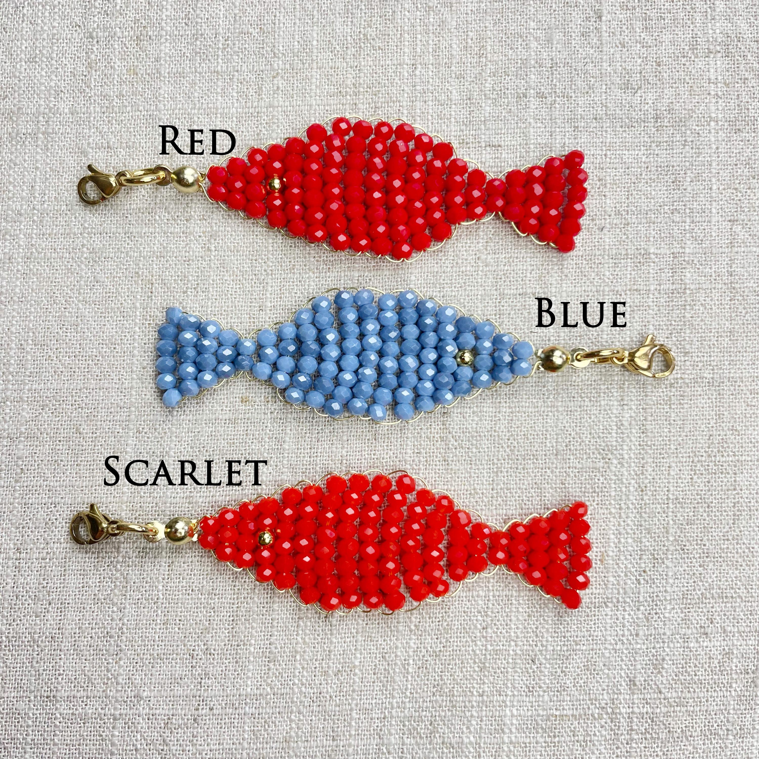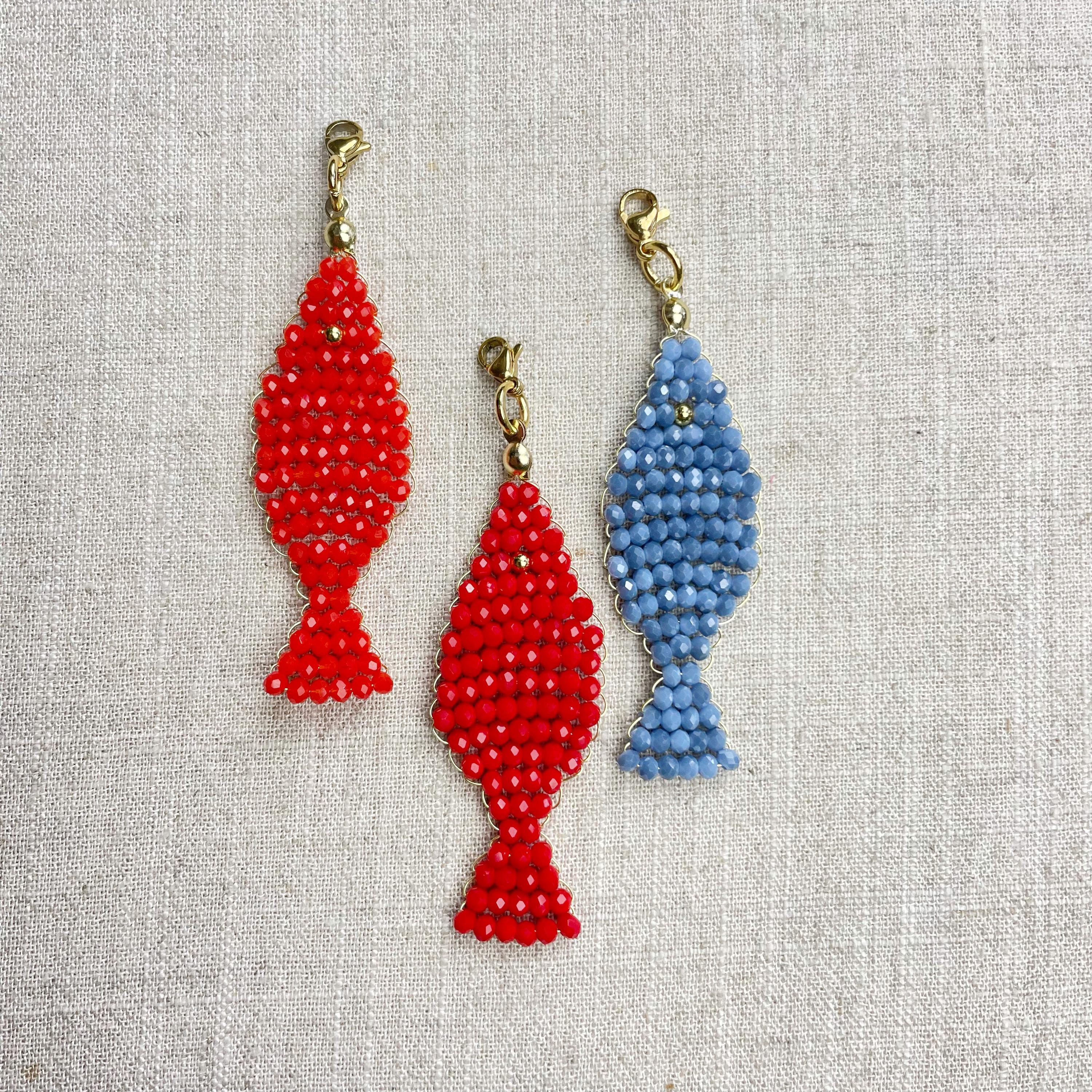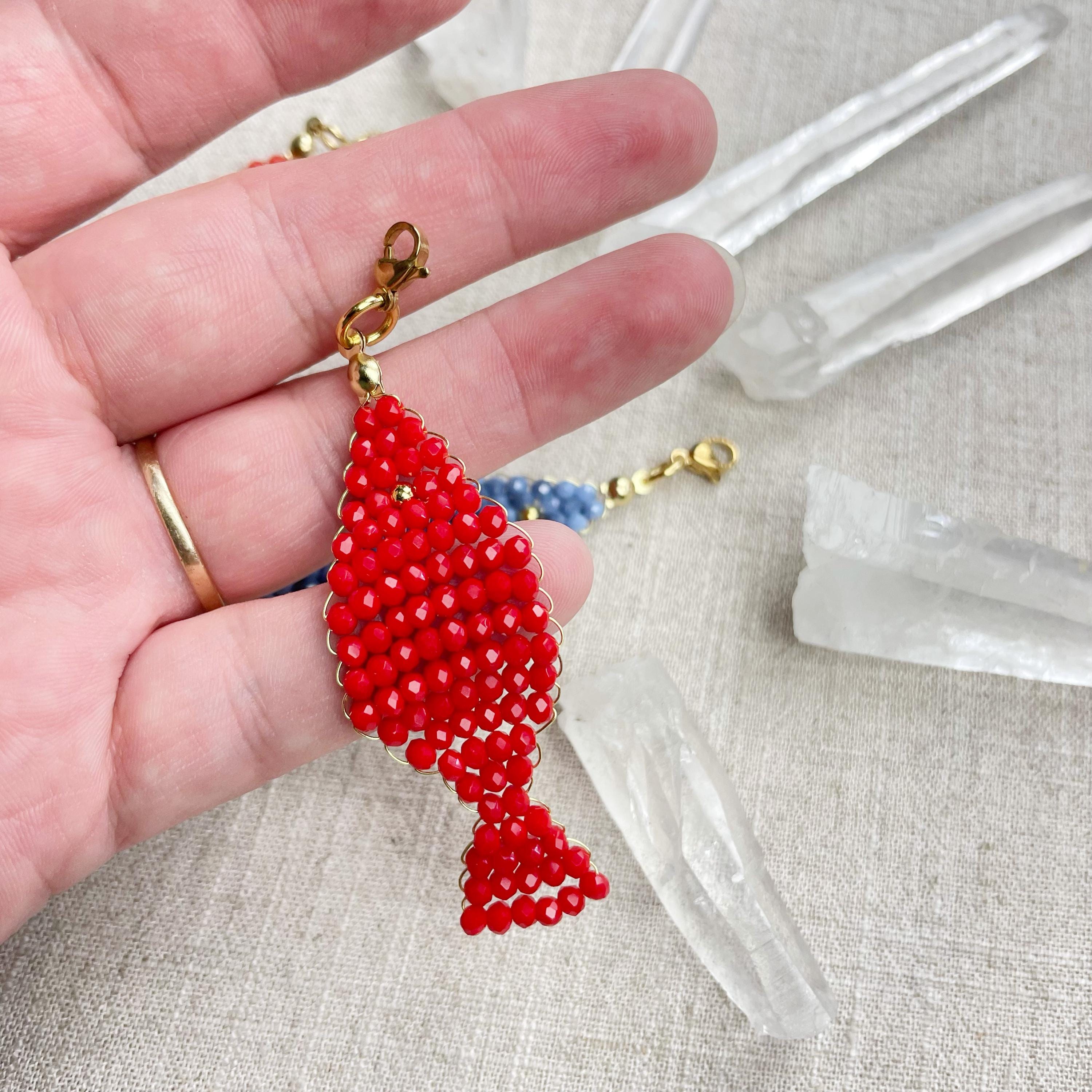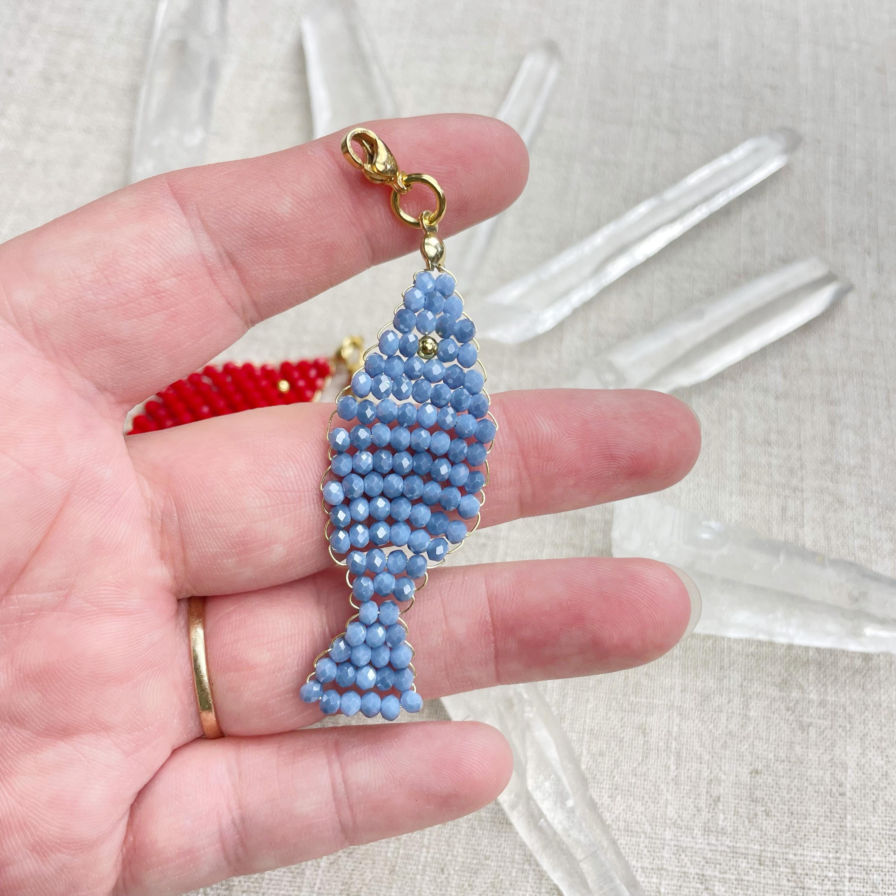 This charm is made from 3mm glass faceted rondelle beads. The beads are woven together with a gold toned wire to create the fish charm. A gold plated stainless steel bead is used as the eye.