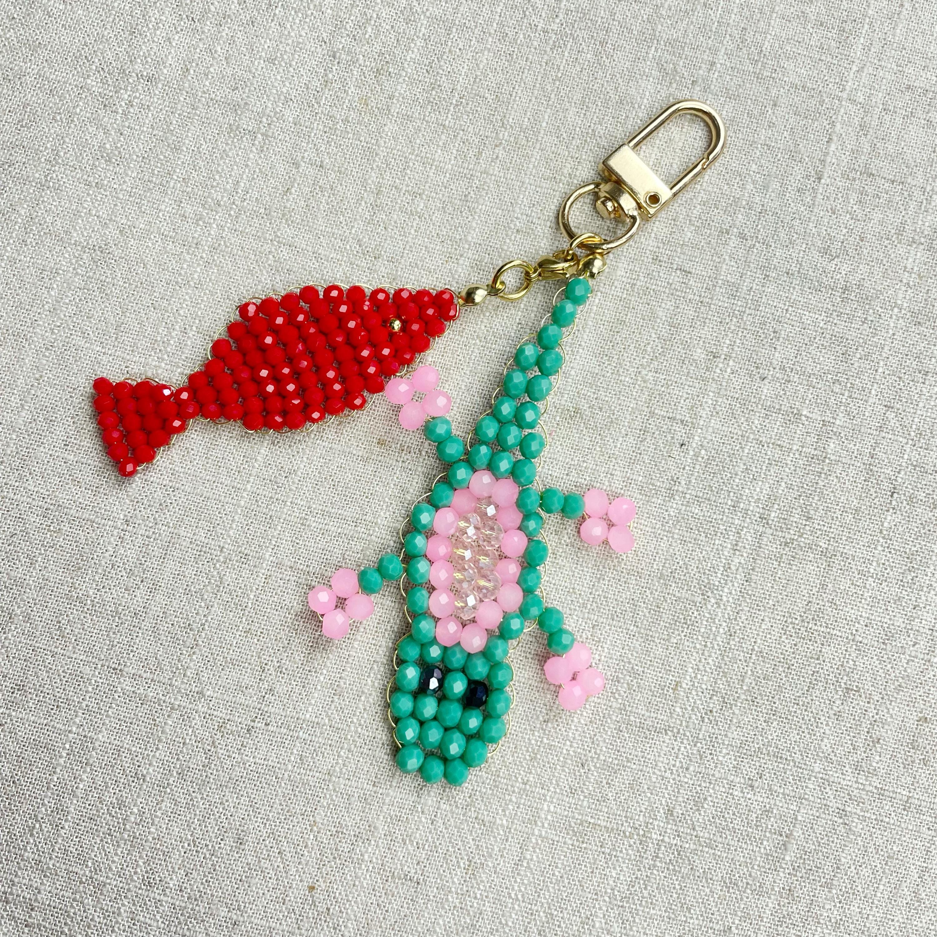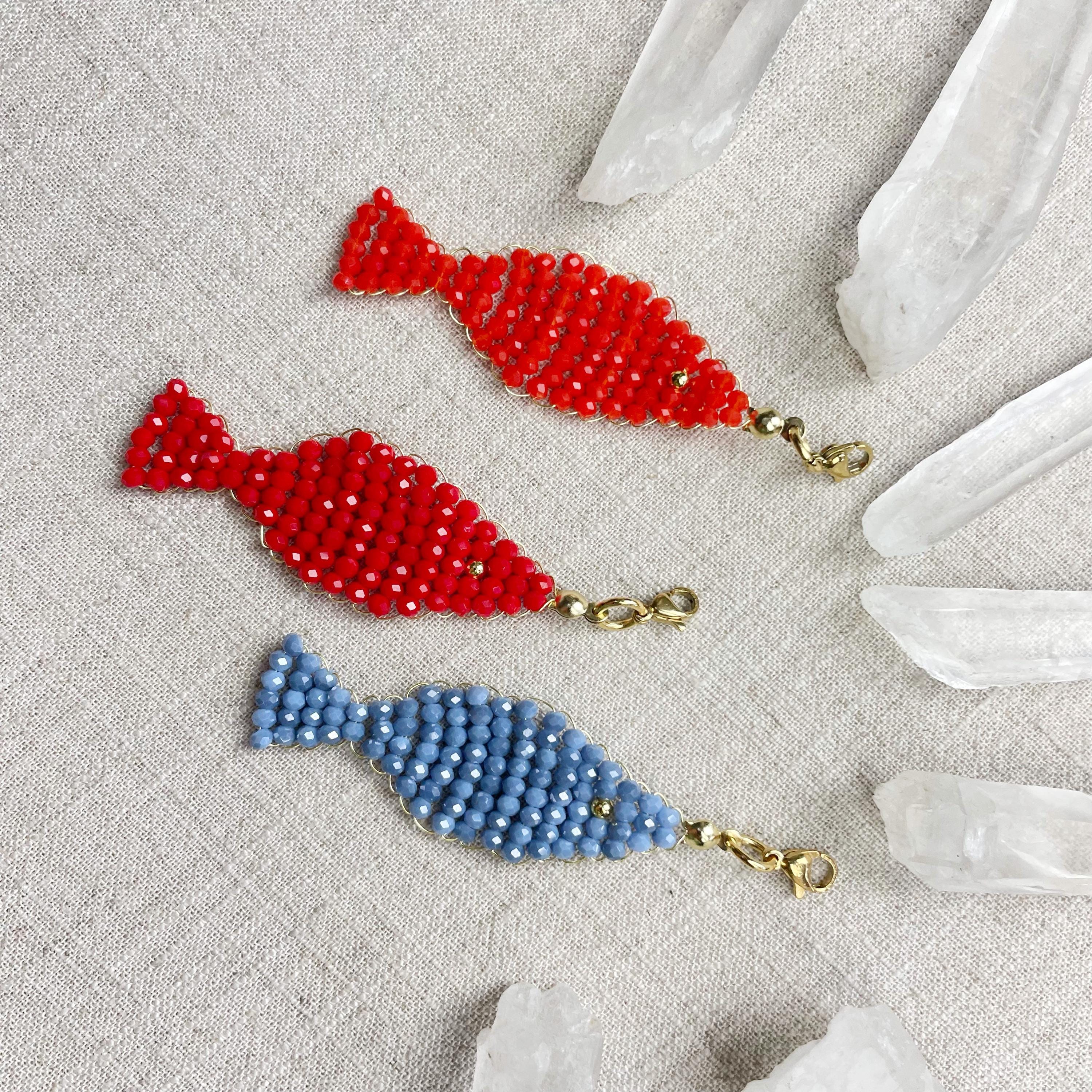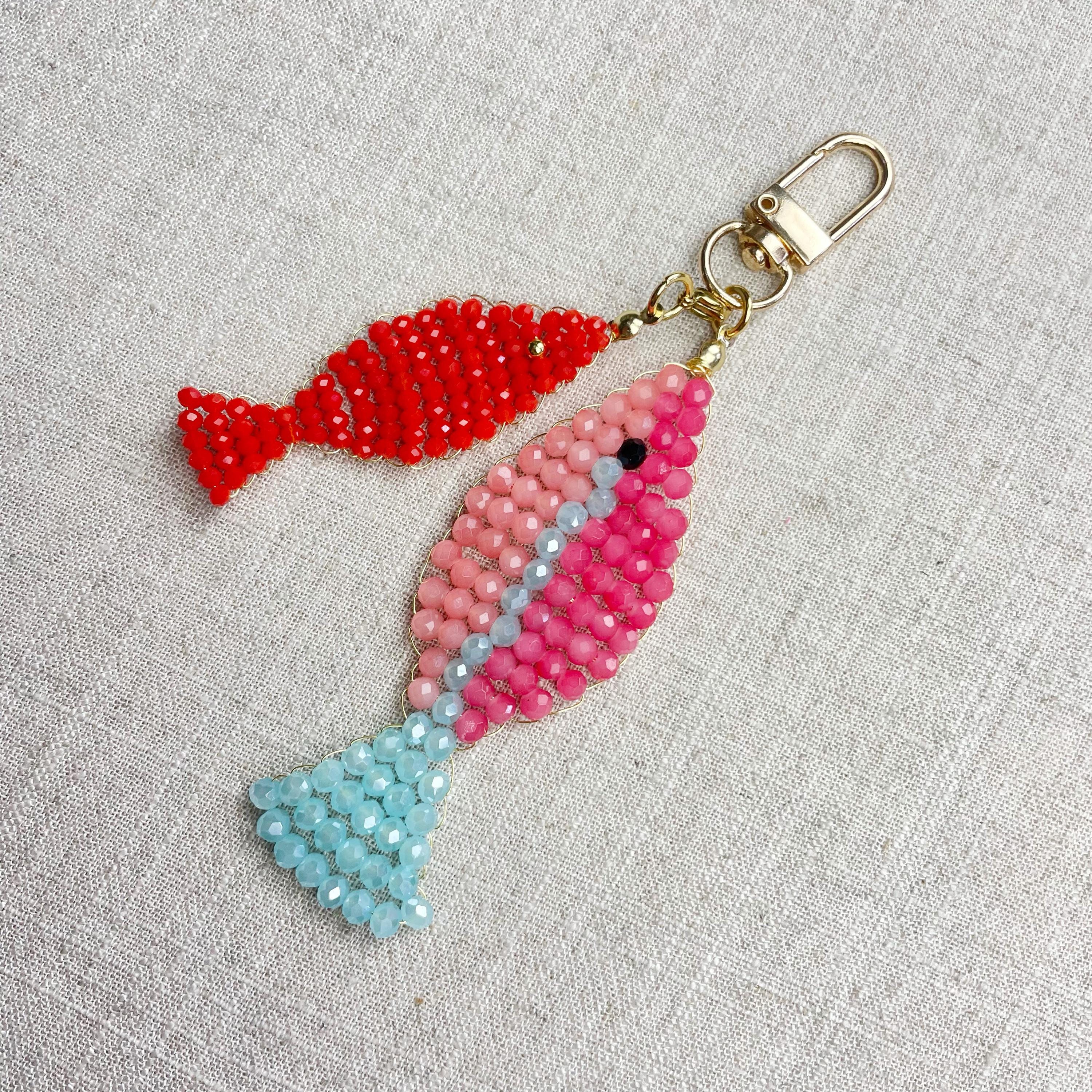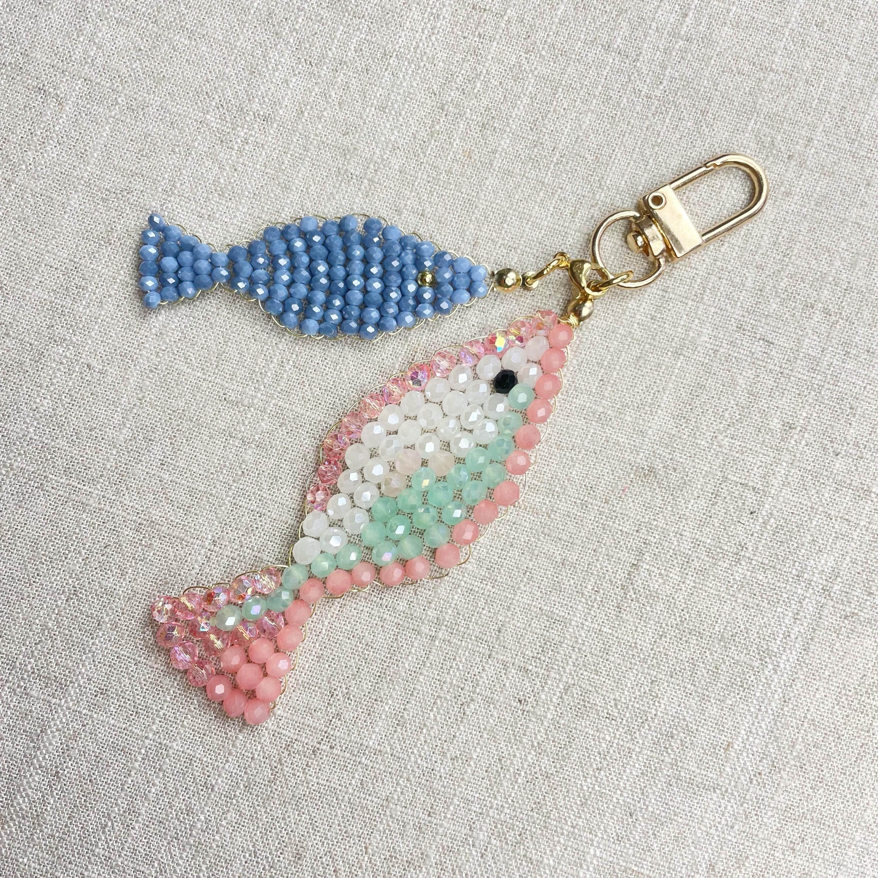 This charm is made from 3mm glass faceted rondelle beads. The beads are woven together with a gold toned wire to create the fish charm. A gold plated stainless steel bead is used as the eye.