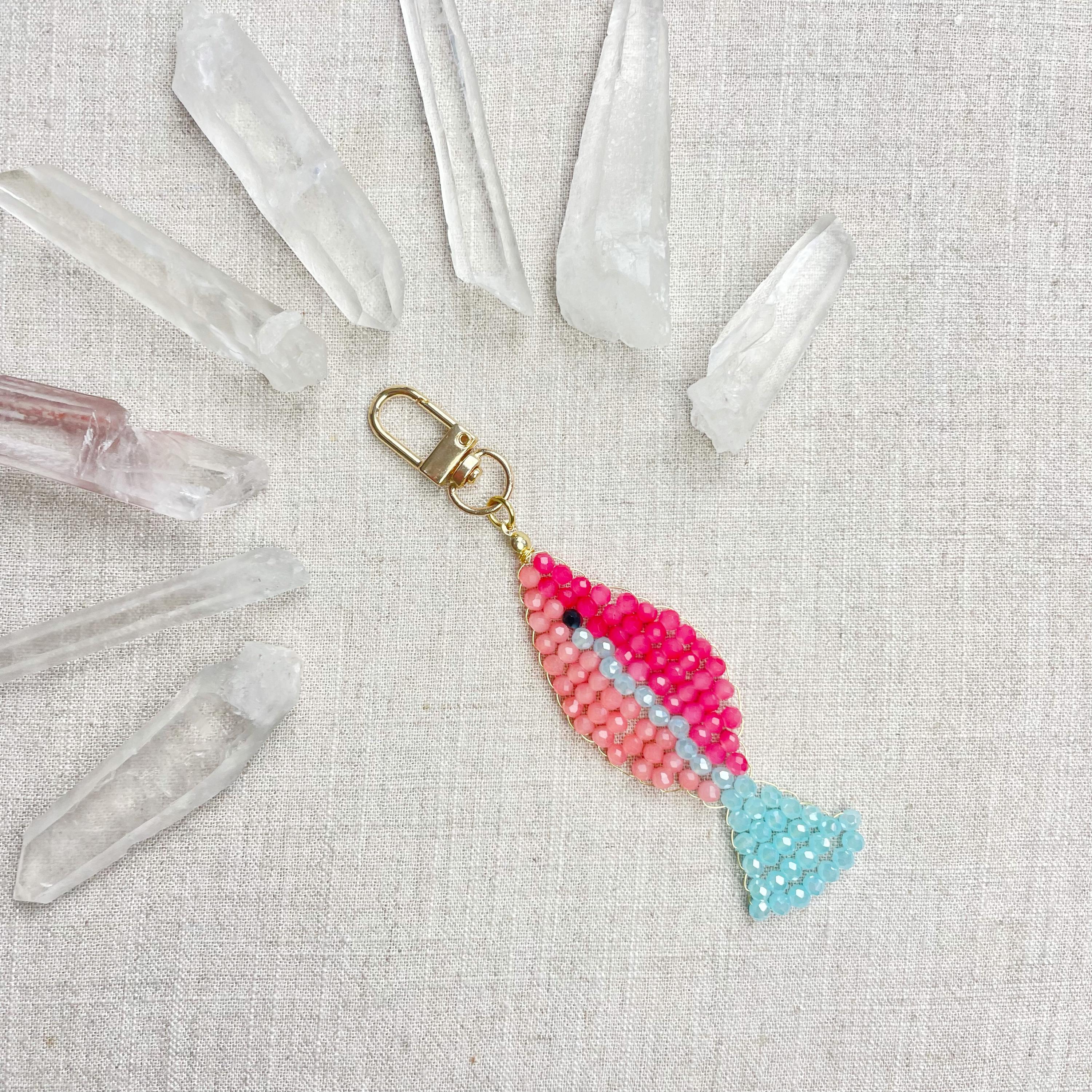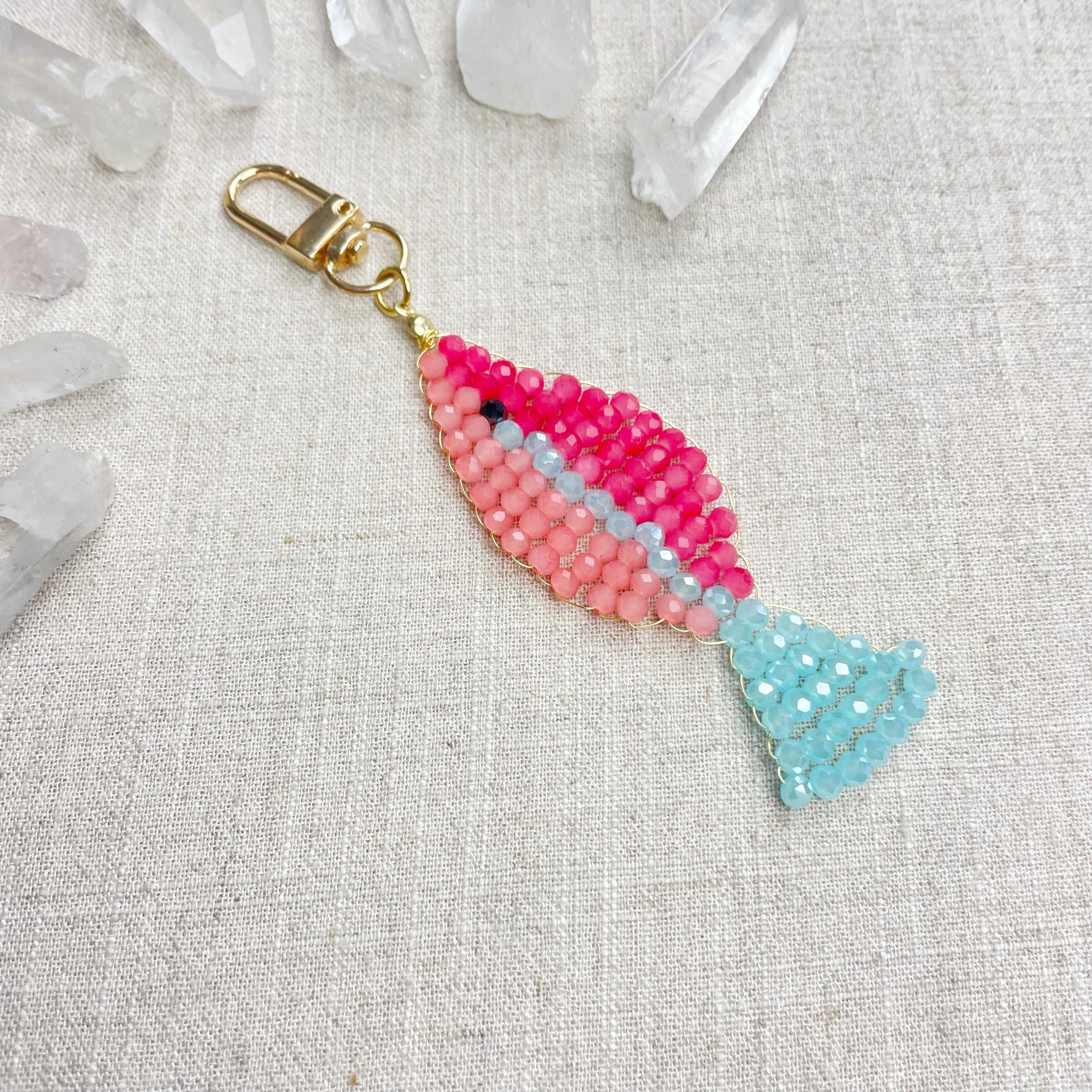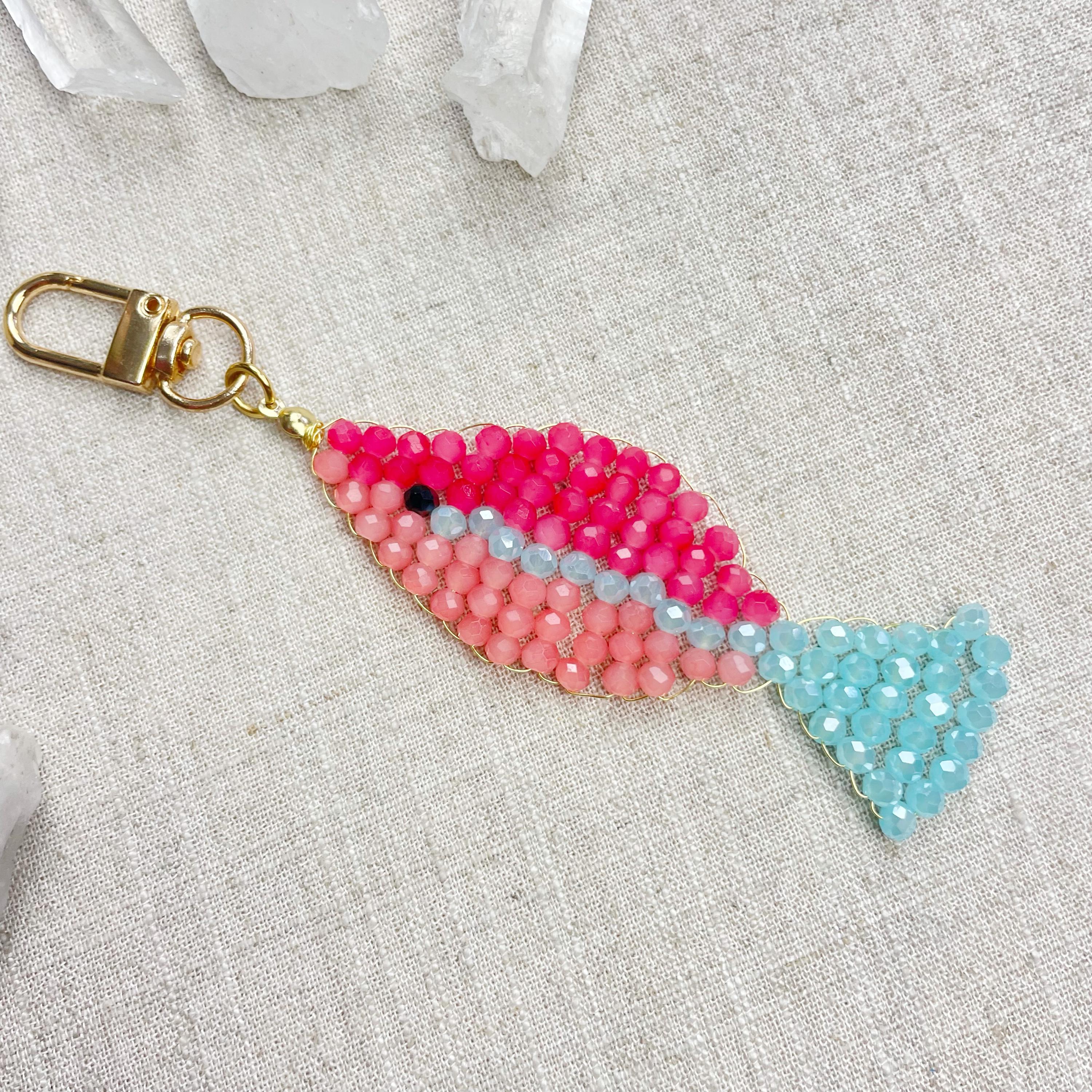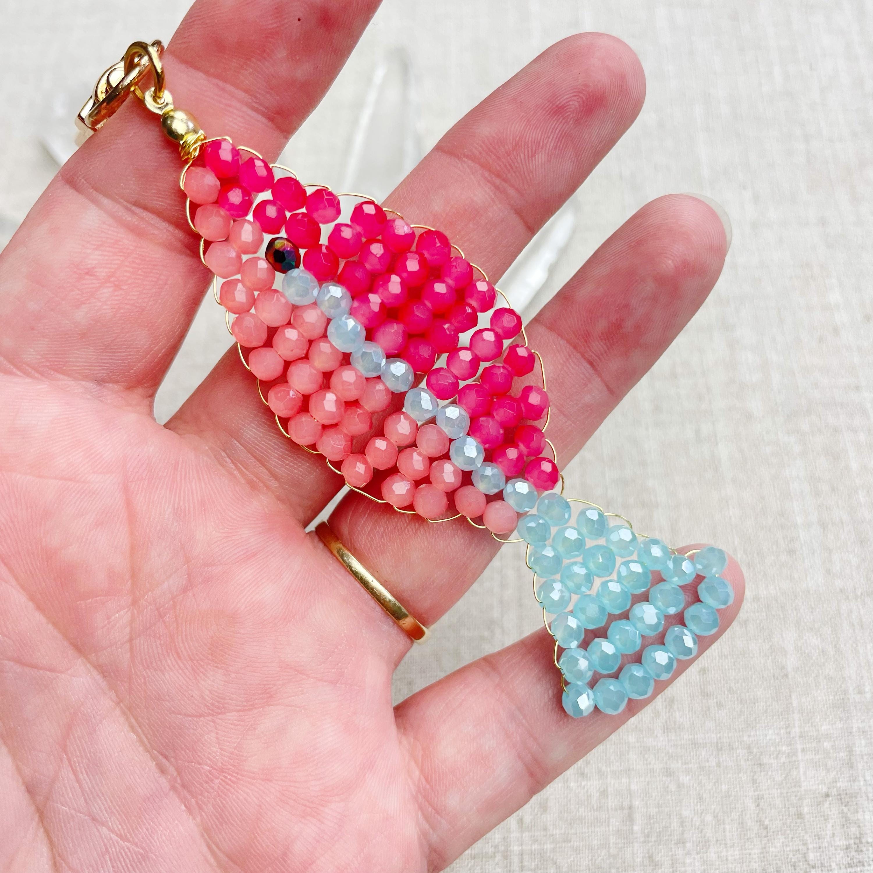 This charm is made from 4mm glass faceted rondelle beads. The beads are woven together with a gold toned wire to create the fish charm. The fish features two different pink colors and a iridescent blue.