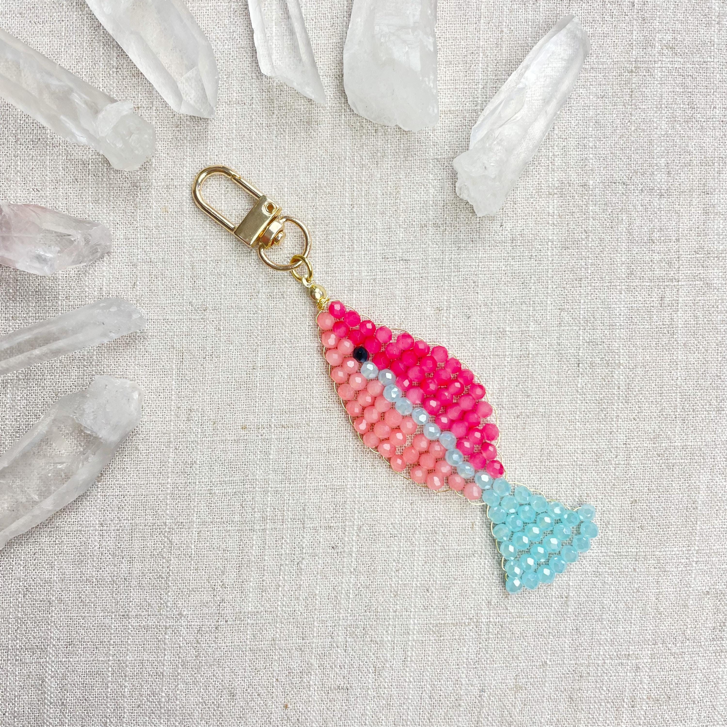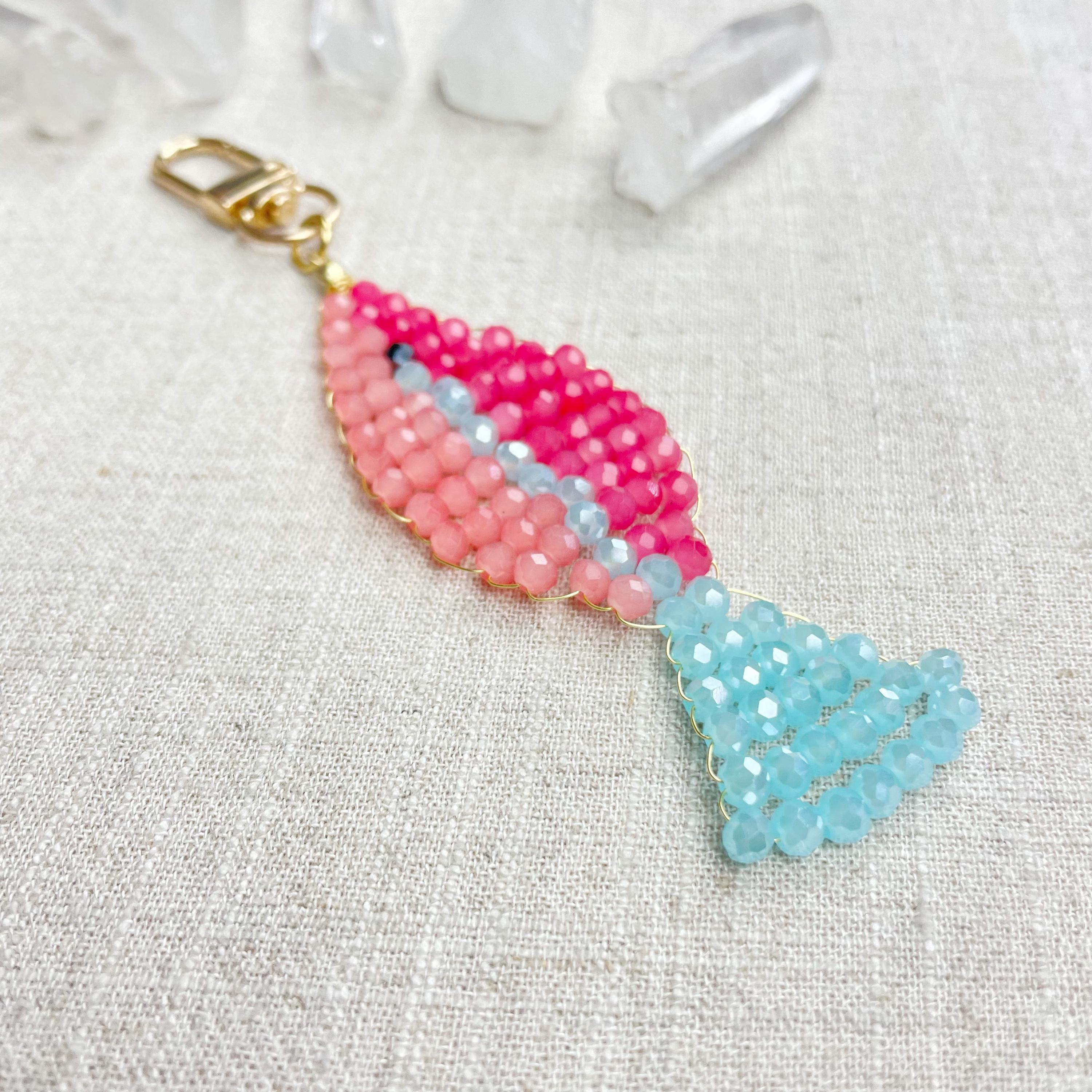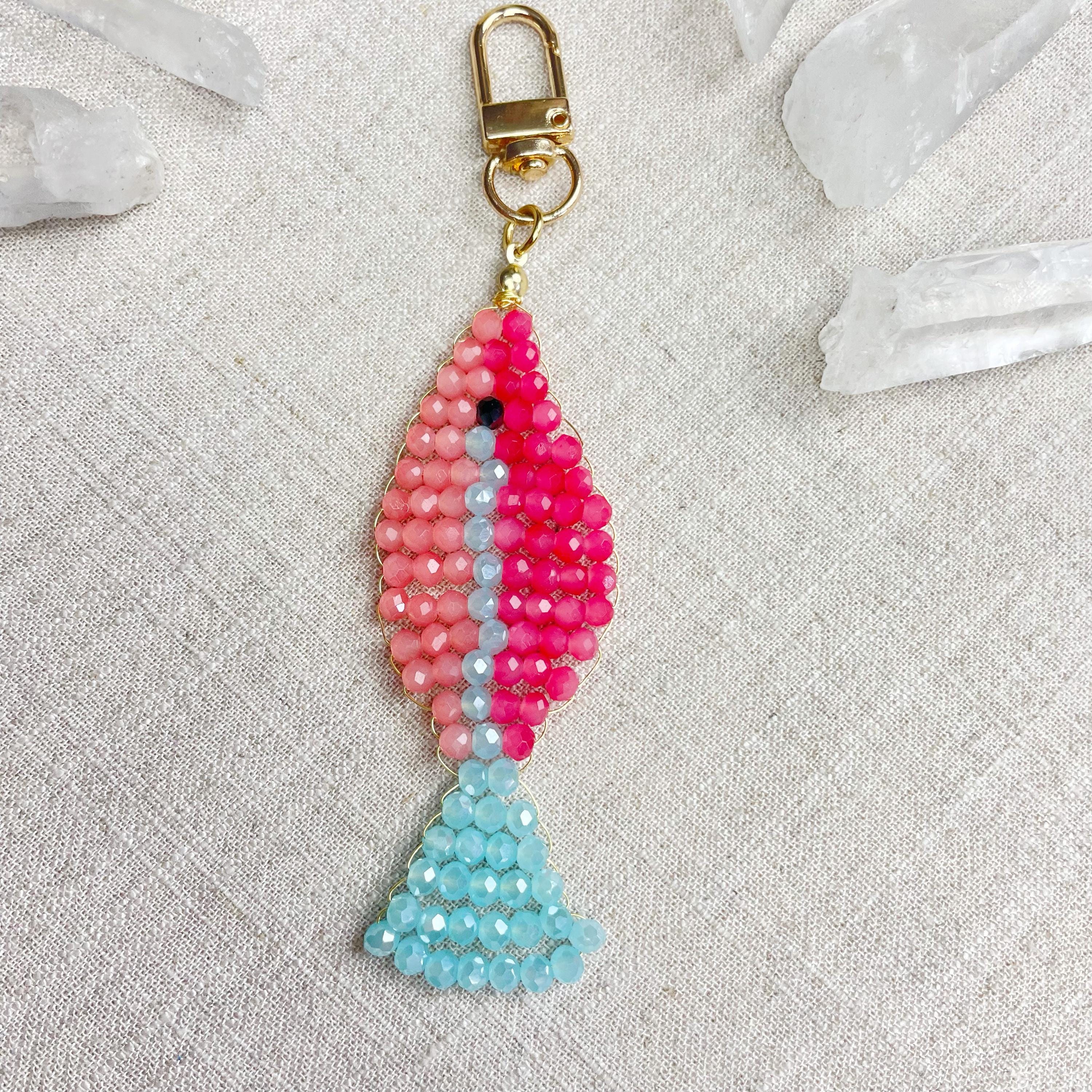 This charm is made from 4mm glass faceted rondelle beads. The beads are woven together with a gold toned wire to create the fish charm. The fish features two different pink colors and a iridescent blue.