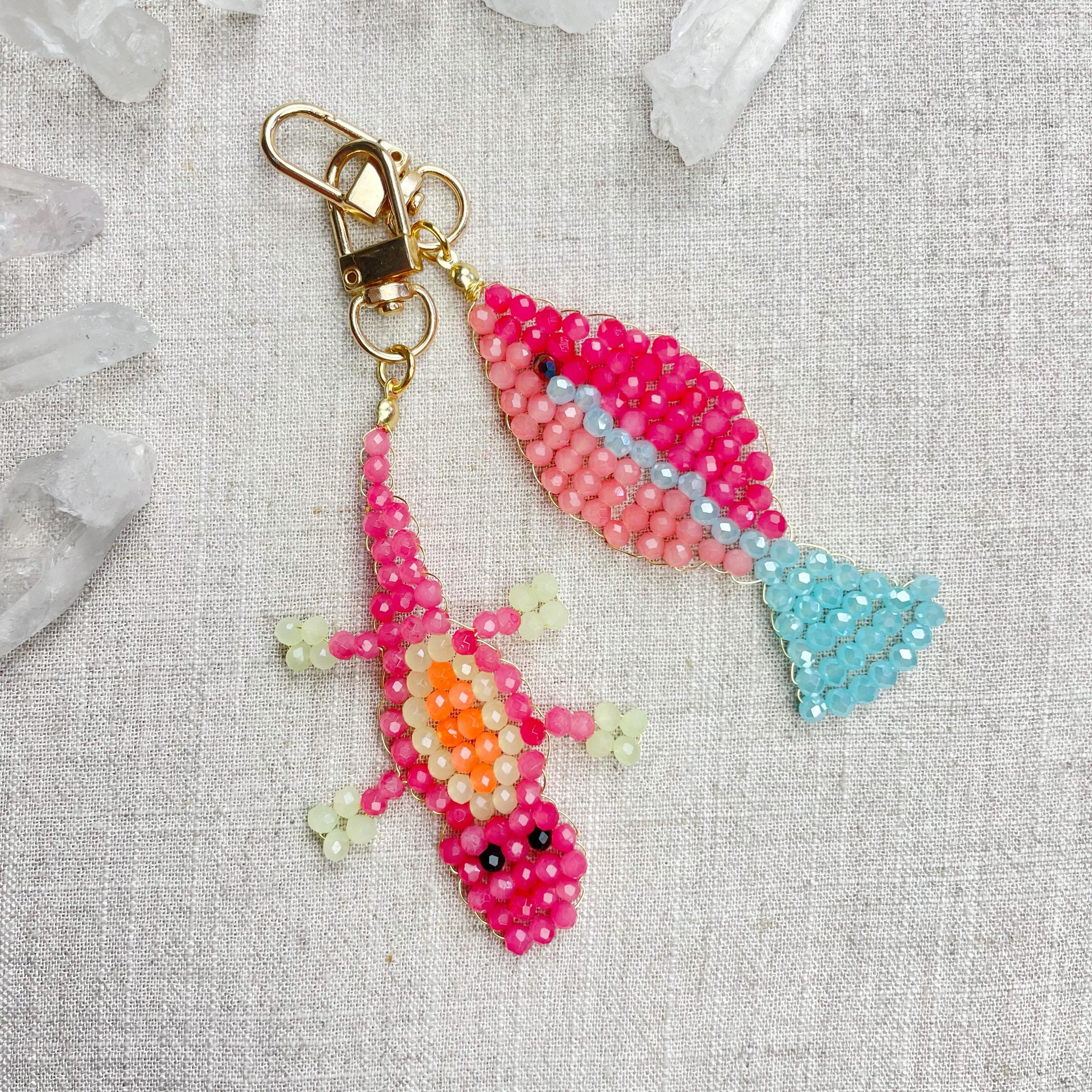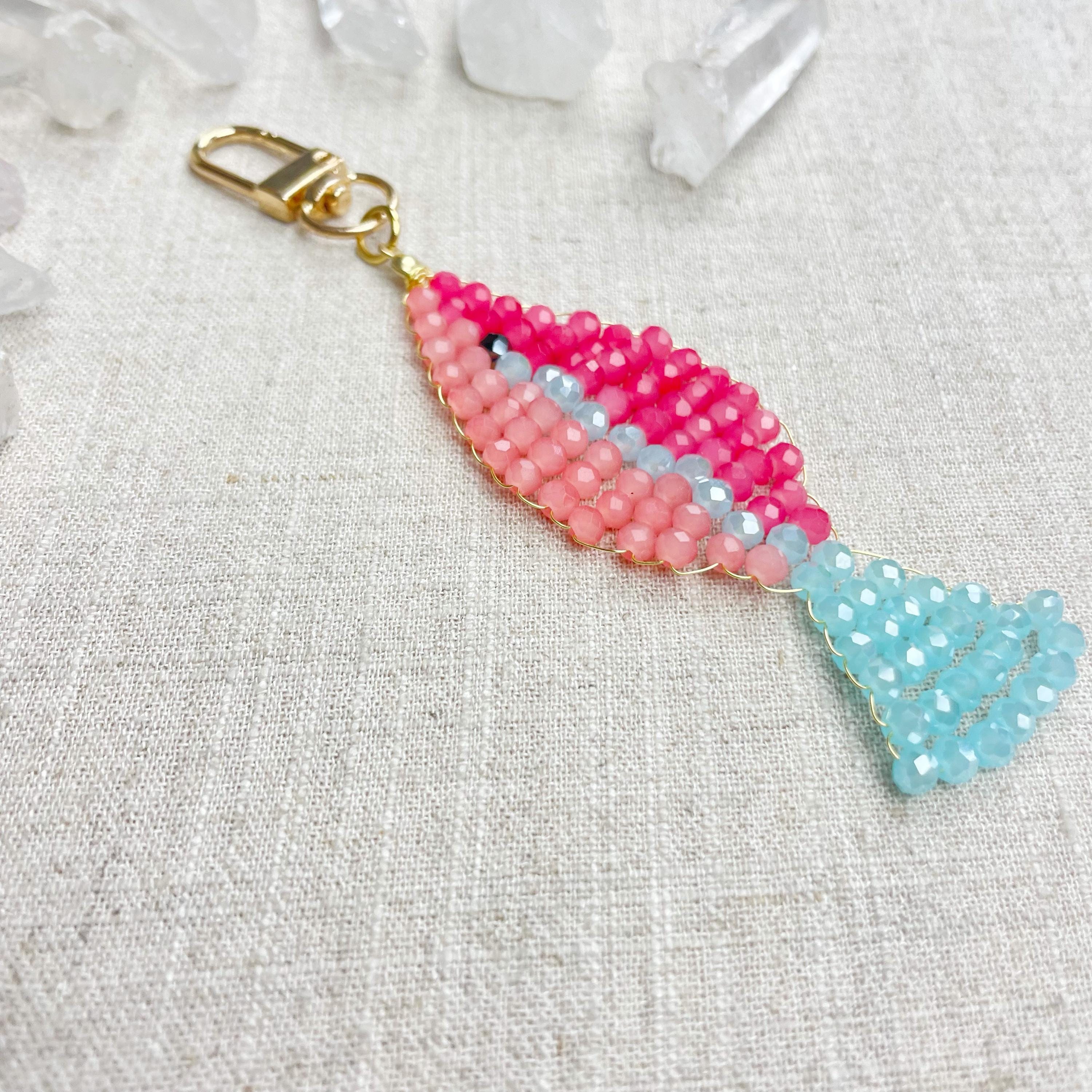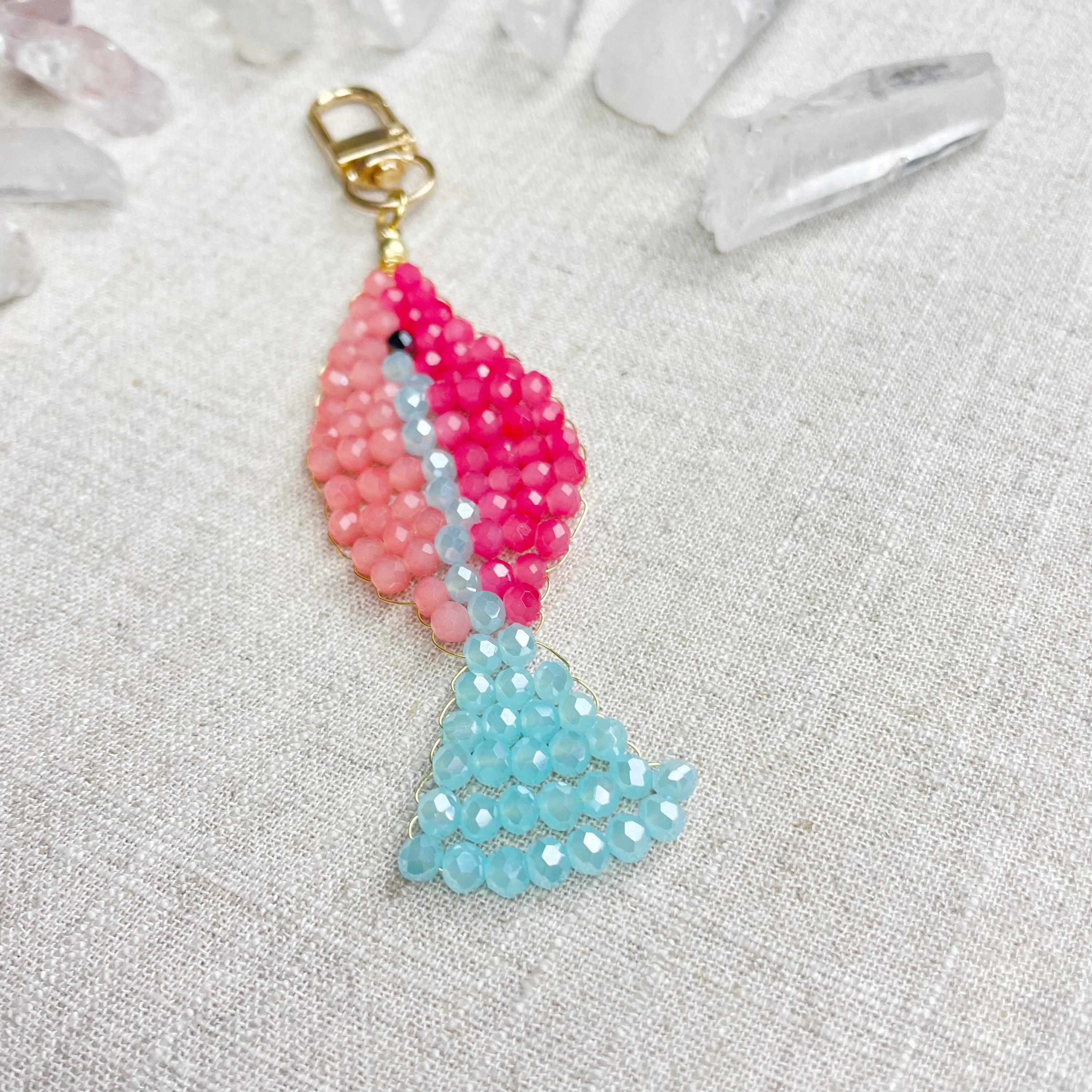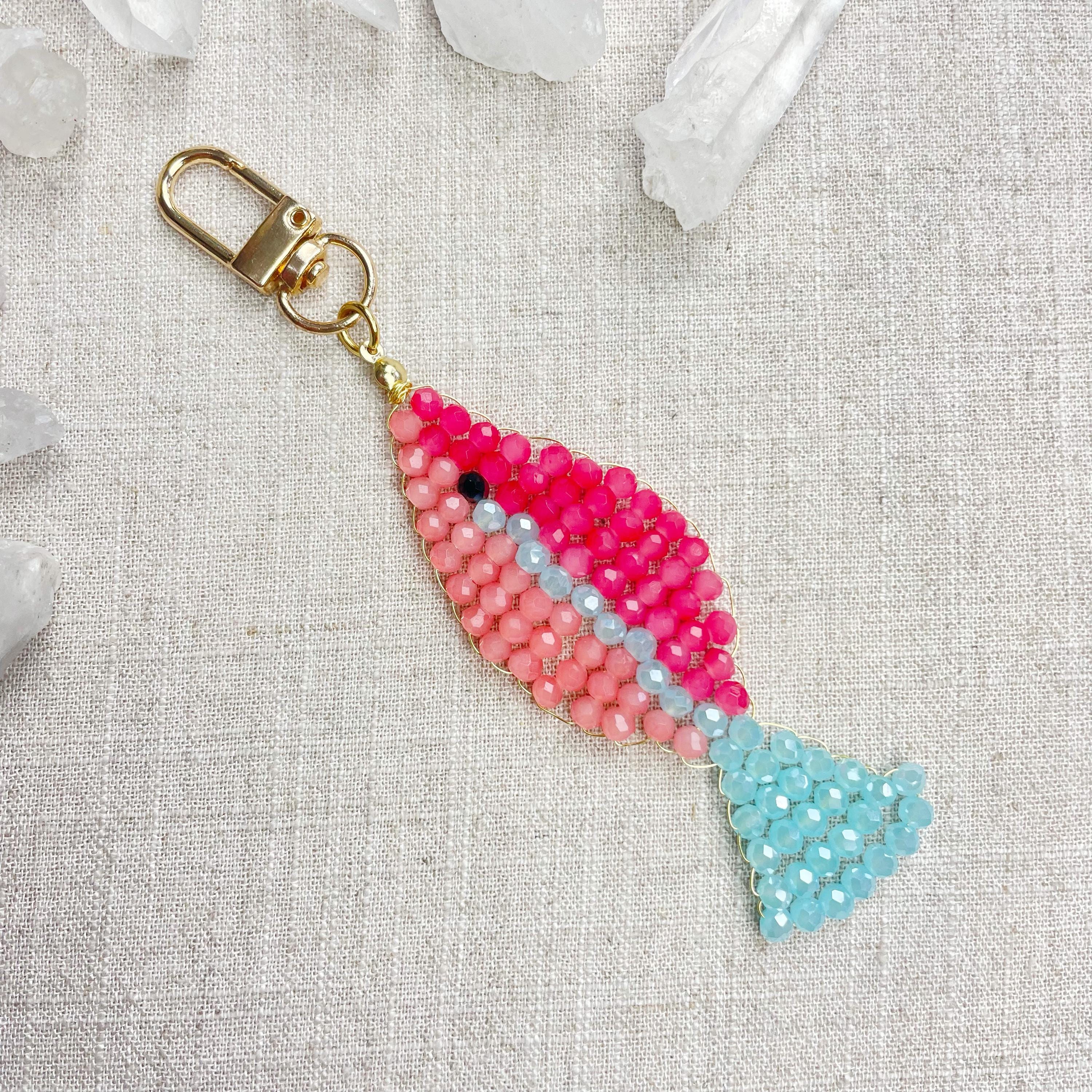 This charm is made from 4mm glass faceted rondelle beads. The beads are woven together with a gold toned wire to create the fish charm. The fish features two different pink colors and a iridescent blue.