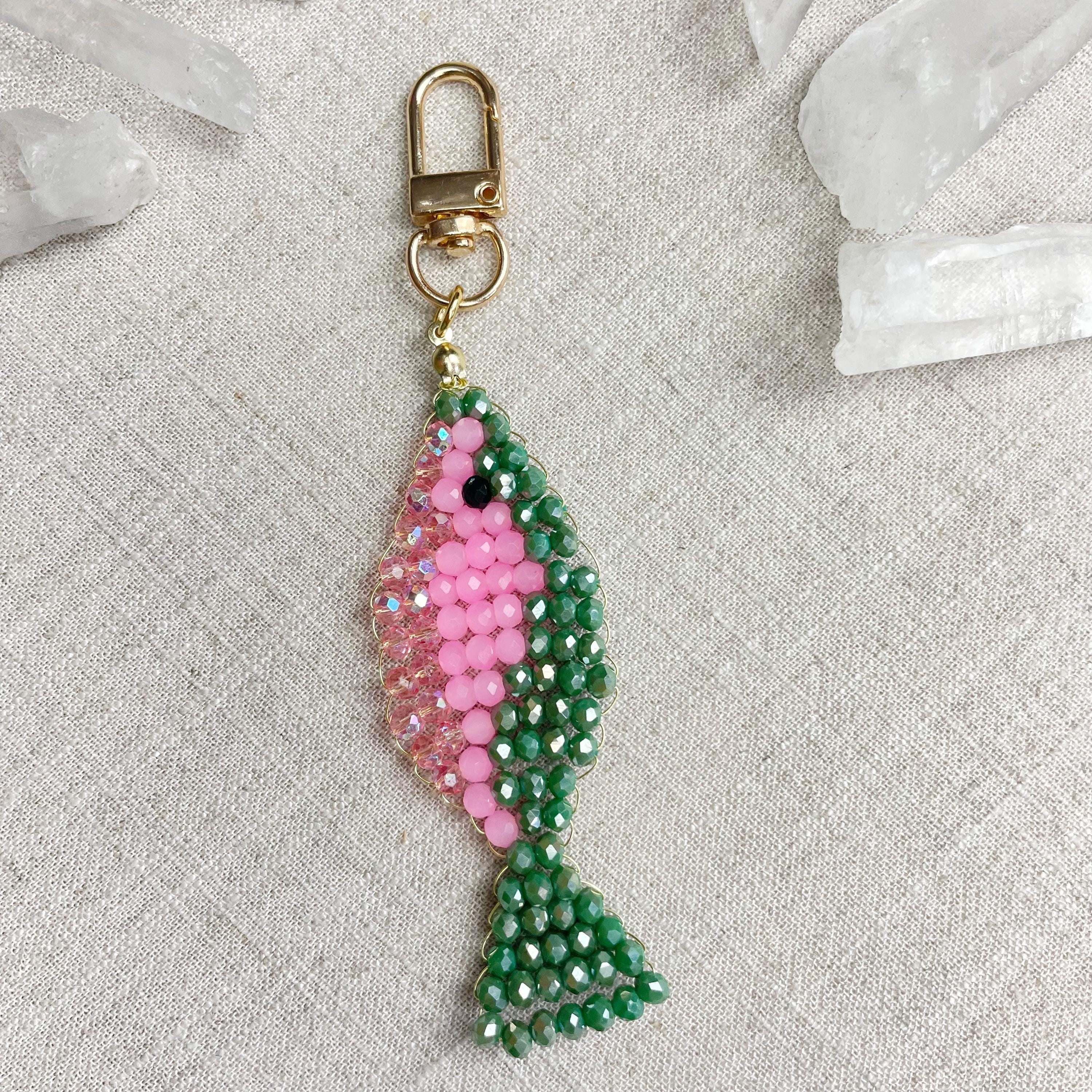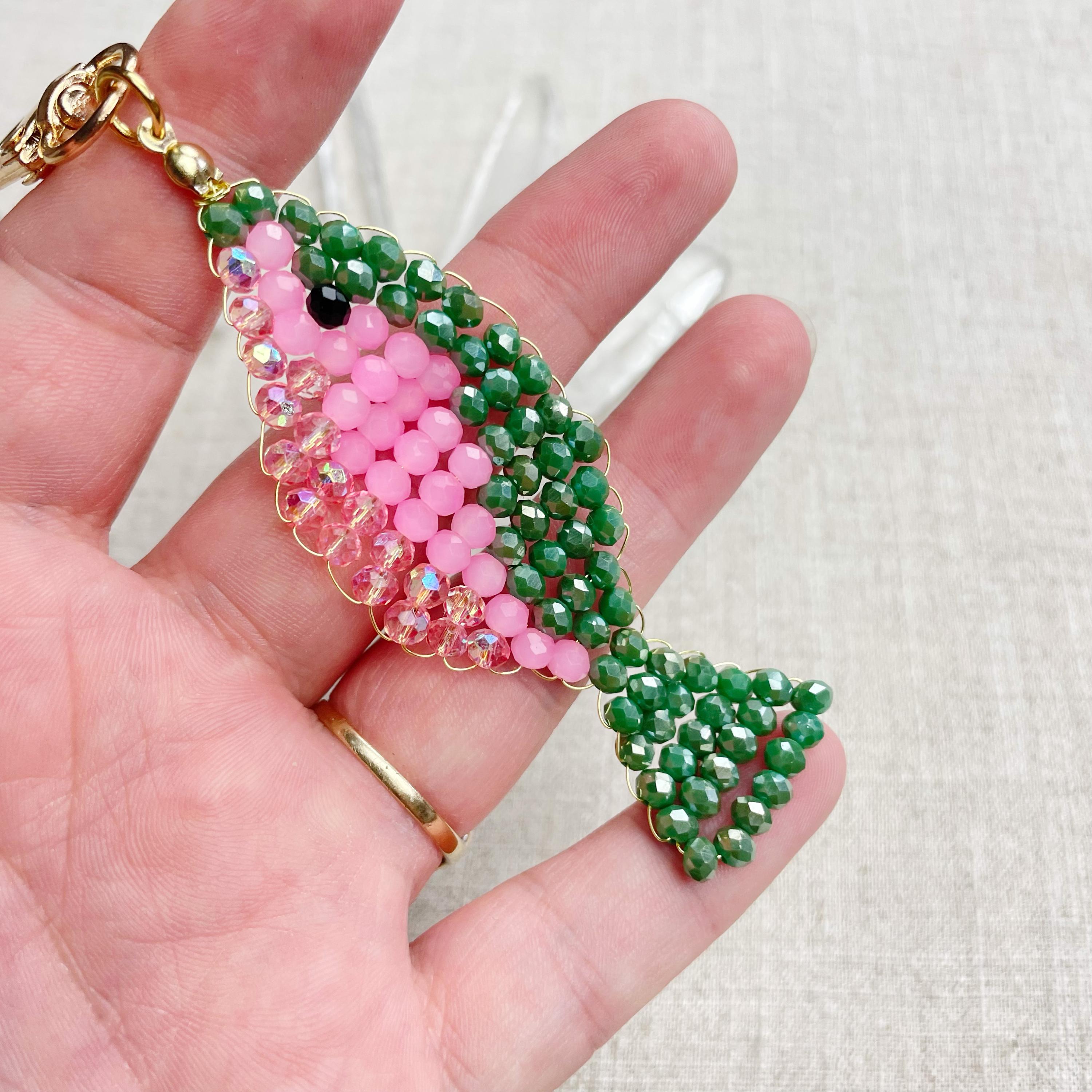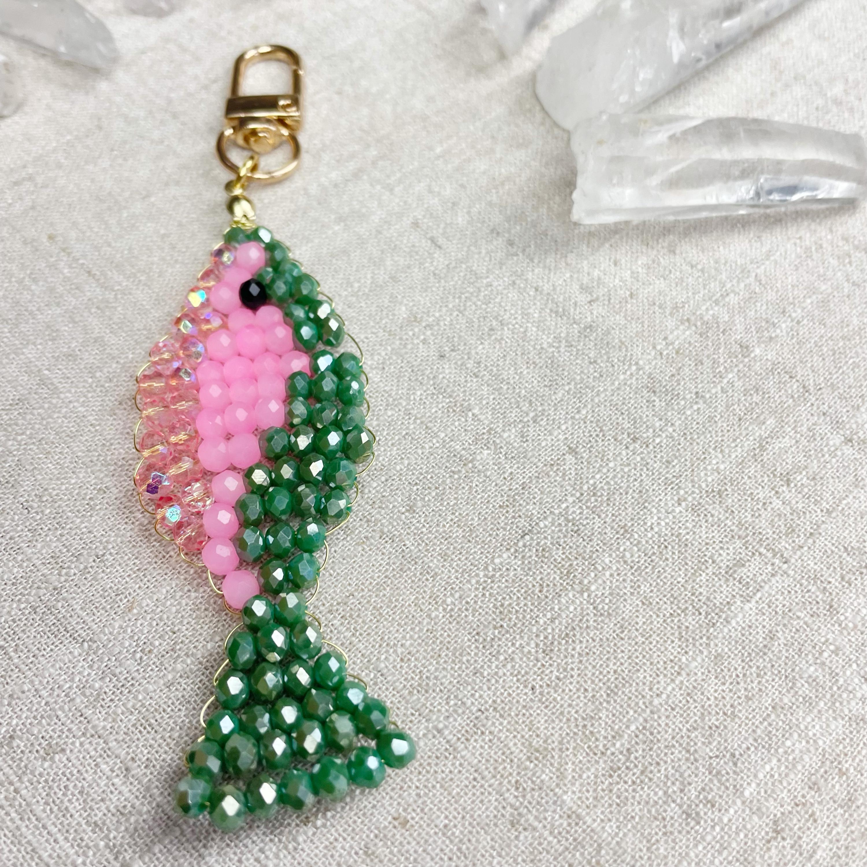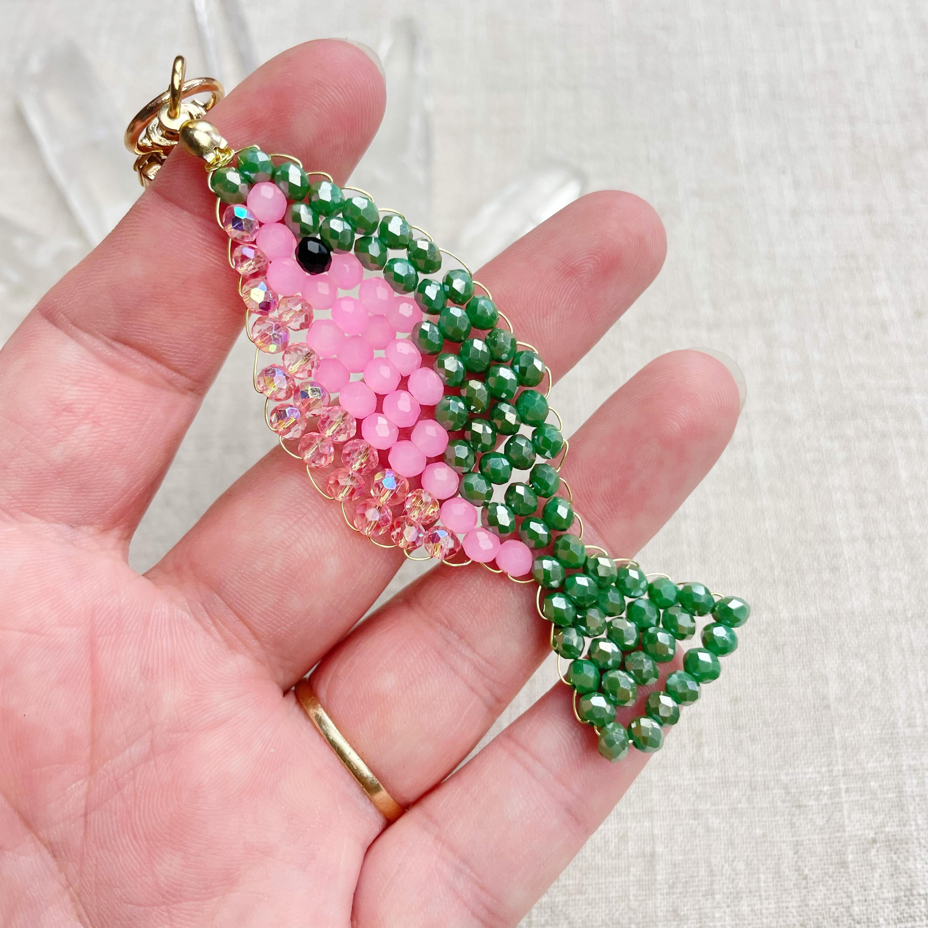 This charm is made from 4mm glass faceted rondelle beads. The beads are woven together with a gold toned wire to create the fish charm. The fish features iridescent green, neon pink and iridescent pink color beads.