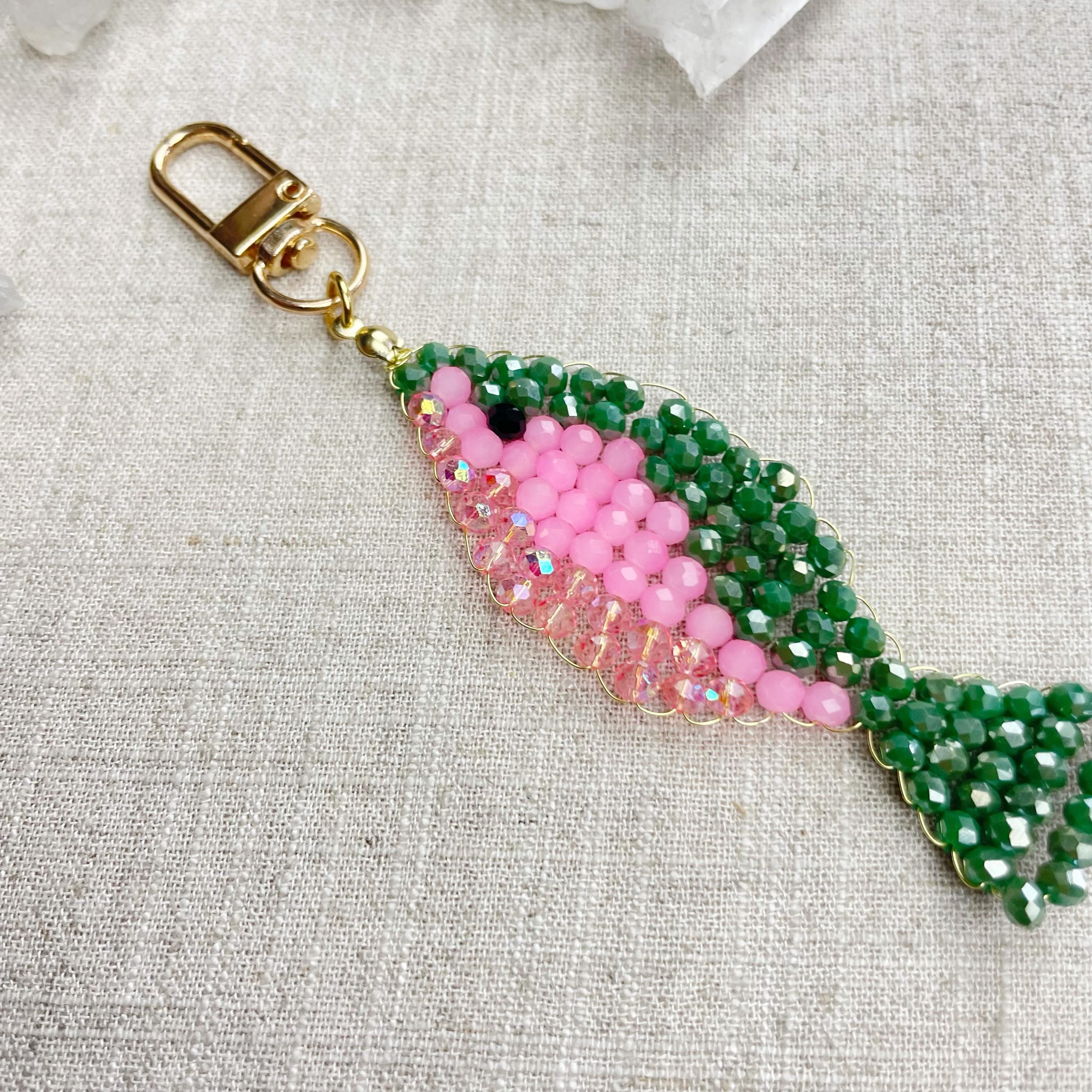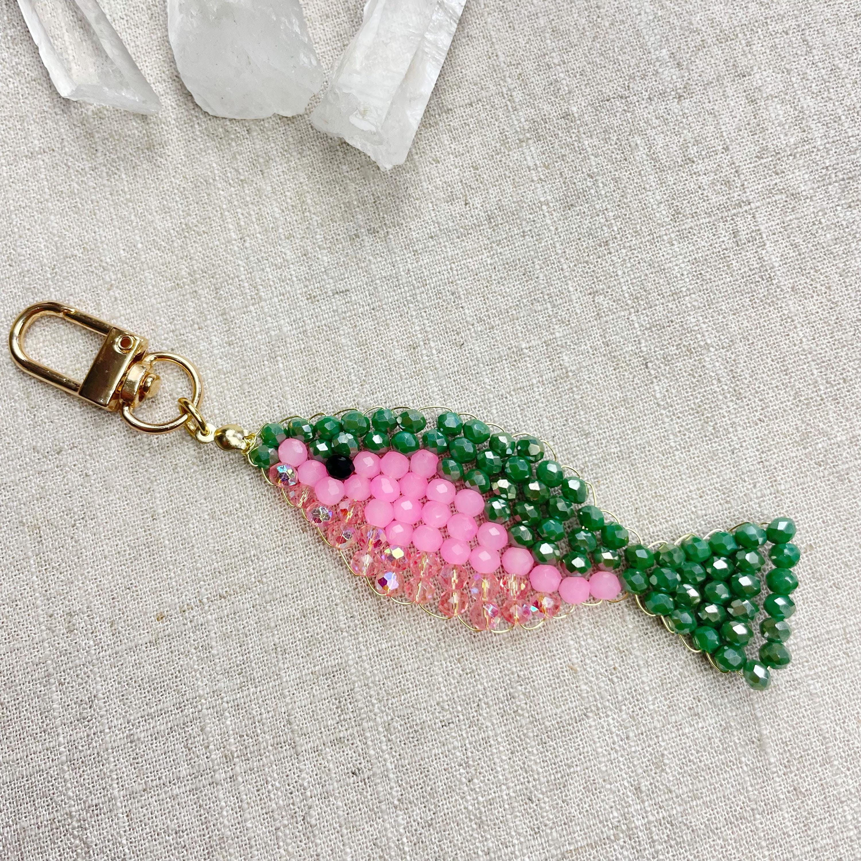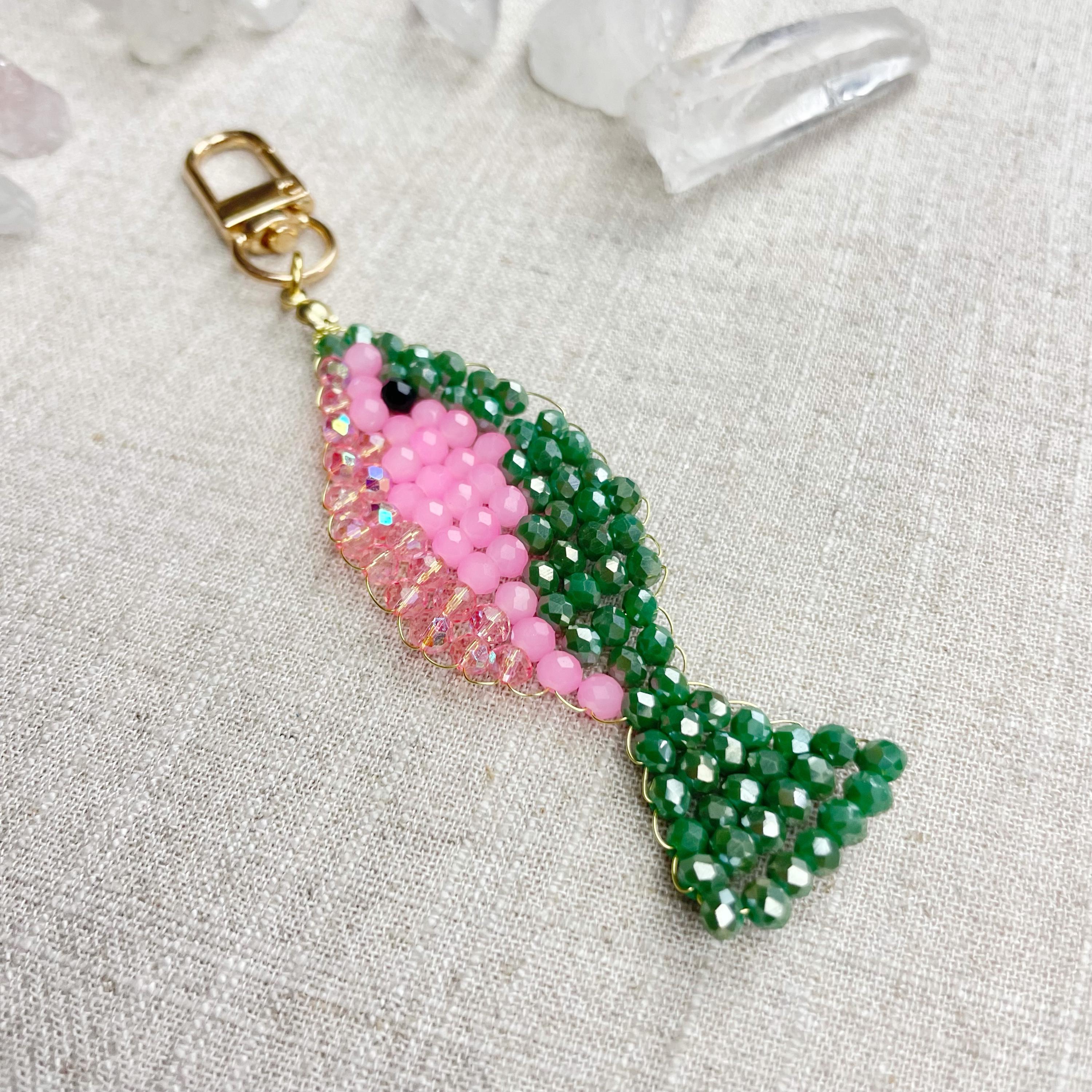 This charm is made from 4mm glass faceted rondelle beads. The beads are woven together with a gold toned wire to create the fish charm. The fish features iridescent green, neon pink and iridescent pink color beads.