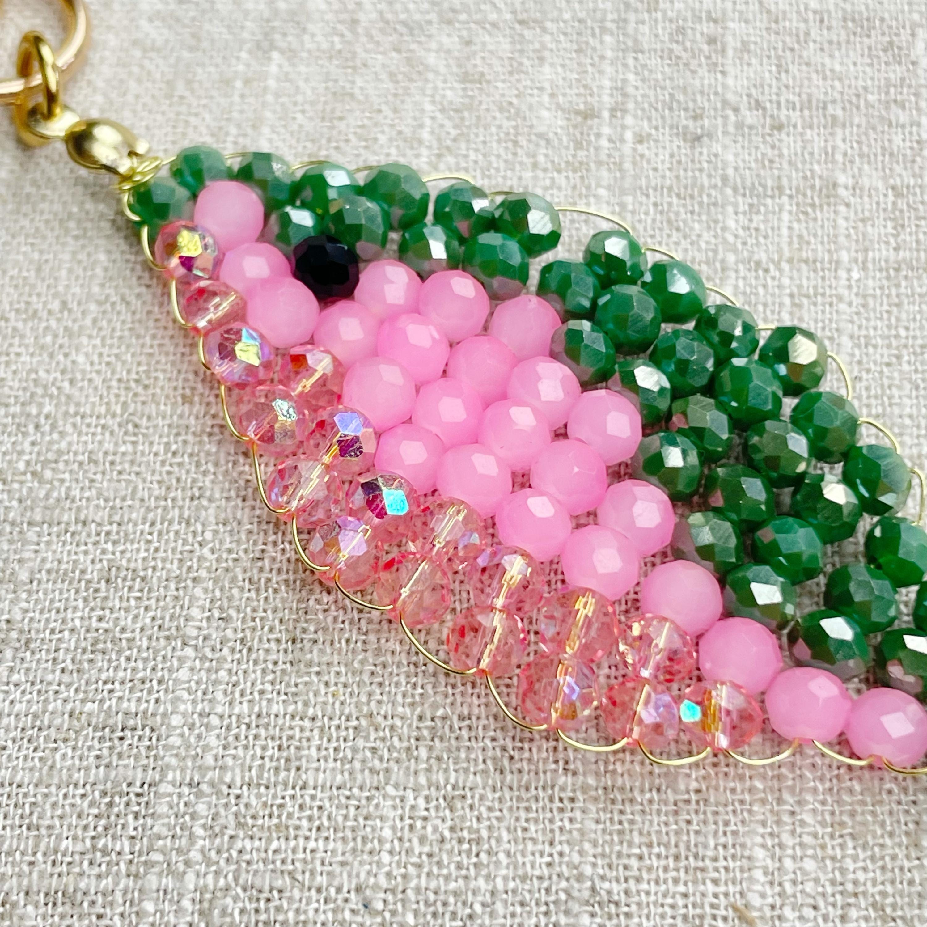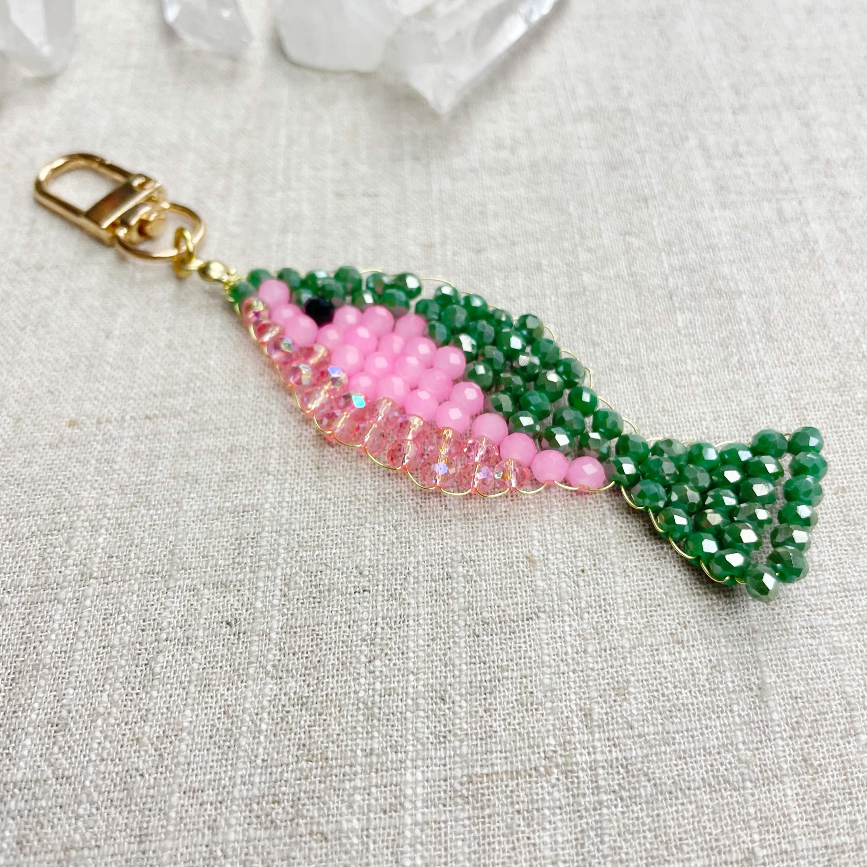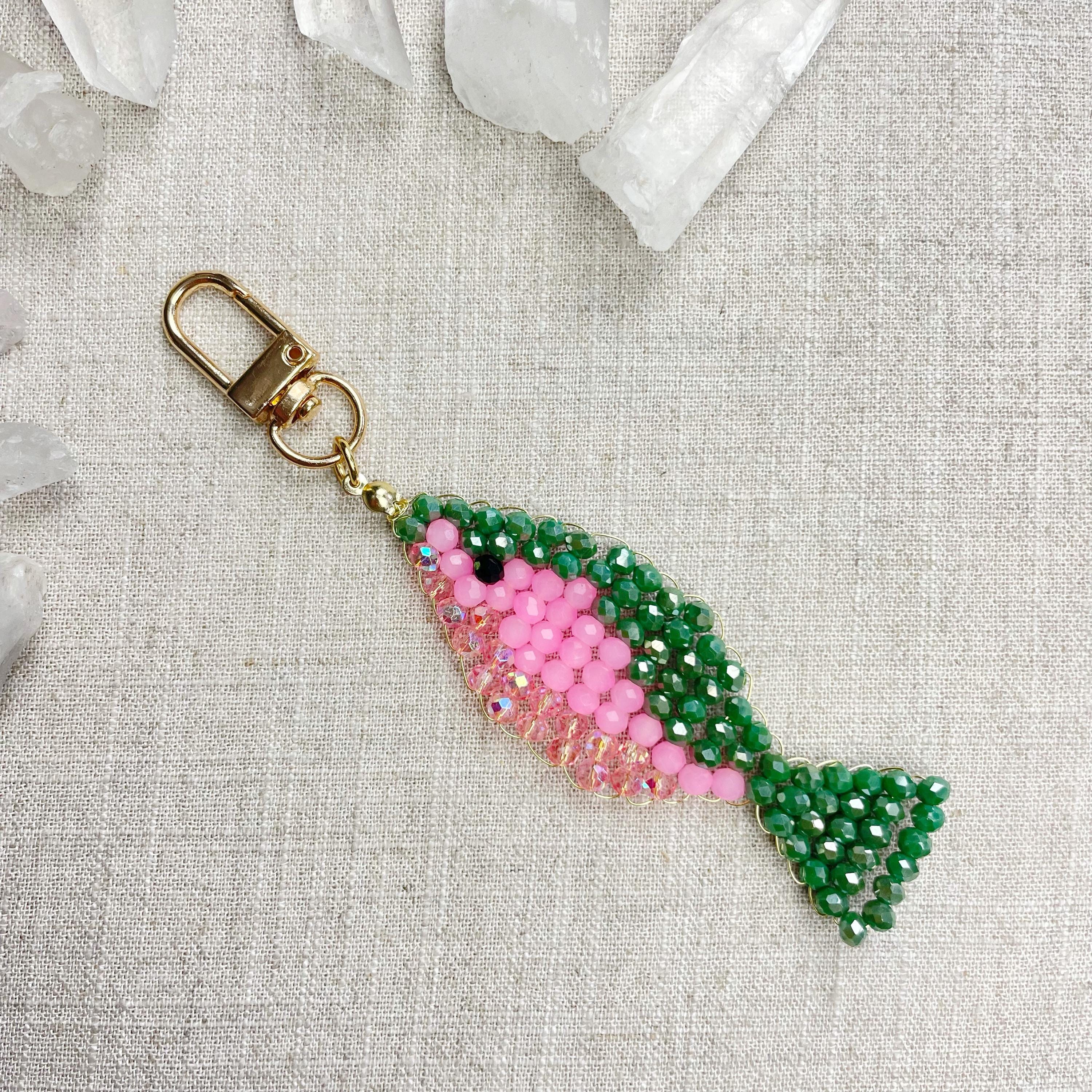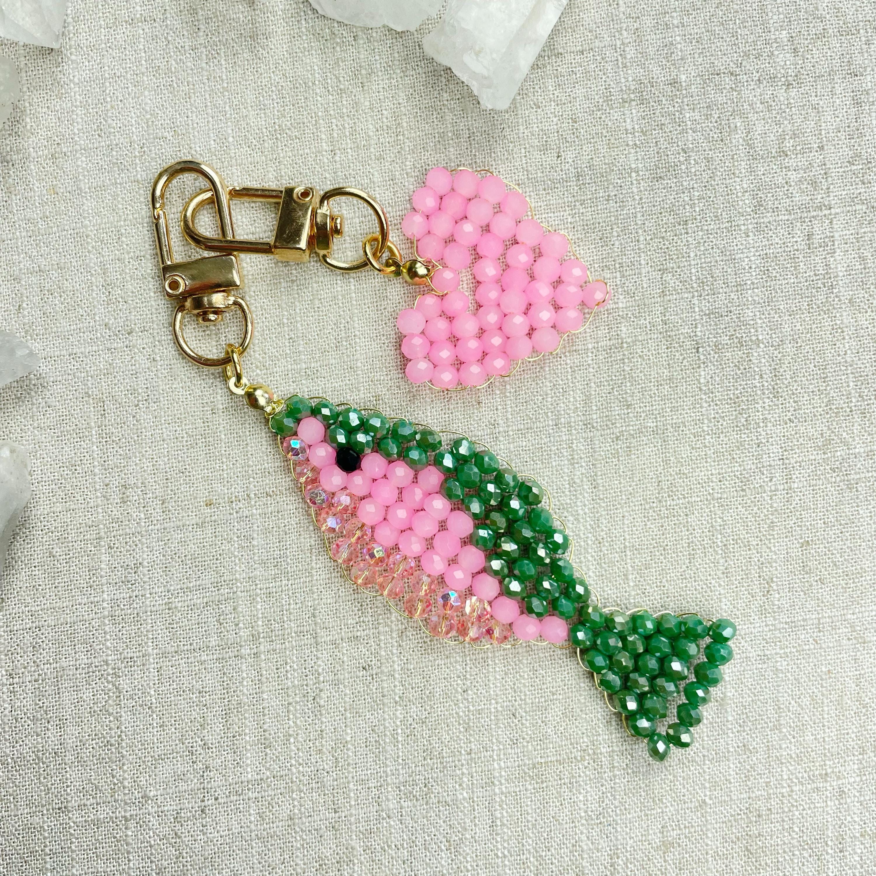 This charm is made from 4mm glass faceted rondelle beads. The beads are woven together with a gold toned wire to create the fish charm. The fish features iridescent green, neon pink and iridescent pink color beads.