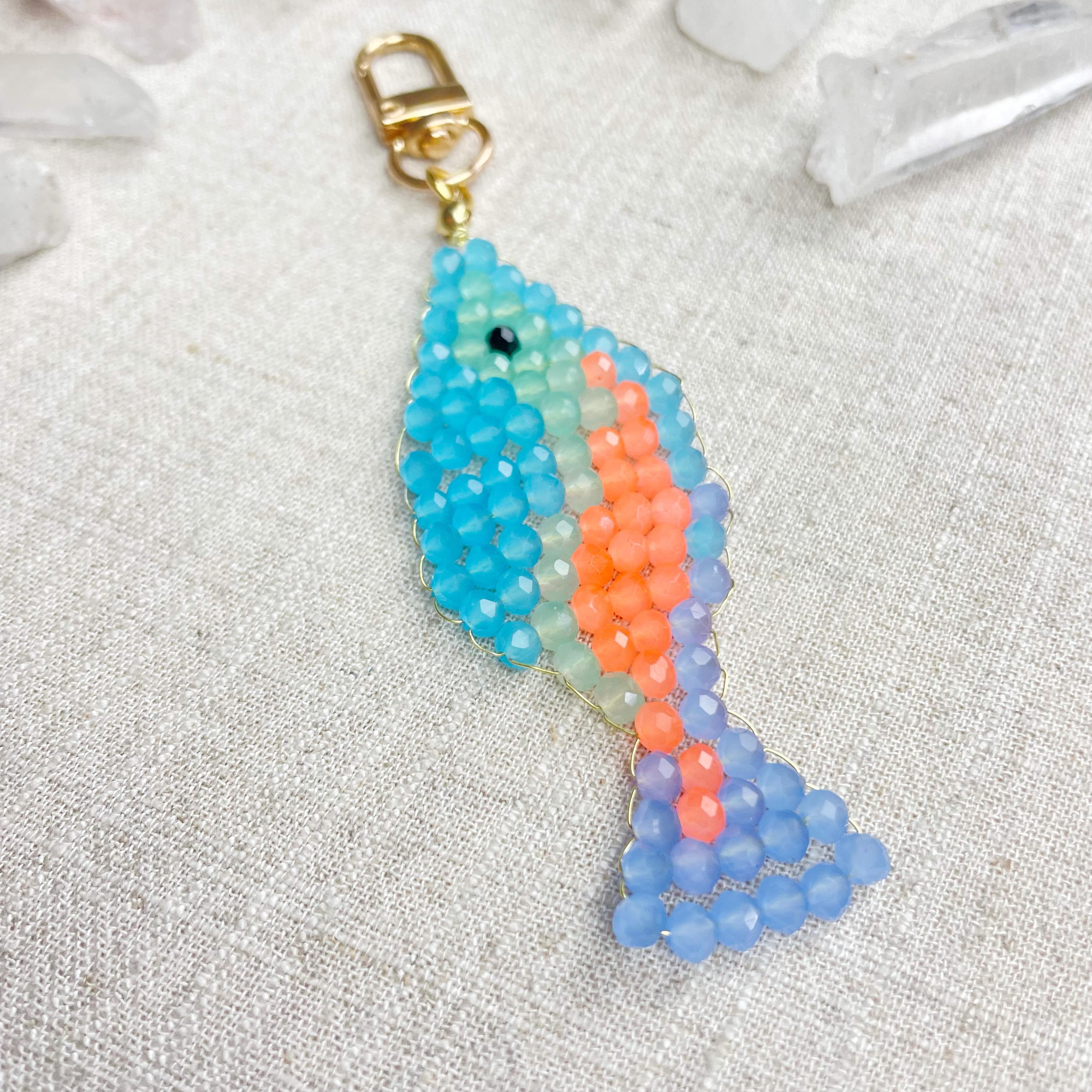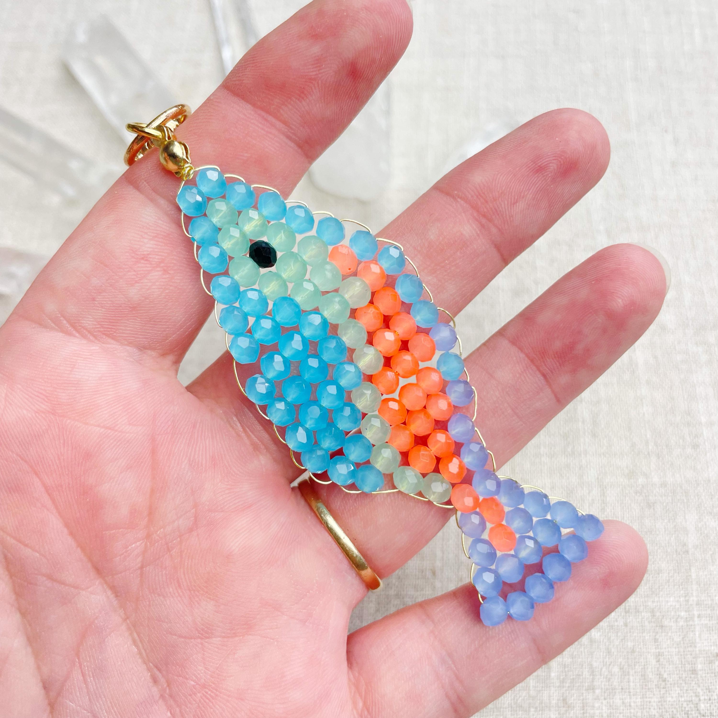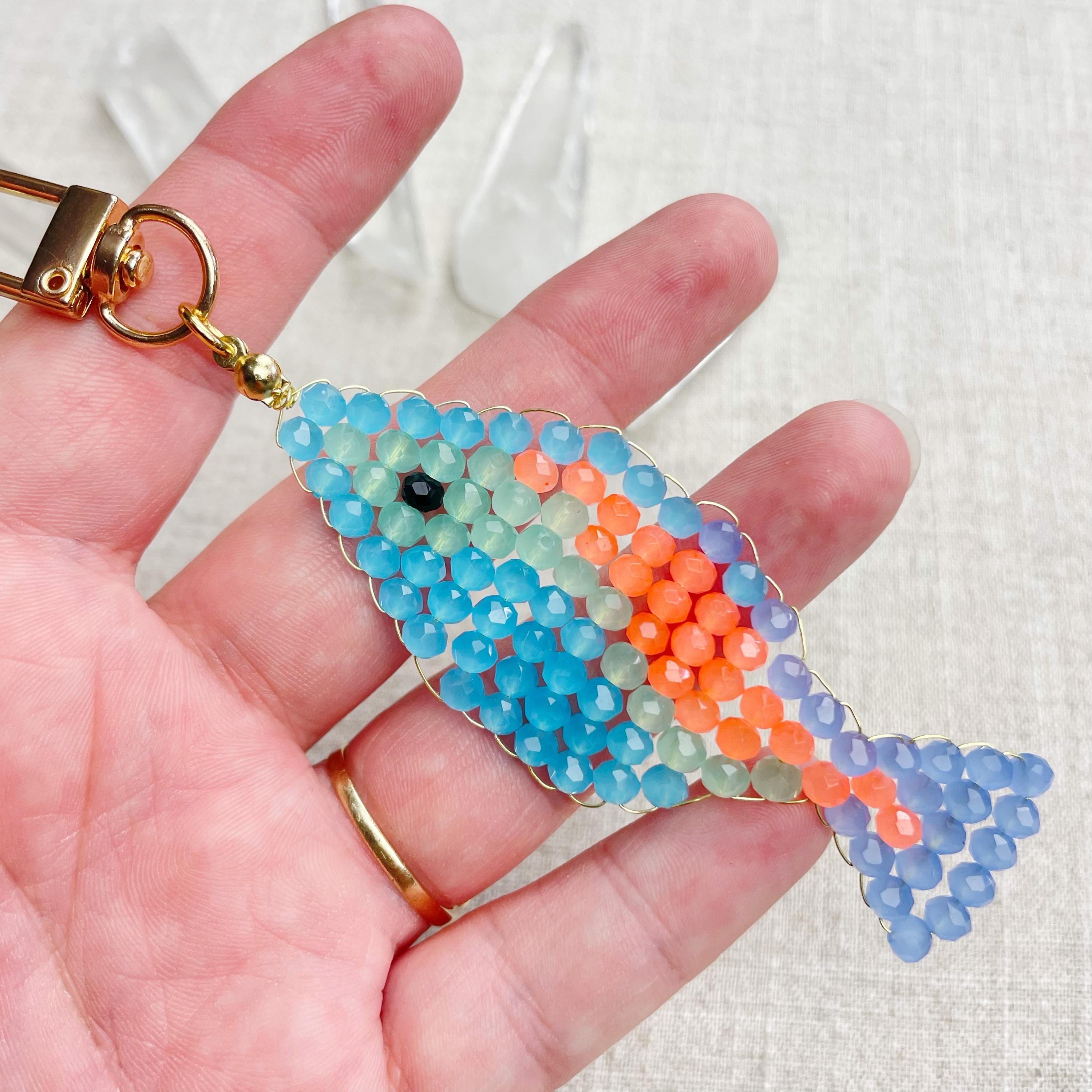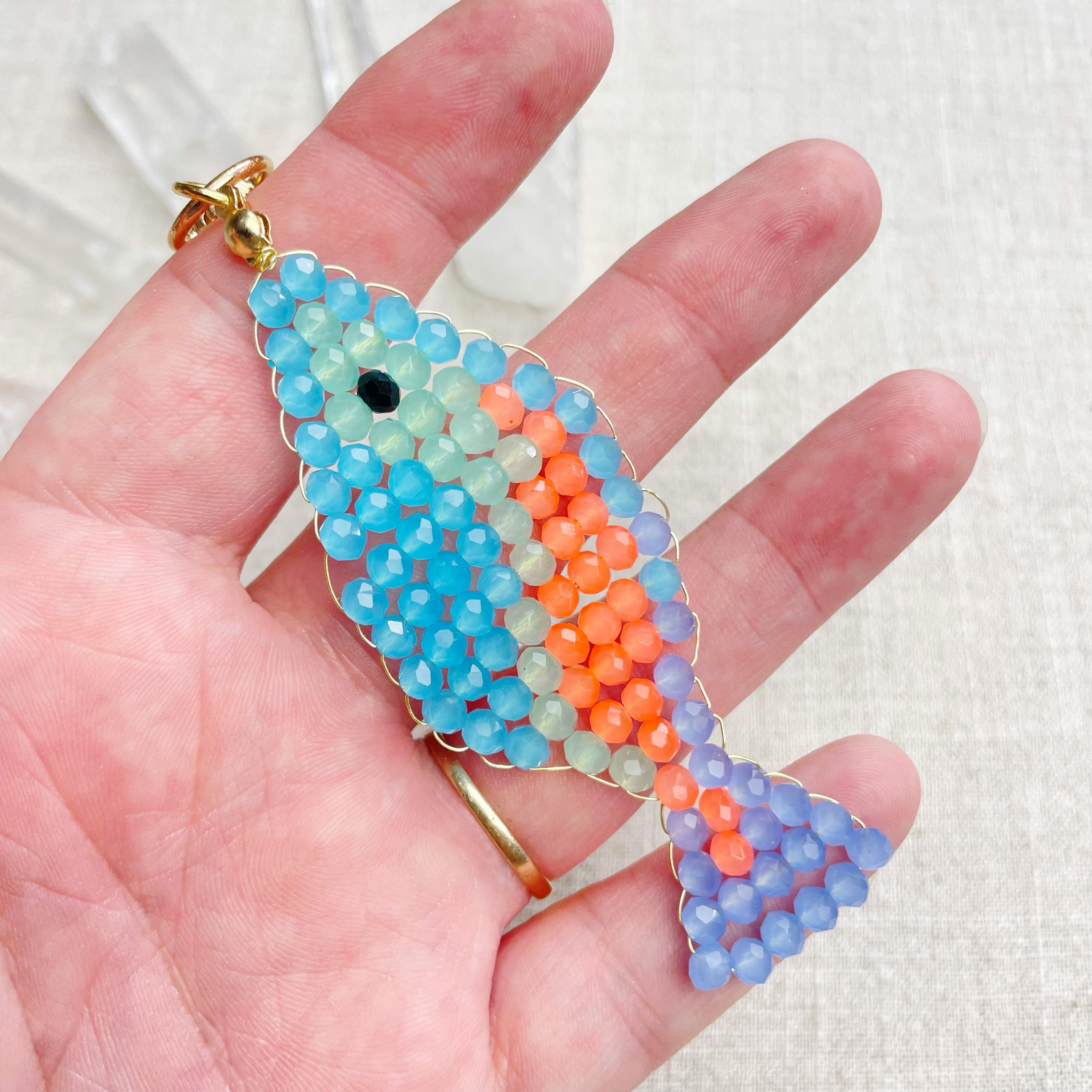 This charm is made from 4mm glass faceted rondelle beads. The beads are woven together with a gold toned wire to create the fish charm. The fish features blue, mint green, periwinkle and neon orange color beads.