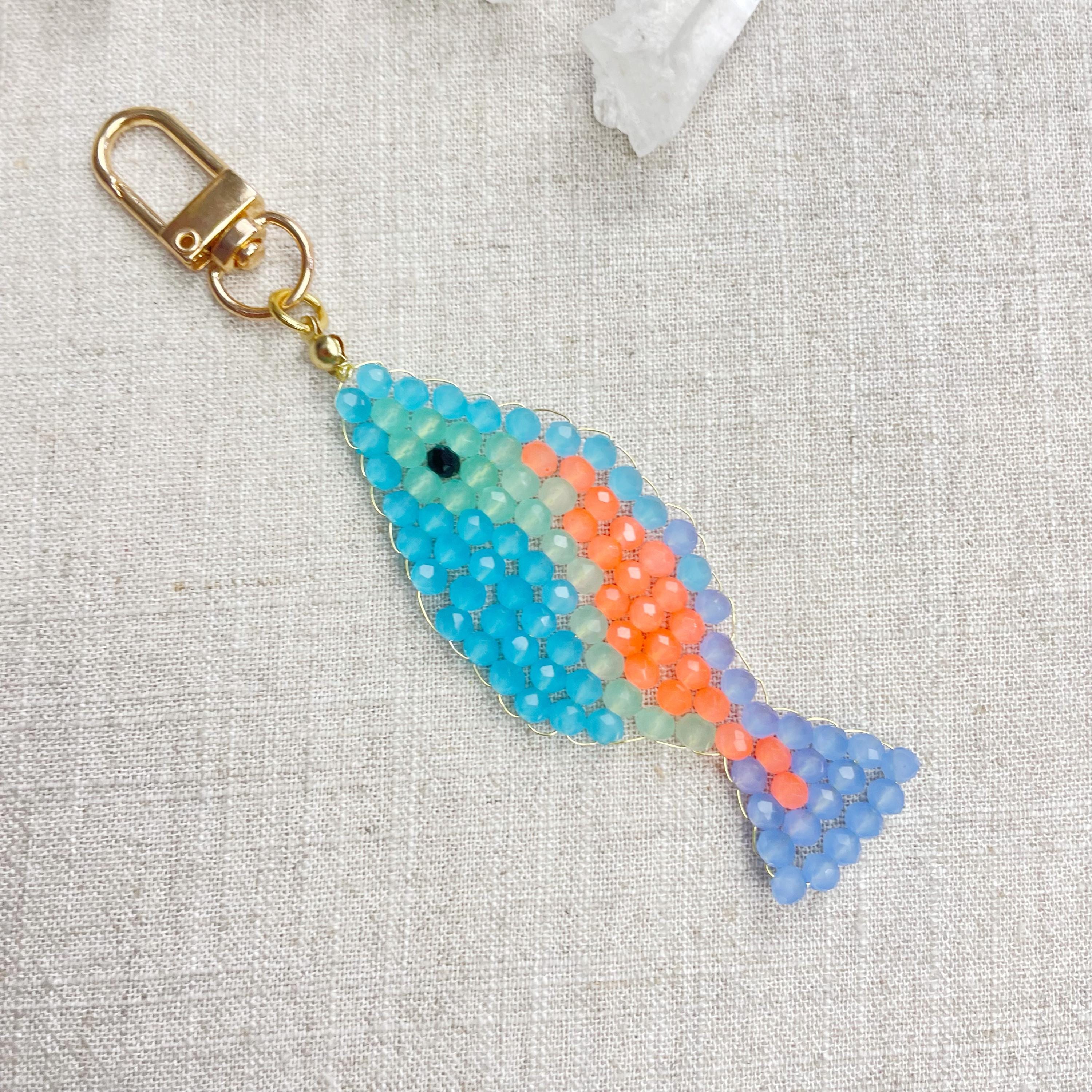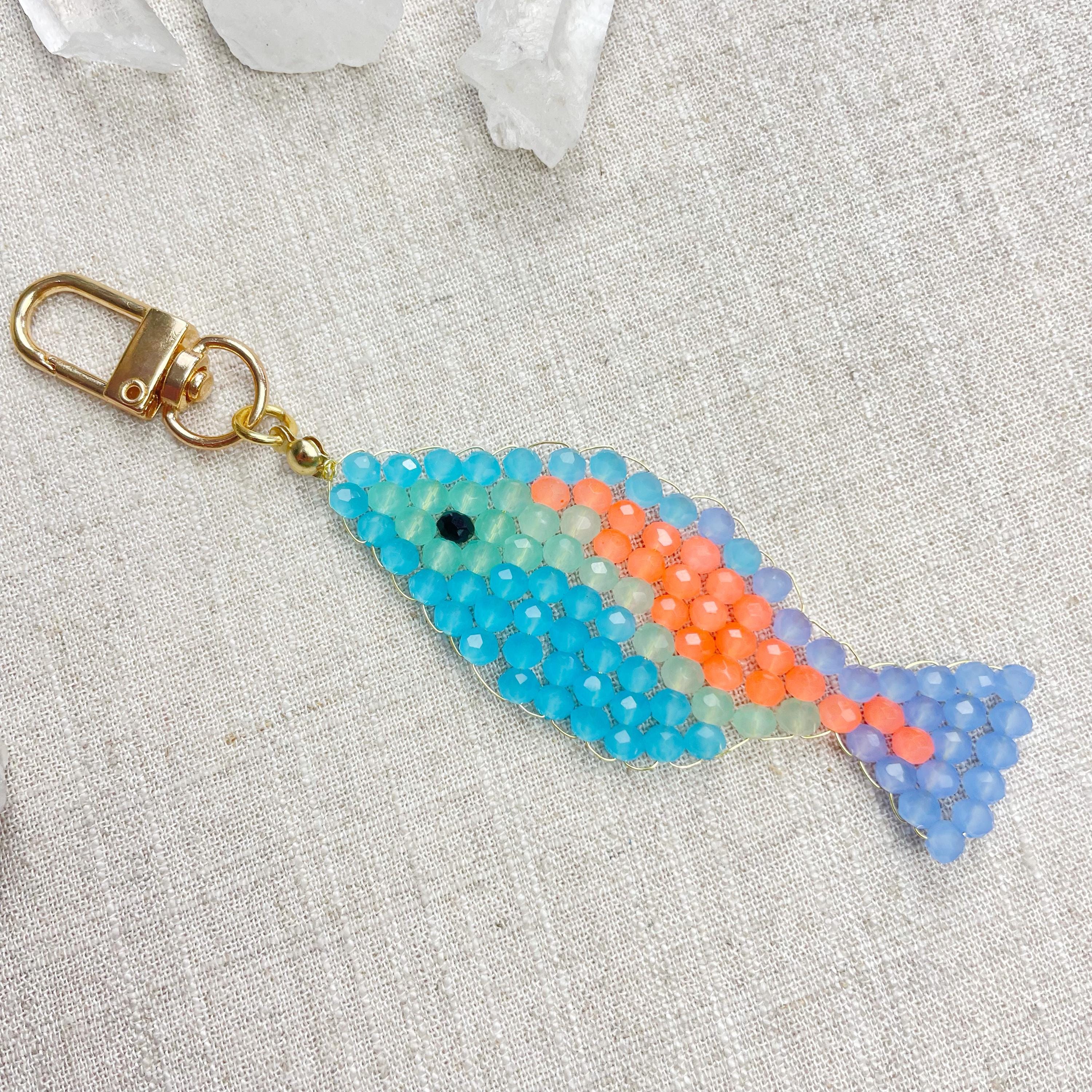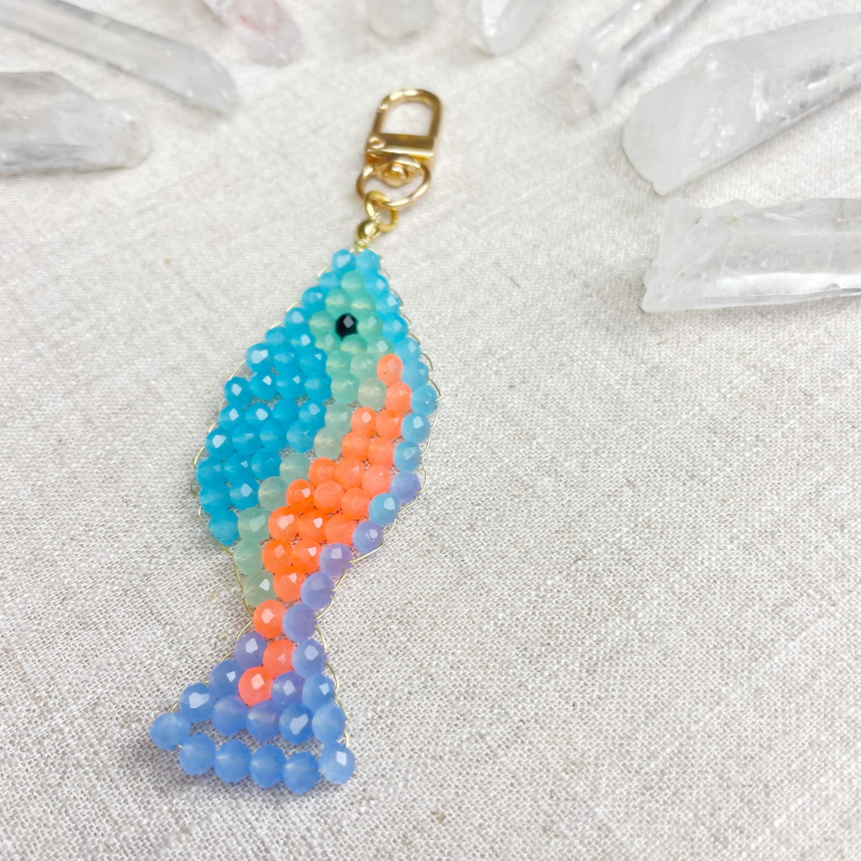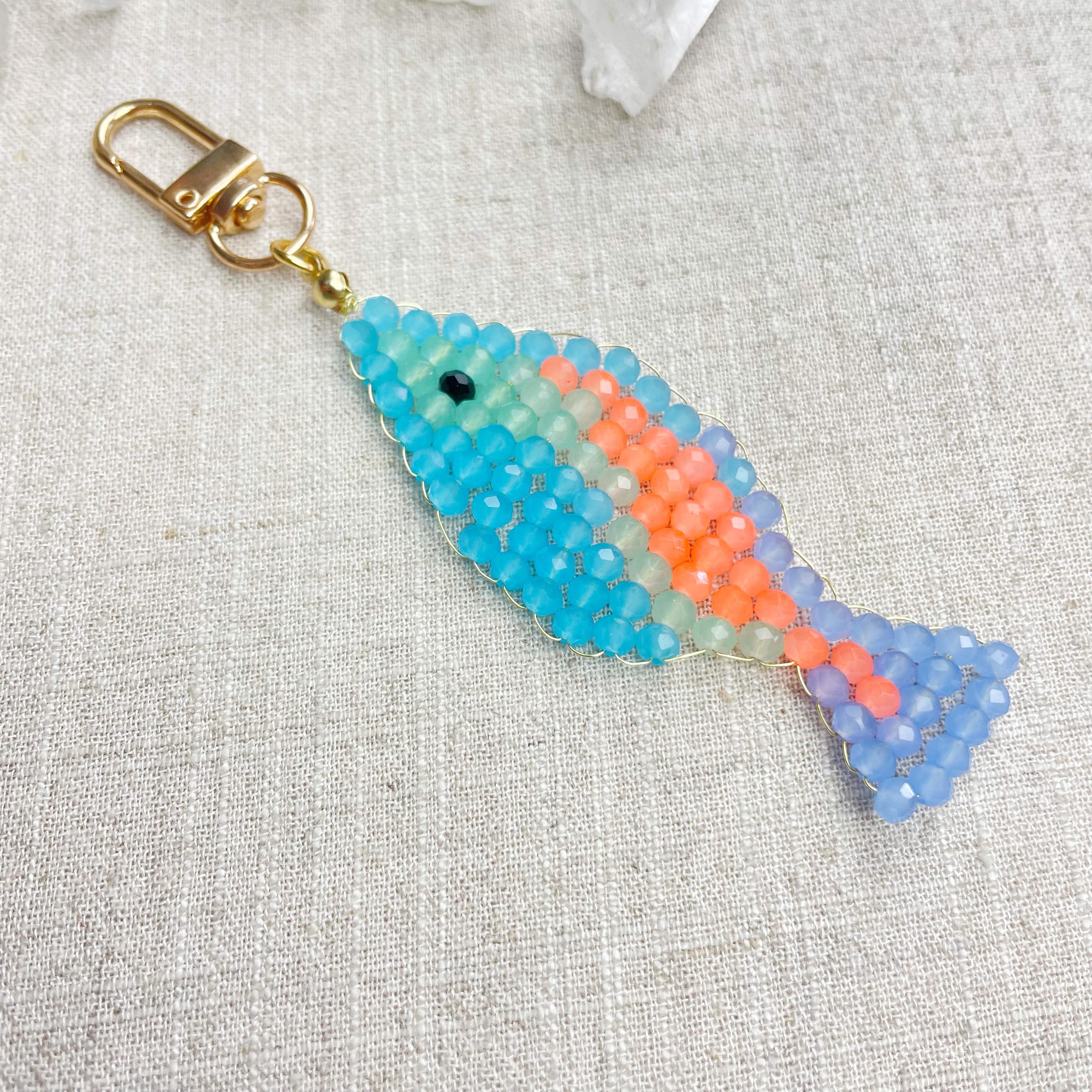 This charm is made from 4mm glass faceted rondelle beads. The beads are woven together with a gold toned wire to create the fish charm. The fish features blue, mint green, periwinkle and neon orange color beads.
