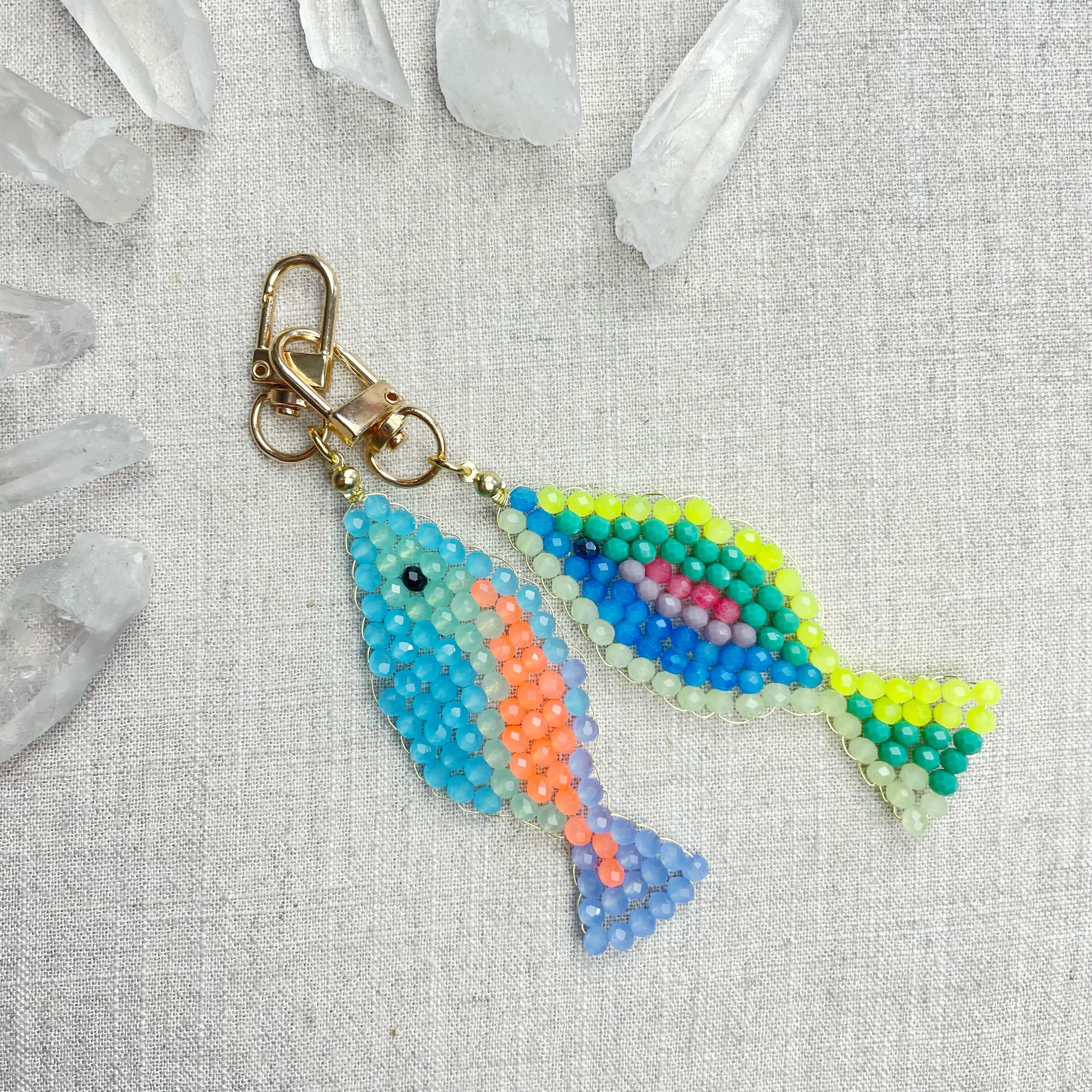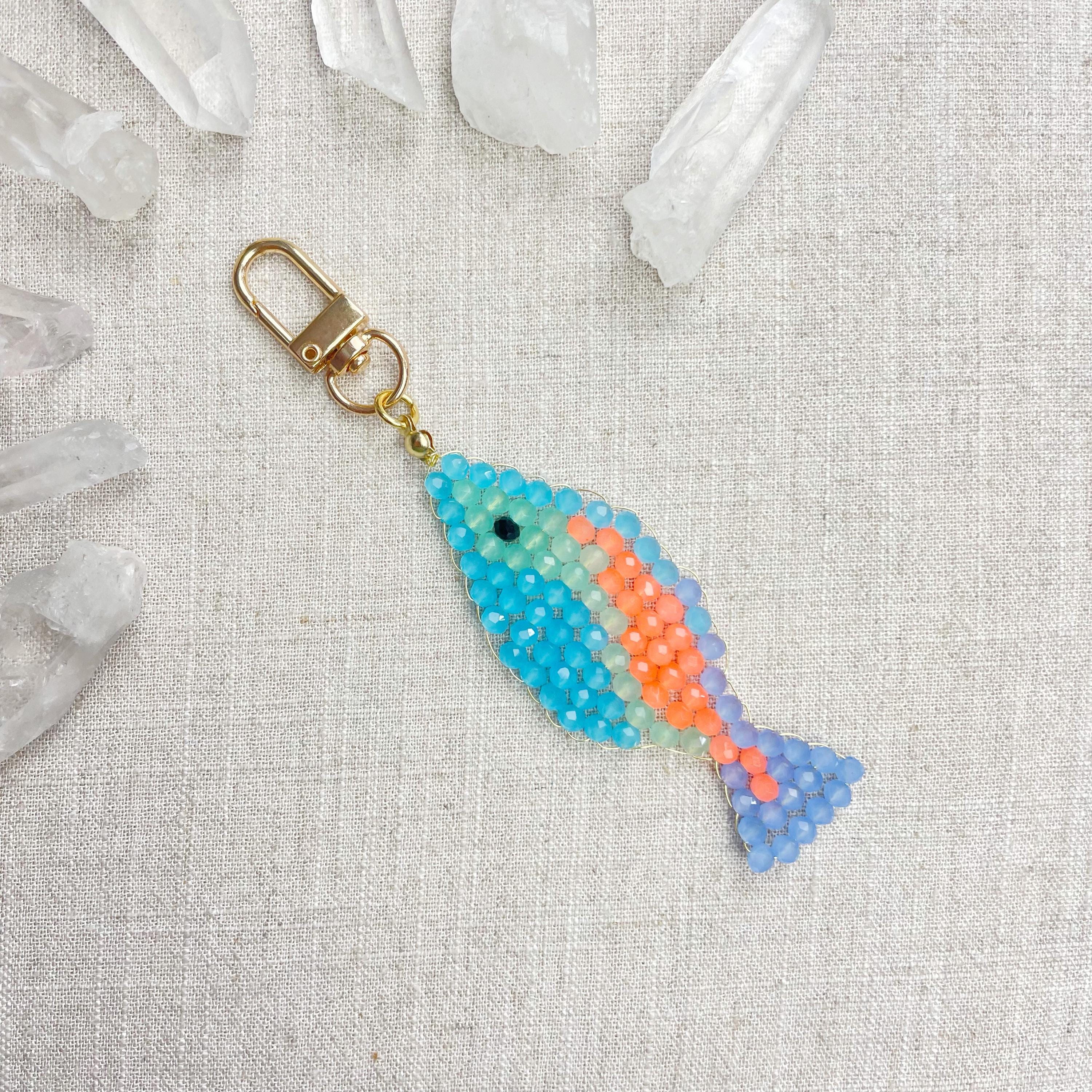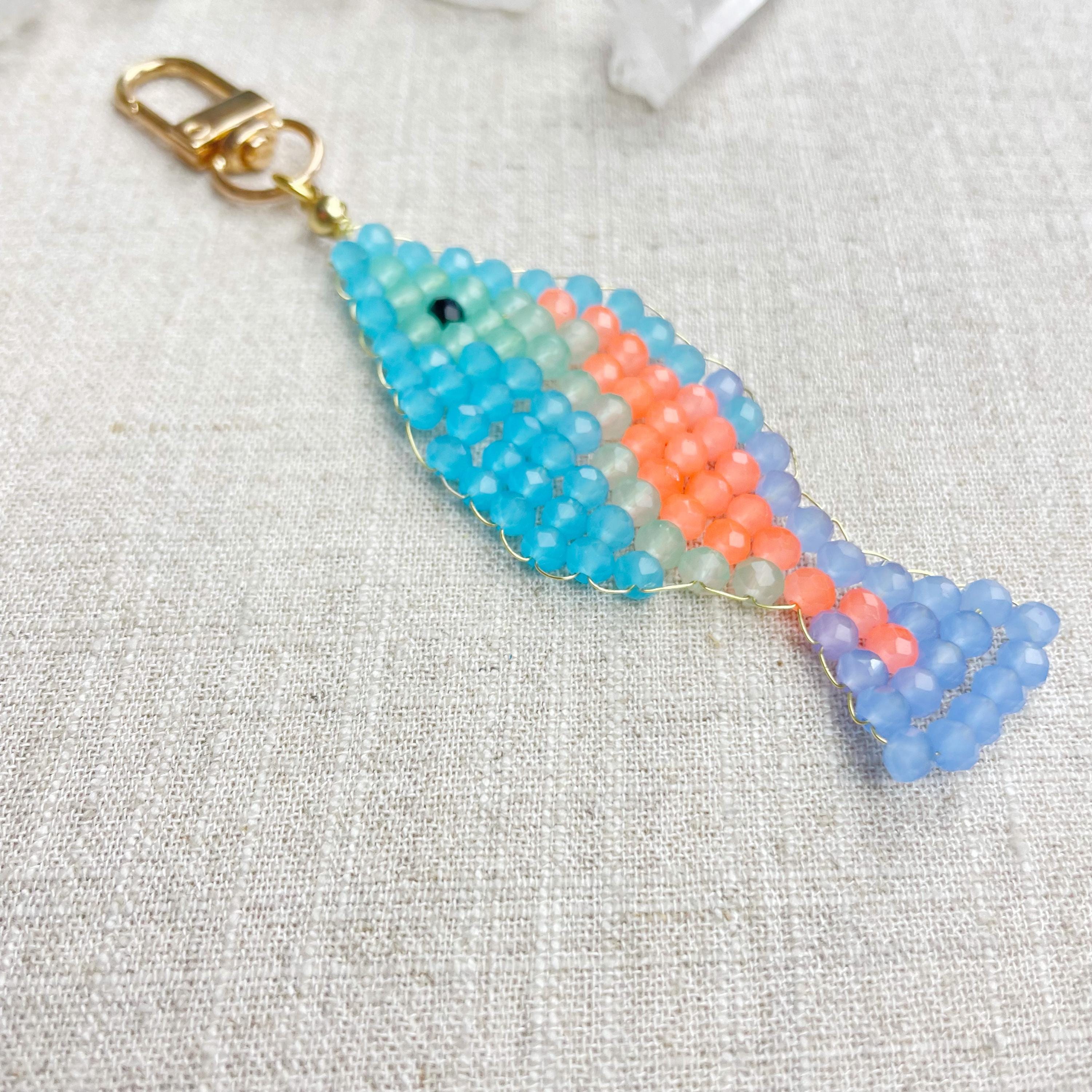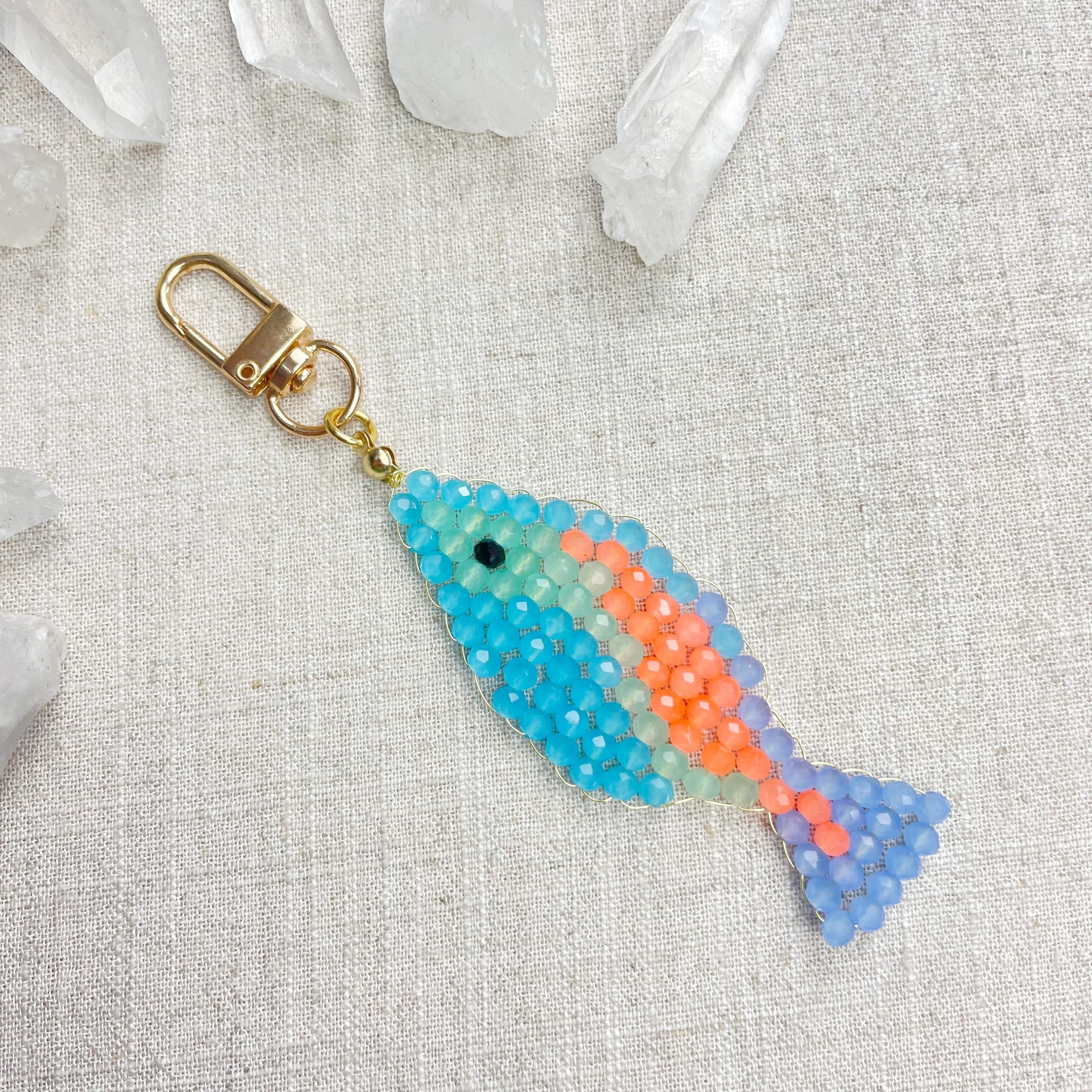 This charm is made from 4mm glass faceted rondelle beads. The beads are woven together with a gold toned wire to create the fish charm. The fish features blue, mint green, periwinkle and neon orange color beads.