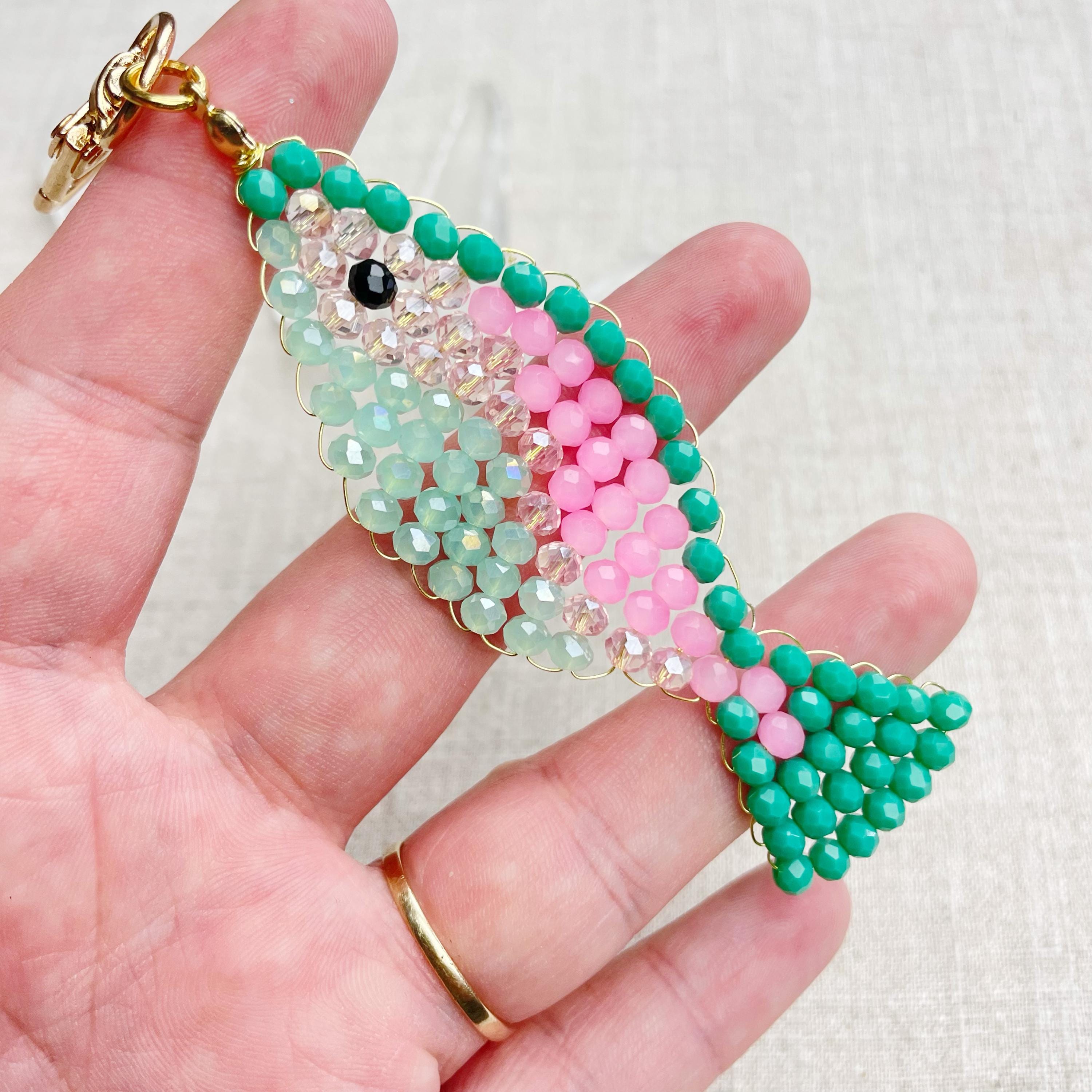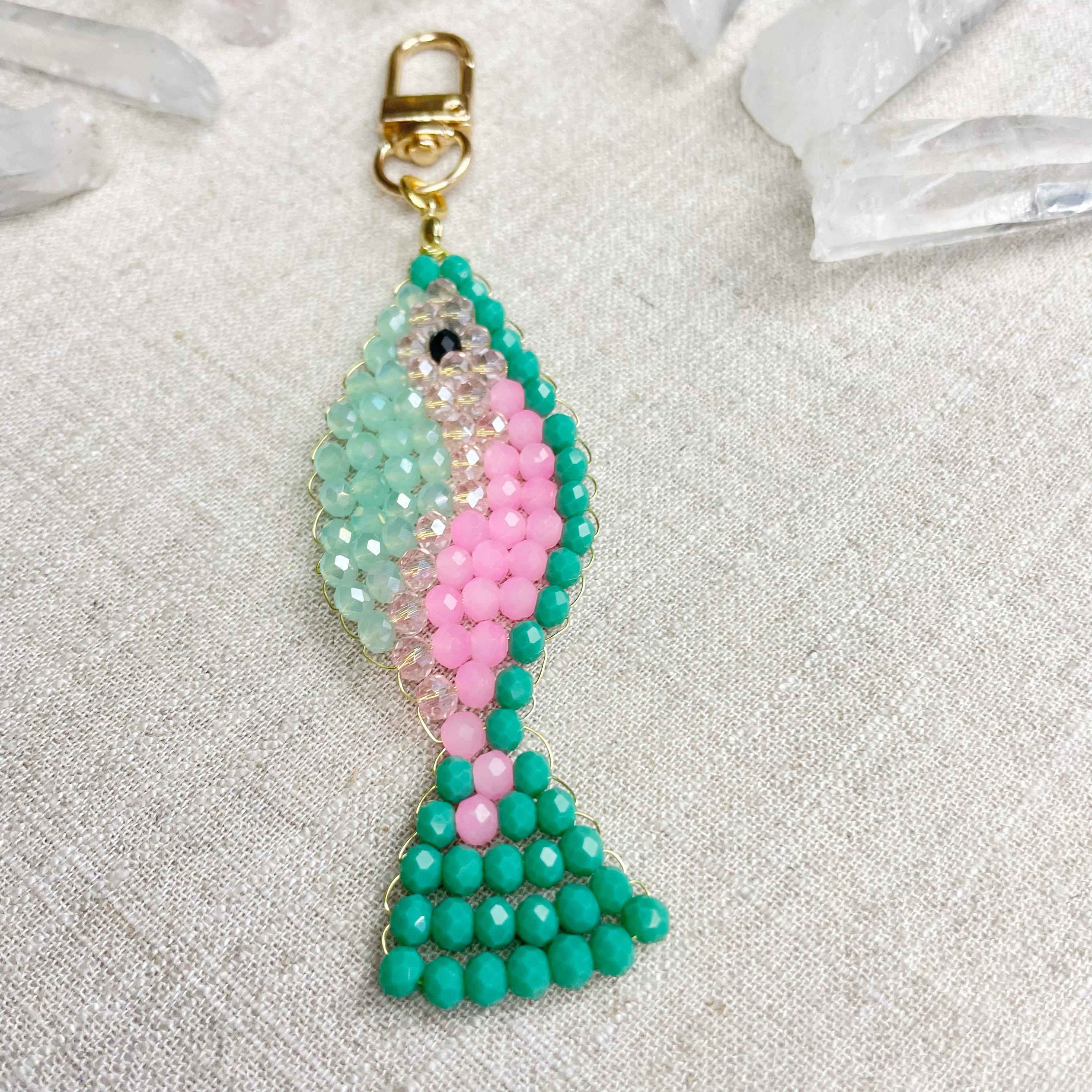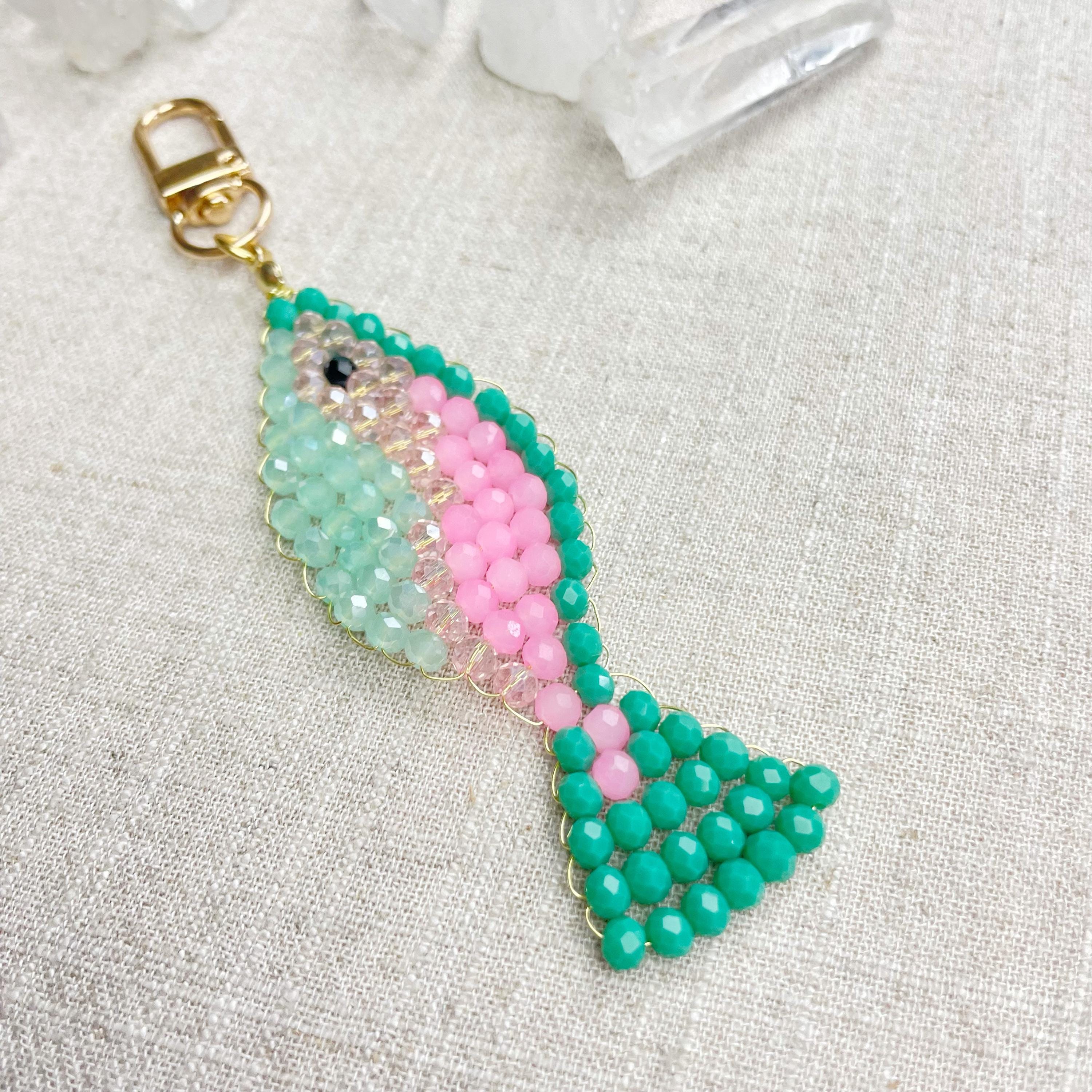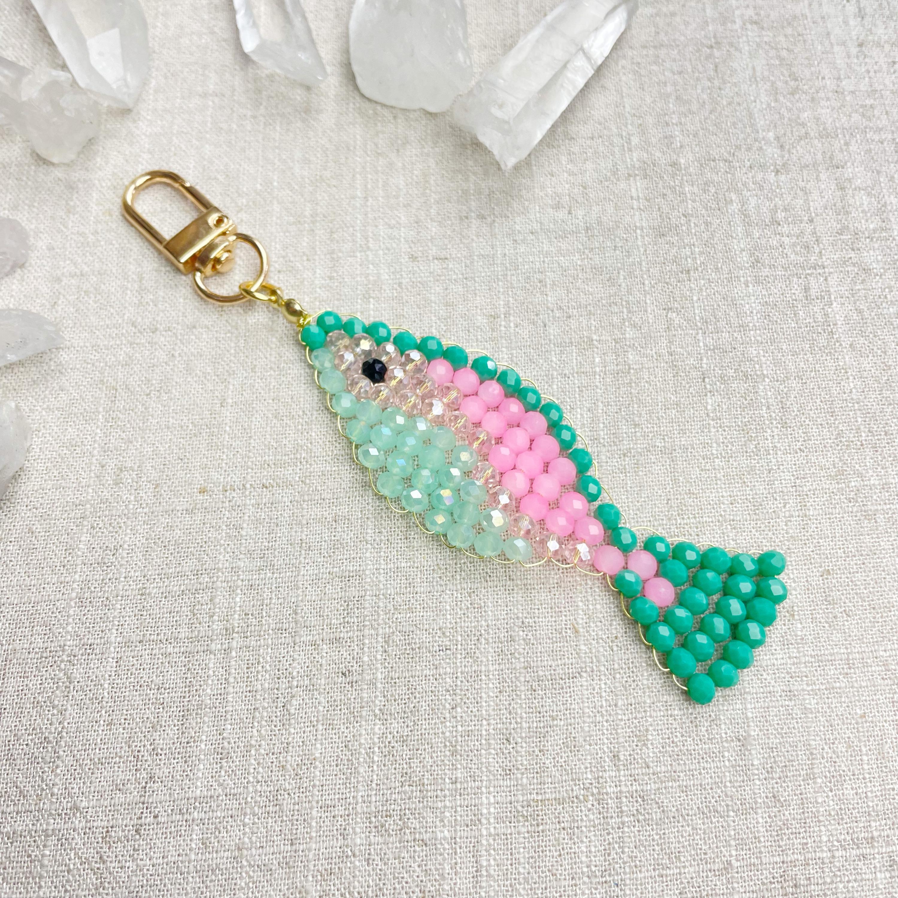 This charm is made from 4mm glass faceted rondelle beads. The beads are woven together with a gold toned wire to create the fish charm. The fish features teal green, neon pink, iridescent pink and iridescent mint green color beads.
