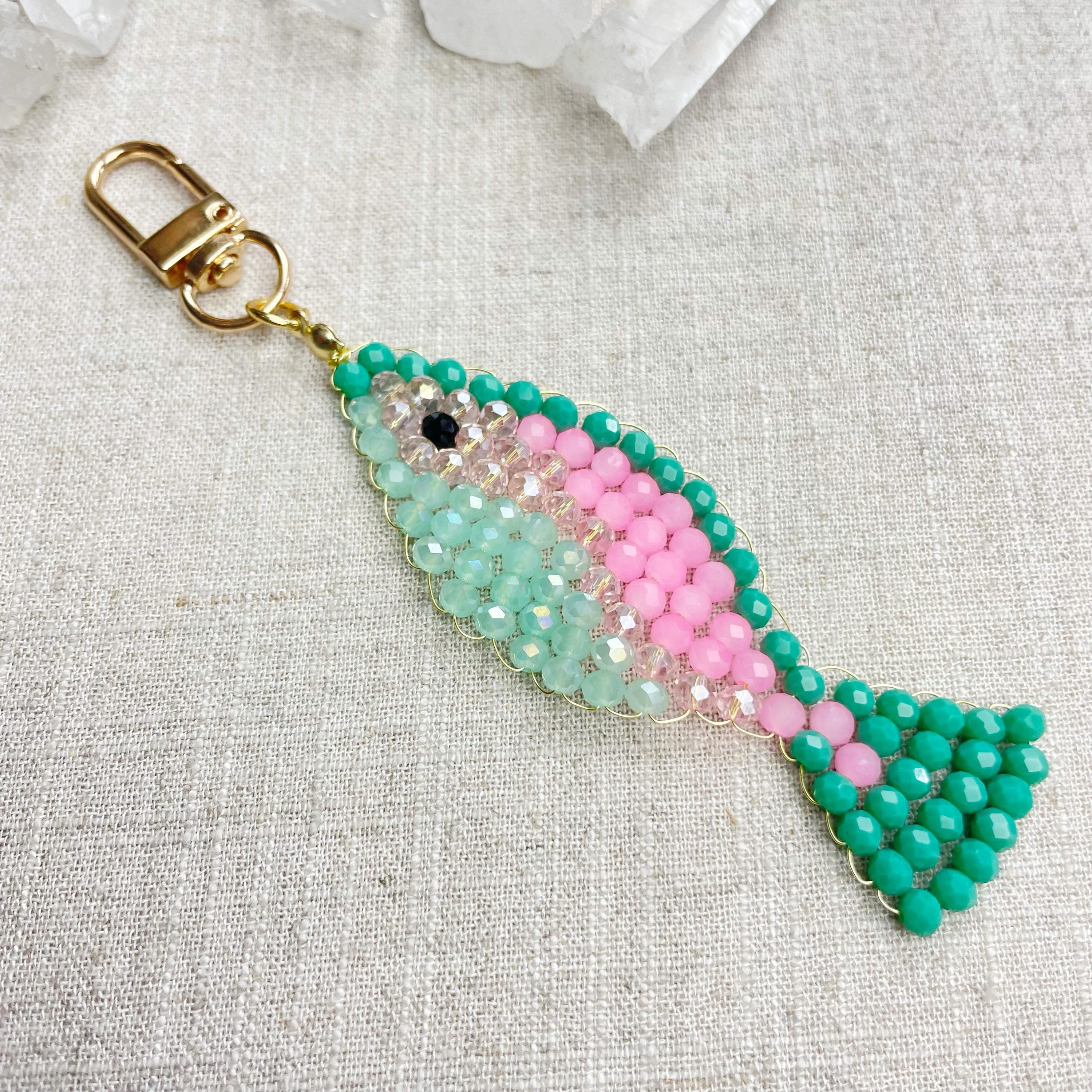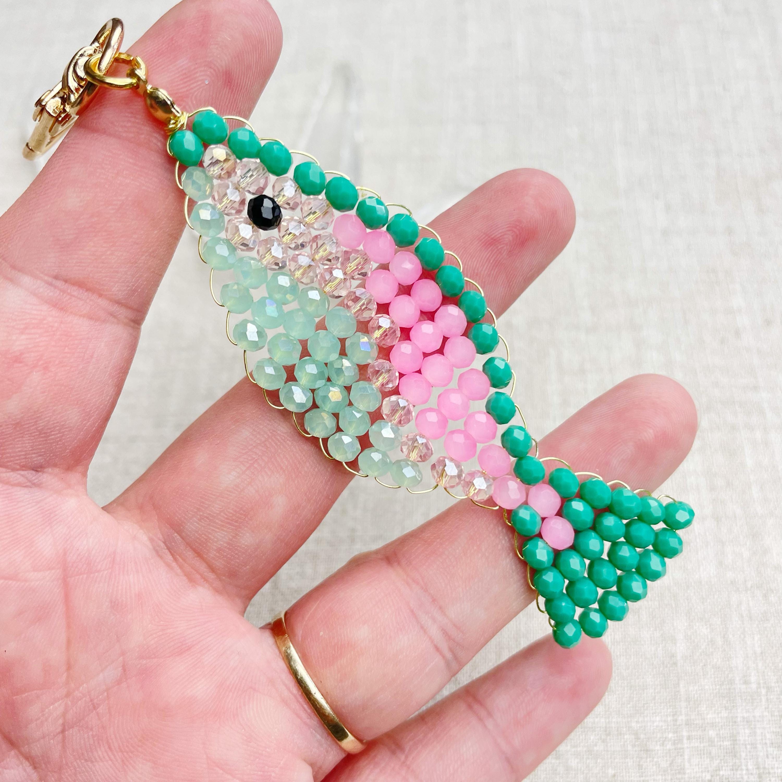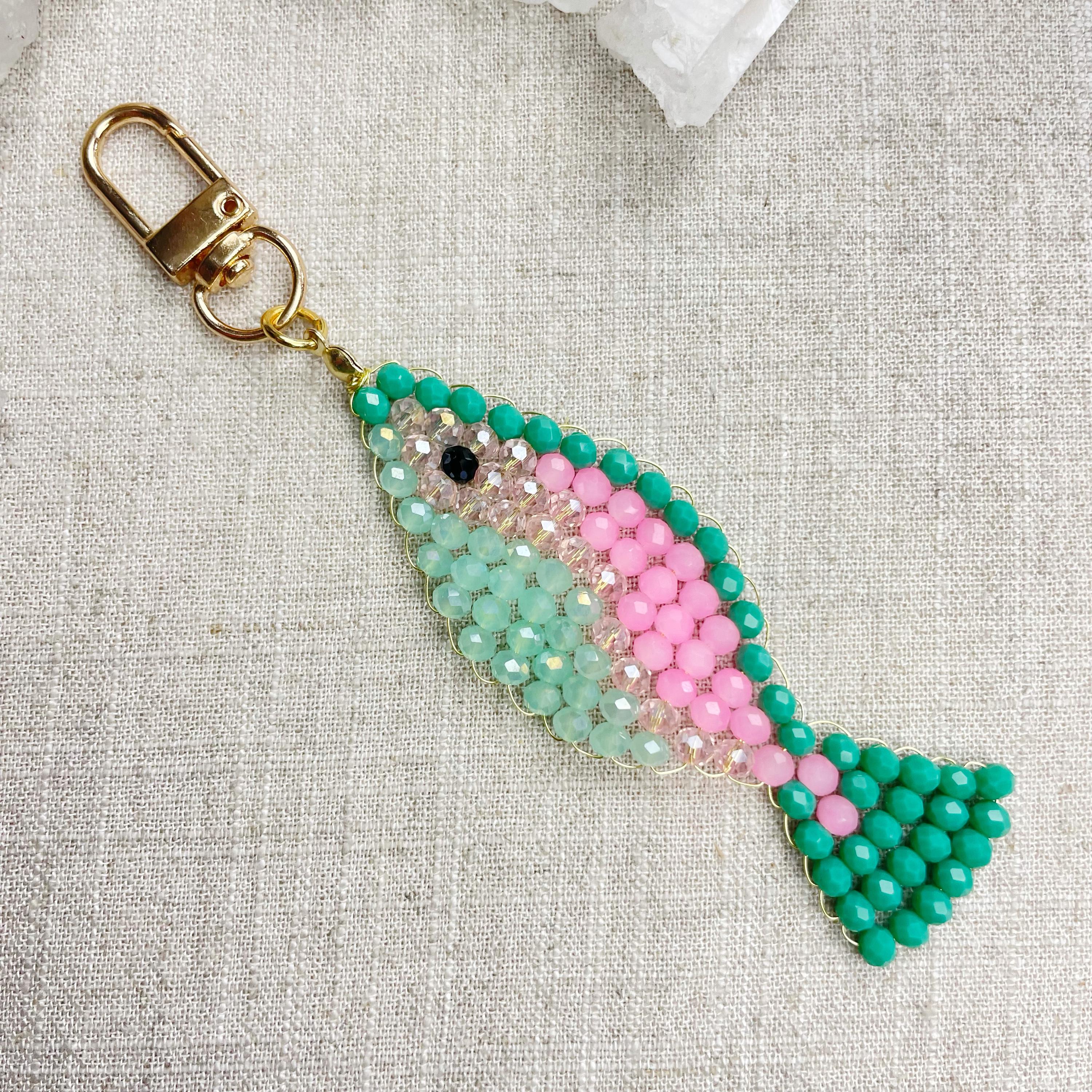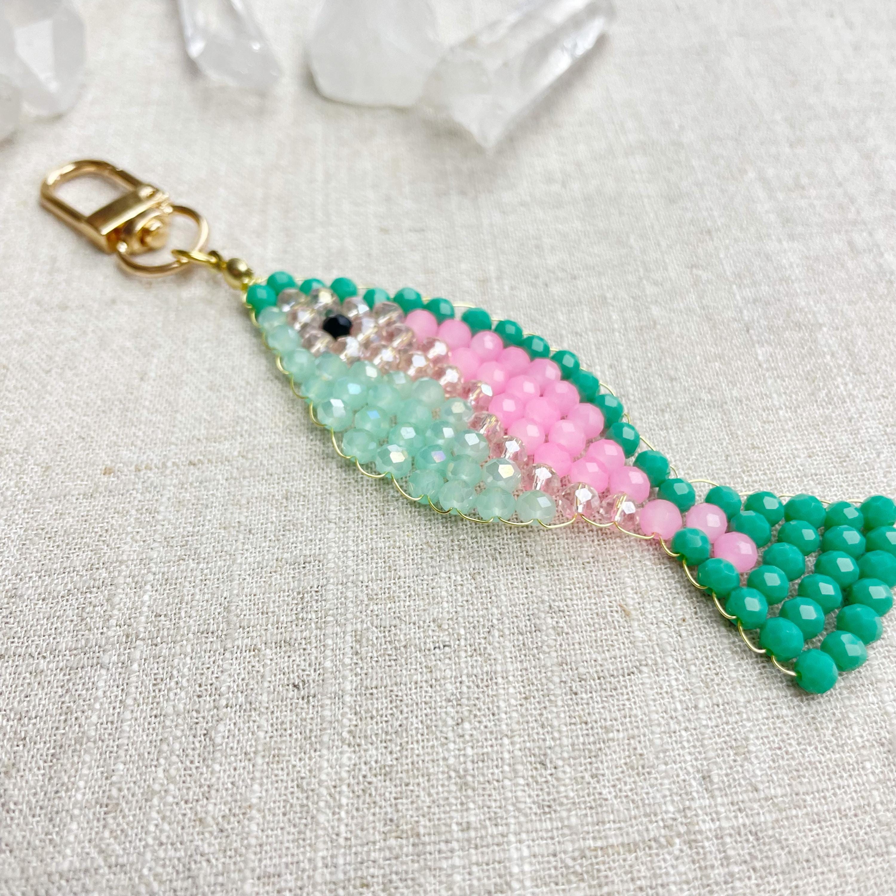 This charm is made from 4mm glass faceted rondelle beads. The beads are woven together with a gold toned wire to create the fish charm. The fish features teal green, neon pink, iridescent pink and iridescent mint green color beads.