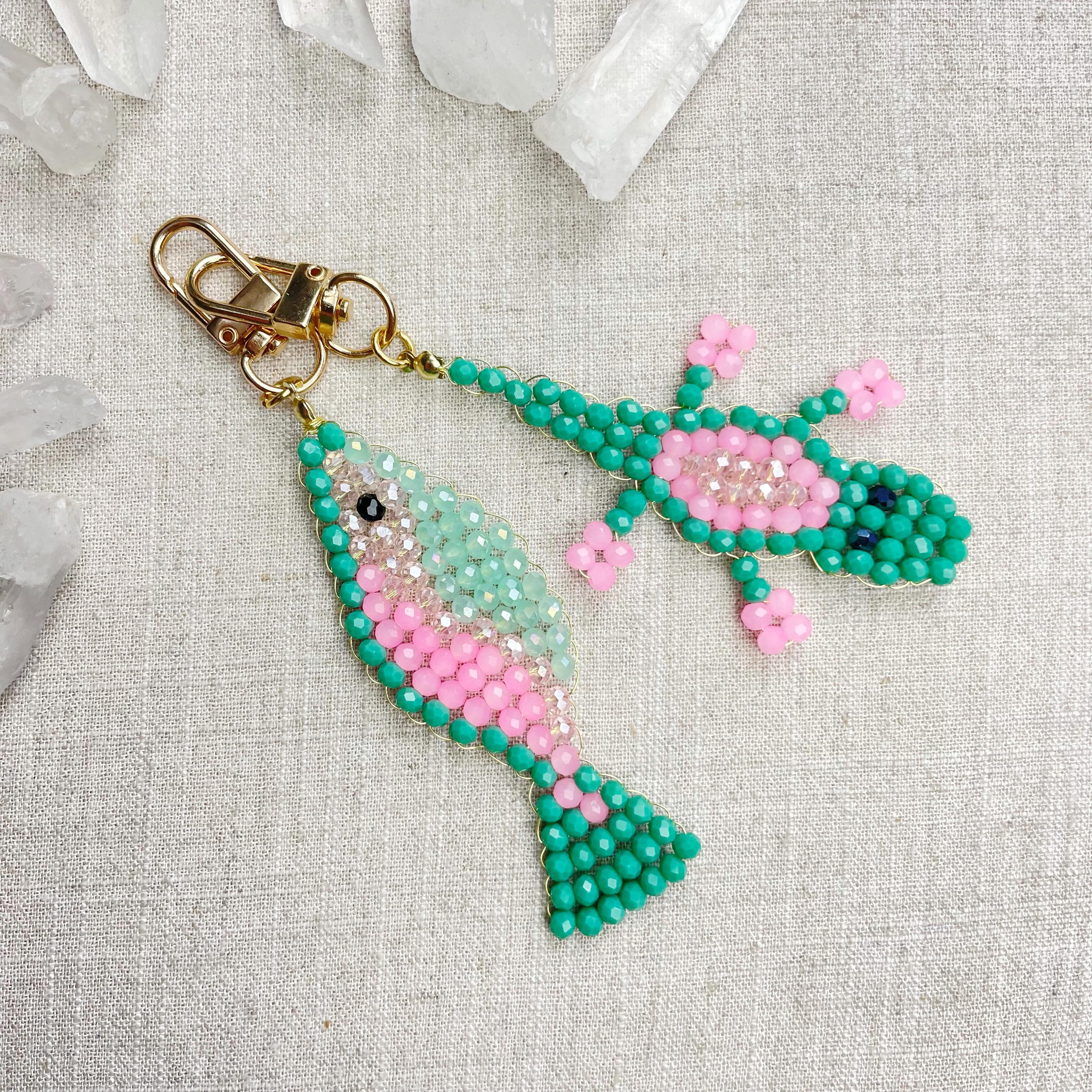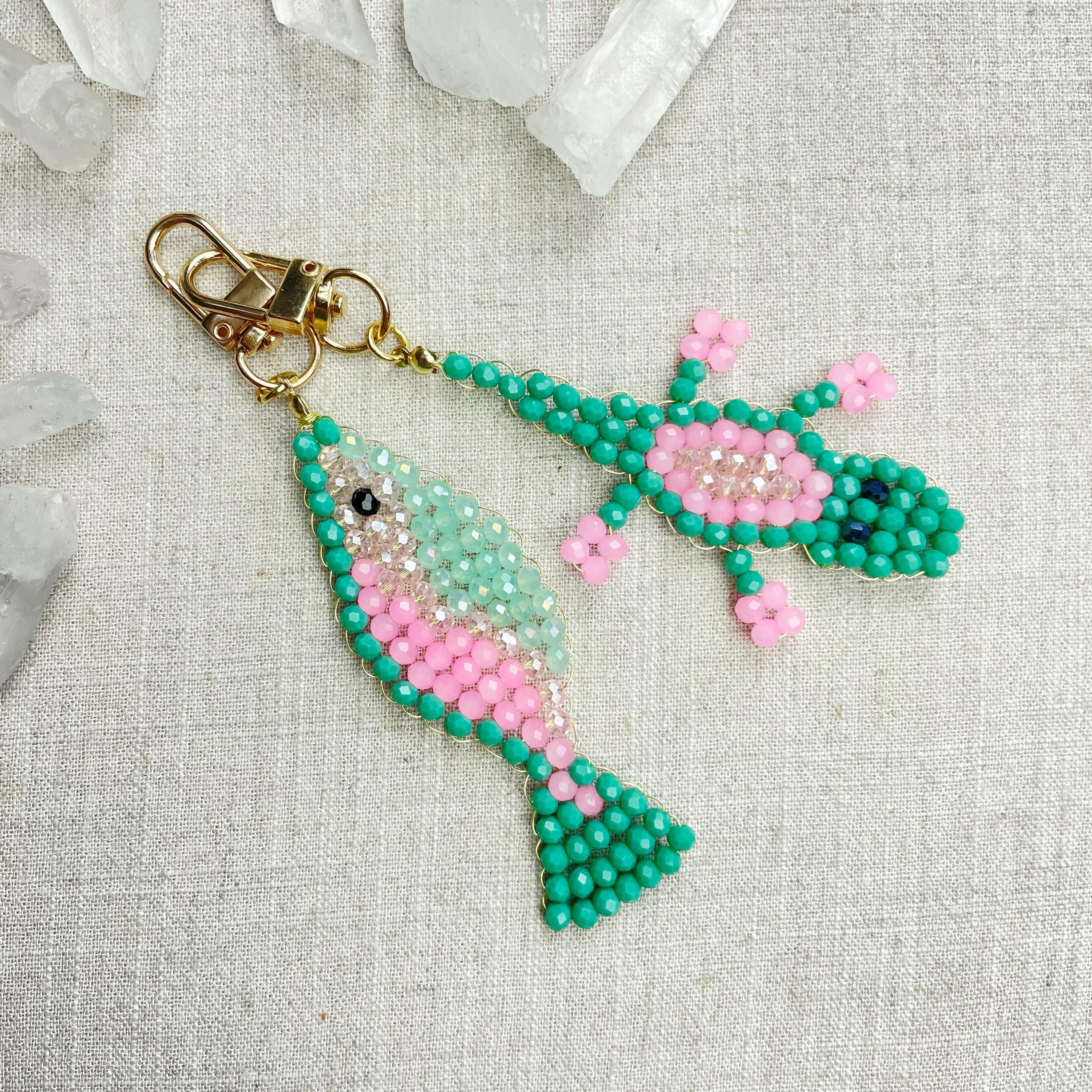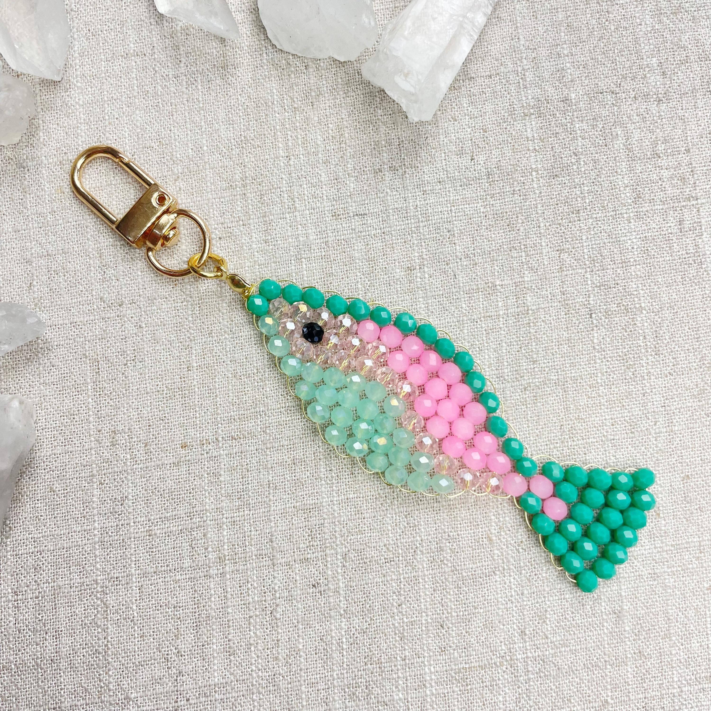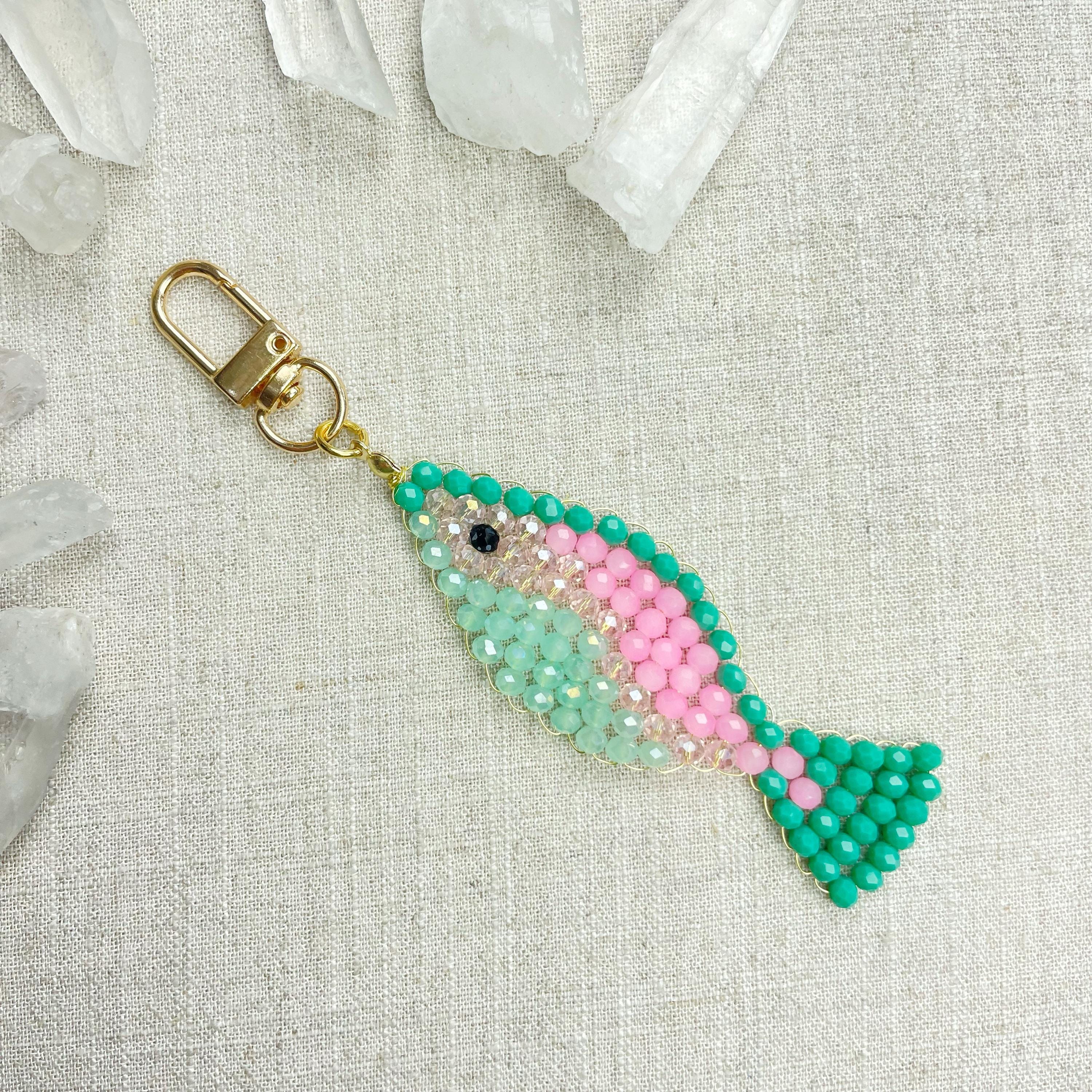 This charm is made from 4mm glass faceted rondelle beads. The beads are woven together with a gold toned wire to create the fish charm. The fish features teal green, neon pink, iridescent pink and iridescent mint green color beads.