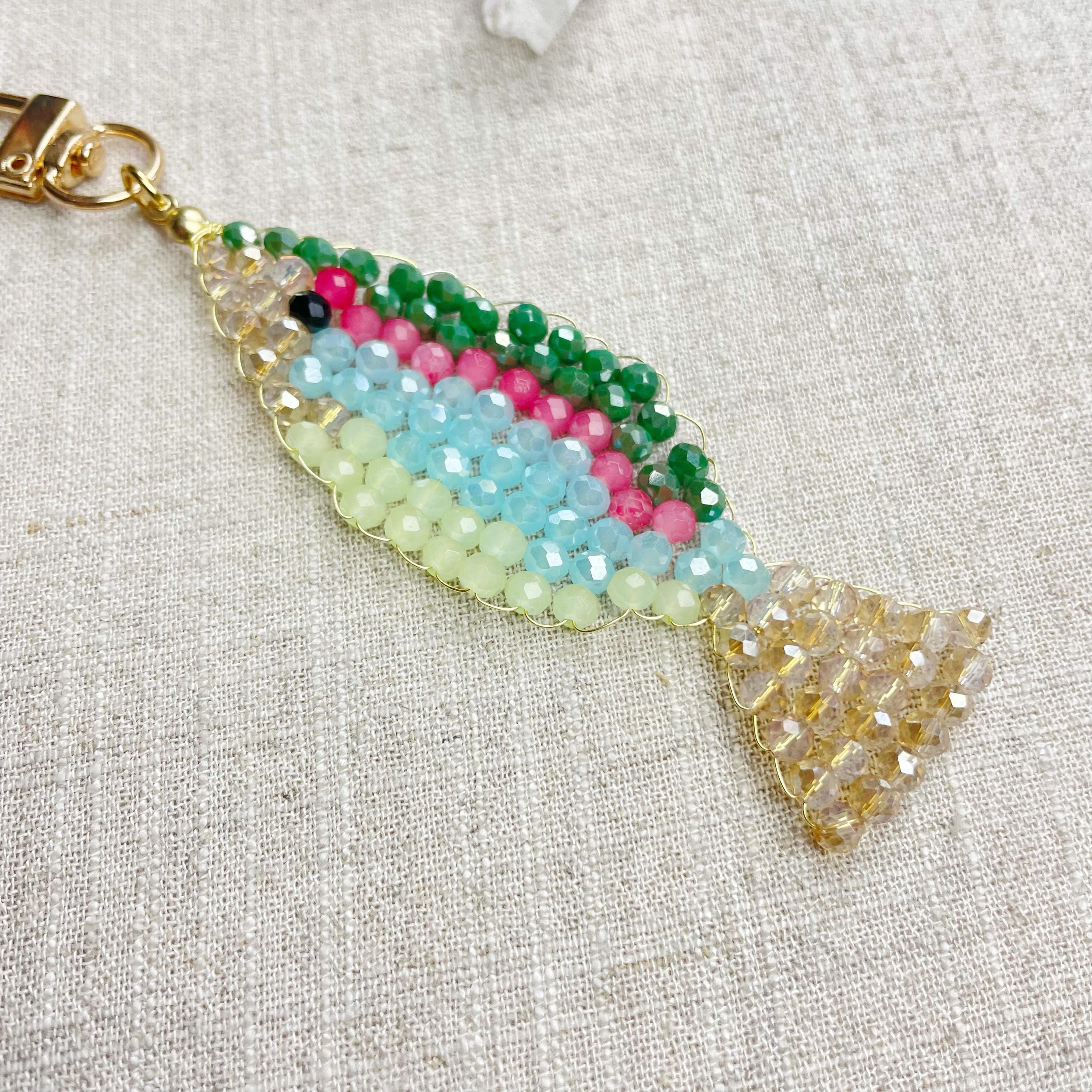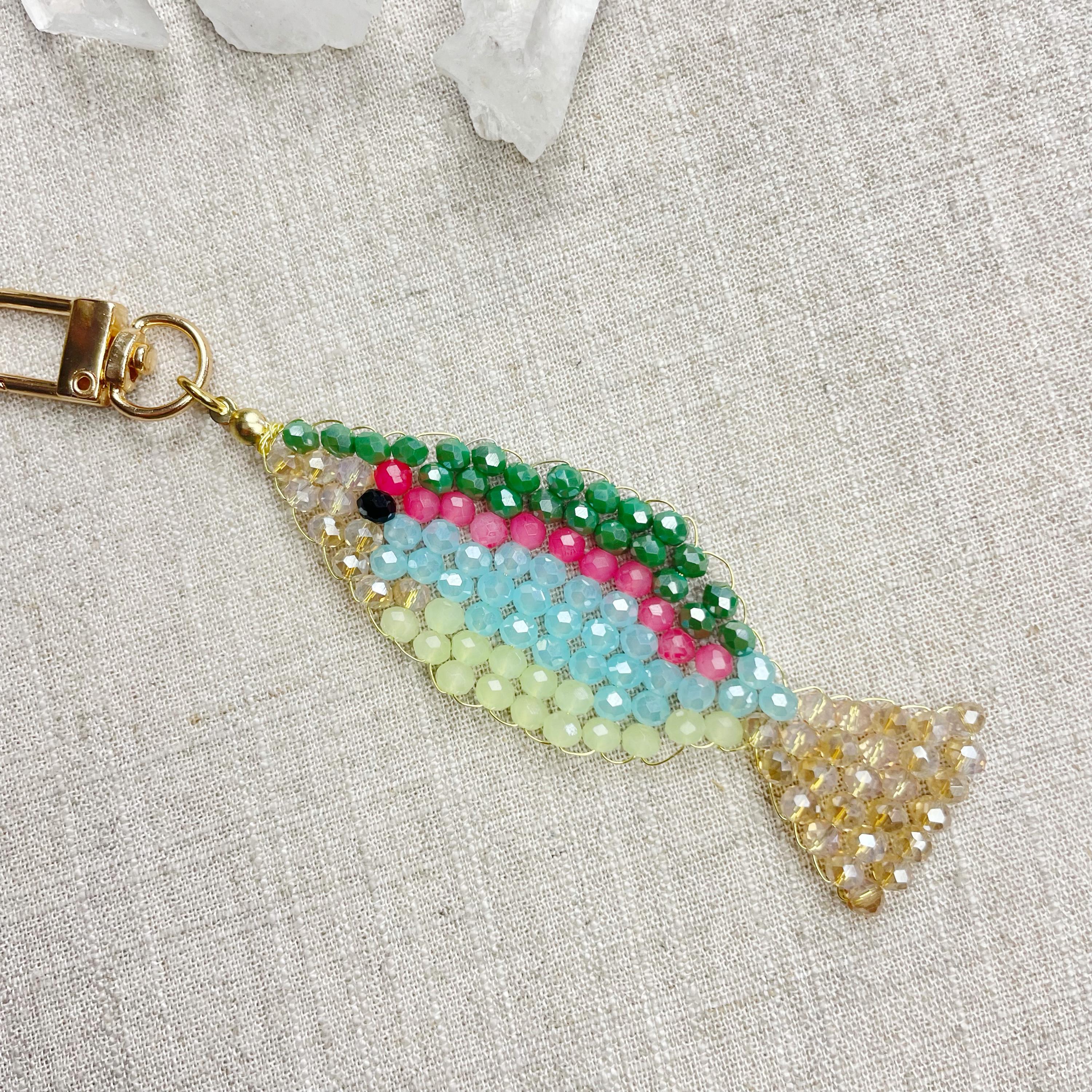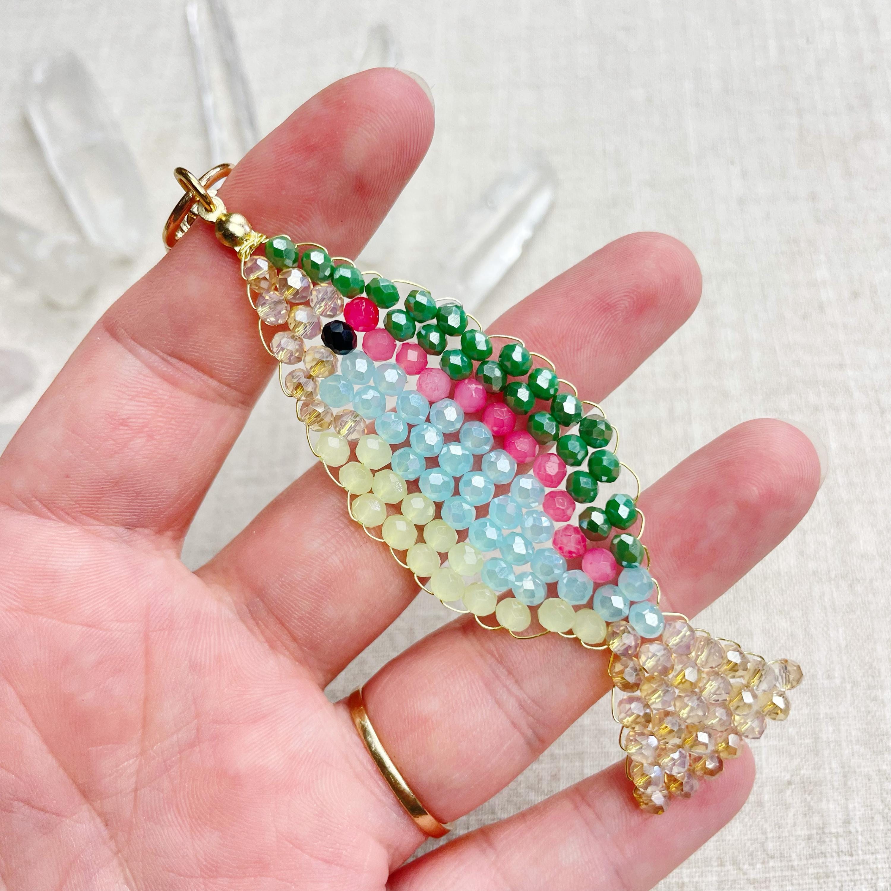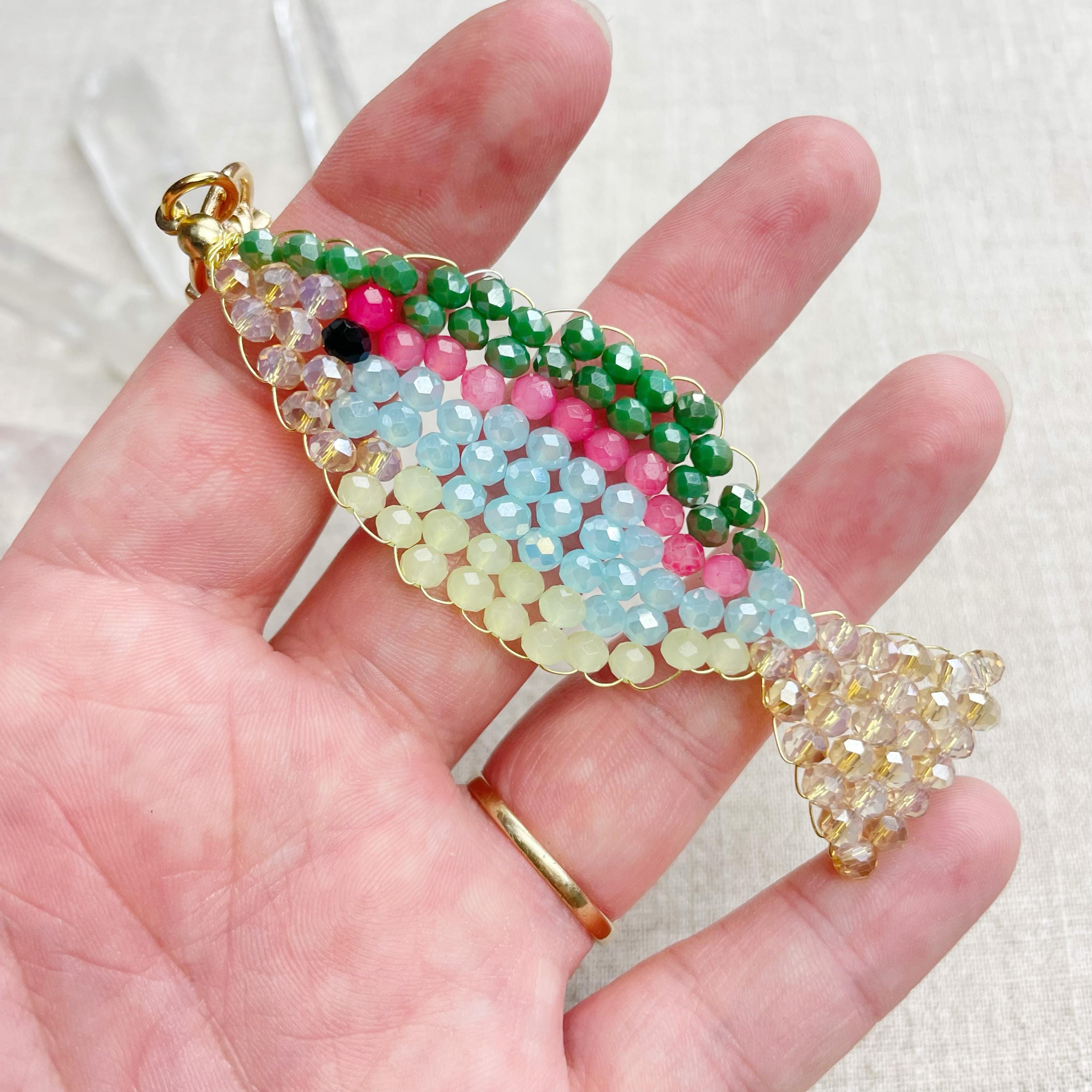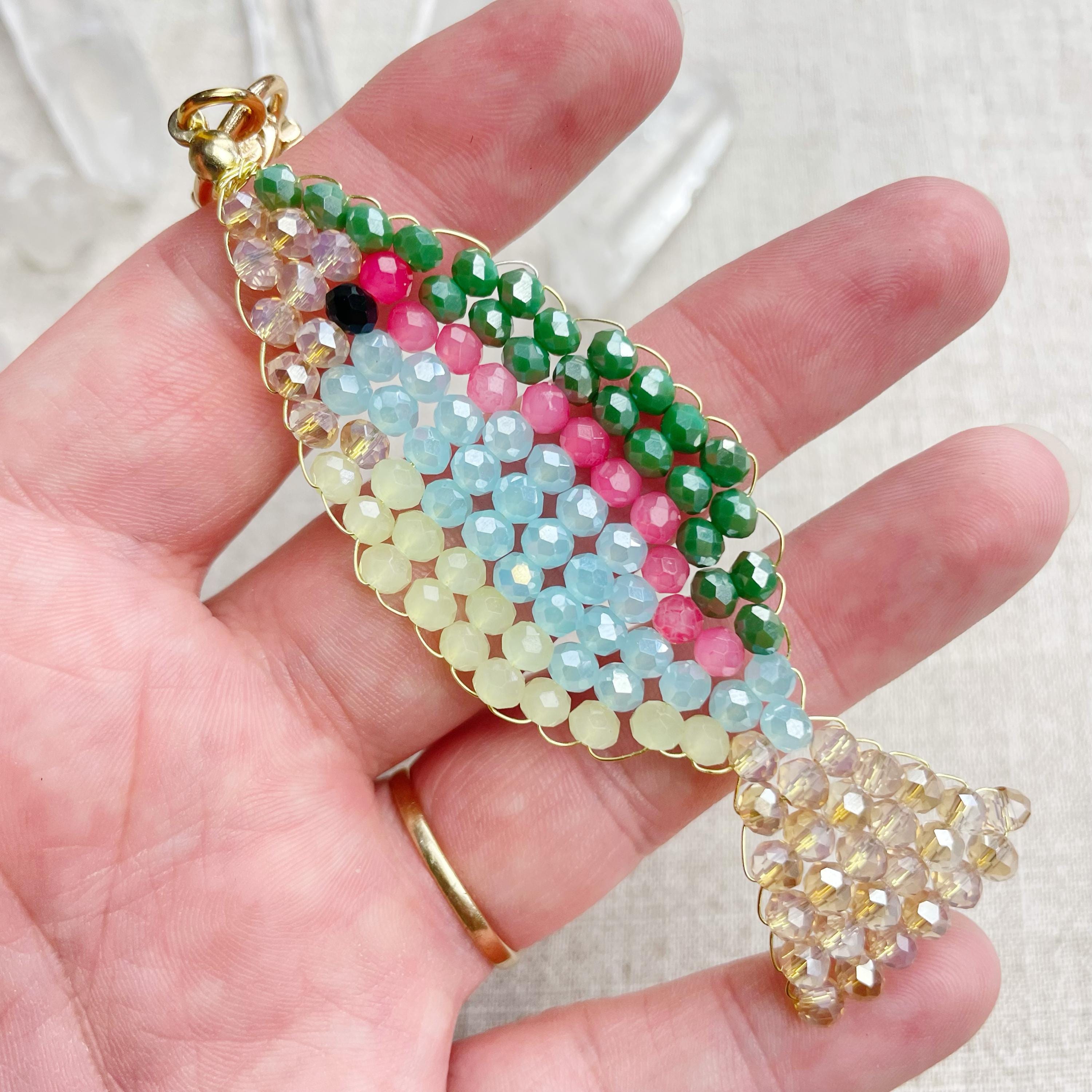 This charm is made from 4mm glass faceted rondelle beads. The beads are woven together with a gold toned wire to create the fish charm. The fish features iridescent green, salmon, iridescent blue, iridescent cream and pale green color beads.