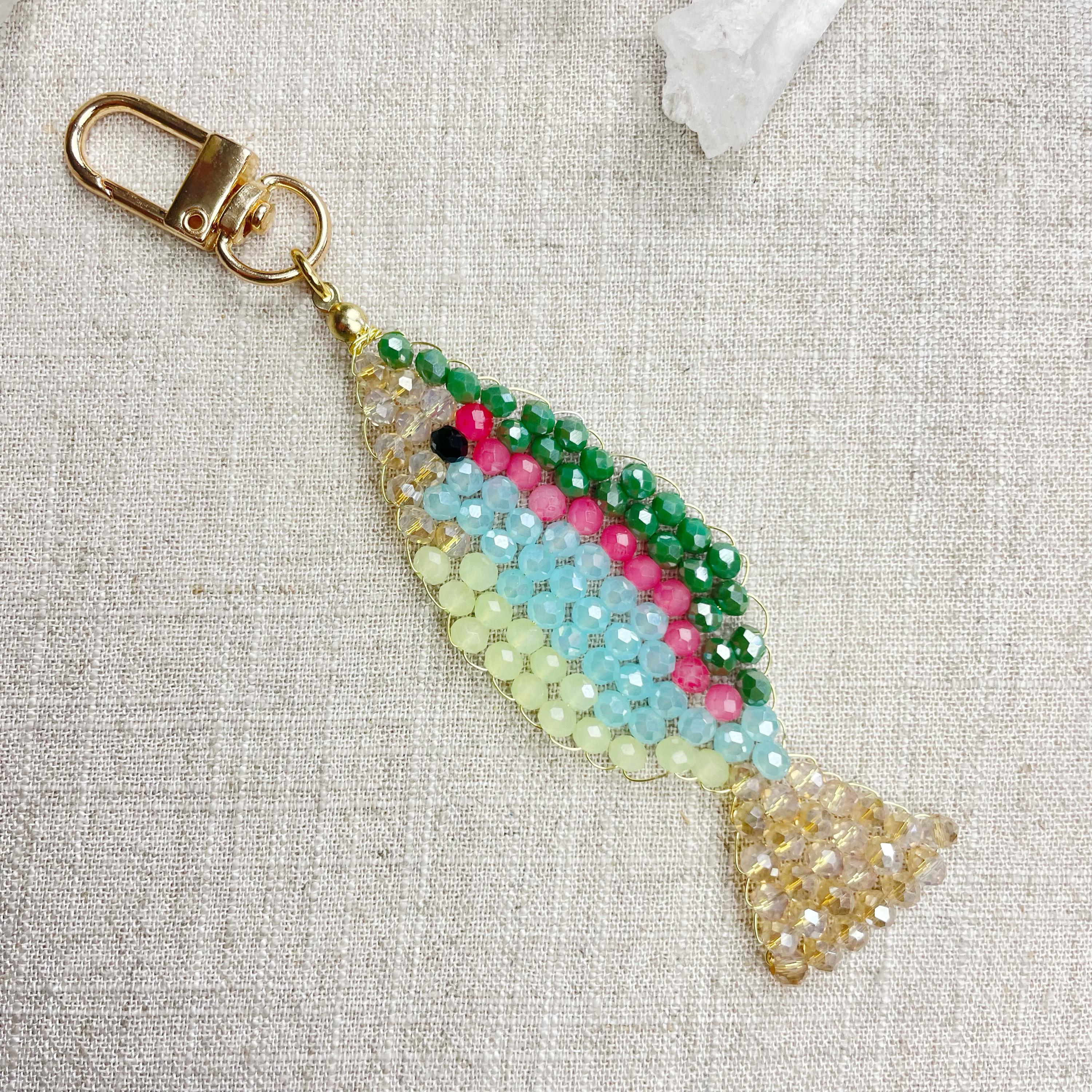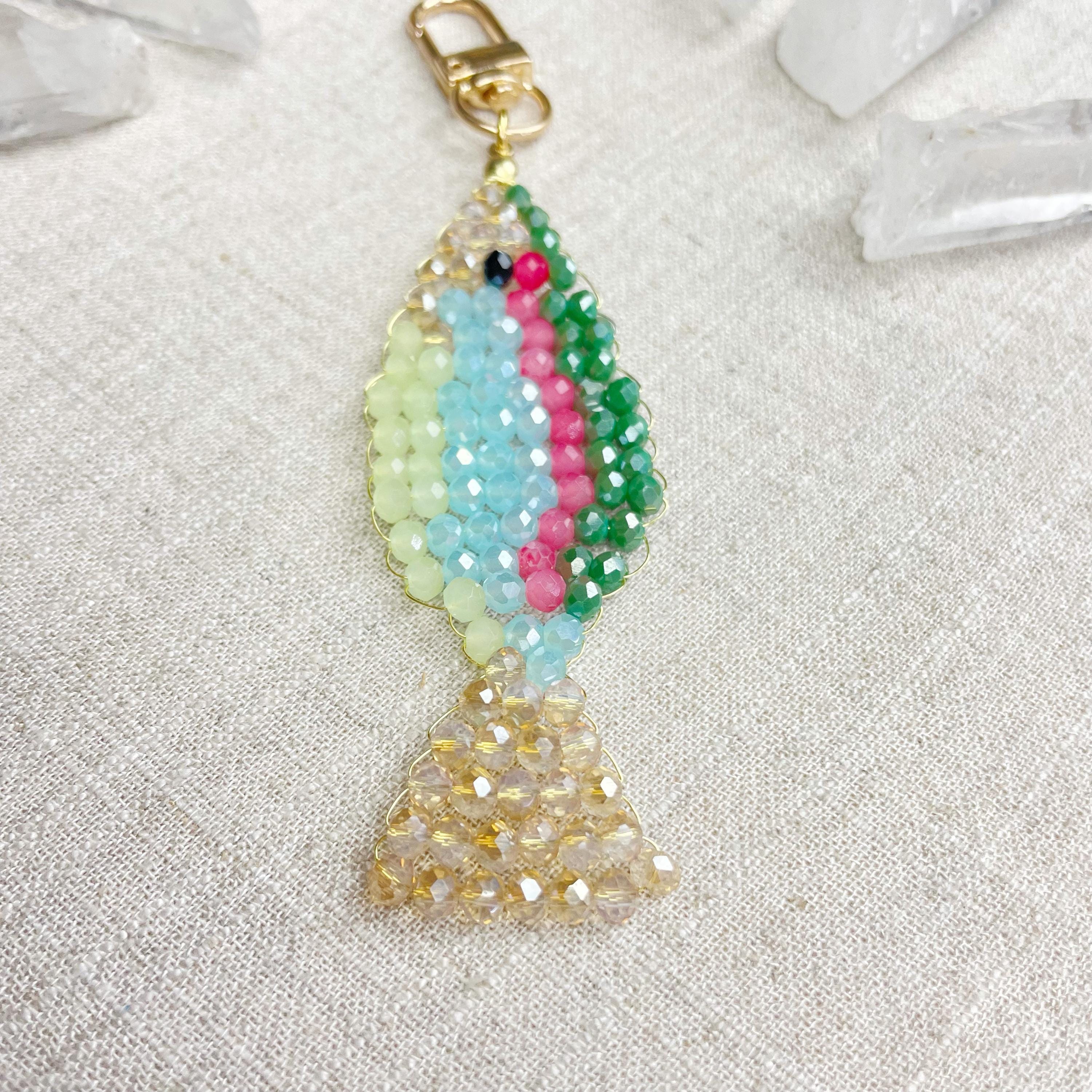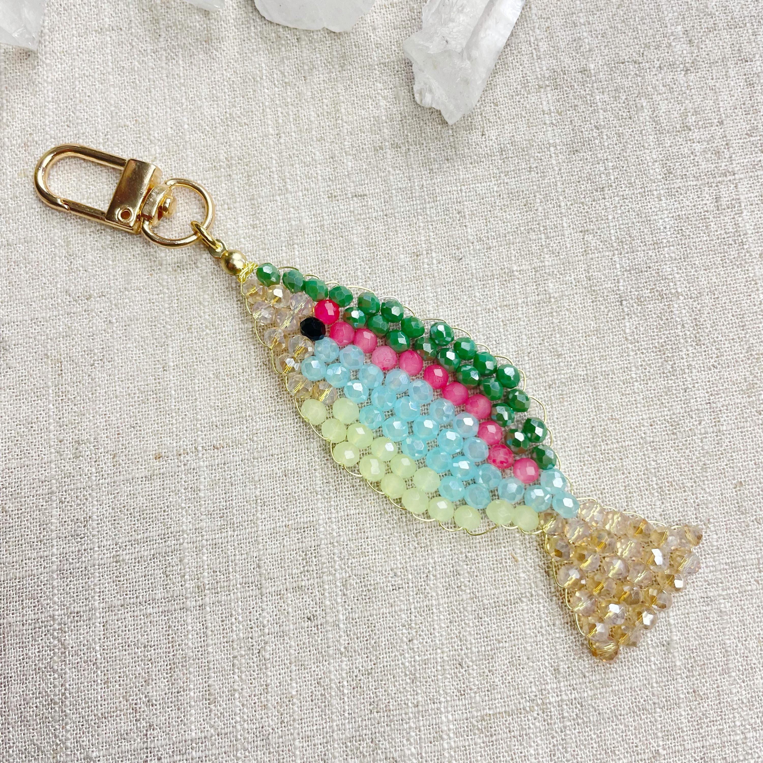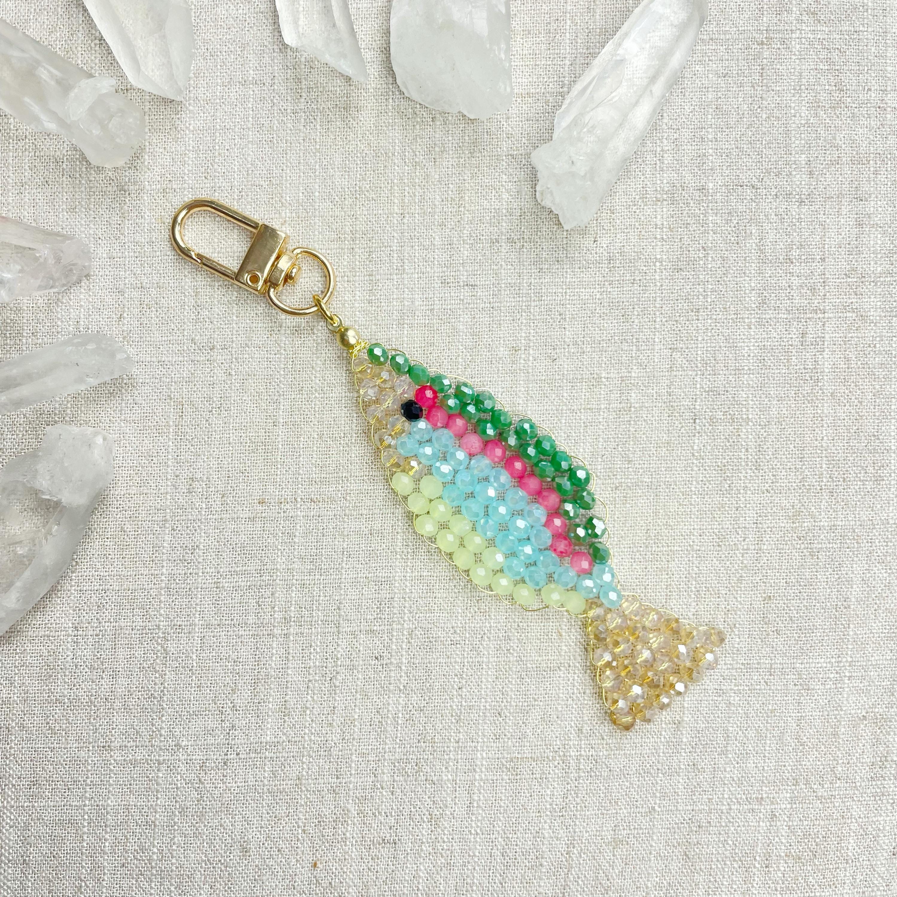 This charm is made from 4mm glass faceted rondelle beads. The beads are woven together with a gold toned wire to create the fish charm. The fish features iridescent green, salmon, iridescent blue, iridescent cream and pale green color beads.