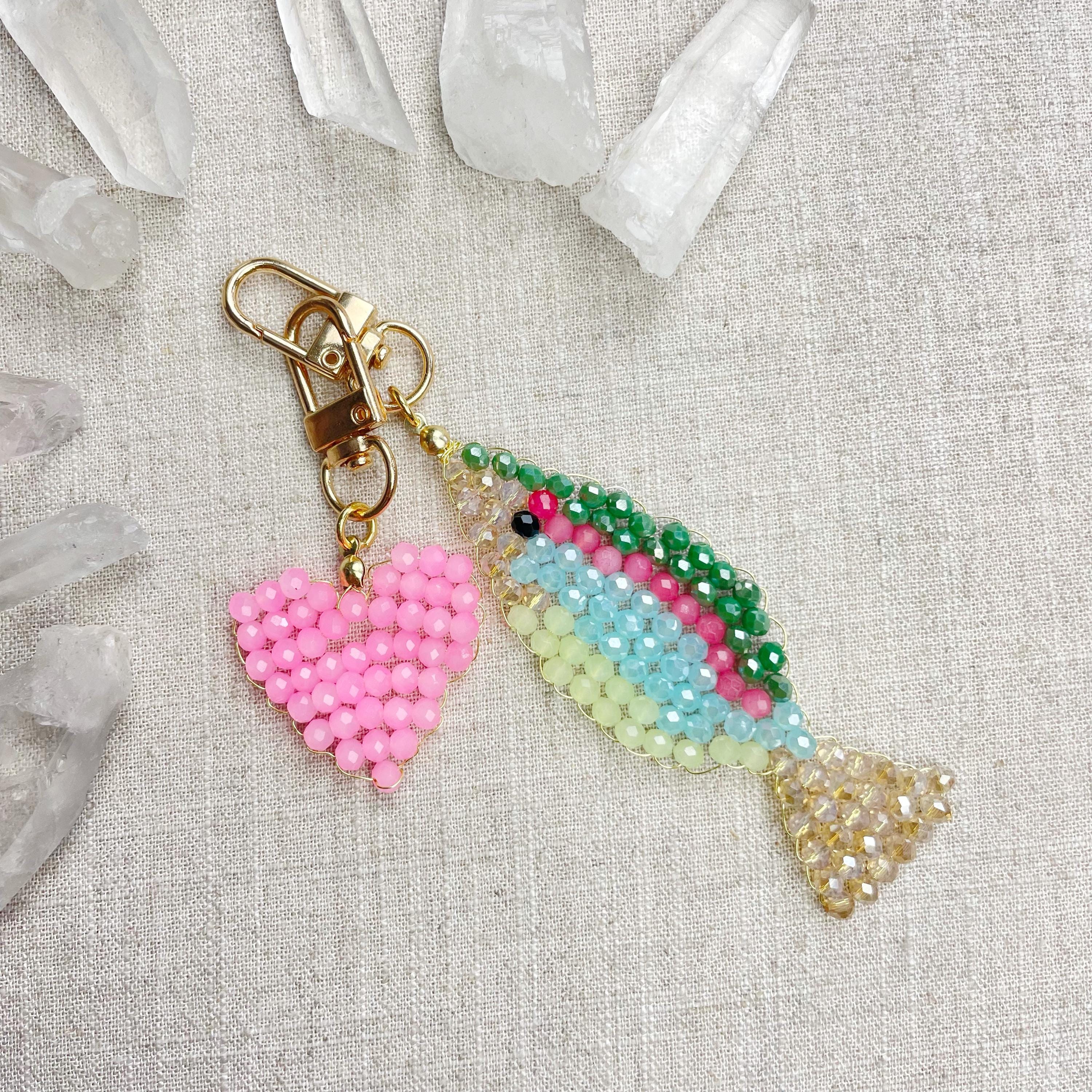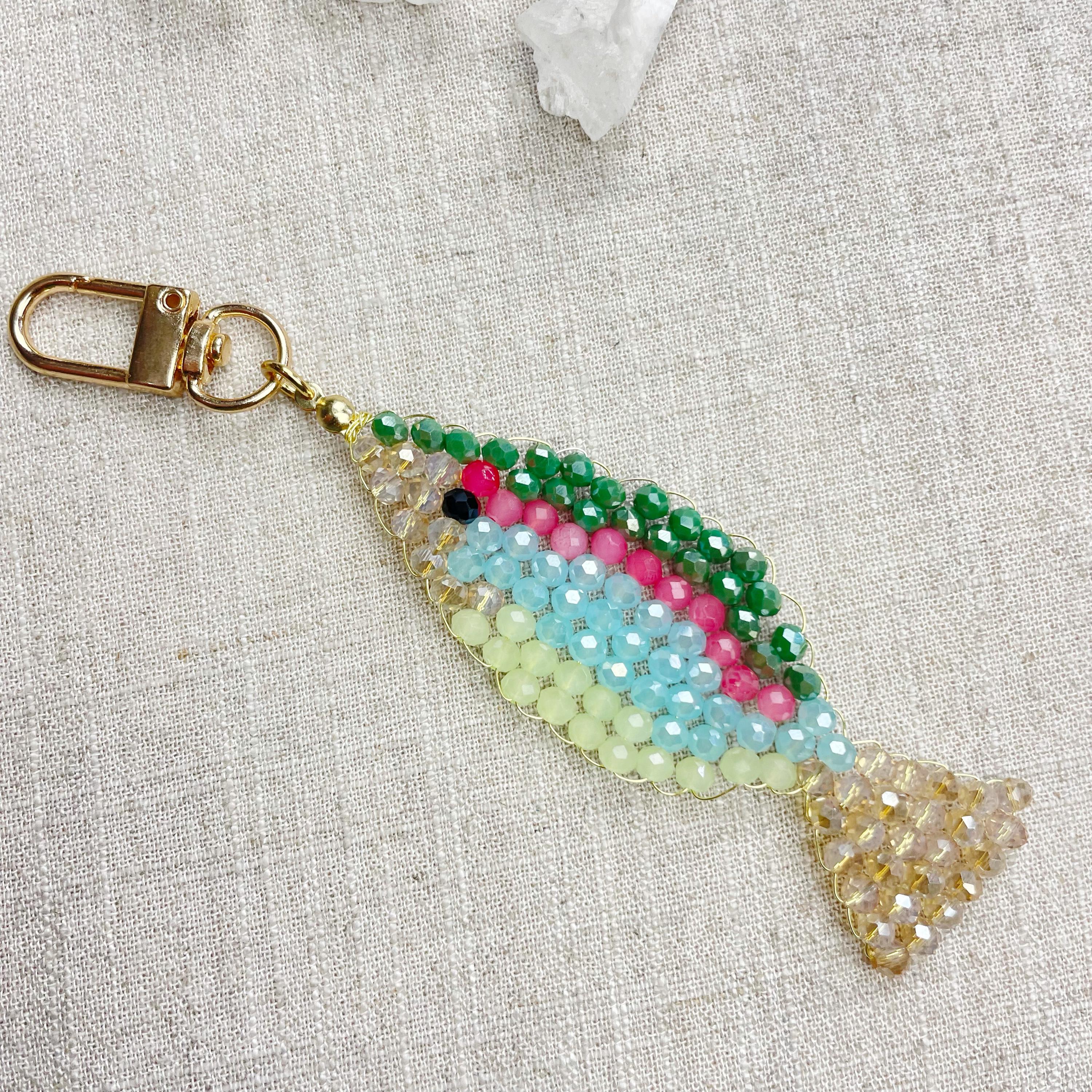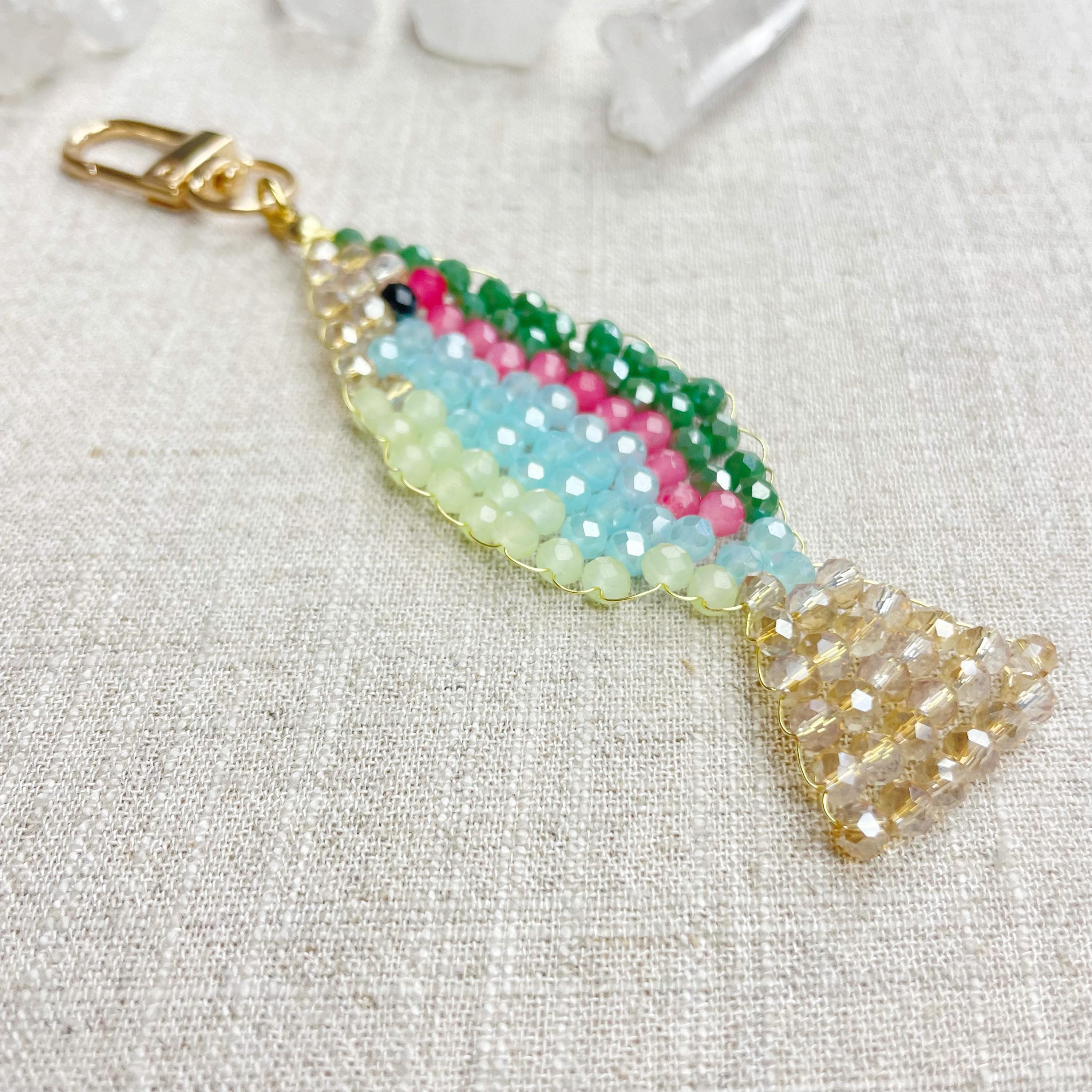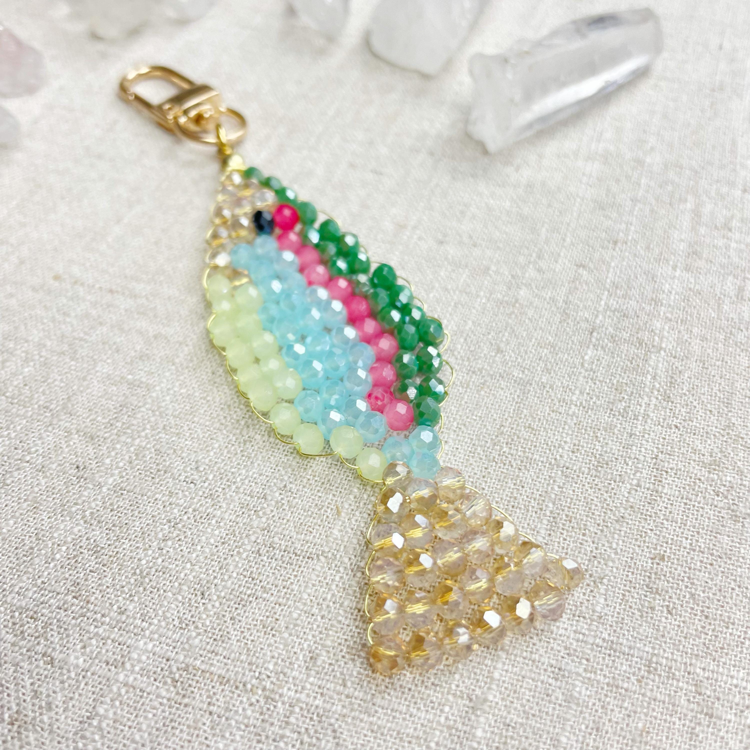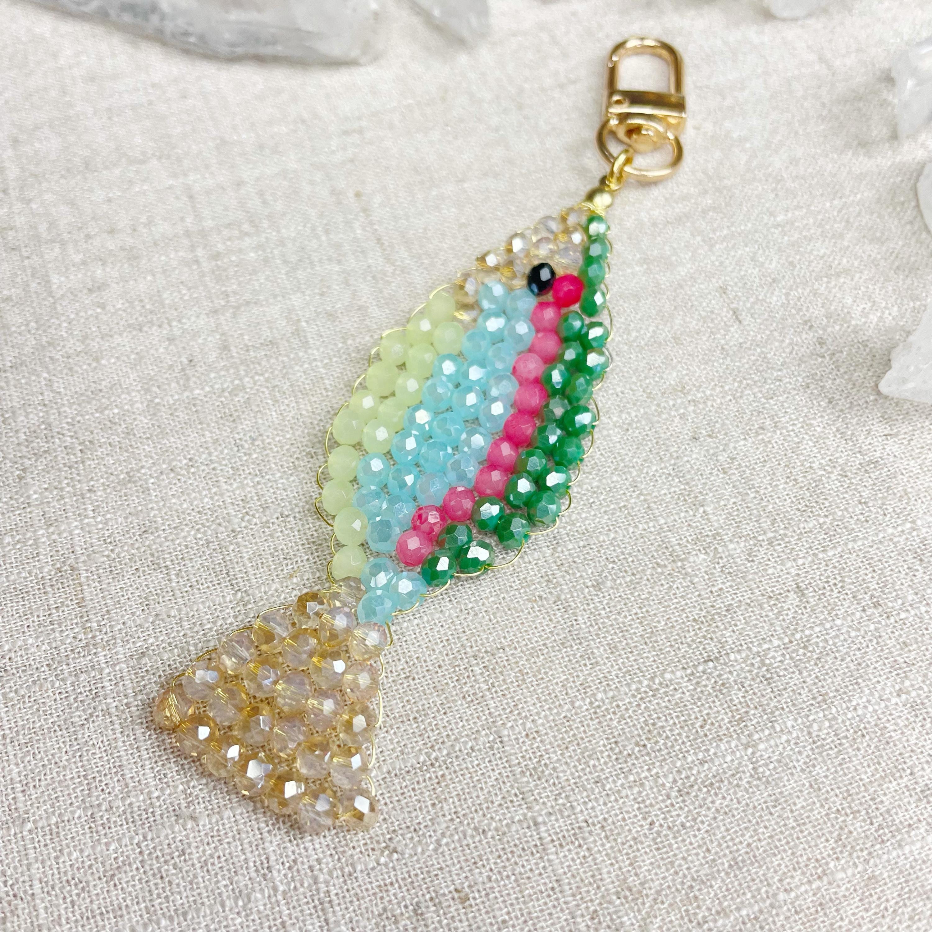 This charm is made from 4mm glass faceted rondelle beads. The beads are woven together with a gold toned wire to create the fish charm. The fish features iridescent green, salmon, iridescent blue, iridescent cream and pale green color beads.