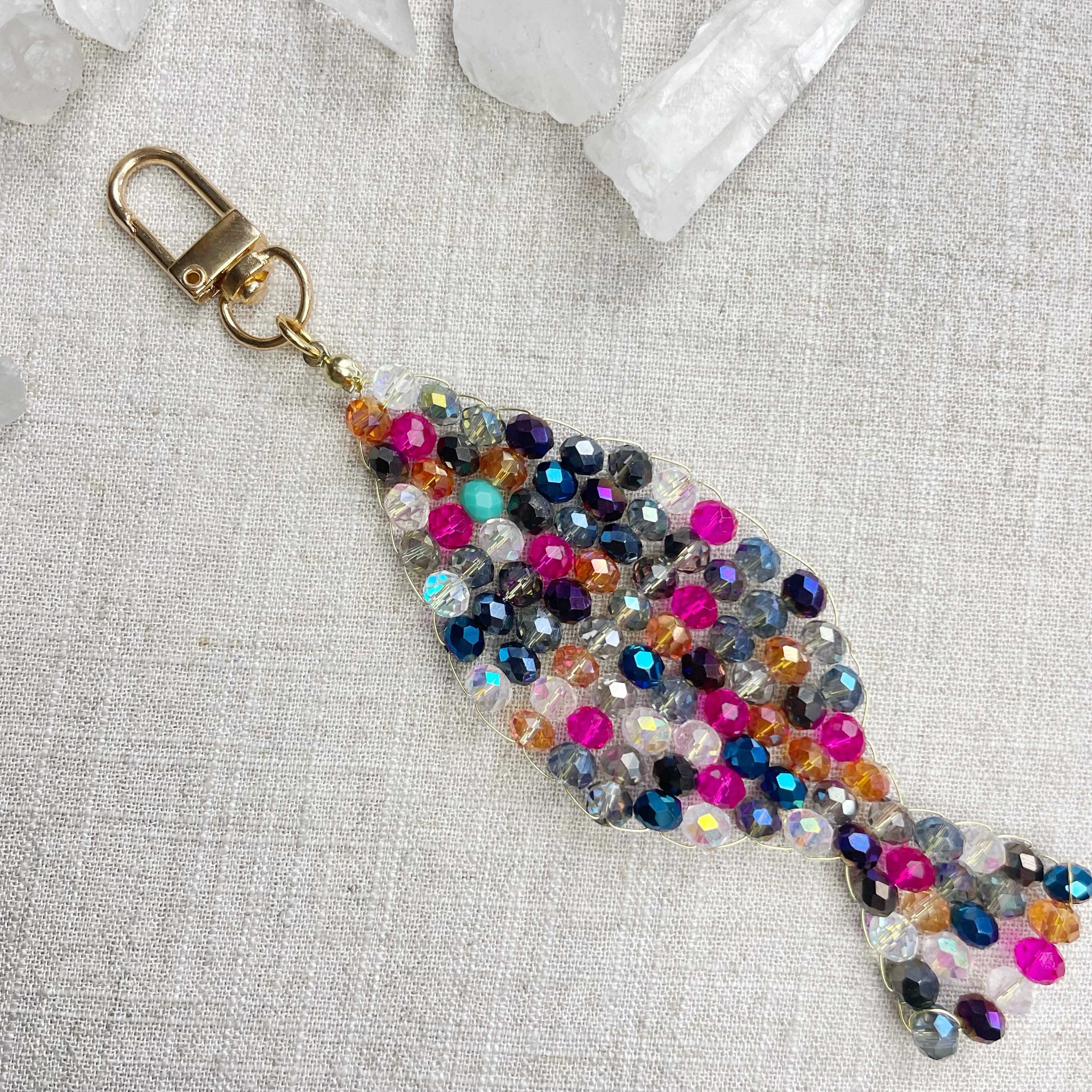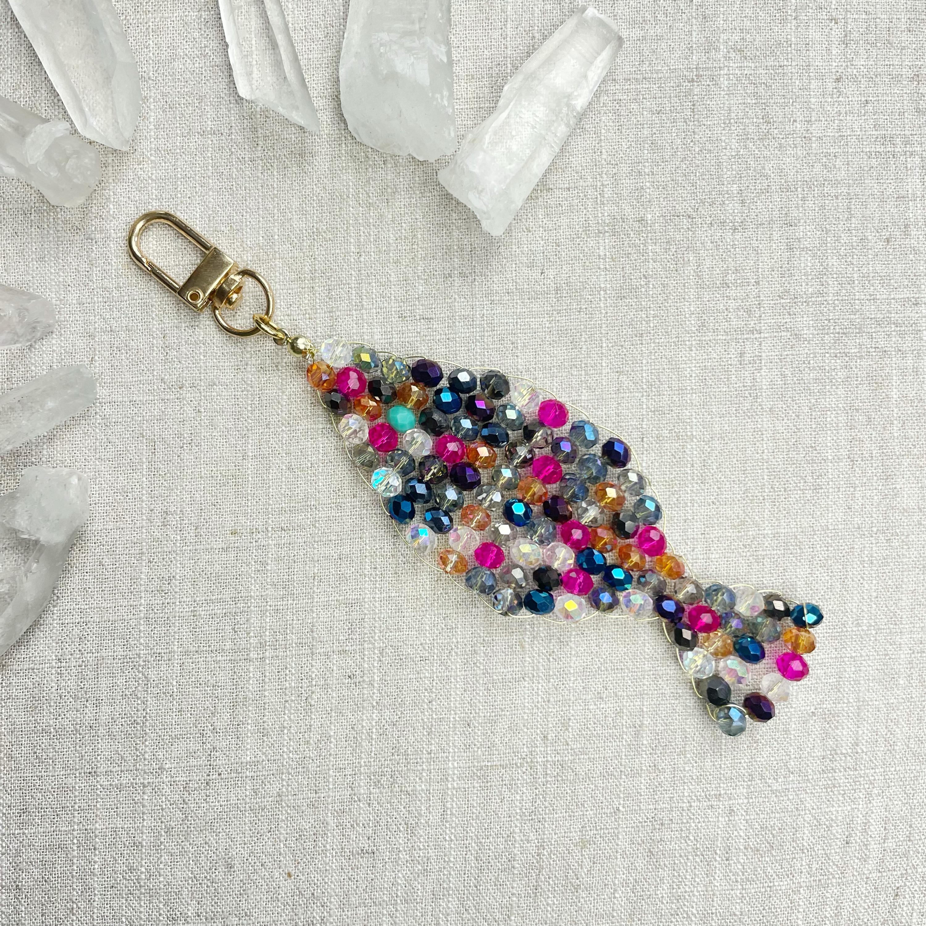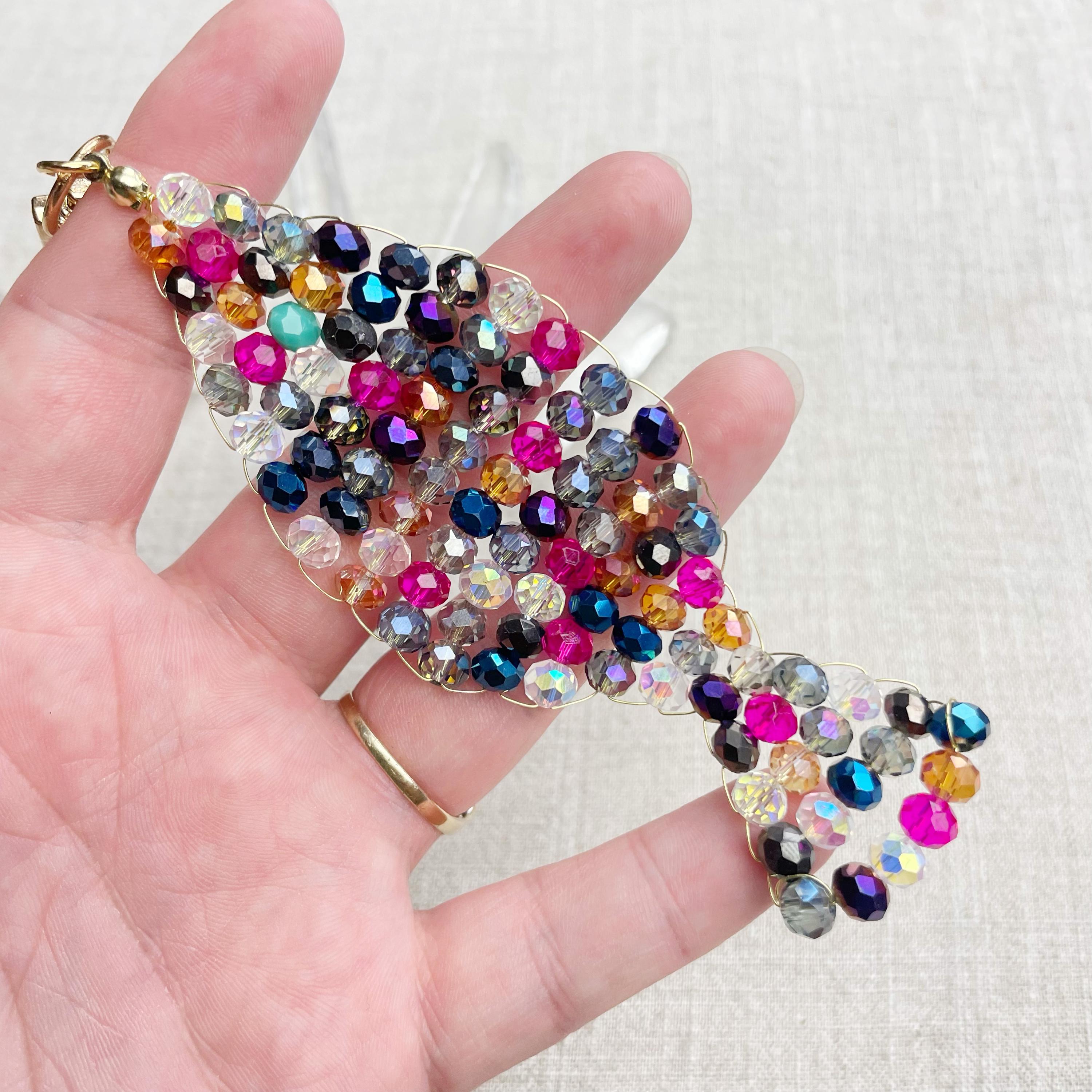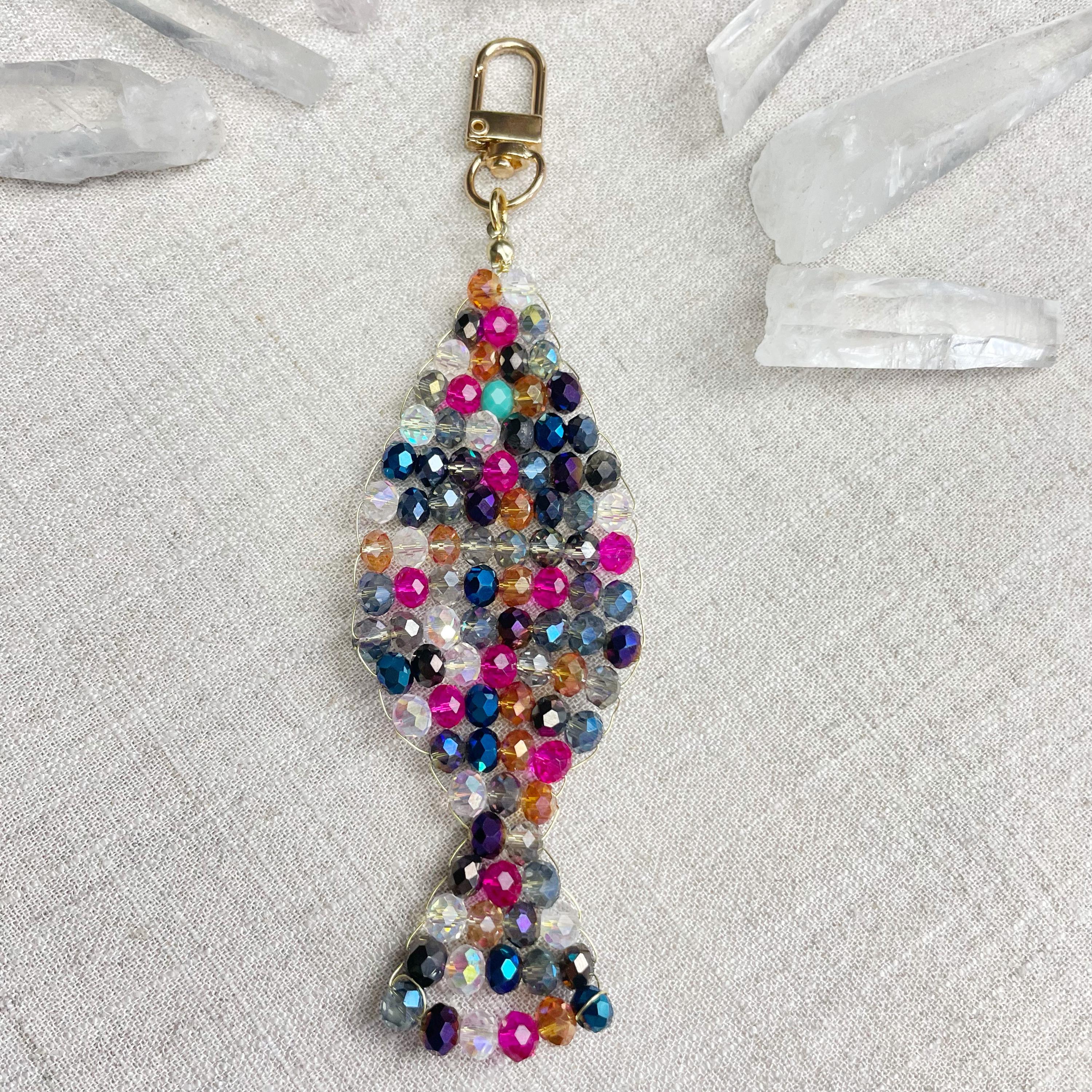 This charm is made from 6mm glass faceted rondelle beads. The beads are woven together with a gold toned wire to create the fish charm. The beads are iridescent beads in deep rich colors. The eye is a turquoise glass bead. The beads sparkle beautifully in sunlight.
