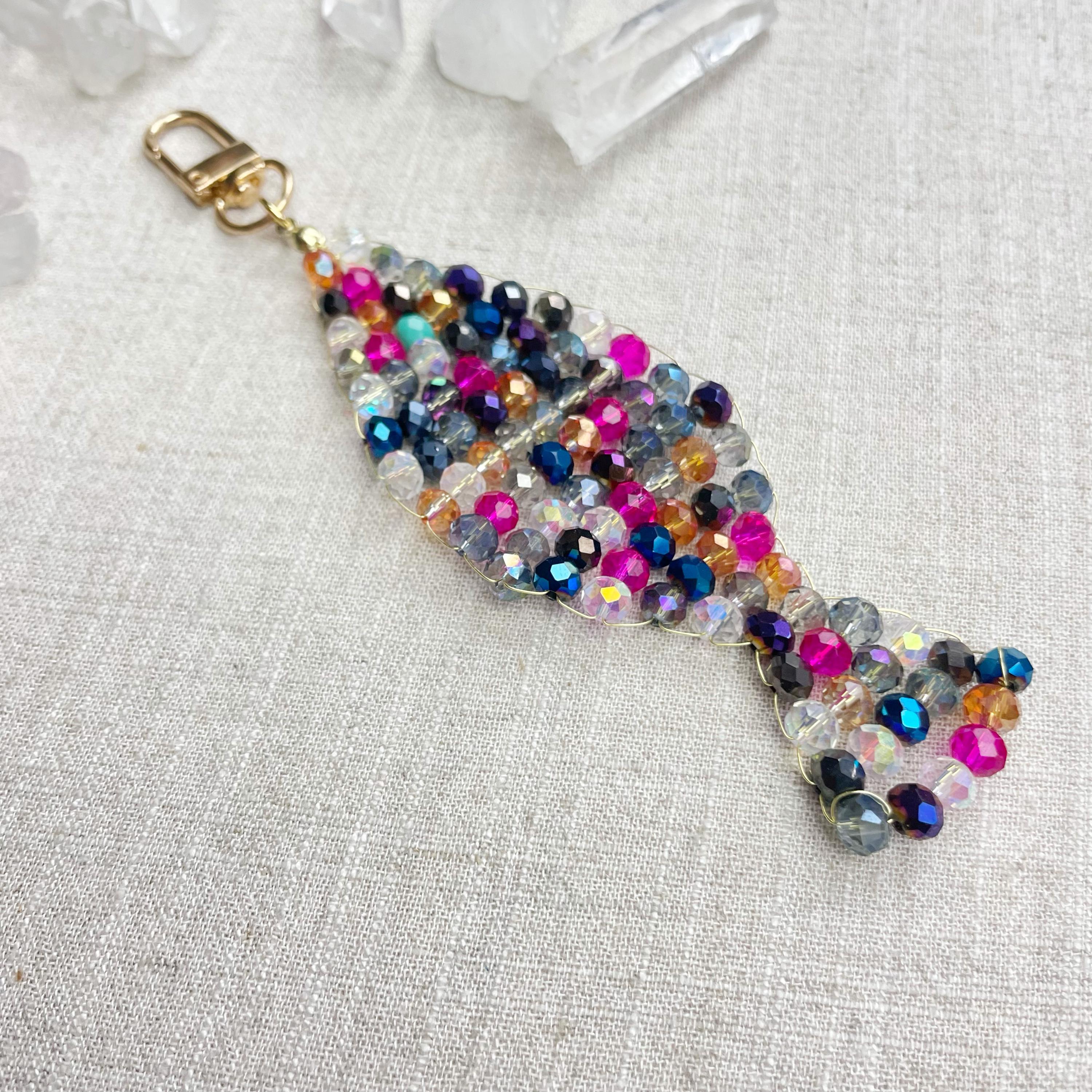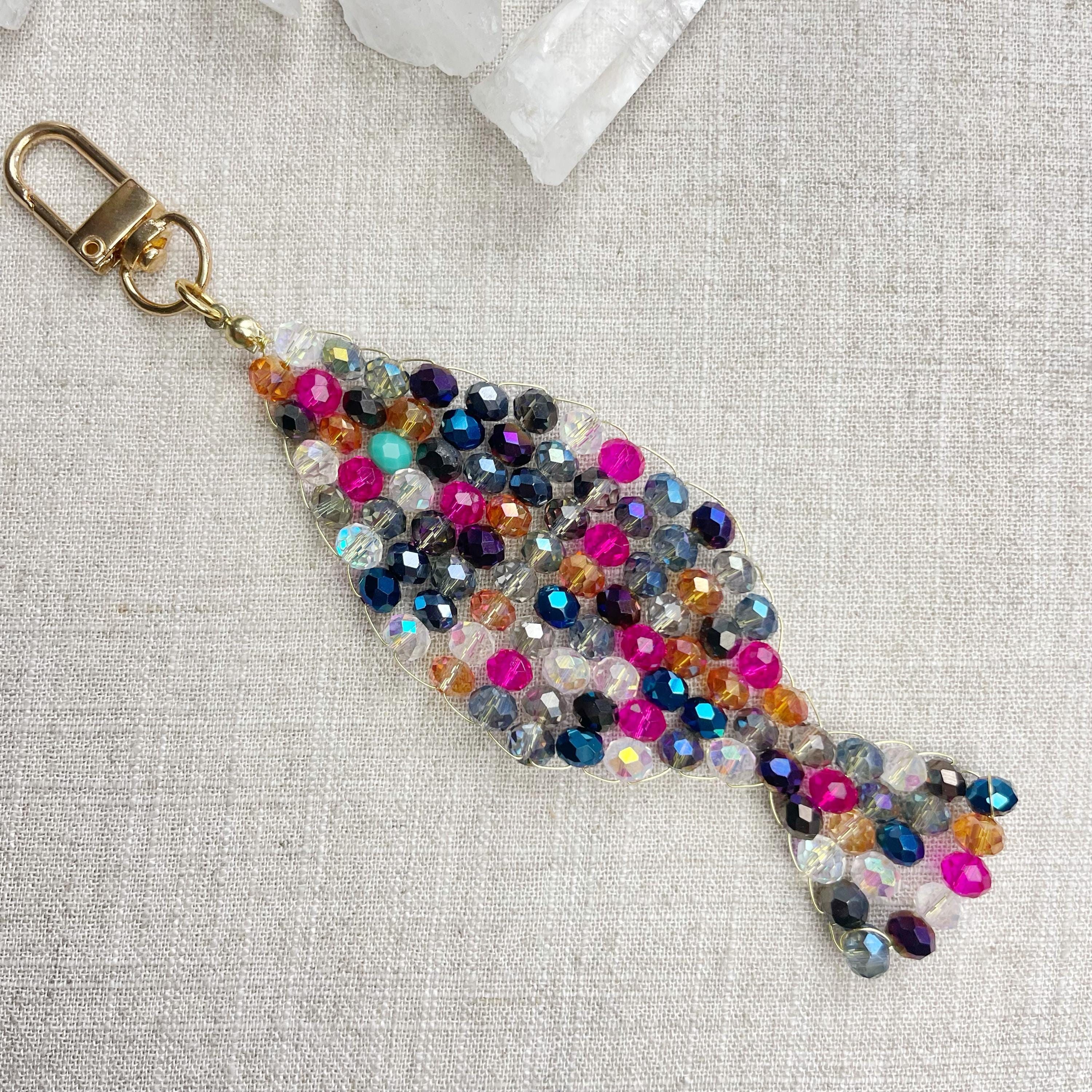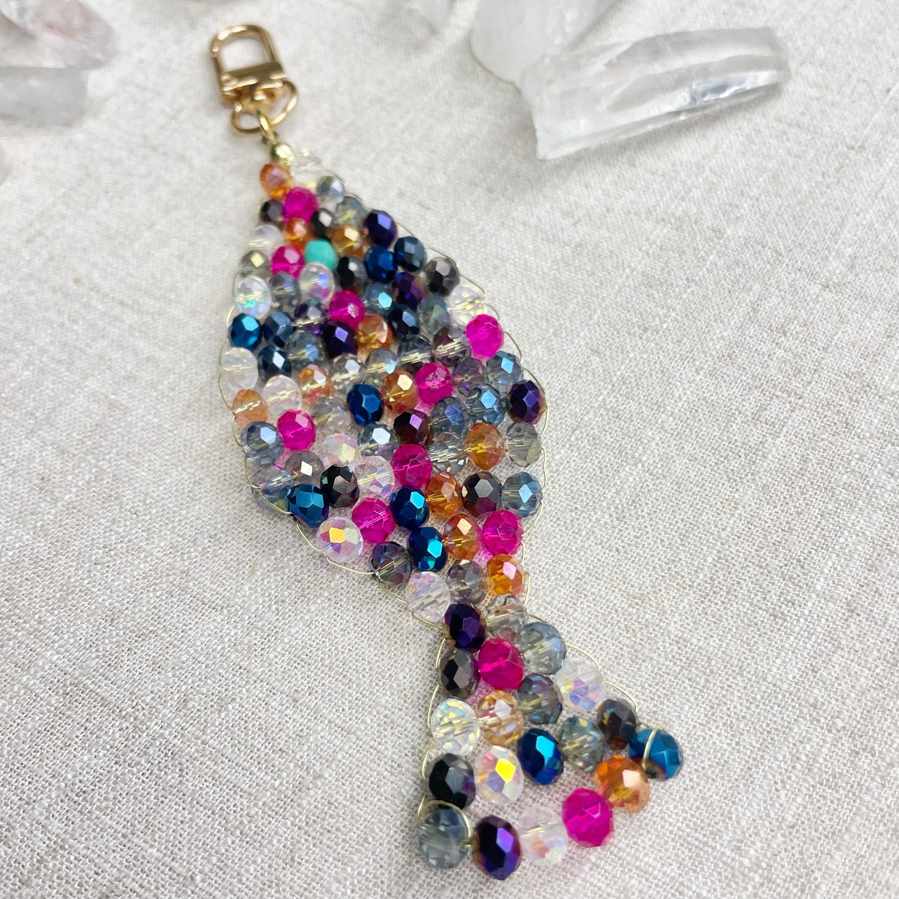 This charm is made from 6mm glass faceted rondelle beads. The beads are woven together with a gold toned wire to create the fish charm. The beads are iridescent beads in deep rich colors. The eye is a turquoise glass bead. The beads sparkle beautifully in sunlight.