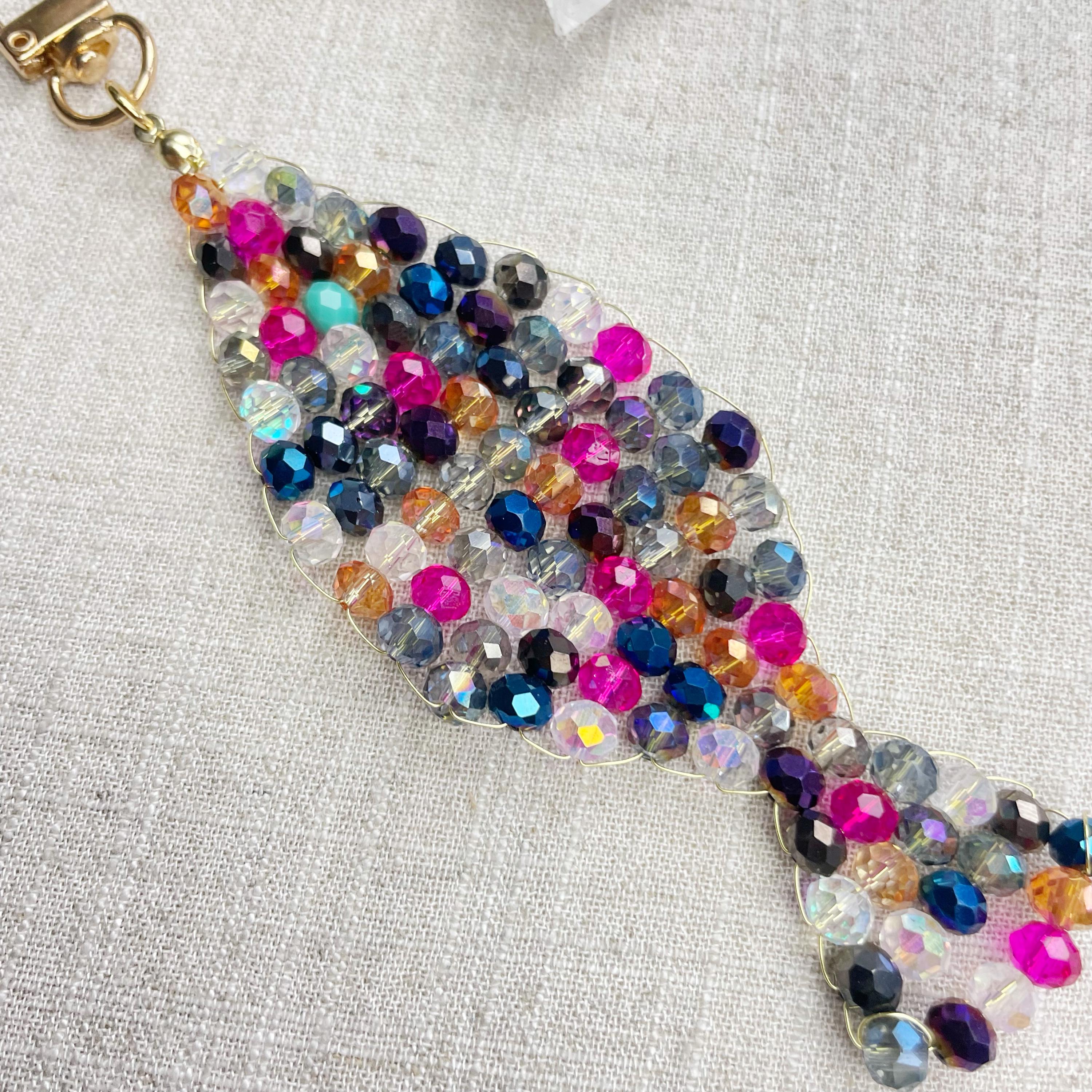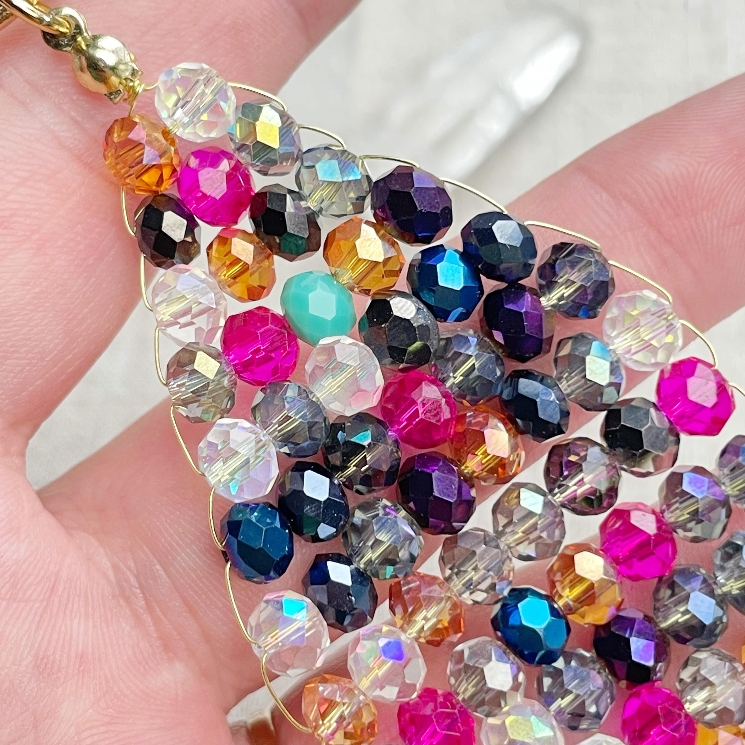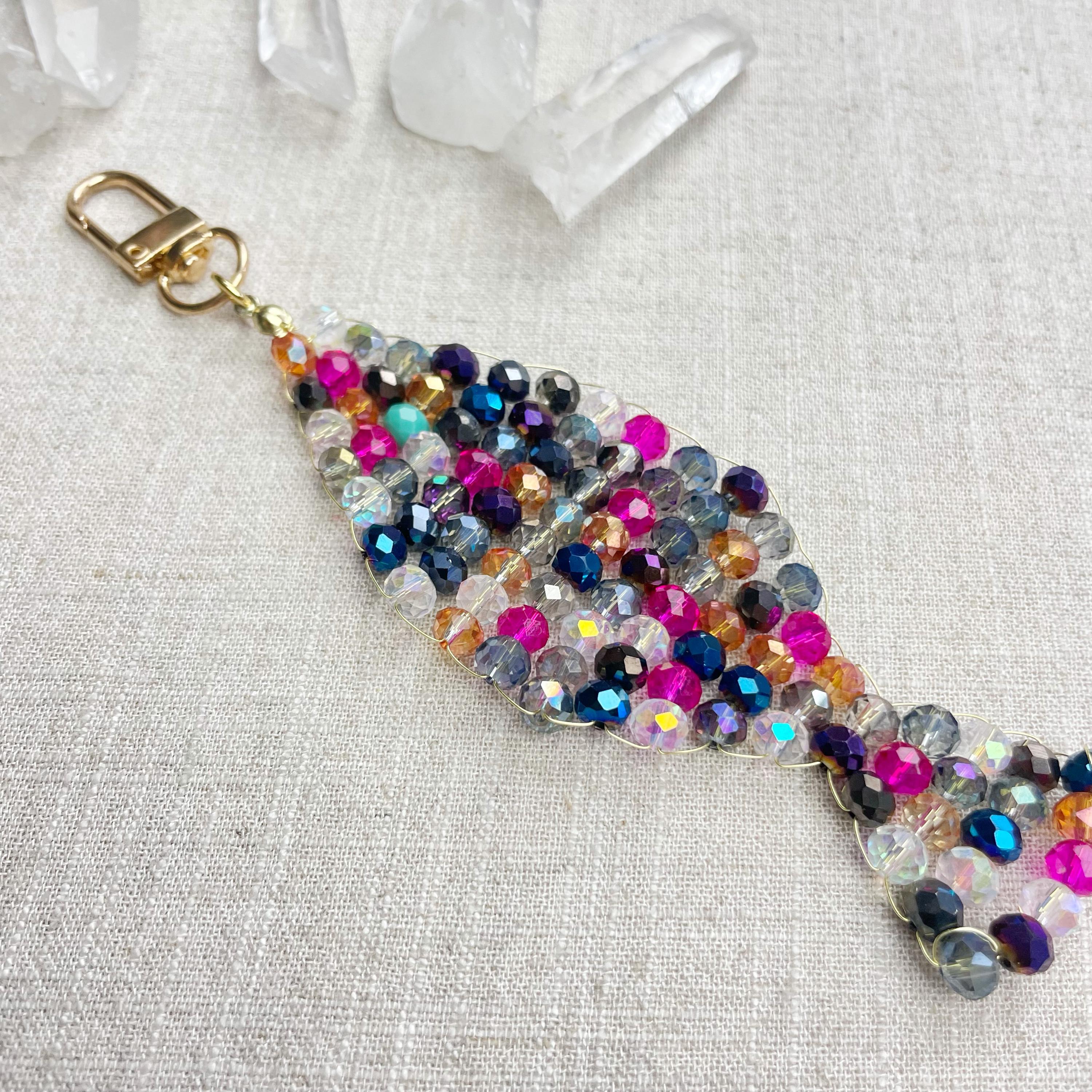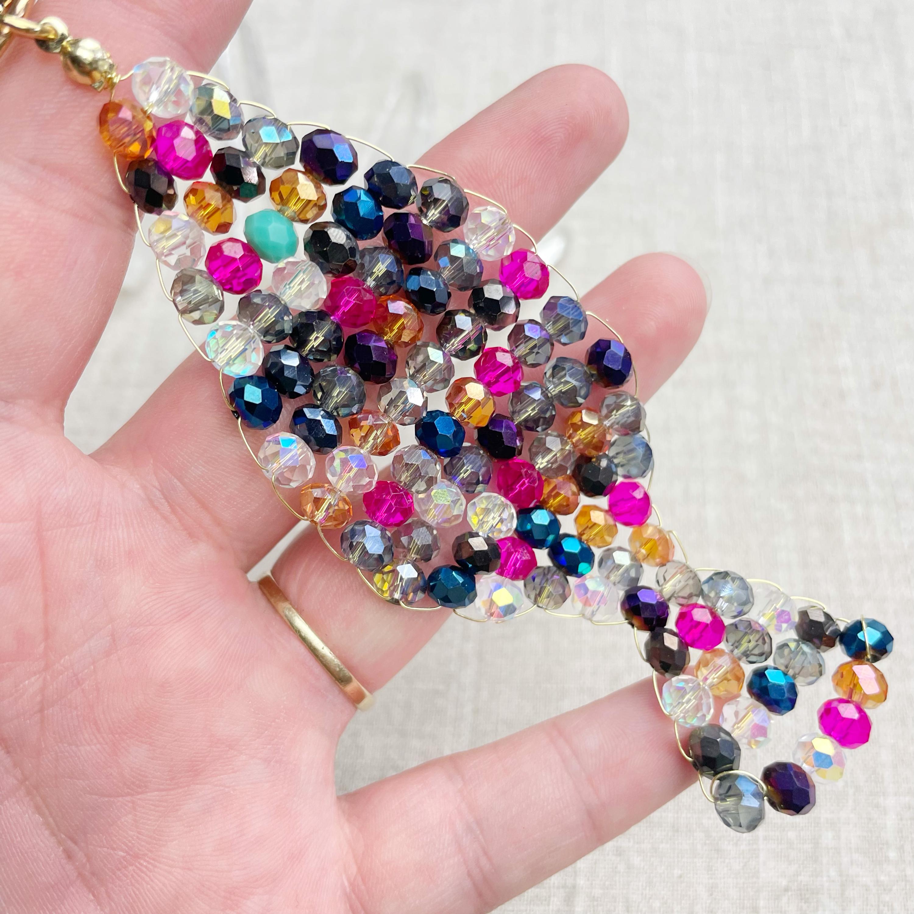 This charm is made from 6mm glass faceted rondelle beads. The beads are woven together with a gold toned wire to create the fish charm. The beads are iridescent beads in deep rich colors. The eye is a turquoise glass bead. The beads sparkle beautifully in sunlight.